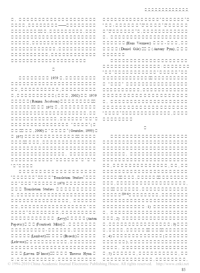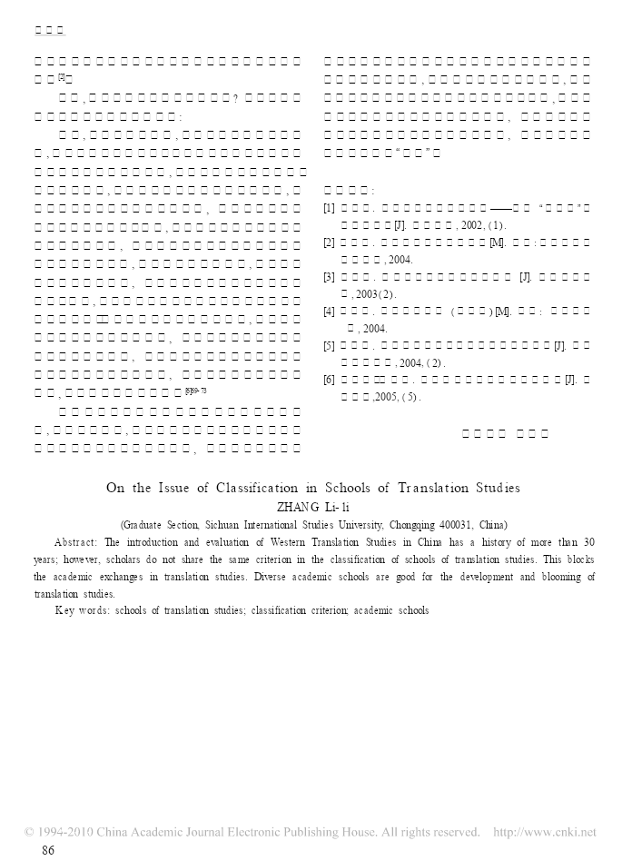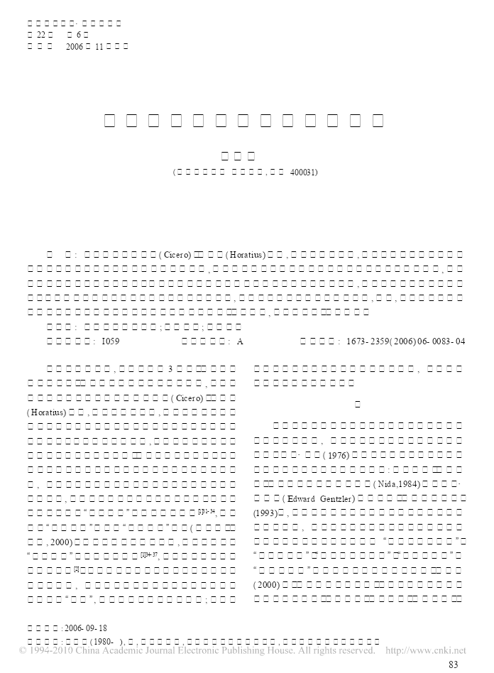 南通大学学报·社会科学版第22卷第6期双月刊2006年11月出版当代西方翻译理论流派的划分张丽丽(四川外语学院研究生部,重庆400031)摘要:自古罗马的西赛罗(Cicero)、贺拉斯(Horatius)以来,翻译学学派林立,学说纷繁。国内对于西方翻译理论的译介与评价也有三十年的历史了,由于不同学者对西方翻译流派划分时所依据的标准不同,一度出现了流派名称混乱的情况。当代西方翻译理论流派的划分需要统一的参照标准,才能有益于学术对话与交流。学术研究中流派的形成是研究深化的一个表现,流派意识体现了清晰的理论意识,因此,某一学科的发展史往往体现为学科内不同学派或流派的此消彼长、相互继承,或互为补充、共同发展。关键词:西方翻译理论流派;划分标准;学术流派中图分类号:I059文献标识码:A文章编号:1673-2359(2006)06-0083-04西方的翻译活动,若从公元前3世纪《七十子希面希望从西方翻译理论研究中获得启示,以促进国腊文本圣经》在埃及的亚历山大城问世算起,已有两内翻译理论流派的形成。千多年的历史。自古罗马的西赛罗(Cicero)、贺拉斯一(Horatius)以来,翻译学学派林立,学说纷繁。不同时代、不同学派的学者从不同的角度对翻译进行了各对翻译理论流派的概括和梳理是翻译研究不可自的阐释。从某种意义上来说,一部西方翻译学史就缺少的组成部分,许多翻译理论家都进行过有益的是一部学派的传承与更替、聚合与交锋的历史。国内探索。尤金·奈达(1976)根据各流派所关注的焦点将对于西方翻译理论的译介与评价也有三十年的历史当代翻译理论分为四个基本流派:语文学派、语言学了,由于不同学者对西方翻译流派划分时所依据的派、交际学派和社会符号学派(Nida,1984)。埃德温·标准不同,一度出现了流派名称混乱的情况。有人把根茨勒(EdwardGentzler)在其专著《当代翻译理论》文化学派归于“翻译研究”学派的框架之下[1]31-34,也有(1993)中,根据二战至九十年代初西方翻译理论研究人用“文化学派”来统称“翻译研究”学派(张南峰、陈的发展状态,依据各流派所采用的研究方法和依据德鸿,2000)。同是女性主义翻译理论,有人把它归为的理论来源将当代译论划分为“美国翻译培训派”、“解构学派”或译者中心学派[1]34-37,也有人把它归为翻“翻译科学派”、“早期翻译研究派”、“多元体系派”和译研究学派[2]。本文通过对西方翻译理论流派研究的“解构主义派”五大流派。香港学者张南峰、陈德鸿梳理与评价,一方面呼吁国内学者为当代西方翻译(2000)在《西方翻译理论精选》中将西方翻译理论流理论流派“正名”,以方便学术界的理论交流;另一方派分为语文学派、诠释学派、语言学派、目的学派、文收稿日期:2006-09-18作者简介:张丽丽(1980-),女,江苏海安人,南通大学外国语学院助教,四川外语学院硕士研究生。83张丽丽化学派和解构学派六大学派。研究学派”、“解构”学派(或译者中心学派)和“后殖国内学者也有过类似的尝试。潘文国[1]18-22以有民主义”学派(或政治学派)三类,而翻译研究学派之无翻译学学科意识为标准把西方翻译研究史分为传下又细分为“多元系统”学派、“描写”学派、文化学派统、现代和当代三个阶段。他把传统阶段的翻译理论和“综合”学派四个亚类。李文革[1]把女权主义“食人看成是“文艺学派”,现代阶段看成“语言学派”或“科主义”和后殖民主义翻译研究归入翻译研究学派,在学学派”,把当代阶段的翻译研究划分为“翻译研究解构主义学派中主要介绍了德里达、本雅明和韦努学派”、“解构”学派(或译者中心学派)和“后殖民主蒂的翻译思想。这里就出现了很多交叉、重叠和指称义”学派(或政治学派)三类,而翻译研究学派之下又不一的现象。张南峰先生在说文化学派时,潘文国先细分为“多元系统”学派、“描写”学派、文化学派和生脑子里所想的绝对不是其所指的,这样就容易引“综合”学派四个亚类。蒋骁华[3]41-45根据当代西方翻起不必要的误会,甚至于引起学术界不必要的纷争。译理论发展的新特点,认为目前主要存在文化学派另外,对于刚刚走上翻译研究道路的研究生来讲也和语言学派两大派别。从宏观上看,语言学派可包括会不知所措,无所适从。学者们的分类都有自己的目“综合”学派;而文化学派可包括多元系统学派、描写的,他们根据自己的理解把西方翻译研究划分为不学派、解构主义学派、后殖民主义学派和女权主义学同的流派是可以理解的,也无所谓对与错。然而,如派。李文革在《西方翻译理论流派研究》中把西方翻孔子所说:“名不正则言不顺”,为了方便研究和学术译理论划分为:文艺学派、语言学派、翻译研究学派交流的顺利进