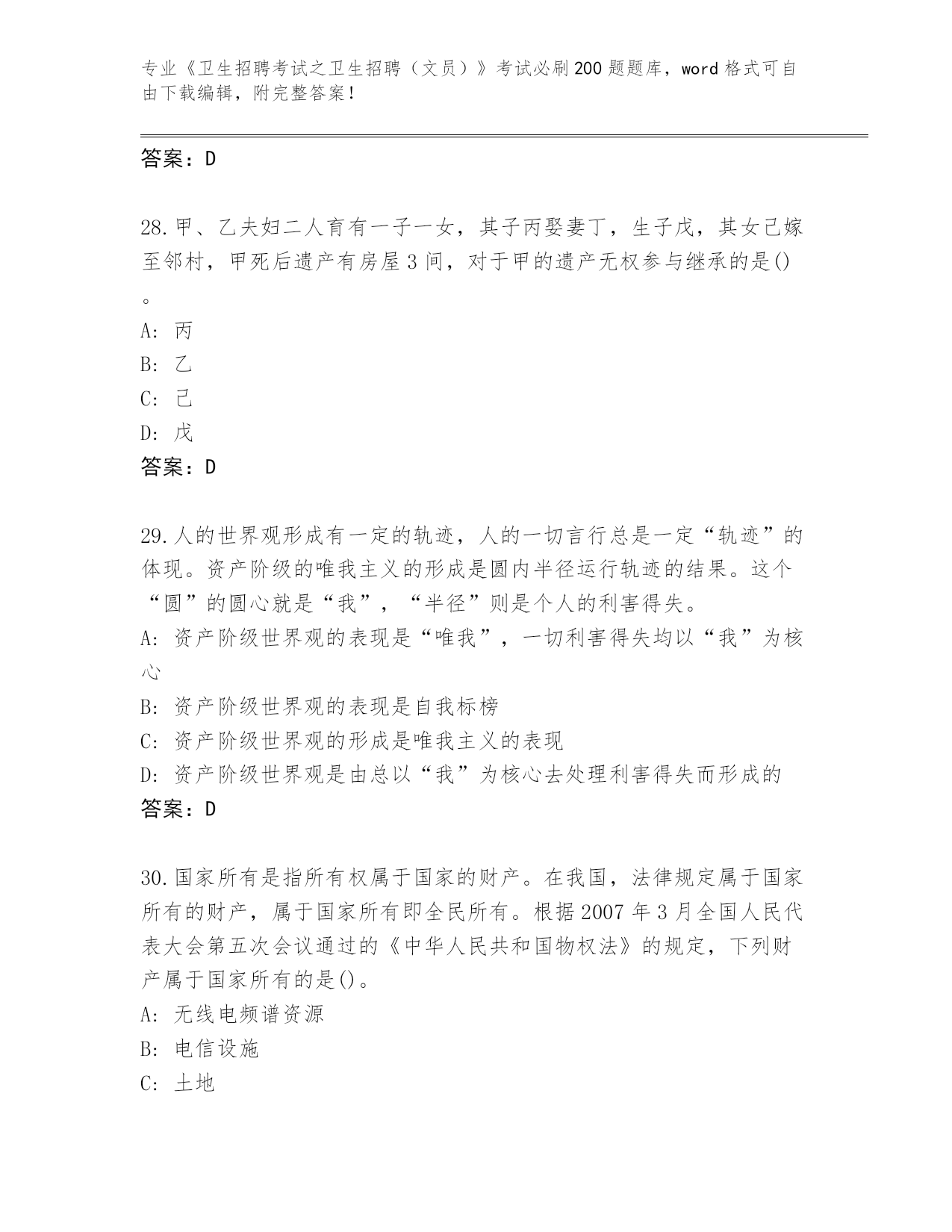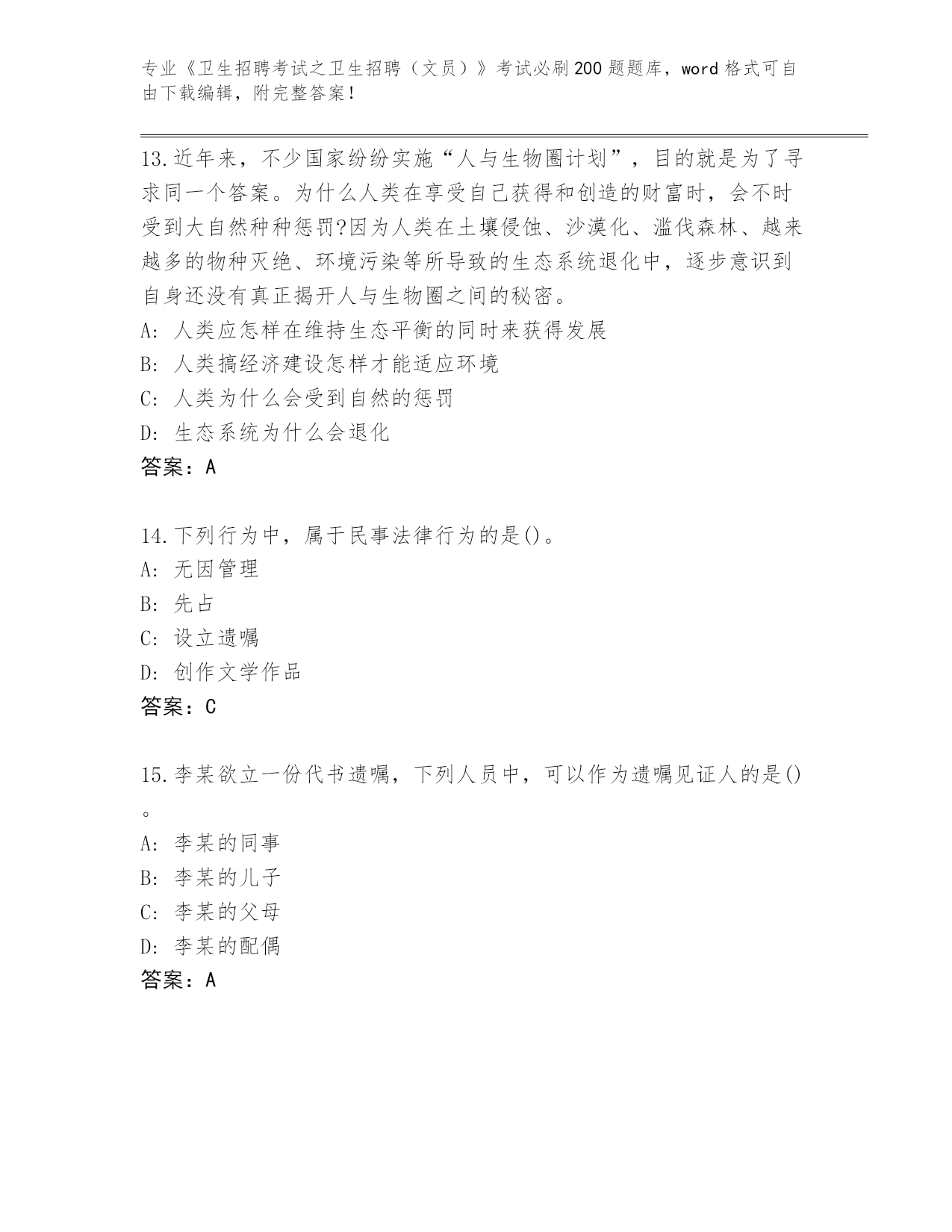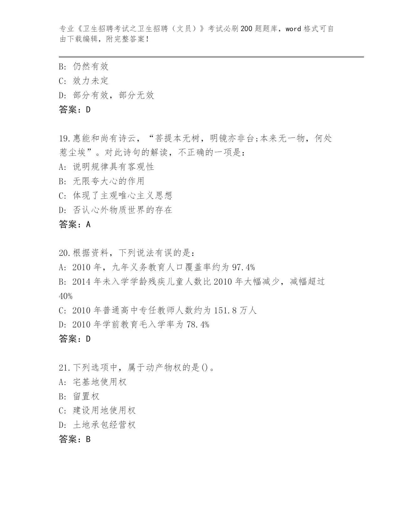 历年湖北省《卫生招聘考试之卫生招聘(文员)》考试必刷200题及答案【名师系列】