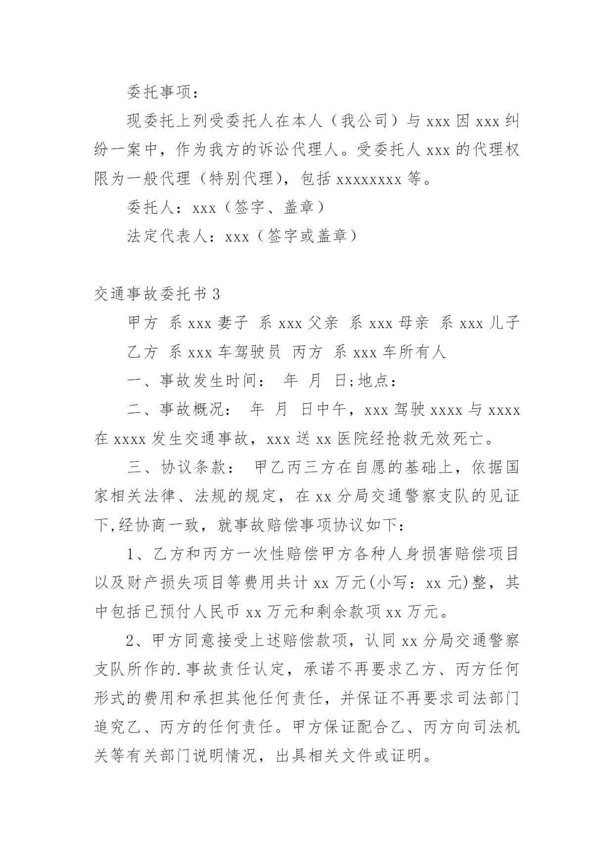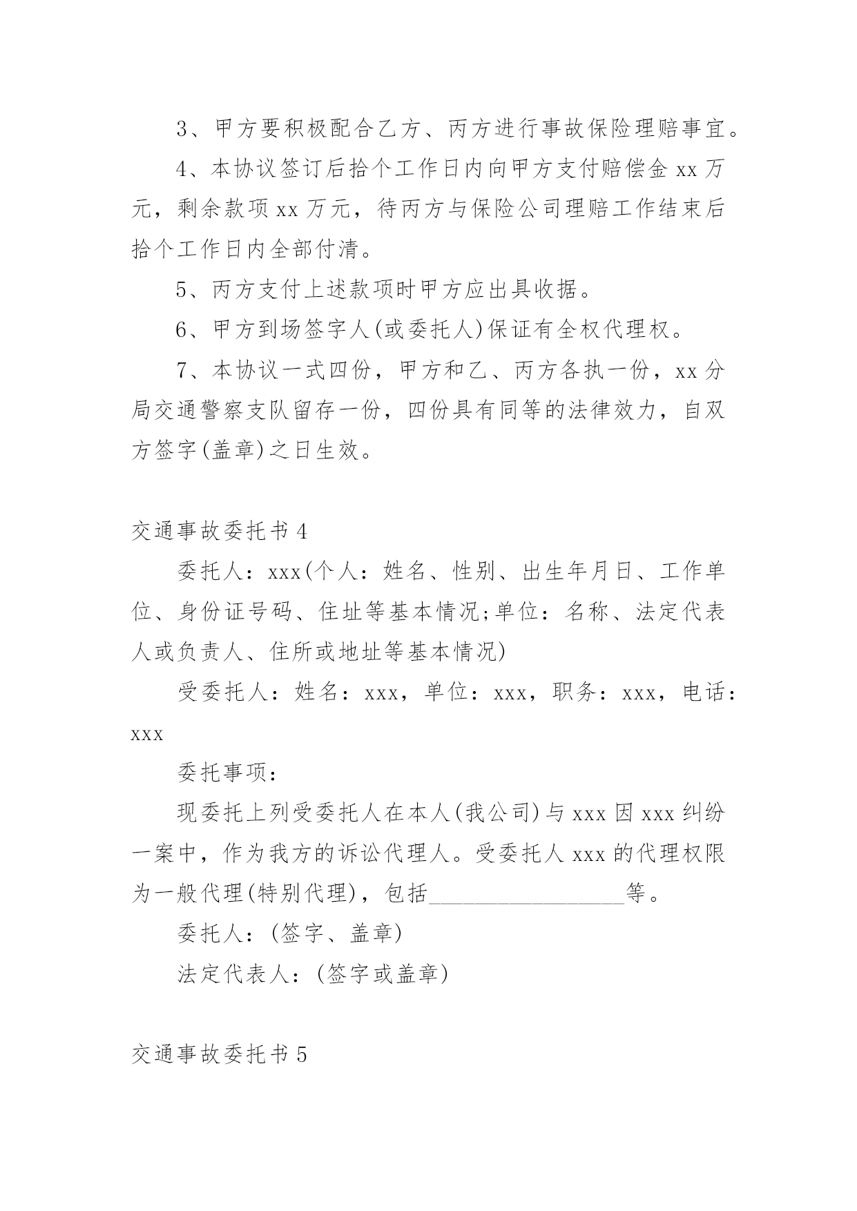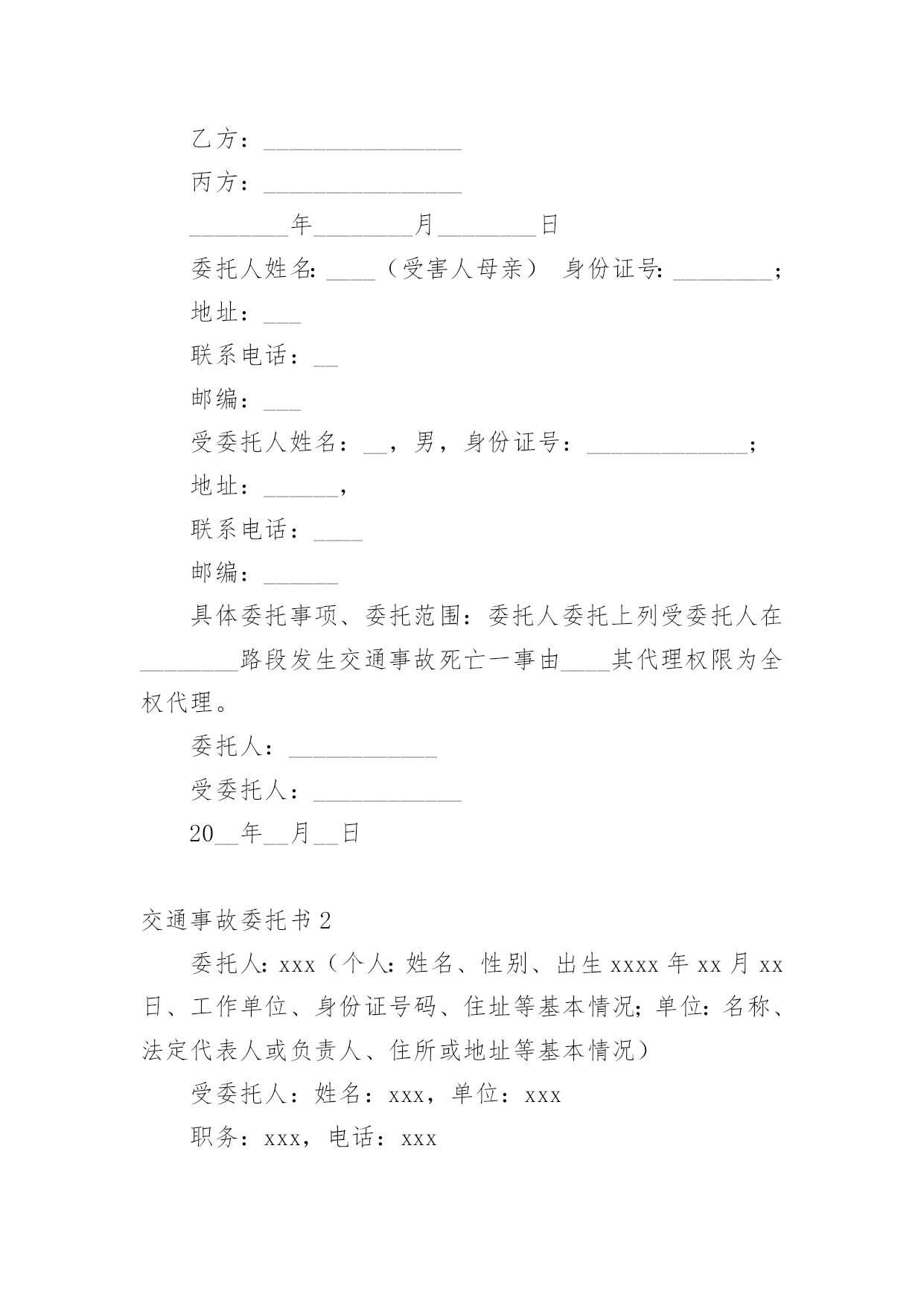 交通事故委托书交通事故委托书(精选15篇)委托书具有不可撤销性,委托人不得以任何理由反悔委托事项。随着社会不断地进步,我们在很多事务中都会使用到委托书,怎么写委托书才能避免踩雷呢?以下是小编整理的交通事故委托书,欢迎大家分享。交通事故委托书1甲方(受害人或者其亲属):________________乙方(驾驶人或者其亲属):________________丙方(车辆挂靠单位名称):________________________年________月________日________时________分许,乙方________驾驶________车牌号为_____________的________车________行驶至________县________路居民区附近时,不慎与甲方的发生交通事故,致当场出现人身损害,财产受到相应损失。甲、乙、丙三方就赔偿事宜,经协商自愿达成如下协议:一、乙方和丙方自愿一次性赔偿甲方各种法定人身损害赔偿项目以及财产损失项目共计________________万元(小写:________________元)整。二、本协议签订后,为方便乙方、丙方进行保险理赔,甲、乙、丙三方均同意互相配合就本事故的赔偿事宜通过非诉或者诉讼的方式解决。通过诉讼方式解决的,若法院出具判决书或者调解书确定的赔偿数额与本协议不一致,三方仍保证按本协议约定的赔偿数额履行。相关诉讼费、律师费及办案费用由乙丙两方承担。三、乙方应在本协议生效之日向甲方支付赔偿金________元,剩余款项________元,乙方应于法院出具判决书之日全部付清。四、甲方对乙方的违法行为表示谅解,保证不再要求司法部门追究路甲友的任何行政、刑事责任,并保证在必要时配合乙方向司法机关等有关部门说明本协议的情况,出具相关文件或证明。五、甲方保证不再要求乙方、丙方或保险公司赔偿超过本协议赔偿数额以外的`任何赔偿。因本事故产生车辆保险的赔付,由乙方和丙方进行理赔或索赔,保险赔付款项全部归乙方和丙方所有。六、甲方保证本协议合法有效,保证没有其他权利人就此事故再向乙方、丙方主张权利,若本协议被确认无效,甲方应将已收取的全部赔偿款返还于乙方,若造成乙方或丙方其他损失,则由甲方承担全部责任。七、甲、乙双方任何一方违反本协议约定,违约方应向对方支付违约金________万元。八、此事故双方一次性了结,别无其他任何纠葛。九、本协议一式四份,自三方签字后生效,甲、乙、丙三方各执一份,交警部门各留存一份,具同等法律效力。甲方:________________乙方:________________丙方:________________________年________月________日委托人姓名:____(受害人母亲)身份证号:________;地址:___联系电话:__邮编:___受委托人姓名:__,男,身份证号:_____________;地址:______,联系电话:____邮编:______具体委托事项、委托范围:委托人委托上列受委托人在________路段发生交通事故死亡一事由____其代理权限为全权代理。委托人:____________受委托人:____________20__年__月__日交通事故委托书2委托人:xxx(个人:姓名、性别、出生xxxx年xx月xx日、工作单位、身份证号码、住址等基本情况;单位:名称、法定代表人或负责人、住所或地址等基本情况)受委托人:姓名:xxx,单位:xxx职务:xxx,电话:xxx委托事项:现委托上列受委托人在本人(我公司)与xxx因xxx纠纷一案中,作为我方的诉讼代理人。受委托人xxx的代理权限为一般代理(特别代理),包括xxxxxxxx等。委托人:xxx(签字、盖章)法定代表人:xxx(签字或盖章)交通事故委托书3甲方系xxx妻子系xxx父亲系xxx母亲系xxx儿子乙方系xxx车驾驶员丙方系xxx车所有人一、事故发生时间:年月日;地点:二、事故概况:年月日中午,xxx驾驶xxxx与xxxx在xxxx发生交通事故,xxx送xx医院经抢救无效死亡。三、协议条款:甲乙丙三方在自愿的基础上,依据国家相关法律、法规的规定,在xx分局交通警察支队的见证下,经协商一致,就事故赔偿事项协议如下:1、乙方和丙方一次性赔偿甲方各种人身损害赔偿项目以及财产损失项目等费用共计xx万元(小写:xx元)整,其中包括已预付人民币xx万元和剩余款项xx万元。2、甲方同意接受上述赔偿款项,认同xx分局交通警察支队所作的.事故责任认定,承诺不再要求乙方、丙方任何形式的费用和承担其他任何责任,并保证不再要求司法部门追究乙、丙方的任何责任。甲方保证配合乙、丙方向司法机关等有关部门说明情况,出具相关文件或证明。3、甲方要积极配合乙方、丙方进行事故保险理赔事宜。4、本