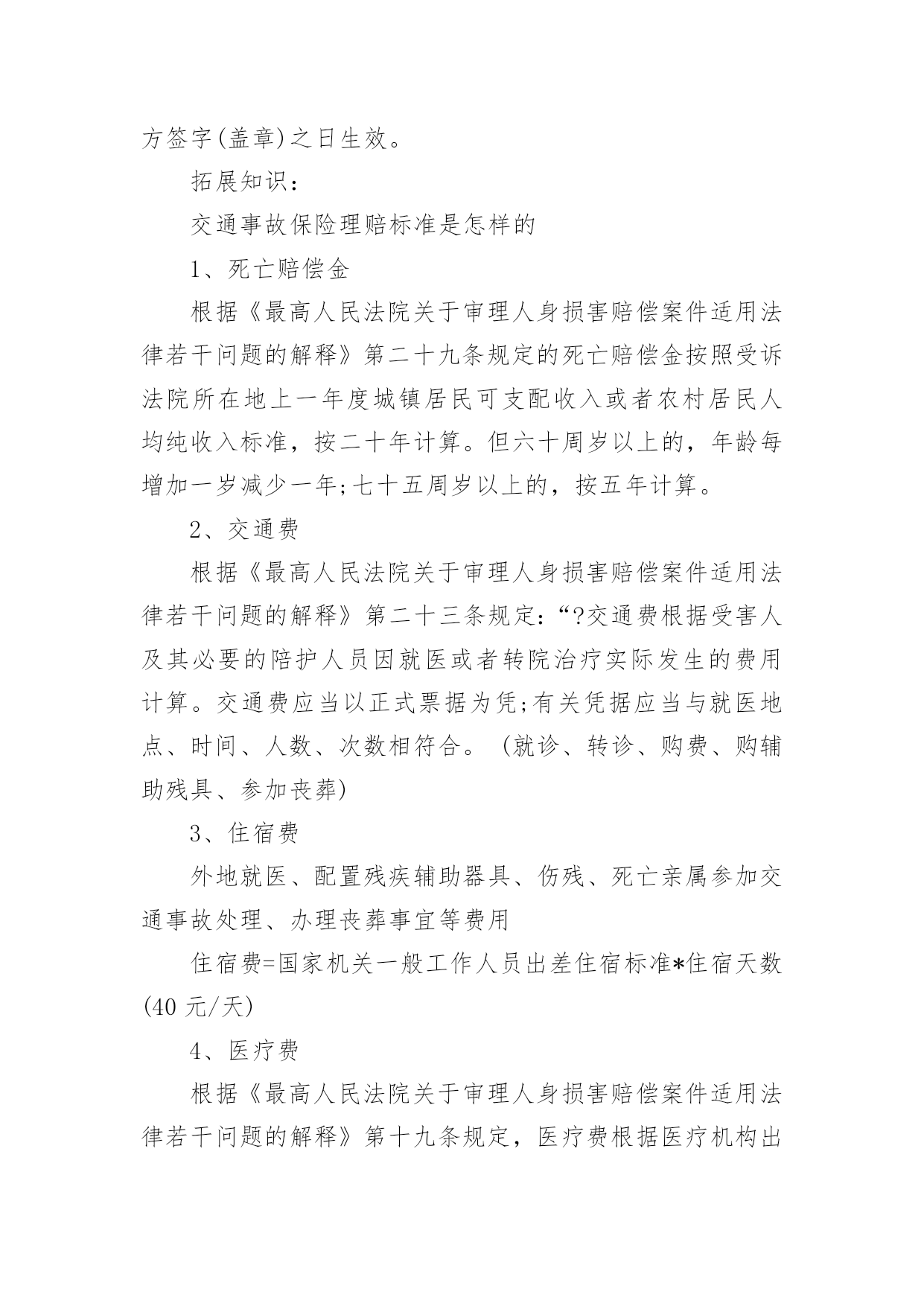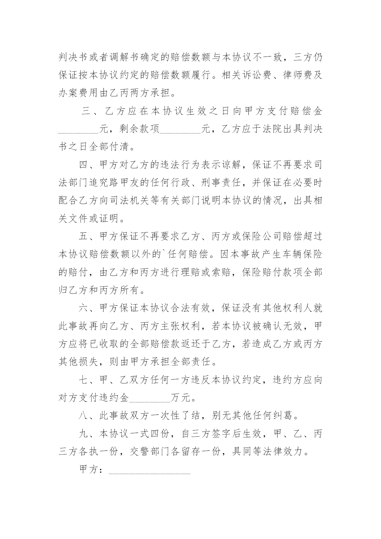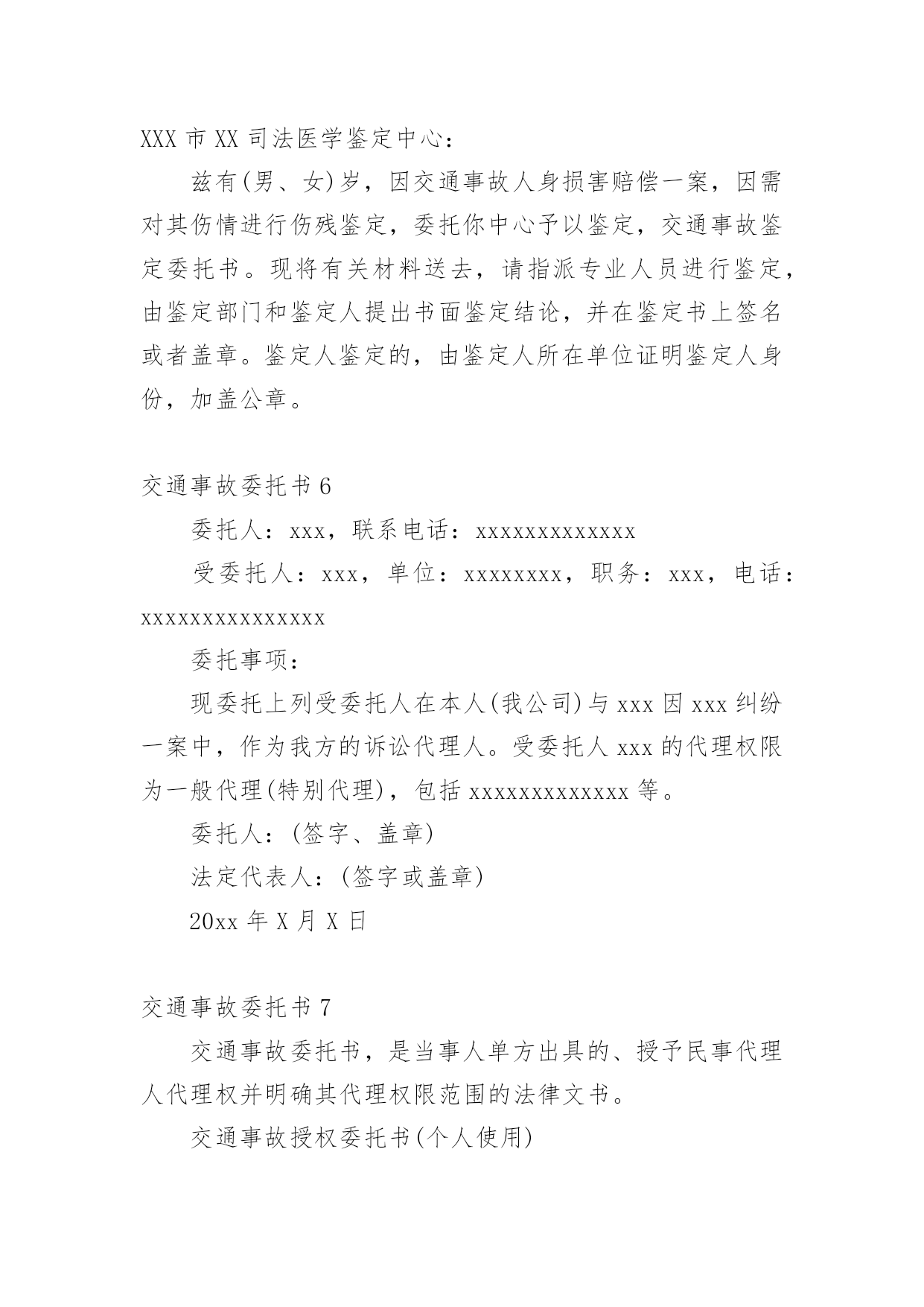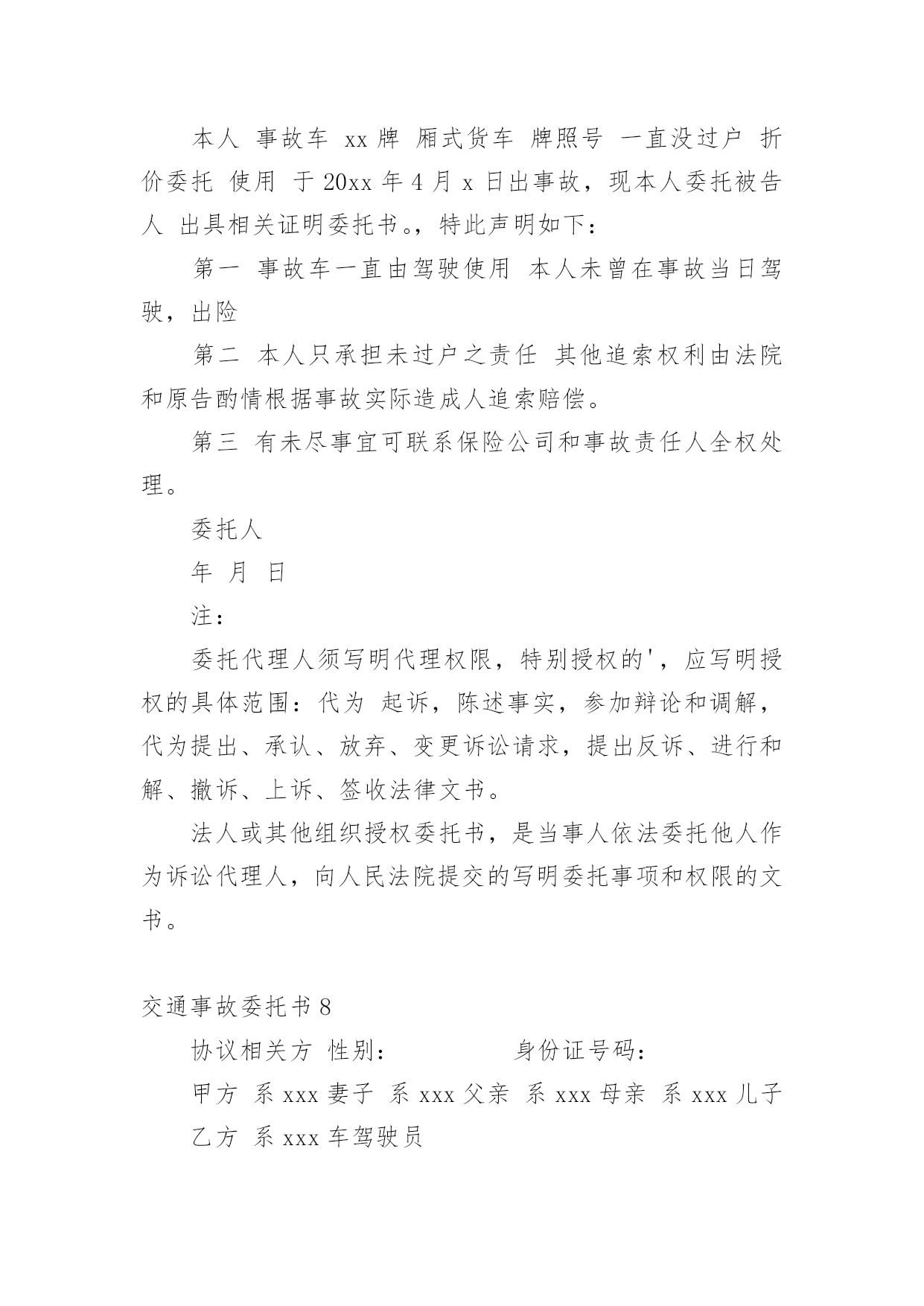 交通事故委托书交通事故委托书(精选15篇)委托书具有不可撤销性,委托人不得以任何理由反悔委托事项。随着社会不断地进步,我们在很多事务中都会使用到委托书,怎么写委托书才能避免踩雷呢?以下是小编整理的交通事故委托书,欢迎大家分享。交通事故委托书1甲方(受害人或者其亲属):________________乙方(驾驶人或者其亲属):________________丙方(车辆挂靠单位名称):________________________年________月________日________时________分许,乙方________驾驶________车牌号为_____________的________车________行驶至________县________路居民区附近时,不慎与甲方的发生交通事故,致当场出现人身损害,财产受到相应损失。甲、乙、丙三方就赔偿事宜,经协商自愿达成如下协议:一、乙方和丙方自愿一次性赔偿甲方各种法定人身损害赔偿项目以及财产损失项目共计________________万元(小写:________________元)整。二、本协议签订后,为方便乙方、丙方进行保险理赔,甲、乙、丙三方均同意互相配合就本事故的赔偿事宜通过非诉或者诉讼的方式解决。通过诉讼方式解决的,若法院出具判决书或者调解书确定的赔偿数额与本协议不一致,三方仍保证按本协议约定的赔偿数额履行。相关诉讼费、律师费及办案费用由乙丙两方承担。三、乙方应在本协议生效之日向甲方支付赔偿金________元,剩余款项________元,乙方应于法院出具判决书之日全部付清。四、甲方对乙方的违法行为表示谅解,保证不再要求司法部门追究路甲友的任何行政、刑事责任,并保证在必要时配合乙方向司法机关等有关部门说明本协议的情况,出具相关文件或证明。五、甲方保证不再要求乙方、丙方或保险公司赔偿超过本协议赔偿数额以外的`任何赔偿。因本事故产生车辆保险的赔付,由乙方和丙方进行理赔或索赔,保险赔付款项全部归乙方和丙方所有。六、甲方保证本协议合法有效,保证没有其他权利人就此事故再向乙方、丙方主张权利,若本协议被确认无效,甲方应将已收取的全部赔偿款返还于乙方,若造成乙方或丙方其他损失,则由甲方承担全部责任。七、甲、乙双方任何一方违反本协议约定,违约方应向对方支付违约金________万元。八、此事故双方一次性了结,别无其他任何纠葛。九、本协议一式四份,自三方签字后生效,甲、乙、丙三方各执一份,交警部门各留存一份,具同等法律效力。甲方:________________乙方:________________丙方:________________________年________月________日委托人姓名:____(受害人母亲)身份证号:________;地址:___联系电话:__邮编:___受委托人姓名:__,男,身份证号:_____________;地址:______,联系电话:____邮编:______具体委托事项、委托范围:委托人委托上列受委托人在________路段发生交通事故死亡一事由____其代理权限为全权代理。委托人:____________受委托人:____________20__年__月__日交通事故委托书2委托人:xxx(个人:姓名、性别、出生xxxx年xx月xx日、工作单位、身份证号码、住址等基本情况;单位:名称、法定代表人或负责人、住所或地址等基本情况)受委托人:姓名:xxx,单位:xxx职务:xxx,电话:xxx委托事项:现委托上列受委托人在本人(我公司)与xxx因xxx纠纷一案中,作为我方的诉讼代理人。受委托人xxx的代理权限为一般代理(特别代理),包括xxxxxxxx等。委托人:xxx(签字、盖章)法定代表人:xxx(签字或盖章)交通事故委托书3甲方系xxx妻子系xxx父亲系xxx母亲系xxx儿子乙方系xxx车驾驶员丙方系xxx车所有人一、事故发生时间:年月日;地点:二、事故概况:年月日中午,xxx驾驶xxxx与xxxx在xxxx发生交通事故,xxx送xx医院经抢救无效死亡。三、协议条款:甲乙丙三方在自愿的基础上,依据国家相关法律、法规的规定,在xx分局交通警察支队的见证下,经协商一致,就事故赔偿事项协议如下:1、乙方和丙方一次性赔偿甲方各种人身损害赔偿项目以及财产损失项目等费用共计xx万元(小写:xx元)整,其中包括已预付人民币xx万元和剩余款项xx万元。2、甲方同意接受上述赔偿款项,认同xx分局交通警察支队所作的.事故责任认定,承诺不再要求乙方、丙方任何形式的费用和承担其他任何责任,并保证不再要求司法部门追究乙、丙方的任何责任。甲方保证配合乙、丙方向司法机关等有关部门说明情况,出具相关文件或证明。3、甲方要积极配合乙方、丙方进行事故保险理赔事宜。4、本