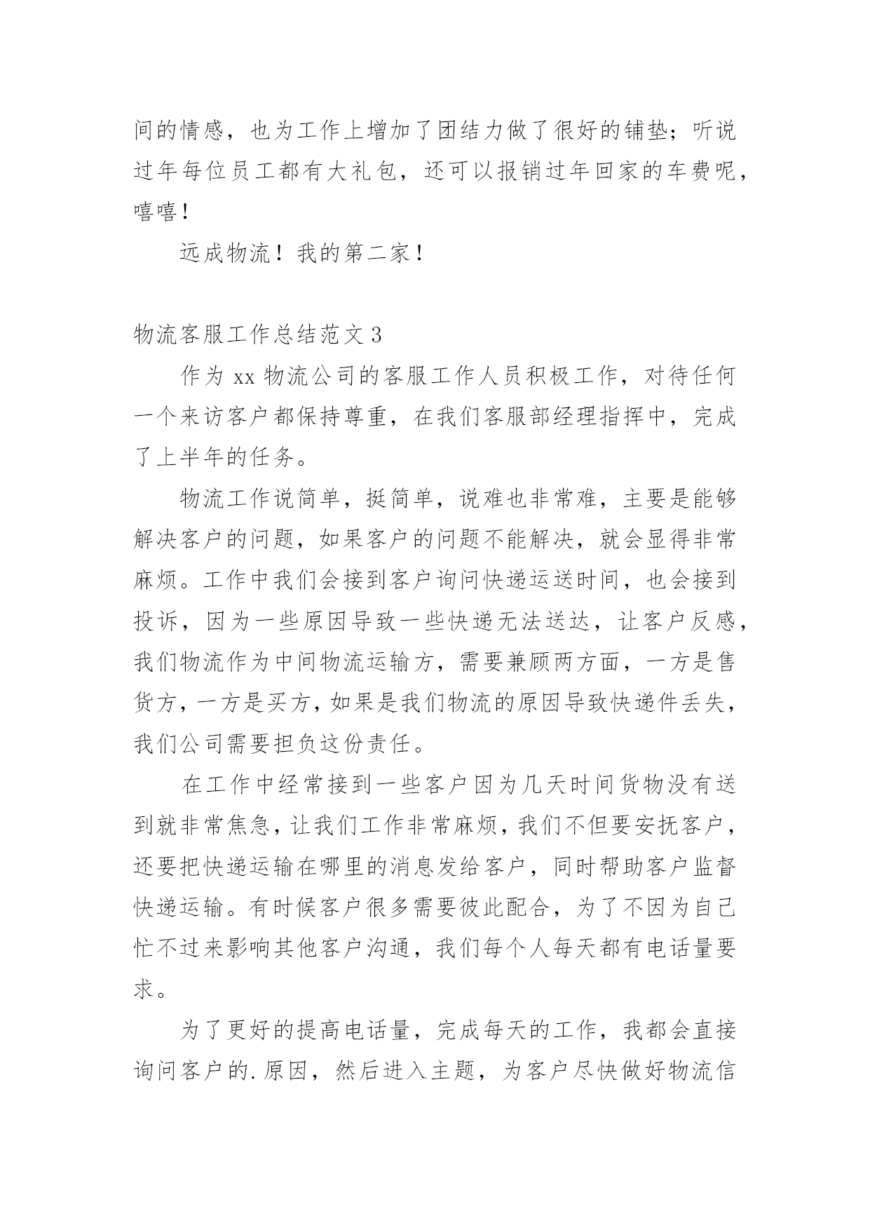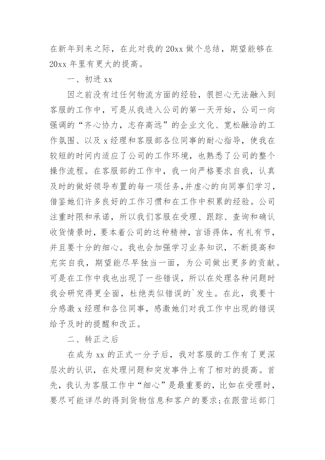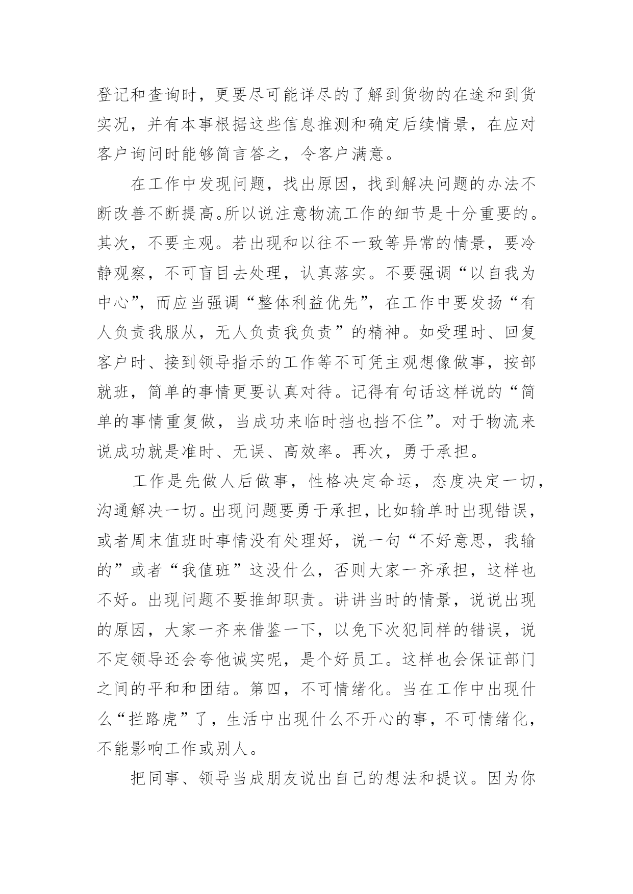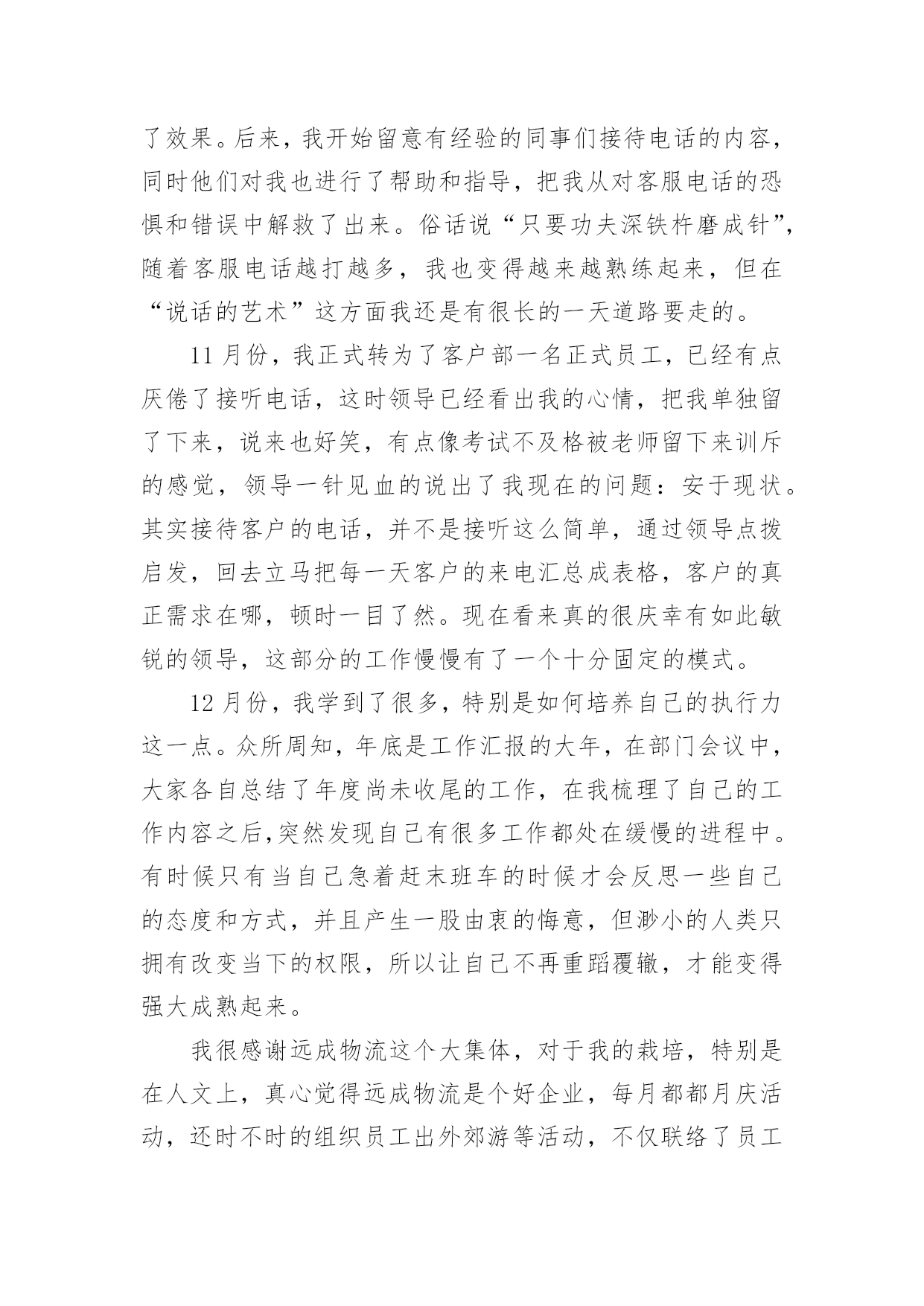 物流客服工作总结物流客服工作总结范文总结是指社会团体、企业单位和个人在自身的某一时期、某一项目或某些工作告一段落或者全部完成后进行回顾检查、分析评价,从而肯定成绩,得到经验,找出差距,得出教训和一些规律性认识的一种书面材料,它可使零星的、肤浅的、表面的感性认知上升到全面的、系统的、本质的理性认识上来,因此好好准备一份总结吧。总结怎么写才不会流于形式呢?以下是小编整理的物流客服工作总结范文,欢迎阅读与收藏。物流客服工作总结范文1经过了学校四年的学习,对整个物流行业已经了解,加上实习也近了,我也进入了一家与学校合作的物流公司进行实习锻炼。没有熟练掌握工作的技巧,在工作中非常被动,我虽然也是物流专业,但是对于很多工作都无法做好,也因此被安排在了客服部门工作。一开始觉岗位与工作不匹配,根本得不到锻炼,所以有些排斥,做起事情来比较散漫。我们客服部的经理是一个非常威严的人,容不得有人在他眼皮底下混日子,发现我做事如此懒散,直接就训斥我,让我难受了好一阵,从而把我从懒惰中拉回来了。不管如何做至少我要做好工作才行,很多时间都是我用来提升自己,每次都给自己很多任务,让自己不断学习,不断加强自己的能力,不会做的就给自己一些压力,随着我不断的深入了解客服工作我慢慢的成为了我们部门最优秀的一个客服。在领导给我奖励的时候我就对领导说想要进入物流岗位工作,跟踪订单,做物流推广等工作。因为我在岗位上取得了成绩,我很快就被安排到了岗位上,做一个跟单员,这恰好能够用到我的知识,让我感觉到了自己的能力有用武之地,所以我积极的开始了自己的`工作,当我问为什么在我们刚开始到公司的时候,不安排我们去相应的岗位工作,我们领导告诉我们如果我们连最简单的客服都做不好,又如何能够在其他岗位上做好任务。进入到客服部是对我们新人的一次考验,更是对我们的洗礼,希望我们能够沉下心来,不要认为学习了相关知识就觉得自己一定能够做好一件工作。没有简单的工作,想要在岗位上做出成绩,做出结果还需要一颗能够承受压力的心,能够在工作中依然保持着积极向上的意志力,不被工作的压力压垮,永远都能够在失败中站起来。这才是工作需要的人才,现在大学生太多了,而公司需要的不是大学生,需要的是能够适应工作,能够在岗位上安心工作的人。我们很多人到了岗位上第一件事情就是度过实习期,当实习期结束了就离开,这让公司人才流失非常大,所以为了减少损失,公司都有自己的一条人才筛选体系,从众多的人才中找到合适的人成为公司的一员,虽然我们这些实习生在公司工作,但是却并没有得到公司的认可,我们更多的是一种双向选择,当我们愿意成为公司一员,我们才可能得到公司的接纳,实习结束,新的开始也代表这工作的新选择,而我却选择继续在公司工作,因为我相信自己可以站的更高。物流客服工作总结范文220xx年是我加入远成物流团队的第一年,因为我在这个新团队中充实地工作了三个月的时间,感觉就像与大家一起奋斗了一整年。9月份,那是一段比较轻松的入门培训时期,每天都有很多新知识要学习,同时当天刚学完的内容,第二天就要马上实际操作。常常是学了这个却又忘了那个,操作速度也相当的缓慢,自己越是追求速度,犯下的错误越是多。为了提高自己的工作效率,我也想了一些有效的办法,比如:上班之前先复习一下以前的学习笔记,温故而知新;问同事借关于物流方面的书籍,想看看有什么内容可以运用到了我平时工作中;休息的时候还会时不时地回顾一下全天的工作和自己学习的新知识。10月份,对我的.挑战就是客服电话,特别是第一次接待客户的来电。还记得每次我接电话时,总是有些如坐针毡,在脑袋里反复默念着培训时的对话内容,并且自己预想着可能出现的问题,以及对策。于是就导致了电话过程中往往流于形式,而忘了客服电话的本质与目的,因此电话也就失去了效果。后来,我开始留意有经验的同事们接待电话的内容,同时他们对我也进行了帮助和指导,把我从对客服电话的恐惧和错误中解救了出来。俗话说“只要功夫深铁杵磨成针”,随着客服电话越打越多,我也变得越来越熟练起来,但在“说话的艺术”这方面我还是有很长的一天道路要走的。11月份,我正式转为了客户部一名正式员工,已经有点厌倦了接听电话,这时领导已经看出我的心情,把我单独留了下来,说来也好笑,有点像考试不及格被老师留下来训斥的感觉,领导一针见血的说出了我现在的问题:安于现状。其实接待客户的电话,并不是接听这么简单,通过领导点拨启发,回去立马把每一天客户的来电汇总成表格,客户的真正需求在哪,顿时一目了然。现在看来真的很庆幸有如此敏锐的领导,这部分的工作慢慢有了一个十分固定的模式。12月份,我学到了很多,特别是如何培养自己的执行力这一点。众所周知,年底是工作汇报的大年,在部门会议中,大家各自总结了年度尚未收尾的工作,在我梳理了自己的工作内容之后,突然发现自己有很多工作都处在缓慢的进程