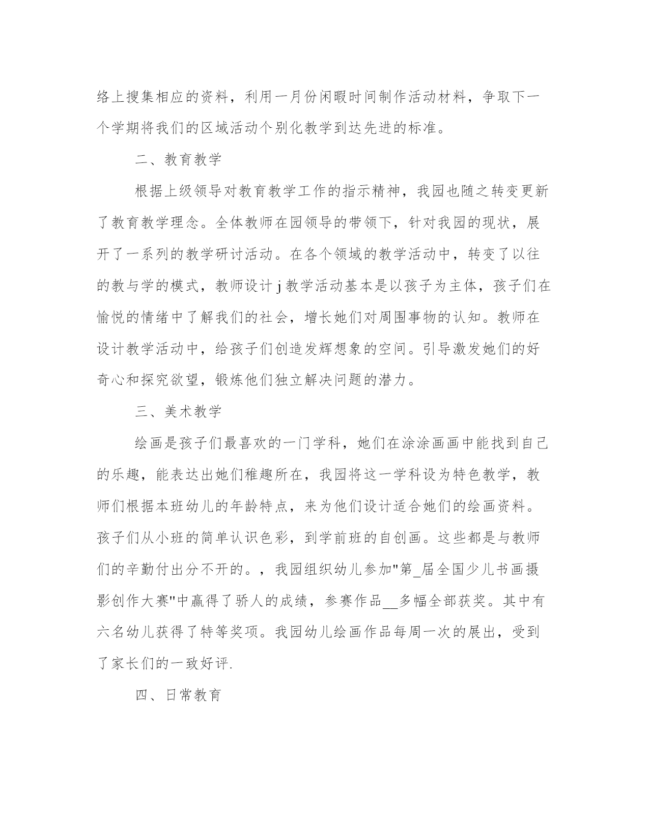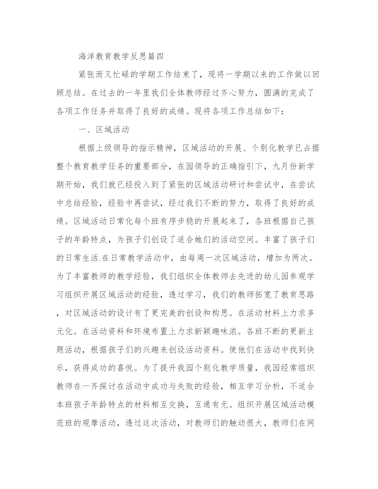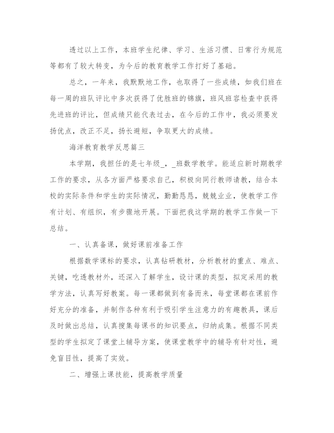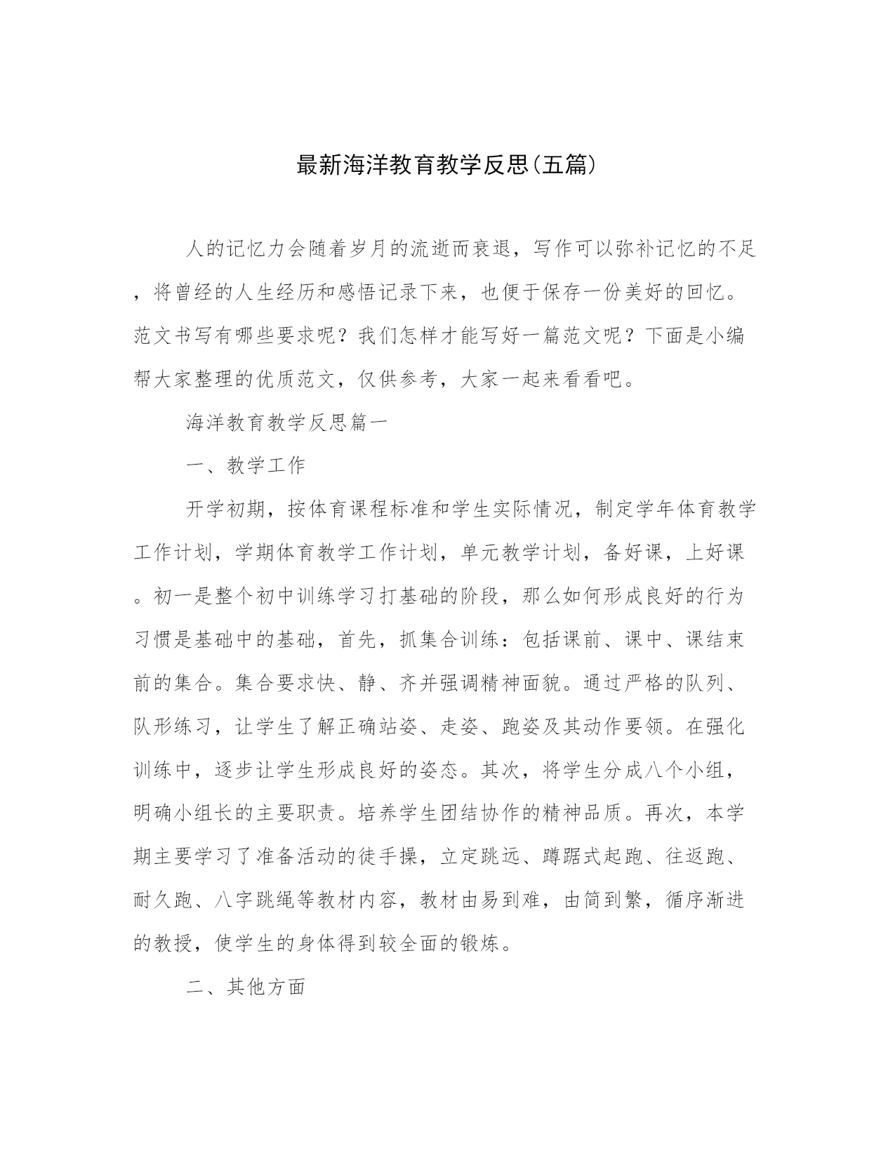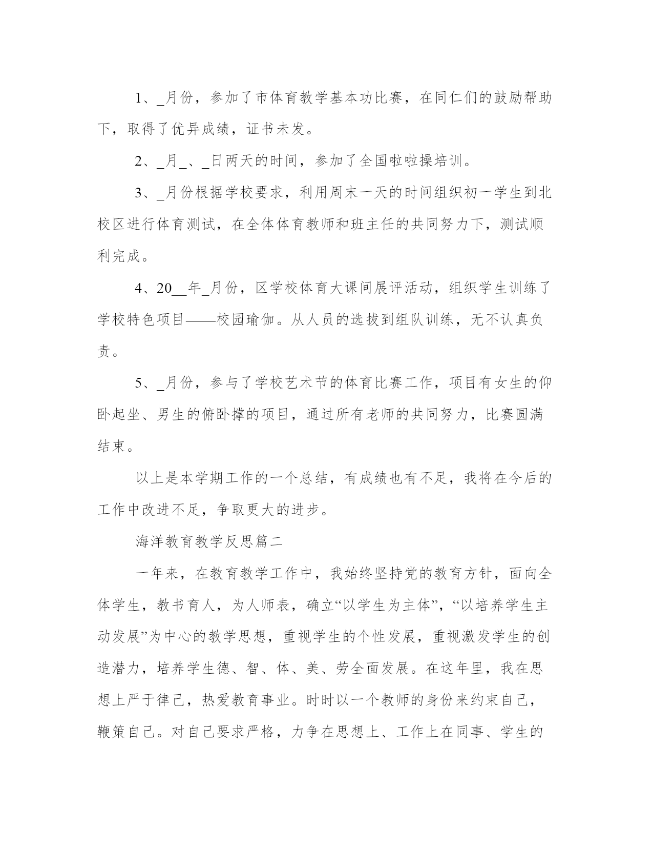 最新海洋教育教学反思(五篇)人的记忆力会随着岁月的流逝而衰退,写作可以弥补记忆的不足,将曾经的人生经历和感悟记录下来,也便于保存一份美好的回忆。范文书写有哪些要求呢?我们怎样才能写好一篇范文呢?下面是小编帮大家整理的优质范文,仅供参考,大家一起来看看吧。海洋教育教学反思篇一一、教学工作开学初期,按体育课程标准和学生实际情况,制定学年体育教学工作计划,学期体育教学工作计划,单元教学计划,备好课,上好课。初一是整个初中训练学习打基础的阶段,那么如何形成良好的行为习惯是基础中的基础,首先,抓集合训练:包括课前、课中、课结束前的集合。集合要求快、静、齐并强调精神面貌。通过严格的队列、队形练习,让学生了解正确站姿、走姿、跑姿及其动作要领。在强化训练中,逐步让学生形成良好的姿态。其次,将学生分成八个小组,明确小组长的主要职责。培养学生团结协作的精神品质。再次,本学期主要学习了准备活动的徒手操,立定跳远、蹲踞式起跑、往返跑、耐久跑、八字跳绳等教材内容,教材由易到难,由简到繁,循序渐进的教授,使学生的身体得到较全面的锻炼。二、其他方面1、_月份,参加了市体育教学基本功比赛,在同仁们的鼓励帮助下,取得了优异成绩,证书未发。2、_月_、_日两天的时间,参加了全国啦啦操培训。3、_月份根据学校要求,利用周末一天的时间组织初一学生到北校区进行体育测试,在全体体育教师和班主任的共同努力下,测试顺利完成。4、20__年_月份,区学校体育大课间展评活动,组织学生训练了学校特色项目——校园瑜伽。从人员的选拔到组队训练,无不认真负责。5、_月份,参与了学校艺术节的体育比赛工作,项目有女生的仰卧起坐、男生的俯卧撑的项目,通过所有老师的共同努力,比赛圆满结束。以上是本学期工作的一个总结,有成绩也有不足,我将在今后的工作中改进不足,争取更大的进步。海洋教育教学反思篇二一年来,在教育教学工作中,我始终坚持党的教育方针,面向全体学生,教书育人,为人师表,确立“以学生为主体”,“以培养学生主动发展”为中心的教学思想,重视学生的个性发展,重视激发学生的创造潜力,培养学生德、智、体、美、劳全面发展。在这年里,我在思想上严于律己,热爱教育事业。时时以一个教师的身份来约束自己,鞭策自己。对自己要求严格,力争在思想上、工作上在同事、学生的心目中树立起榜样的作用。我还用心参加各类政治业务学习,努力提高自己的政治水平和业务水平。服从学校的工作安排,配合领导和老师们做好校内外的各项工作。一、教学工作。教学工作是学校各项工作的中心,也是检验一个教师工作成败的关键。一年来,在坚持抓好新课程理念学习和应用的同时,我用心探索教育教学规律,充分运用学校现有的教育教学资源,大胆改革课堂教学,加大新型教学方法使用力度,取得了明显效果,具体表此刻:(一)发挥教师为主导的作用1、备课深入细致。平时认真分析教材,多方参阅各种资料,力求深入理解教材,准确把握难重点。注意学生的实际状况。教案编写认真,并不断归纳总结经验教训。2、注重课堂教学效果。针对低年级学生特点,以愉快式教学为主,不搞满堂灌,坚持学生为主体,教师为主导、教学为主线,注重讲练结合。在教学中注意抓住重点,突破难点。3、坚持参加校内外教学研讨活动,不断汲取他人的宝贵经验,提高自己的教学水平。经常向经验丰富的教师请教并经常在一齐讨论教学问题。听公开课多次,使我明确了今后讲课的方向和以后语文课该怎样教和怎样讲。4、在作业批改上,认真及时,力求做到全批全改,重在订正,及时了解学生的学习状况,以便在辅导中做到有的放矢。(二)调动学生的用心性。在教学中尊重孩子的不同兴趣爱好,不同的生活感受和不同的表现形式,使他们构成自己不同的风格,不强求一律。有意识地以学生为主体,教师为主导,透过各种游戏、比赛等教学手段,充分调动他们的学习兴趣及学习用心性。让他们的天性和个性得以自由健康的发挥。让学生在视、听、触觉中培养了创造性思维方式,变"要我学"为"我要学",极大地活跃了课堂气氛,相应提高了课堂教学效率。(三)做好后进生转化工作。作为教师,就应明白任何学生都会同时存在优点和缺点两方面,对优生的优点是显而易见的,对后进生则易于发现其缺点,尤其是在学习上后进的学生,往往得不到老师的肯定,而后进生转化成功与否,直接影响着全班学生的整体成绩。所以,一年来,我一向注重从以下几方面抓好后进生转化工作:1、用发展的观点看学生。应当纵向地看到:后进生的这天比他的昨日好,即使不然,也应相信他的明天会比这天好。2、因势利导,化消极因素为用心因素。首先帮忙后进生找到优、缺点,以发扬优点,克服缺点。其次以平常的心态对待:后进生也是孩子,厌恶、责骂只能适得其反,他们就应享有同其它学生同样的平等和民主,也就应在稍有一点进步时得到老师的肯定。3、真正
