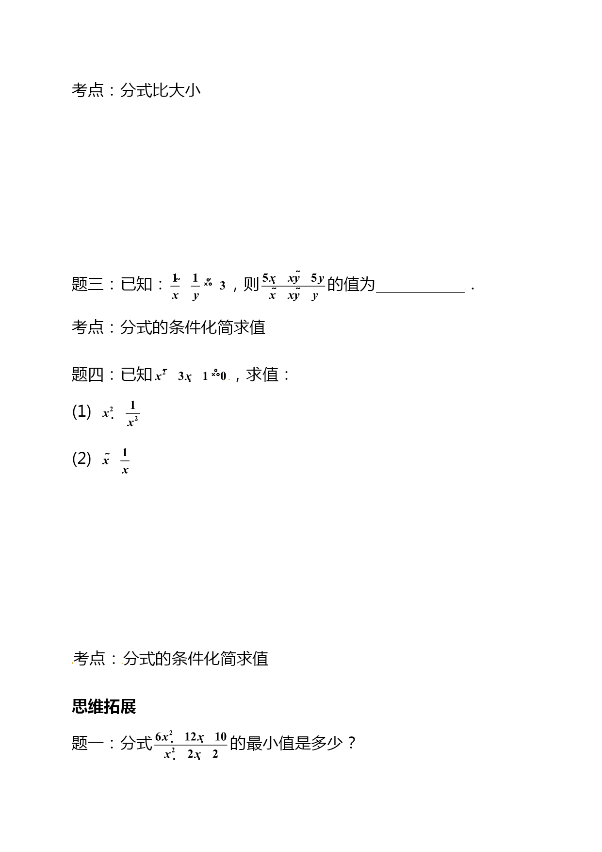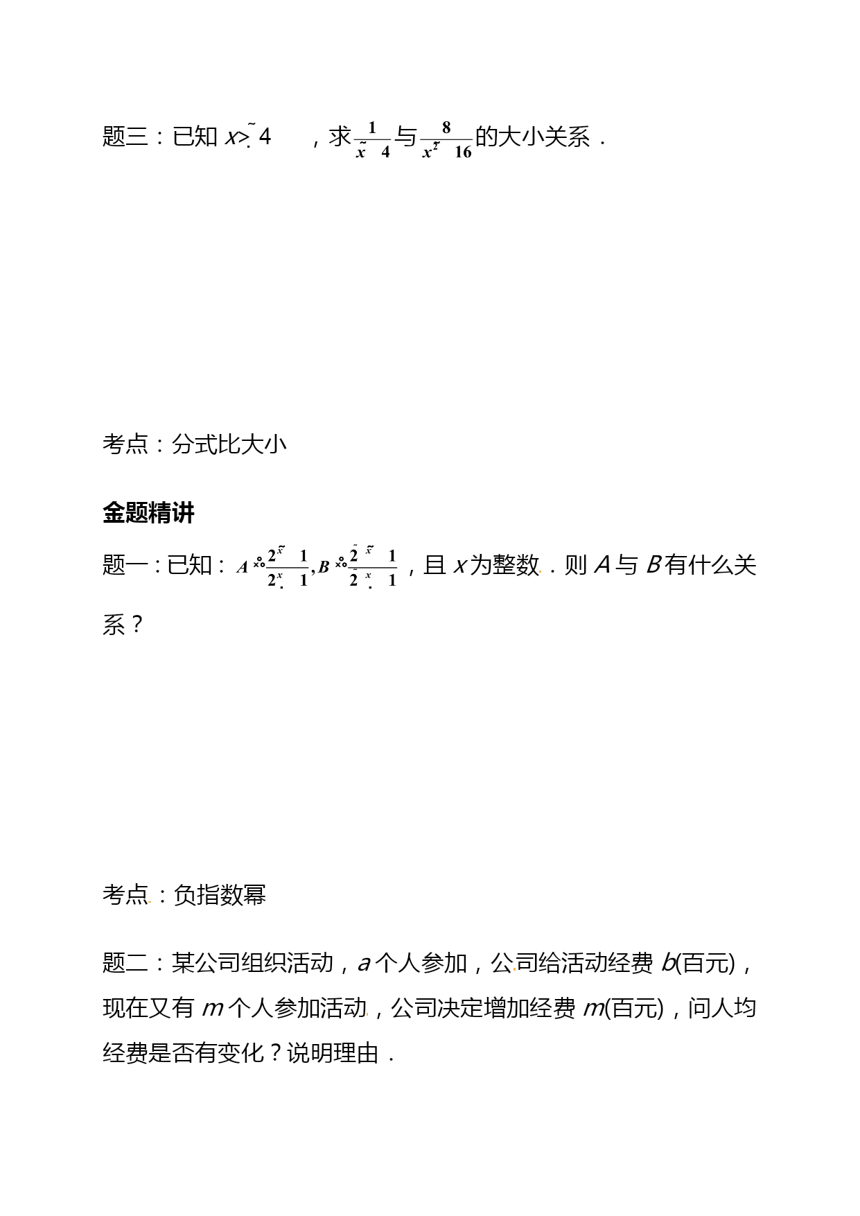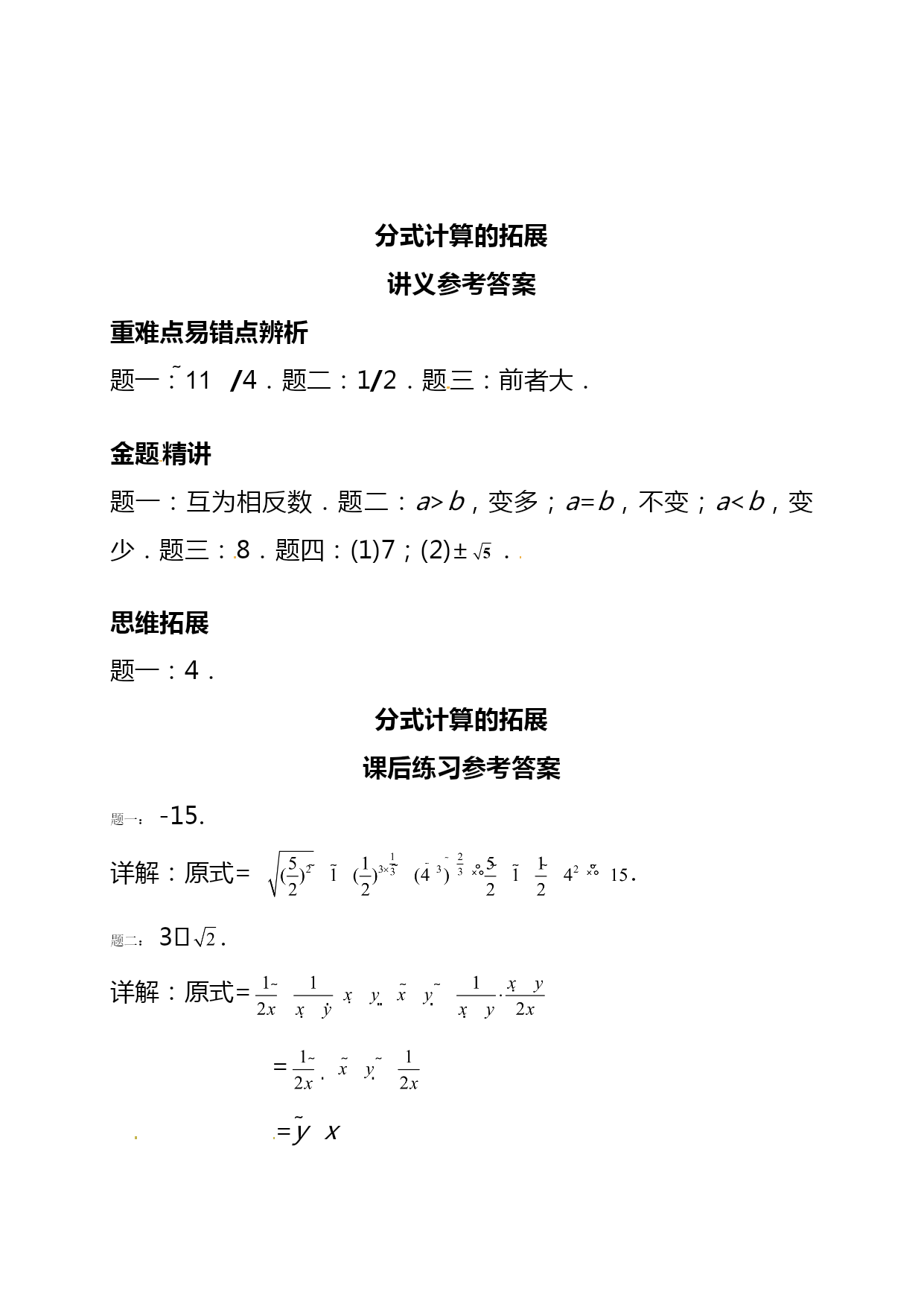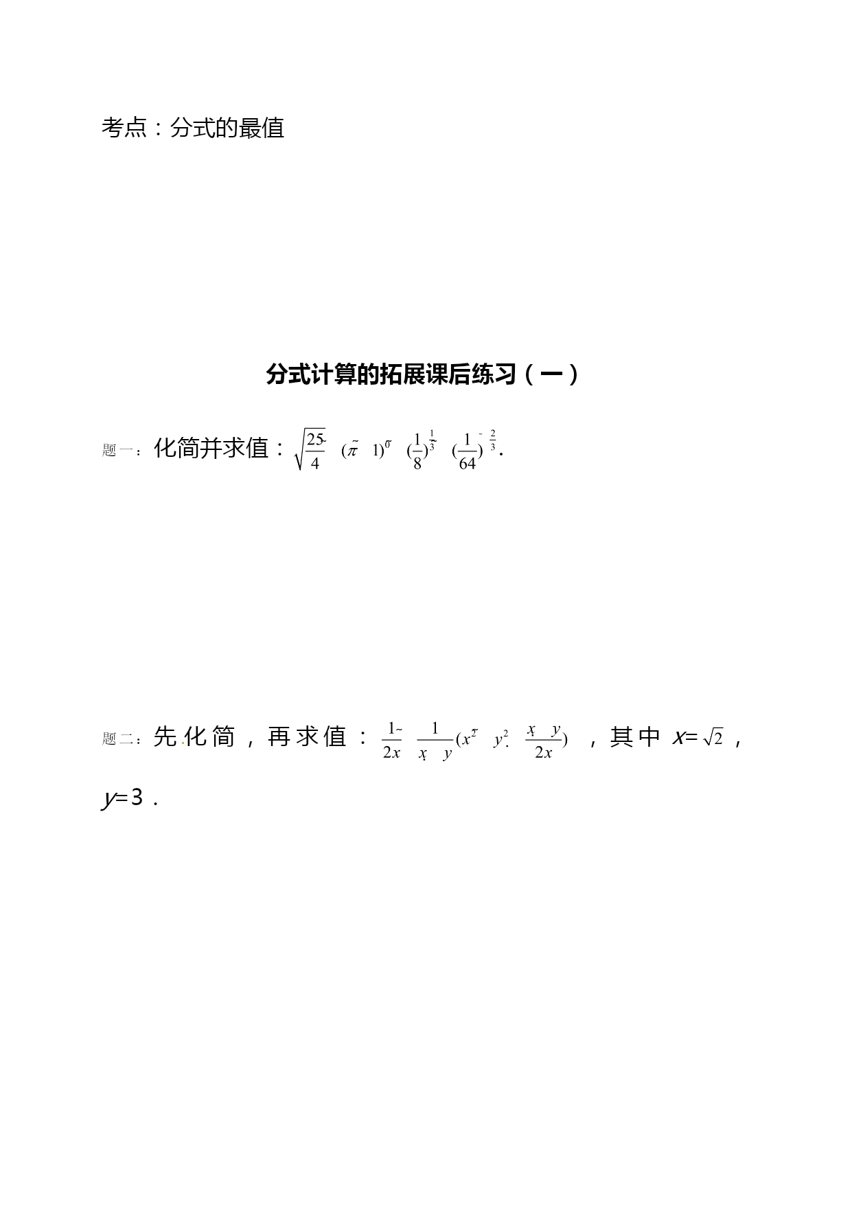 分式计算的拓展--讲义名师(完整版)资料(可以直接使用,可编辑优秀版资料,欢迎下载)分式计算的拓展重难点易错点辨析题一:计算:考点:负指数幂、零指数幂题二:已知,求的值.考点:分式的条件化简求值题三:已知x>4,求与的大小关系.考点:分式比大小金题精讲题一:已知:,且x为整数.则A与B有什么关系?考点:负指数幂题二:某公司组织活动,a个人参加,公司给活动经费b(百元),现在又有m个人参加活动,公司决定增加经费m(百元),问人均经费是否有变化?说明理由.考点:分式比大小题三:已知:,则的值为.考点:分式的条件化简求值题四:已知,求值:(1)(2)考点:分式的条件化简求值思维拓展题一:分式的最小值是多少?考点:分式的最值分式计算的拓展课后练习(一)化简并求值:.先化简,再求值:,其中x=,y=3.比较a与的大小.已知A=,B=,当x≠1时,比较A与B的大小.已知a,b,m是正实数,且a<b,求证:.已知:,求代数式的值.已知,x25x1=0,求:(1)x2+;(2)2x2-5x+.分式的最小值是.分式计算的拓展课后练习(二)化简并求值:.已知:x25xy+6y2=0,那么的值为.若x>0,试比较和的大小.已知两个分式A=,B=,其中x≠2,则A与B的关系是.已知a>b>0,m<0,比较的大小.已知,求的值.已知方程x2+3x5=0的两根为x1、x2,求值.分式的最小值是多少?分式计算的拓展讲义参考答案重难点易错点辨析题一:11/4.题二:1/2.题三:前者大.金题精讲题一:互为相反数.题二:a>b,变多;a=b,不变;a<b,变少.题三:8.题四:(1)7;(2)±.思维拓展题一:4.分式计算的拓展课后练习参考答案-15.详解:原式=.3.详解:原式===yx当x=,y=3时,原式=3.当a>1或1<a<0时,a>;当a=±1时,a=;当a=0时,不存在,不能比较;当0<a<1时或a<1时,a<.详解:当a>1时,a>;当a=1时,a=;当0<a<1时,a<;当a=0时,不存在,没法比较;当1<a<0时,a>;当a=1时,a=;当a<1时,a<;综上所得:当a>1或-1<a<0时,a>;当a=±1时,a=;当a=0时,不存在,不能比较;当0<a<1时或a<1时,a<.A>B.详解:根据题意得:AB===,当x≠1时,>0,所以AB>0,即A>B..详解:由a,b,m是正实数,故要证,只要证a(+m)<b(+m)只要证ab+am<ab+bm,只要证am<bm,而m>0,只要证a<b,由条件a<b成立,故原不等式成立..详解:∵且xy≠0∴x+y=2xy,∴===.27;28.详解:(1)∵x25x1=0,∴x5=0,∴x=5,∴两边平方得:x2-2+=25,x2+=27;(2)∵x25x1=0,∴x25x=1,∴2x2-5x+=x25x+x2+=1+27=28.4.详解:令y==,问题转化为考虑函数z=x2+2x+2的最小值,∵z=x2+2x+2=(x+1)2+1∴当x=1时,zmin=1,∴ymin=62=4,即分式的最小值是4.分式计算的拓展课后练习参考答案15.详解:=15.答案:.详解:∵x25xy+6y2=0,∴(x2y)(x3y)=0,∴x2y=0或x3y=0,即x=2y或x=3y,∴当x=2y时,=;当x=3y时,原式的值为:.答案:当0<x<1时,<;当x=1时,=;当x>1时,>.详解:对x>0进行分类,0<x<1时,<1,>1;当x=1时=1,=1;当x>1时,>1,<1.由此可以得到答案.当0<x<1时,<;当x=1时,=;当x>1时,>.答案:互为相反数.详解:∵B==,又∵A=,∴A+B=+=0,∴A与B的关系是互为相反数.答案:.详解:∵a>b>0,m<0,∴0>ba,bm>0,∴ba<0,b-m>0,又∵,而ba<0,bm>0,b>0,m<0,∴>0,∴,∴.答案
