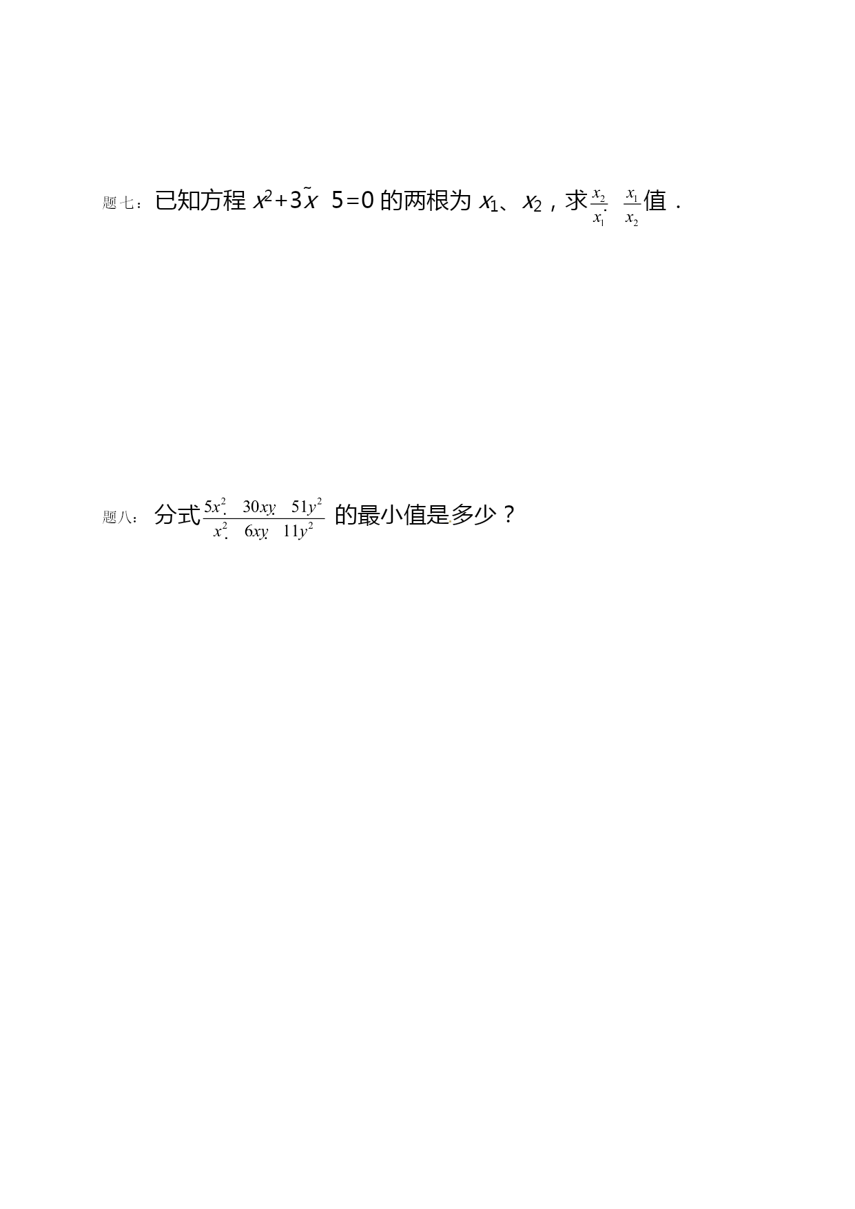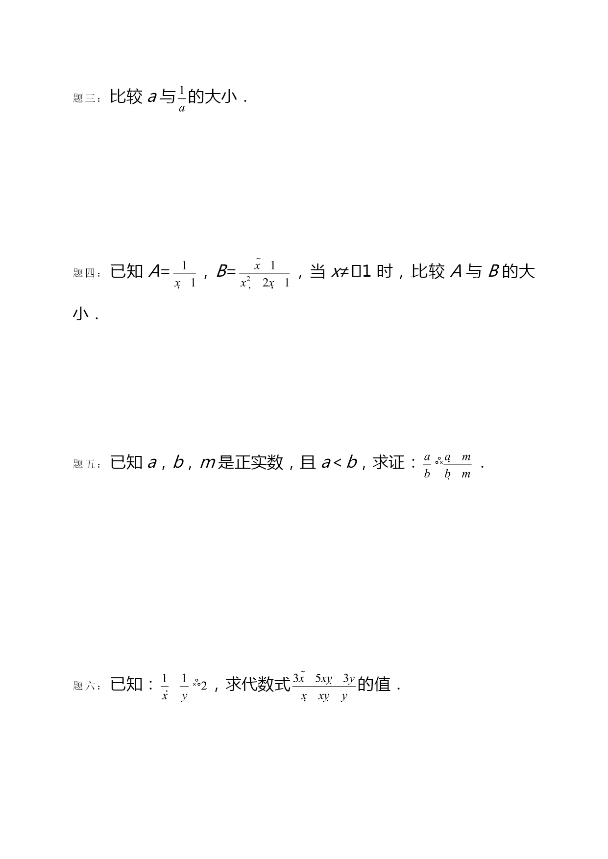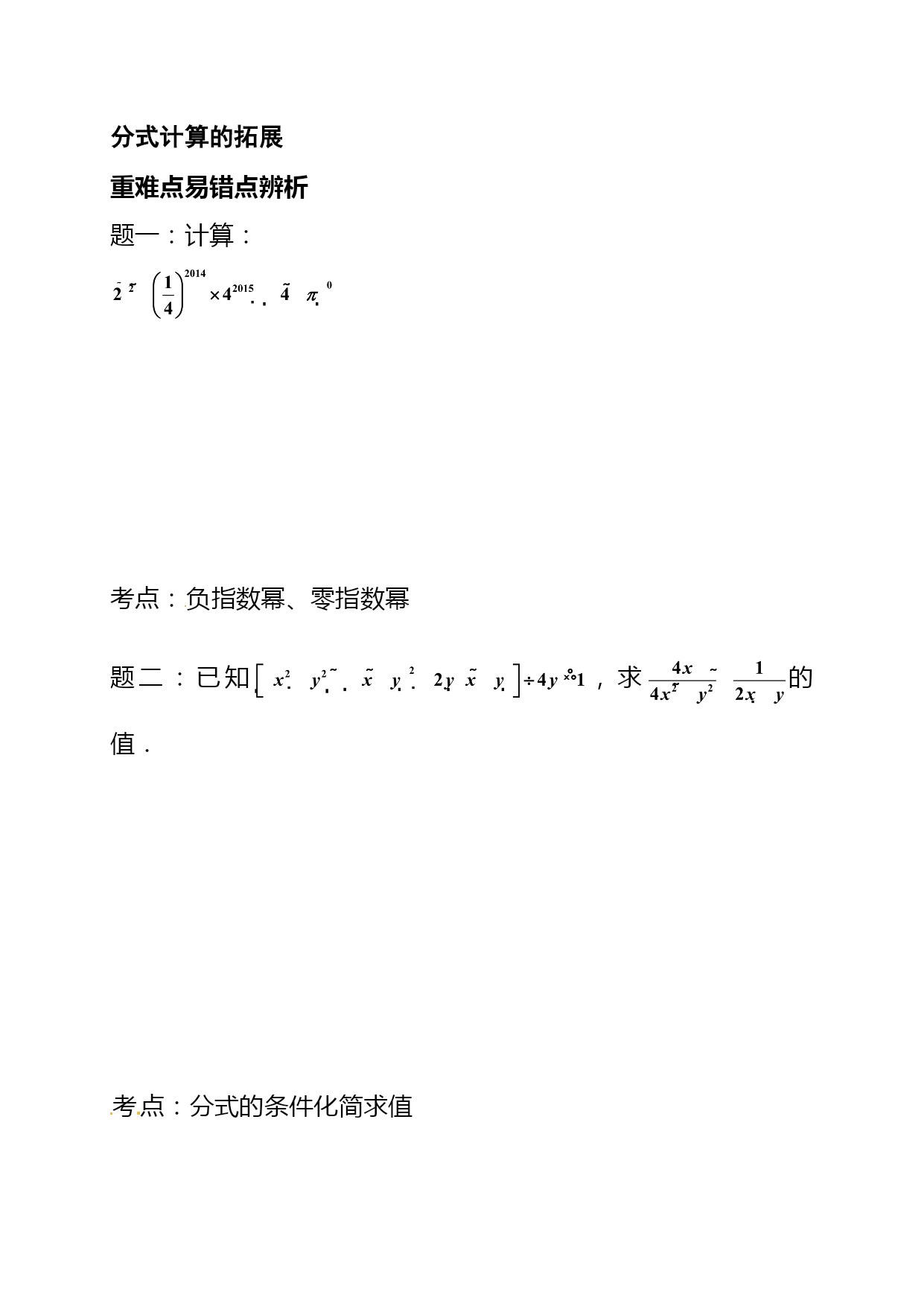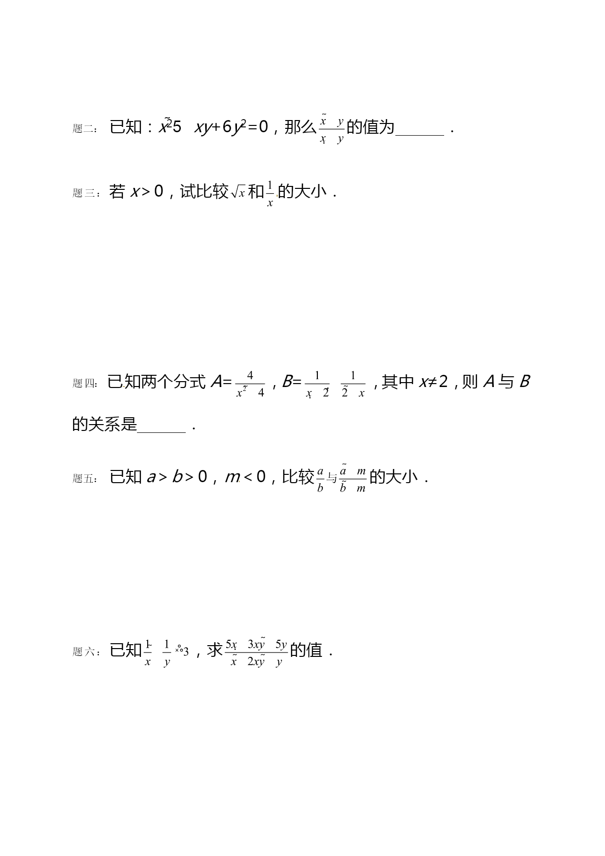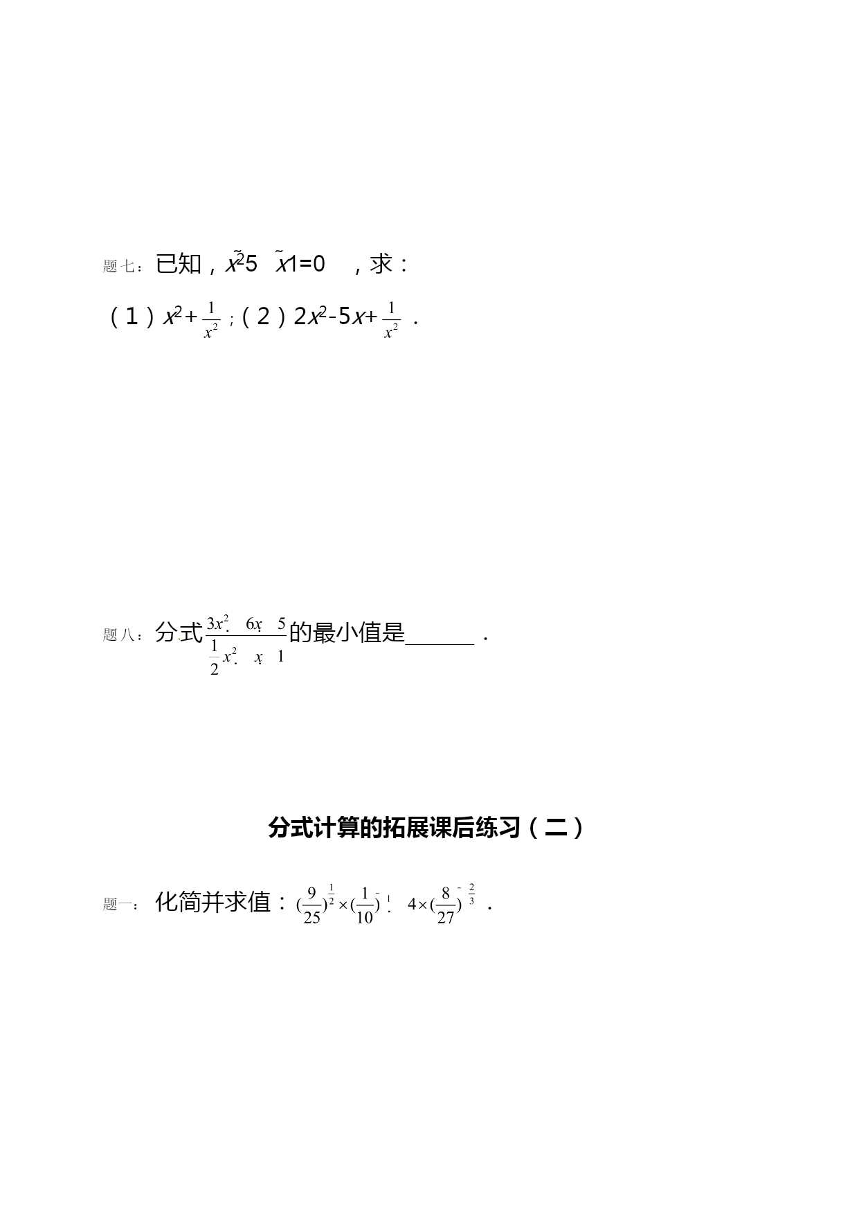 分式计算的拓展--讲义名师(完整版)资料(可以直接使用,可编辑优秀版资料,欢迎下载)分式计算的拓展重难点易错点辨析题一:计算:考点:负指数幂、零指数幂题二:已知,求的值.考点:分式的条件化简求值题三:已知x>4,求与的大小关系.考点:分式比大小金题精讲题一:已知:,且x为整数.则A与B有什么关系?考点:负指数幂题二:某公司组织活动,a个人参加,公司给活动经费b(百元),现在又有m个人参加活动,公司决定增加经费m(百元),问人均经费是否有变化?说明理由.考点:分式比大小题三:已知:,则的值为.考点:分式的条件化简求值题四:已知,求值:(1)(2)考点:分式的条件化简求值思维拓展题一:分式的最小值是多少?考点:分式的最值分式计算的拓展课后练习(一)化简并求值:.先化简,再求值:,其中x=,y=3.比较a与的大小.已知A=,B=,当x≠1时,比较A与B的大小.已知a,b,m是正实数,且a<b,求证:.已知:,求代数式的值.已知,x25x1=0,求:(1)x2+;(2)2x2-5x+.分式的最小值是.分式计算的拓展课后练习(二)化简并求值:.已知:x25xy+6y2=0,那么的值为.若x>0,试比较和的大小.已知两个分式A=,B=,其中x≠2,则A与B的关系是.已知a>b>0,m<0,比较的大小.已知,求的值.已知方程x2+3x5=0的两根为x1、x2,求值.分式的最小值是多少?分式计算的拓展讲义参考答案重难点易错点辨析题一:11/4.题二:1/2.题三:前者大.金题精讲题一:互为相反数.题二:a>b,变多;a=b,不变;a<b,变少.题三:8.题四:(1)7;(2)±.思维拓展题一:4.分式计算的拓展课后练习参考答案-15.详解:原式=.3.详解:原式===yx当x=,y=3时,原式=3.当a>1或1<a<0时,a>;当a=±1时,a=;当a=0时,不存在,不能比较;当0<a<1时或a<1时,a<.详解:当a>1时,a>;当a=1时,a=;当0<a<1时,a<;当a=0时,不存在,没法比较;当1<a<0时,a>;当a=1时,a=;当a<1时,a<;综上所得:当a>1或-1<a<0时,a>;当a=±1时,a=;当a=0时,不存在,不能比较;当0<a<1时或a<1时,a<.A>B.详解:根据题意得:AB===,当x≠1时,>0,所以AB>0,即A>B..详解:由a,b,m是正实数,故要证,只要证a(+m)<b(+m)只要证ab+am<ab+bm,只要证am<bm,而m>0,只要证a<b,由条件a<b成立,故原不等式成立..详解:∵且xy≠0∴x+y=2xy,∴===.27;28.详解:(1)∵x25x1=0,∴x5=0,∴x=5,∴两边平方得:x2-2+=25,x2+=27;(2)∵x25x1=0,∴x25x=1,∴2x2-5x+=x25x+x2+=1+27=28.4.详解:令y==,问题转化为考虑函数z=x2+2x+2的最小值,∵z=x2+2x+2=(x+1)2+1∴当x=1时,zmin=1,∴ymin=62=4,即分式的最小值是4.分式计算的拓展课后练习参考答案15.详解:=15.答案:.详解:∵x25xy+6y2=0,∴(x2y)(x3y)=0,∴x2y=0或x3y=0,即x=2y或x=3y,∴当x=2y时,=;当x=3y时,原式的值为:.答案:当0<x<1时,<;当x=1时,=;当x>1时,>.详解:对x>0进行分类,0<x<1时,<1,>1;当x=1时=1,=1;当x>1时,>1,<1.由此可以得到答案.当0<x<1时,<;当x=1时,=;当x>1时,>.答案:互为相反数.详解:∵B==,又∵A=,∴A+B=+=0,∴A与B的关系是互为相反数.答案:.详解:∵a>b>0,m<0,∴0>ba,bm>0,∴ba<0,b-m>0,又∵,而ba<0,bm>0,b>0,m<0,∴>0,∴,∴.答案