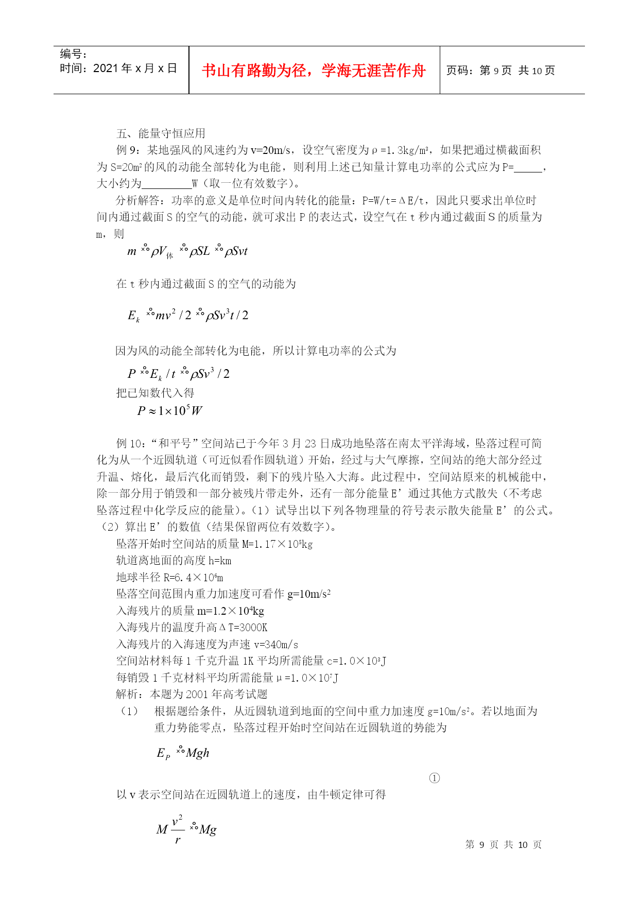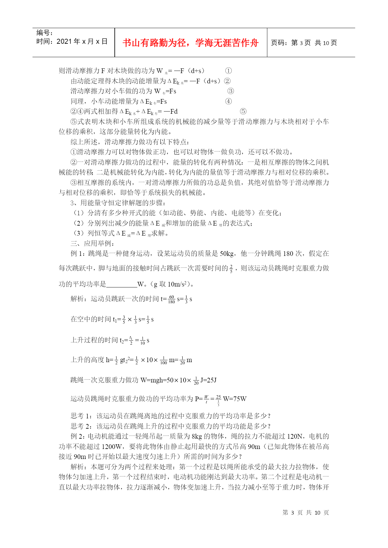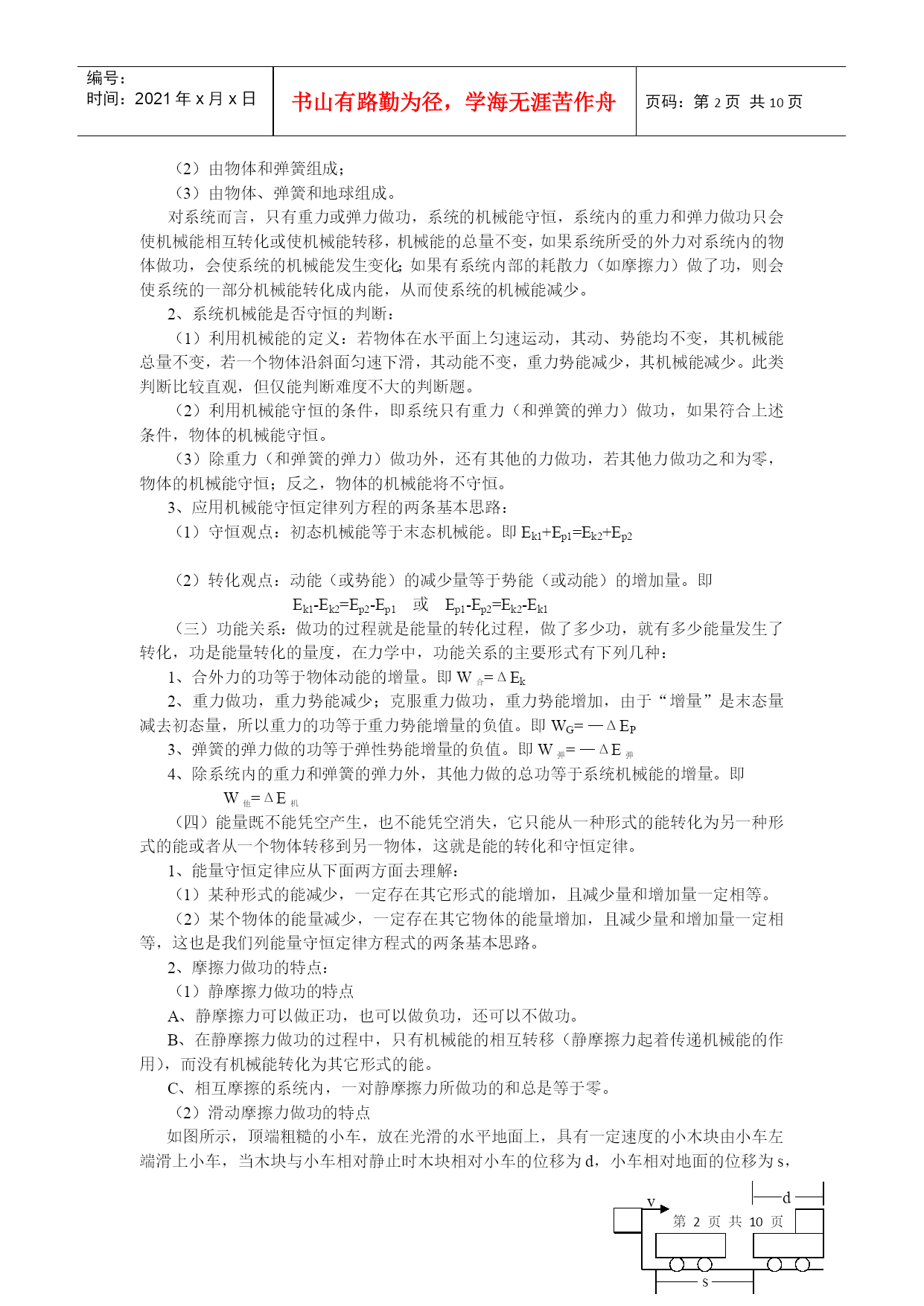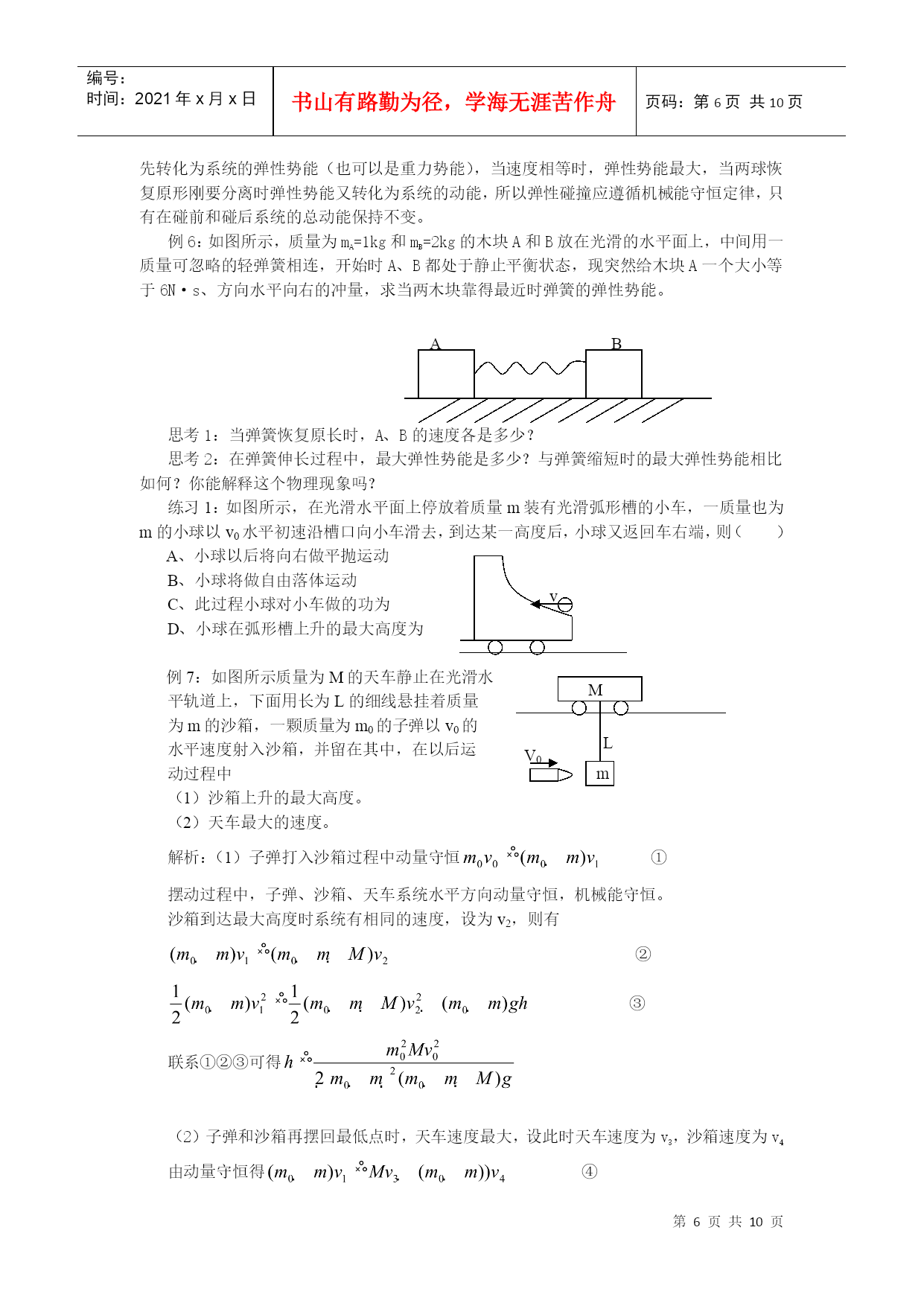 编号:时间:2021年x月x日书山有路勤为径,学海无涯苦作舟页码:第PAGE10页共NUMPAGES10页第PAGE\*MERGEFORMAT10页共NUMPAGES\*MERGEFORMAT10页常州市2004届重点中学高三物理教学研讨交流材料机械能专题复习溧阳市埭头中学马宁知恒力功W=FScosa一、[知识结构]P=W/T平均功率基本概念功率P=F*V瞬时功率动能机械能机械能重力势能势能弹性势能动能定理基本规律机械能守恒定律能量守恒定律二、[重点、难点](一)动能定理:1、动能定理反映的是物体所受合力对空间的积累导致物体的初、未态功能发生变化,它表明了物体所受合力做的功与初、未态功能变化的量值关系,所以对物体从初态到未态的过程中运动性质、运动轨迹、做功的是否是恒力等诸多问题不必追究,也就是说动能定理不受这些条件的限制。2、合力做的功还可理解为各阶段合力做功的代数和或各个力做功的代数和,当物体的运动由几个物理过程组成,又不需要研究中间状态,可以对整个物理过程去研究,这就体现出运用动能定理解题过程简明、方法巧妙的优越性。但要注意的是运用功能定理角还必须强调对物体的受力分析以及物理过程的选择。3、[思维方法点拨]应用动能定理解题,一般比应用牛顿第二定律结合运动学公式解题要简便,在应用动能定理解题时,要注意以下几个问题:(1)正确分析物体受力,要考虑物体所受的所有外力,包括重力。(2)要弄清各个外力做功的情况,计算时应把各已知功的正、负号代入动能定理的表达式。(3)有些力在物体运动全过程中不是始终存在的,导致物体的运动包含几个物理过程,物体运动状态、受力等情况均发生变化,因而在考虑外力做功时,必须根据不同情况,分别对待。(二)机械能守恒条件的理解1、首先应明确机械能守恒定律研究的对象是一个系统,这个系统通常有三种组成形式:(1)由物体和地球组成;(2)由物体和弹簧组成;(3)由物体、弹簧和地球组成。对系统而言,只有重力或弹力做功,系统的机械能守恒,系统内的重力和弹力做功只会使机械能相互转化或使机械能转移,机械能的总量不变,如果系统所受的外力对系统内的物体做功,会使系统的机械能发生变化;如果有系统内部的耗散力(如摩擦力)做了功,则会使系统的一部分机械能转化成内能,从而使系统的机械能减少。2、系统机械能是否守恒的判断:(1)利用机械能的定义:若物体在水平面上匀速运动,其动、势能均不变,其机械能总量不变,若一个物体沿斜面匀速下滑,其动能不变,重力势能减少,其机械能减少。此类判断比较直观,但仅能判断难度不大的判断题。(2)利用机械能守恒的条件,即系统只有重力(和弹簧的弹力)做功,如果符合上述条件,物体的机械能守恒。(3)除重力(和弹簧的弹力)做功外,还有其他的力做功,若其他力做功之和为零,物体的机械能守恒;反之,物体的机械能将不守恒。3、应用机械能守恒定律列方程的两条基本思路:(1)守恒观点:初态机械能等于末态机械能。即Ek1+Ep1=Ek2+Ep2(2)转化观点:动能(或势能)的减少量等于势能(或动能)的增加量。即Ek1-Ek2=Ep2-Ep1或Ep1-Ep2=Ek2-Ek1(三)功能关系:做功的过程就是能量的转化过程,做了多少功,就有多少能量发生了转化,功是能量转化的量度,在力学中,功能关系的主要形式有下列几种:1、合外力的功等于物体动能的增量。即W合=ΔEk2、重力做功,重力势能减少;克服重力做功,重力势能增加,由于“增量”是末态量减去初态量,所以重力的功等于重力势能增量的负值。即WG=—ΔEP3、弹簧的弹力做的功等于弹性势能增量的负值。即W弹=—ΔE弹4、除系统内的重力和弹簧的弹力外,其他力做的总功等于系统机械能的增量。即W他=ΔE机(四)能量既不能凭空产生,也不能凭空消失,它只能从一种形式的能转化为另一种形式的能或者从一个物体转移到另一物体,这就是能的转化和守恒定律。1、能量守恒定律应从下面两方面去理解:(1)某种形式的能减少,一定存在其它形式的能增加,且减少量和增加量一定相等。(2)某个物体的能量减少,一定存在其它物体的能量增加,且减少量和增加量一定相等,这也是我们列能量守恒定律方程式的两条基本思路。2、摩擦力做功的特点:(1)静摩擦力做功的特点A、静摩擦力可以做正功,也可以做负功,还可以不做功。B、在静摩擦力做功的过程中,只有机械能的相互转移(静摩擦力起着传递机械能的作用),而没有机械能转化为其它形式的能。C、相互摩擦的系统内,一对静摩擦力所做功的和总是等于零。(2)滑动摩擦力做功的特点sdv如图所示,顶端粗糙的小车,放在光滑的水平