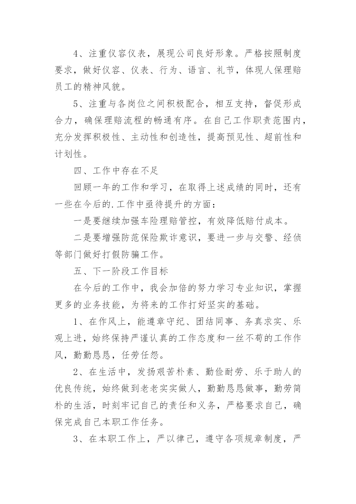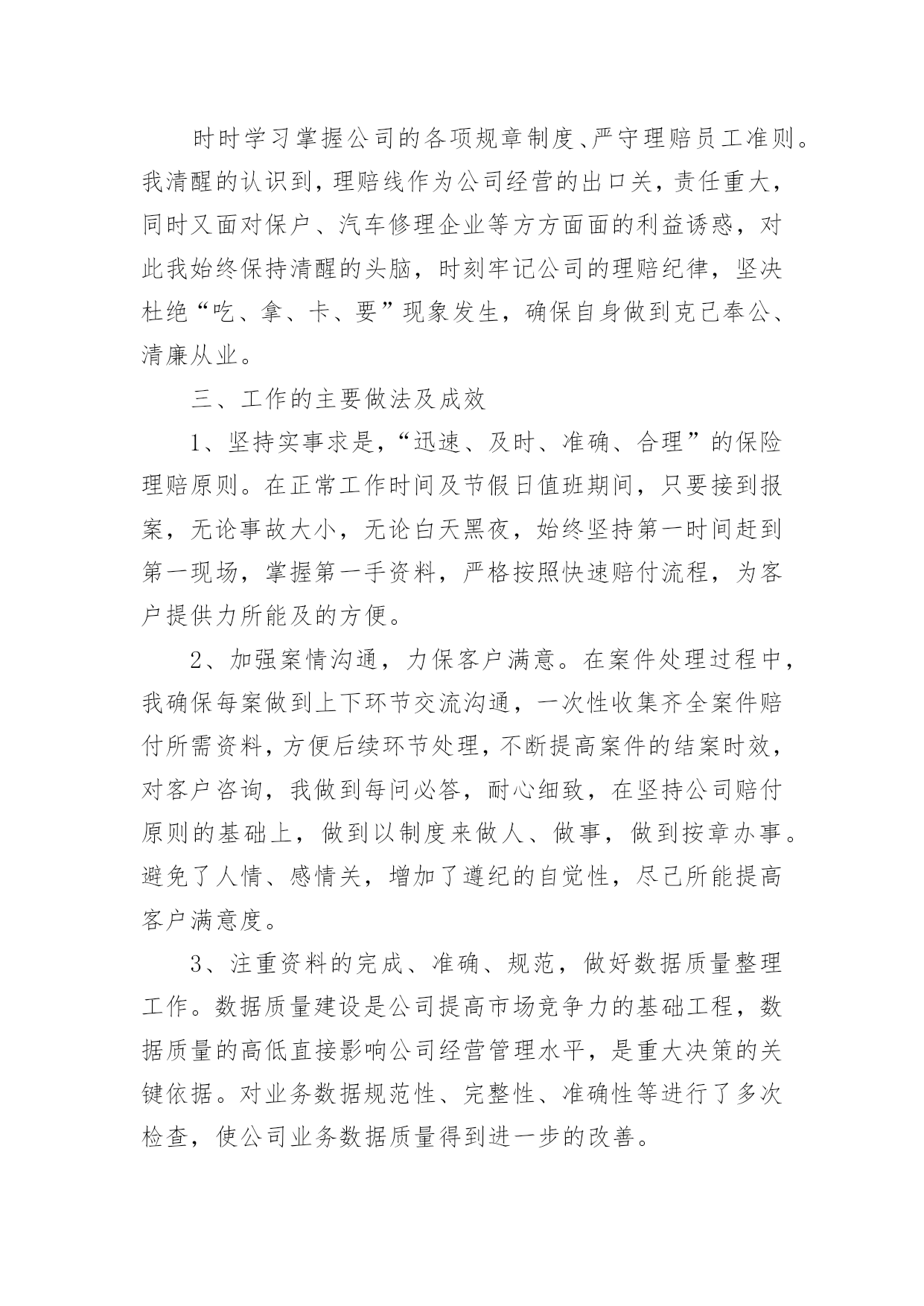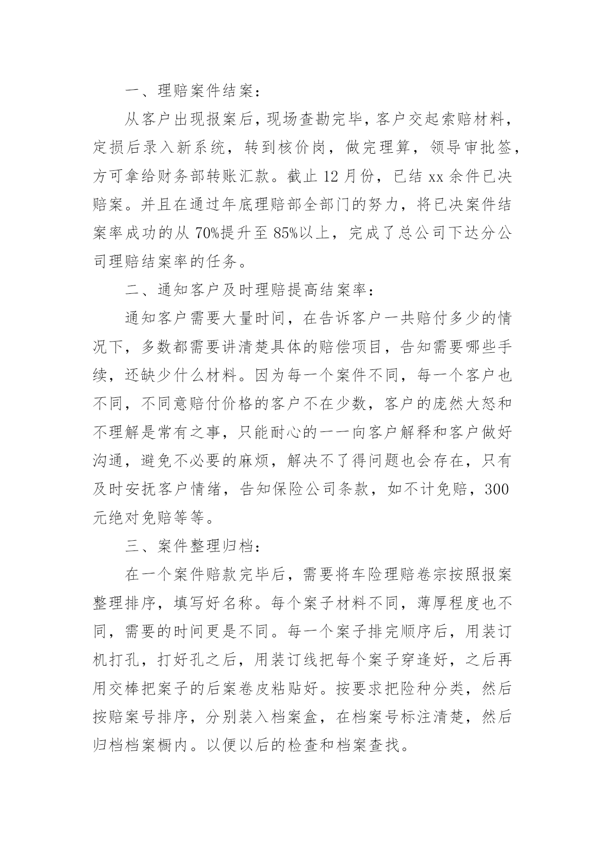 保险理赔员工作总结保险理赔员工作总结(通用11篇)总结在一个时期、一个年度、一个阶段对学习和工作生活等情况加以回顾和分析的一种书面材料,它可以有效锻炼我们的语言组织能力,让我们一起来学习写总结吧。那么如何把总结写出新花样呢?以下是小编整理的保险理赔员工作总结,欢迎阅读,希望大家能够喜欢。保险理赔员工作总结120xx年即将过去,在公司领导的悉心关怀下和同事们的帮助指导下,结合我自身的努力,在工作、学习等各方面都取得了长足的进步,尤其是在保险理赔专业知识和技能培养方面的成熟,使我成为一名合格的车险查勘定损员。随着工作岗位的调整,我已经成长为为一名能够独立工作、业务熟练的前台工作人员。现将一年来的工作情况向公司领导总结、汇报如下:一、加强理论学习,注重个人素质提高加强自身业务学习,争做理赔标兵。在日常的工作学习中,我坚持学习更多的保险知识和业务技能,在老同志的“传帮带”下,不断加强个人自学,弥补个人在保险专业知识和理赔技能上的不足,始终保持着学无止境的学习精神,力争以优质、快速、合规的专业素质做好理赔客户服务工作,报效公司培养,并抱以乐观、积极的态度,以争做理赔标兵为目标。二、严格管理制度,恪守保险人员职业道德时时学习掌握公司的各项规章制度、严守理赔员工准则。我清醒的认识到,理赔线作为公司经营的出口关,责任重大,同时又面对保户、汽车修理企业等方方面面的利益诱惑,对此我始终保持清醒的头脑,时刻牢记公司的理赔纪律,坚决杜绝“吃、拿、卡、要”现象发生,确保自身做到克己奉公、清廉从业。三、工作的主要做法及成效1、坚持实事求是,“迅速、及时、准确、合理”的保险理赔原则。在正常工作时间及节假日值班期间,只要接到报案,无论事故大小,无论白天黑夜,始终坚持第一时间赶到第一现场,掌握第一手资料,严格按照快速赔付流程,为客户提供力所能及的方便。2、加强案情沟通,力保客户满意。在案件处理过程中,我确保每案做到上下环节交流沟通,一次性收集齐全案件赔付所需资料,方便后续环节处理,不断提高案件的结案时效,对客户咨询,我做到每问必答,耐心细致,在坚持公司赔付原则的基础上,做到以制度来做人、做事,做到按章办事。避免了人情、感情关,增加了遵纪的自觉性,尽己所能提高客户满意度。3、注重资料的完成、准确、规范,做好数据质量整理工作。数据质量建设是公司提高市场竞争力的基础工程,数据质量的高低直接影响公司经营管理水平,是重大决策的关键依据。对业务数据规范性、完整性、准确性等进行了多次检查,使公司业务数据质量得到进一步的改善。4、注重仪容仪表,展现公司良好形象。严格按照制度要求,做好仪容、仪表、行为、语言、礼节,体现人保理赔员工的精神风貌。5、注重与各岗位之间积极配合,相互支持,督促形成合力,确保理赔流程的畅通有序。在自己工作职责范围内,充分发挥积极性、主动性和创造性,提高预见性、超前性和计划性。四、工作中存在不足回顾一年的工作和学习,在取得上述成绩的同时,还有一些在今后的.工作中亟待提升的方面:一是要继续加强车险理赔管控,有效降低赔付成本。二是要增强防范保险欺诈意识,要进一步与交警、经侦等部门做好打假防骗工作。五、下一阶段工作目标在今后的工作中,我会加倍的努力学习专业知识,掌握更多的业务技能,为将来的工作打好坚实的基础。1、在作风上,能遵章守纪、团结同事、务真求实、乐观上进,始终保持严谨认真的工作态度和一丝不苟的工作作风,勤勤恳恳,任劳任怨。2、在生活中,发扬艰苦朴素、勤俭耐劳、乐于助人的优良传统,始终做到老老实实做人,勤勤恳恳做事,勤劳简朴的生活,时刻牢记自己的责任和义务,严格要求自己,确保完成自己本职工作任务。3、在本职工作上,严以律己,遵守各项规章制度,严格要求自己,摆正工作位置,时刻保持“谦虚,谨慎,律己”的工作态度,在领导的关心培养和同事们的帮助下,始终勤奋学习,积极进取,努力提高自我,始终勤奋工作,认真完成任务,履行好岗位的职责。顾旧盼新,提升理赔服务质量仍然是我们的工作重心,理赔服务的好坏将直接关系到公司形象,影响到公司业务发展。车险理赔是需要管控的业务,如何缩短理赔周期,节约理赔成本,挤干理赔水分一直是我致力追求的奋斗目标。为此,在新的一年里我将更加勤奋的工作,刻苦的学习,努力提高自身的综合素质和工作技能,以崭新的精神状态投入到工作当中,为公司发展做出力所能及的应有贡献。保险理赔员工作总结2本人刚进公司不久,在这段时间匆匆如流水的日子里,根据我对公司的了解和认识,使自己学习到了很多有关保险理赔的专业知识。使我受益匪浅,从而看清楚自己还有很多不足之处,和不懂的地方,专业知识的缺乏性,为了能更好的完成工作,我应认真努力学习,用于创新进取。不断总结工作经验,扬长避短,提高自己的业务技能,现将工作情况总结如下:一、工作汇报我认为应该围绕目标,落实计划,紧抓业务工