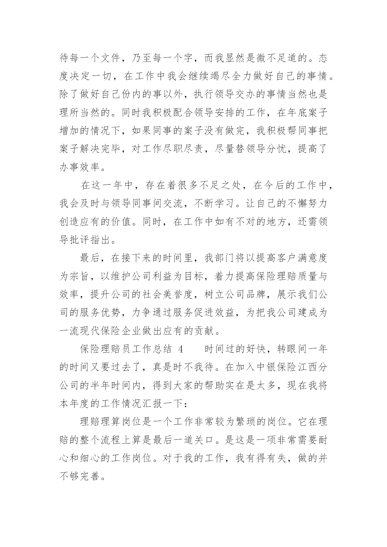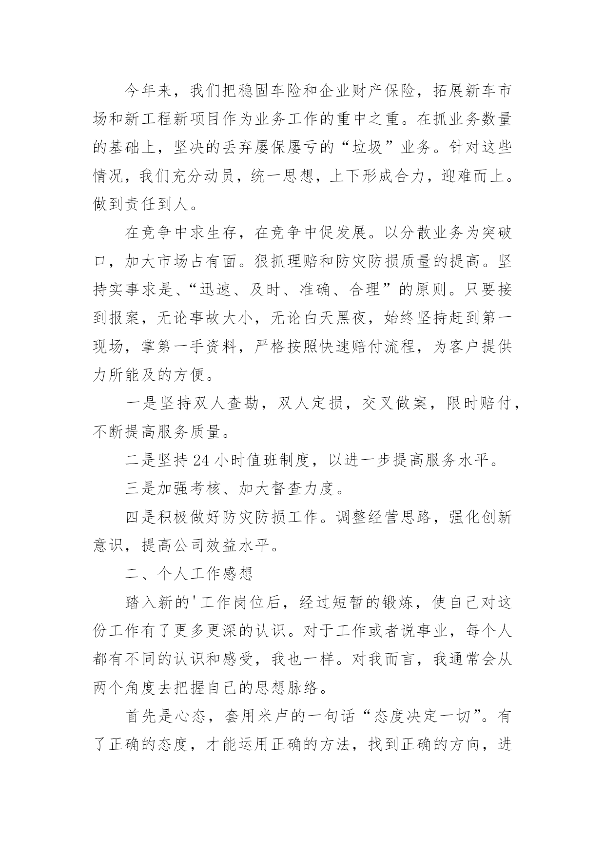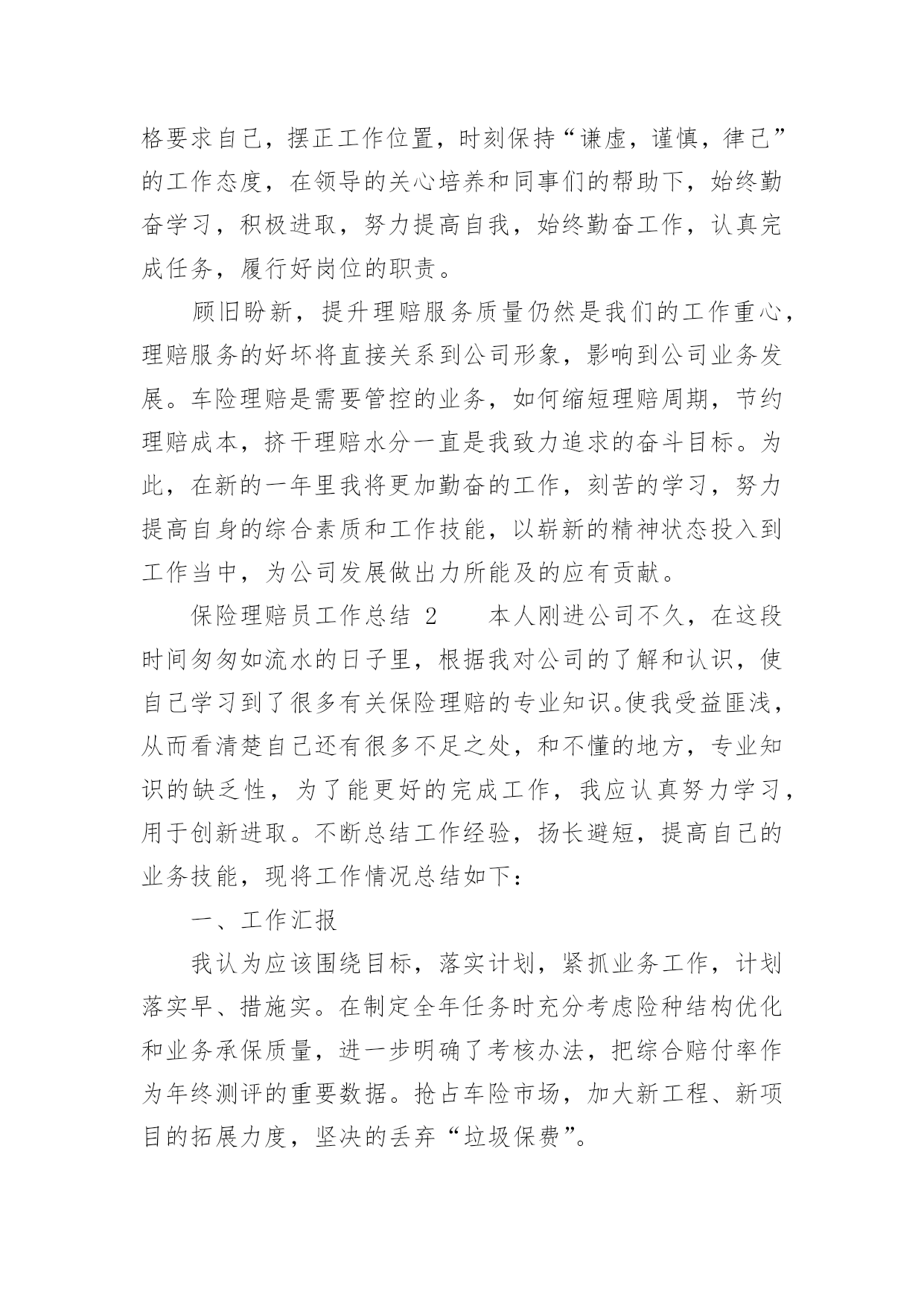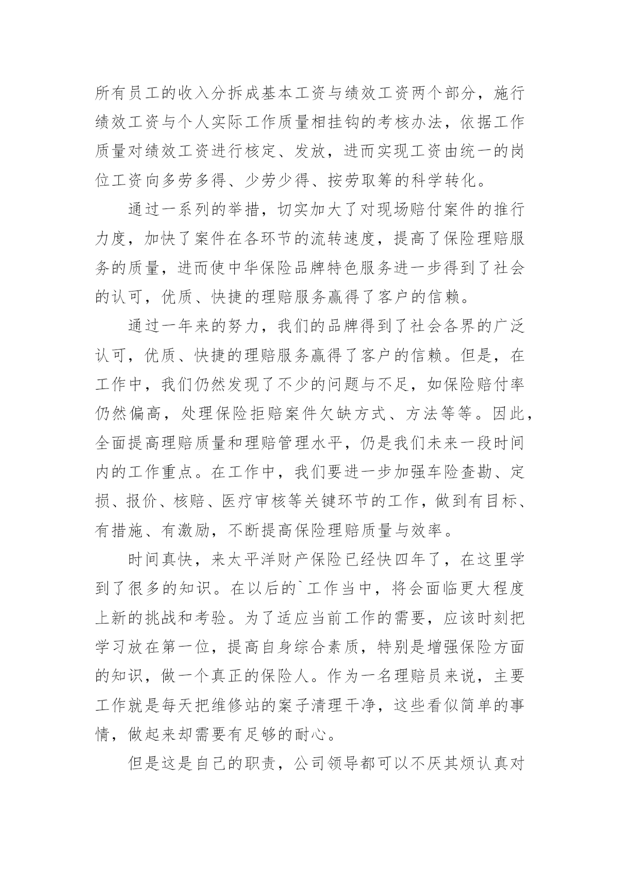 保险理赔员工作总结保险理赔员工作总结(通用11篇)总结在一个时期、一个年度、一个阶段对学习和工作生活等情况加以回顾和分析的一种书面材料,它可以有效锻炼我们的语言组织能力,让我们一起来学习写总结吧。那么如何把总结写出新花样呢?以下是小编整理的保险理赔员工作总结,欢迎阅读,希望大家能够喜欢。保险理赔员工作总结120xx年即将过去,在公司领导的悉心关怀下和同事们的帮助指导下,结合我自身的努力,在工作、学习等各方面都取得了长足的进步,尤其是在保险理赔专业知识和技能培养方面的成熟,使我成为一名合格的车险查勘定损员。随着工作岗位的调整,我已经成长为为一名能够独立工作、业务熟练的前台工作人员。现将一年来的工作情况向公司领导总结、汇报如下:一、加强理论学习,注重个人素质提高加强自身业务学习,争做理赔标兵。在日常的工作学习中,我坚持学习更多的保险知识和业务技能,在老同志的“传帮带”下,不断加强个人自学,弥补个人在保险专业知识和理赔技能上的不足,始终保持着学无止境的学习精神,力争以优质、快速、合规的专业素质做好理赔客户服务工作,报效公司培养,并抱以乐观、积极的态度,以争做理赔标兵为目标。二、严格管理制度,恪守保险人员职业道德时时学习掌握公司的各项规章制度、严守理赔员工准则。我清醒的认识到,理赔线作为公司经营的出口关,责任重大,同时又面对保户、汽车修理企业等方方面面的利益诱惑,对此我始终保持清醒的头脑,时刻牢记公司的理赔纪律,坚决杜绝“吃、拿、卡、要”现象发生,确保自身做到克己奉公、清廉从业。三、工作的主要做法及成效1、坚持实事求是,“迅速、及时、准确、合理”的保险理赔原则。在正常工作时间及节假日值班期间,只要接到报案,无论事故大小,无论白天黑夜,始终坚持第一时间赶到第一现场,掌握第一手资料,严格按照快速赔付流程,为客户提供力所能及的方便。2、加强案情沟通,力保客户满意。在案件处理过程中,我确保每案做到上下环节交流沟通,一次性收集齐全案件赔付所需资料,方便后续环节处理,不断提高案件的结案时效,对客户咨询,我做到每问必答,耐心细致,在坚持公司赔付原则的基础上,做到以制度来做人、做事,做到按章办事。避免了人情、感情关,增加了遵纪的自觉性,尽己所能提高客户满意度。3、注重资料的完成、准确、规范,做好数据质量整理工作。数据质量建设是公司提高市场竞争力的基础工程,数据质量的高低直接影响公司经营管理水平,是重大决策的关键依据。对业务数据规范性、完整性、准确性等进行了多次检查,使公司业务数据质量得到进一步的改善。4、注重仪容仪表,展现公司良好形象。严格按照制度要求,做好仪容、仪表、行为、语言、礼节,体现人保理赔员工的精神风貌。5、注重与各岗位之间积极配合,相互支持,督促形成合力,确保理赔流程的畅通有序。在自己工作职责范围内,充分发挥积极性、主动性和创造性,提高预见性、超前性和计划性。四、工作中存在不足回顾一年的工作和学习,在取得上述成绩的同时,还有一些在今后的.工作中亟待提升的方面:一是要继续加强车险理赔管控,有效降低赔付成本。二是要增强防范保险欺诈意识,要进一步与交警、经侦等部门做好打假防骗工作。五、下一阶段工作目标在今后的工作中,我会加倍的努力学习专业知识,掌握更多的业务技能,为将来的工作打好坚实的基础。1、在作风上,能遵章守纪、团结同事、务真求实、乐观上进,始终保持严谨认真的工作态度和一丝不苟的工作作风,勤勤恳恳,任劳任怨。2、在生活中,发扬艰苦朴素、勤俭耐劳、乐于助人的优良传统,始终做到老老实实做人,勤勤恳恳做事,勤劳简朴的生活,时刻牢记自己的责任和义务,严格要求自己,确保完成自己本职工作任务。3、在本职工作上,严以律己,遵守各项规章制度,严格要求自己,摆正工作位置,时刻保持“谦虚,谨慎,律己”的工作态度,在领导的关心培养和同事们的帮助下,始终勤奋学习,积极进取,努力提高自我,始终勤奋工作,认真完成任务,履行好岗位的职责。顾旧盼新,提升理赔服务质量仍然是我们的工作重心,理赔服务的好坏将直接关系到公司形象,影响到公司业务发展。车险理赔是需要管控的业务,如何缩短理赔周期,节约理赔成本,挤干理赔水分一直是我致力追求的奋斗目标。为此,在新的一年里我将更加勤奋的工作,刻苦的学习,努力提高自身的综合素质和工作技能,以崭新的精神状态投入到工作当中,为公司发展做出力所能及的应有贡献。保险理赔员工作总结2本人刚进公司不久,在这段时间匆匆如流水的日子里,根据我对公司的了解和认识,使自己学习到了很多有关保险理赔的专业知识。使我受益匪浅,从而看清楚自己还有很多不足之处,和不懂的地方,专业知识的缺乏性,为了能更好的完成工作,我应认真努力学习,用于创新进取。不断总结工作经验,扬长避短,提高自己的业务技能,现将工作情况总结如下:一、工作汇报我认为应该围绕目标,落实计划,紧抓业务工