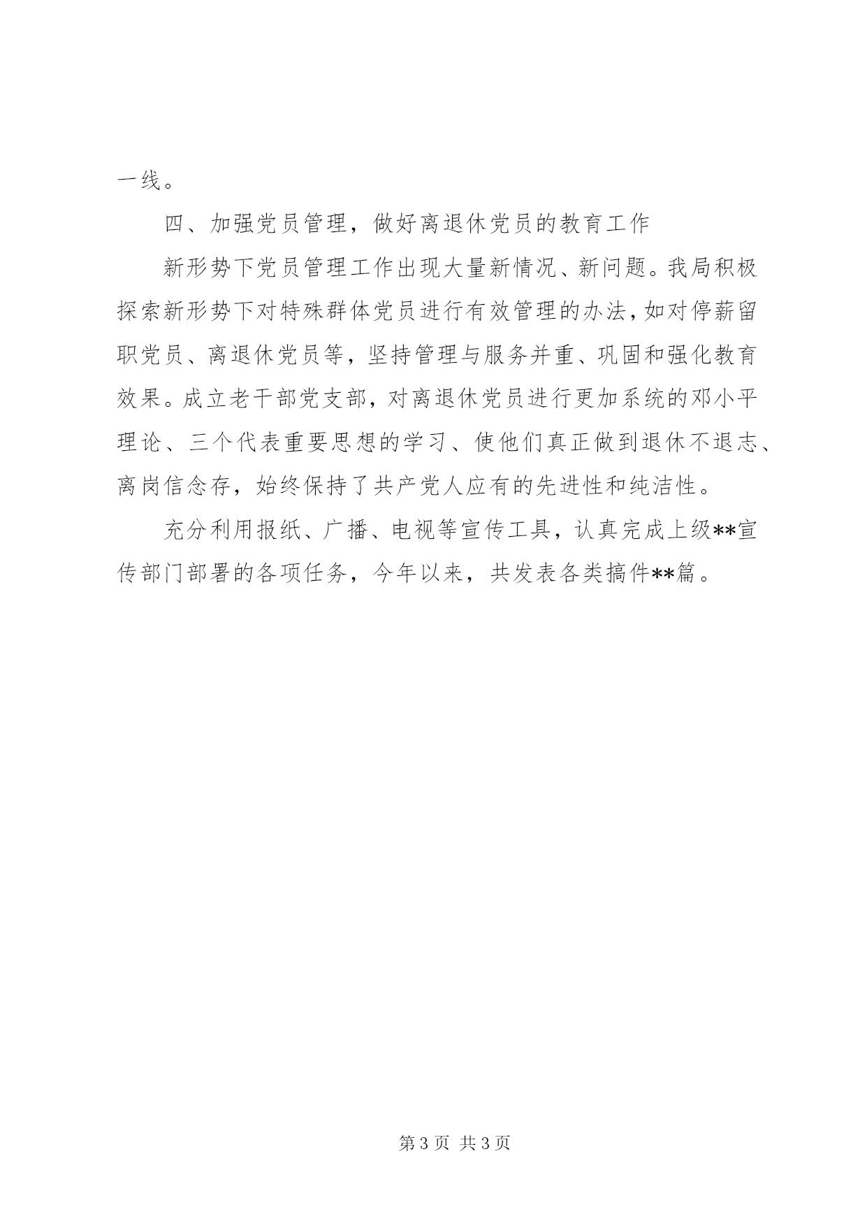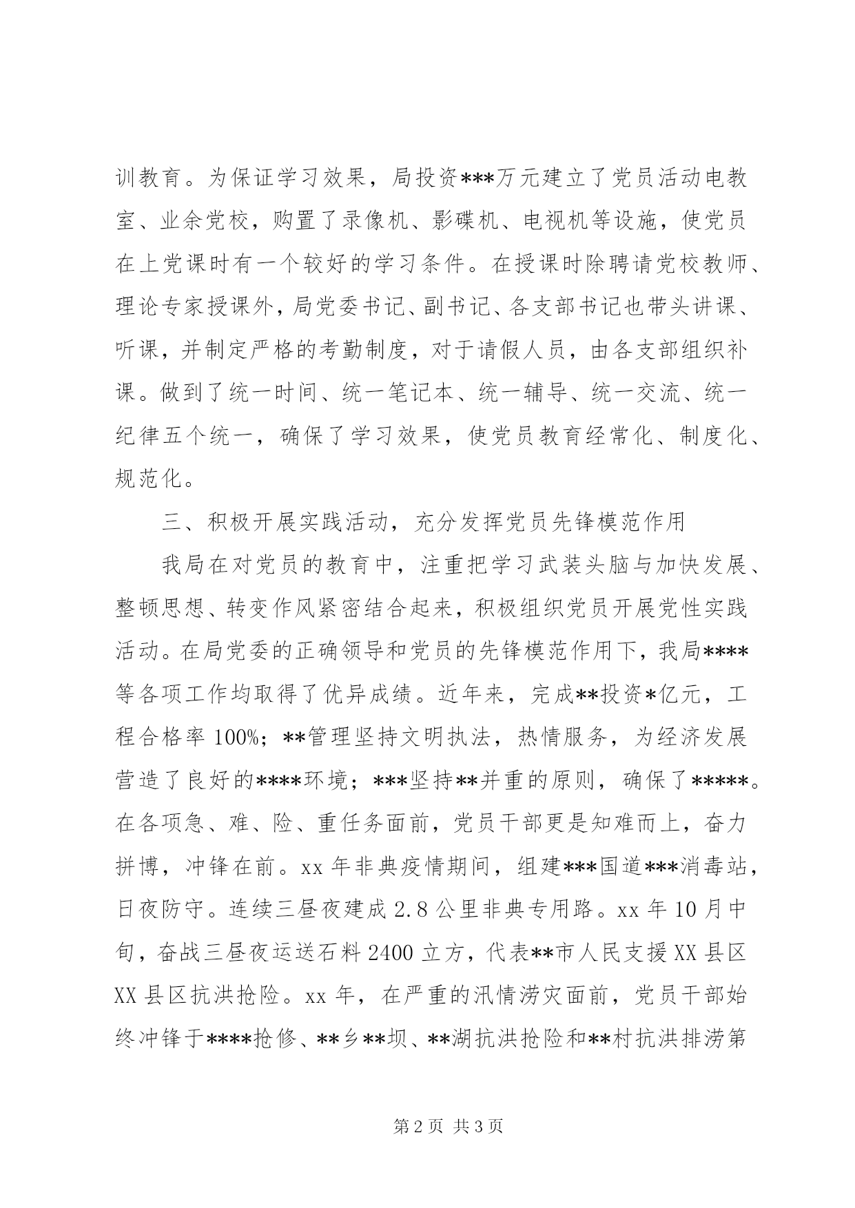 第PAGE\*Arabic\*MERGEFORMAT3页共NUMPAGES\*MERGEFORMAT3页交通局党员培训工作总结一、建立工作责任制,对党员教育实行目标化管理我局党总支始终高度重视党员教育工作,将其列入重要议事日程,每年年初在调查研究、分析现状的基础上,针对存在的突出问题,制定切实可行的党员学习培训计划,对全年的学习时间、主要内容、基本要求都作了明确规定,并成立以局党委书记为组长,副书记为副组长、各党支部书记为成员的学习教育领导小组,政工科负责督促检查指导,保证工作到位、措施到位、人员到位。在学习内容上,重点学习了邓小平理论、三个代表、xx大、xx届三中、四中全会精神和党章等,同时注重现代科技知识和法律知识的教育培训;在学习方式上,结合*****点多、线长、面广的实际,采取集中学习与分散学习的方式方法,达到工作学习两促进、两不误、双丰收的效果,并注重研究各类党员的不同特点,因人施教,增强针对性和实效性;在学习效果上,重视考试考核结果,将考核结果作为年终评先树优的重要依据。通过教育,使广大党员切实解决了思想作风、宗旨观念、作风纪律和实际工作中存在的突出问题,进一步坚定了共产主义远大理想,提高了立党为公、执政为民、拒腐防变的党悟和能力。二、运用教育陈地,使党员教育经常化、制度化、规范化按照党务管理制度,各党支部坚持每月最后一周的星期五集中党员上一次党课,每月的11日为党员学习日,并定期集中培训教育。为保证学习效果,局投资***万元建立了党员活动电教室、业余党校,购置了录像机、影碟机、电视机等设施,使党员在上党课时有一个较好的学习条件。在授课时除聘请党校教师、理论专家授课外,局党委书记、副书记、各支部书记也带头讲课、听课,并制定严格的考勤制度,对于请假人员,由各支部组织补课。做到了统一时间、统一笔记本、统一辅导、统一交流、统一纪律五个统一,确保了学习效果,使党员教育经常化、制度化、规范化。三、积极开展实践活动,充分发挥党员先锋模范作用我局在对党员的教育中,注重把学习武装头脑与加快发展、整顿思想、转变作风紧密结合起来,积极组织党员开展党性实践活动。在局党委的正确领导和党员的先锋模范作用下,我局****等各项工作均取得了优异成绩。近年来,完成**投资*亿元,工程合格率100%;**管理坚持文明执法,热情服务,为经济发展营造了良好的****环境;***坚持**并重的原则,确保了*****。在各项急、难、险、重任务面前,党员干部更是知难而上,奋力拼博,冲锋在前。xx年非典疫情期间,组建***国道***消毒站,日夜防守。连续三昼夜建成2.8公里非典专用路。xx年10月中旬,奋战三昼夜运送石料2400立方,代表**市人民支援XX县区XX县区抗洪抢险。xx年,在严重的汛情涝灾面前,党员干部始终冲锋于****抢修、**乡**坝、**湖抗洪抢险和**村抗洪排涝第一线。四、加强党员管理,做好离退休党员的教育工作新形势下党员管理工作出现大量新情况、新问题。我局积极探索新形势下对特殊群体党员进行有效管理的办法,如对停薪留职党员、离退休党员等,坚持管理与服务并重、巩固和强化教育效果。成立老干部党支部,对离退休党员进行更加系统的邓小平理论、三个代表重要思想的学习、使他们真正做到退休不退志、离岗信念存,始终保持了共产党人应有的先进性和纯洁性。充分利用报纸、广播、电视等宣传工具,认真完成上级**宣传部门部署的各项任务,今年以来,共发表各类搞件**篇。
