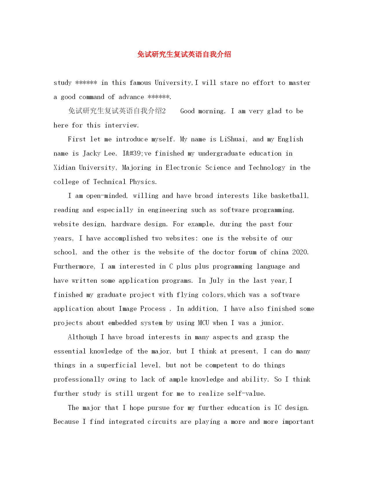 此资料由网络收集而来,如有侵权请告知上传者立即删除。资料共分享,我们负责传递知识。免试研究生复试英语自我介绍study******inthisfamousUniversity,Iwillstarenoefforttomasteragoodcommandofadvance******.免试研究生复试英语自我介绍2Goodmorning.Iamverygladtobehereforthisinterview.Firstletmeintroducemyself.MynameisLiShuai,andmyEnglishnameisJackyLee.I'vefinishedmyundergraduateeducationinXidianUniversity,MajoringinElectronicScienceandTechnologyinthecollegeofTechnicalPhysics.Iamopen-minded,willingandhavebroadinterestslikebasketball,readingandespeciallyinengineeringsuchassoftwareprogramming,websitedesign,hardwaredesign.Forexample,duringthepastfouryears,Ihaveaccomplishedtwowebsites:oneisthewebsiteofourschool,andtheotheristhewebsiteofthedoctorforumofchina2020.Furthermore,IaminterestedinCplusplusprogramminglanguageandhavewrittensomeapplicationprograms.InJulyinthelastyear,Ifinishedmygraduateprojectwithflyingcolors,whichwasasoftwareapplicationaboutImageProcess.Inaddition,IhavealsofinishedsomeprojectsaboutembeddedsystembyusingMCUwhenIwasajunior.AlthoughIhavebroadinterestsinmanyaspectsandgrasptheessentialknowledgeofthemajor,butIthinkatpresent,Icandomanythingsinasuperficiallevel,butnotbecompetenttodothingsprofessionallyowingtolackofampleknowledgeandability.SoIthinkfurtherstudyisstillurgentformetorealizeself-value.ThemajorthatIhopepursueformyfurthereducationisICdesign.BecauseIfindintegratedcircuitsareplayingamoreandmoreimportantroleinourmodernsociety.AndnowadaysinChina,withtherecognitionbythegovernment,ourdomesticintegratedcircuitsindustryisgrowingrapidlyandthatmayprovidealotofchancestous.Iplantoconcentrateonstudyandresearchinthisfieldinmygraduatetime.AndIhopeIcanformasystematicviewofmicroelectronicsandICdesigntechnologyandmakeasolidfoundationforfutureprofessionafterthreeyearsstudyhere.OK,that’sall.Thankyouverymuch.
