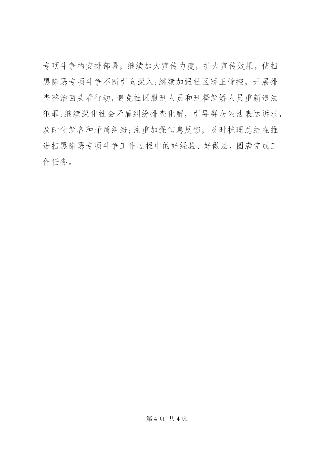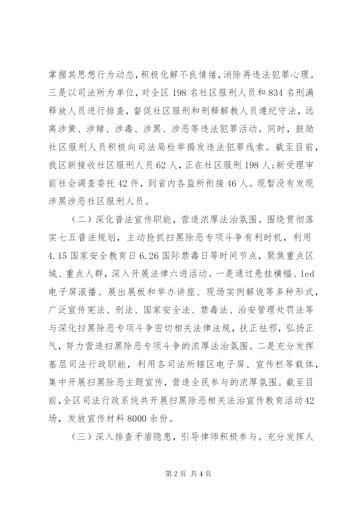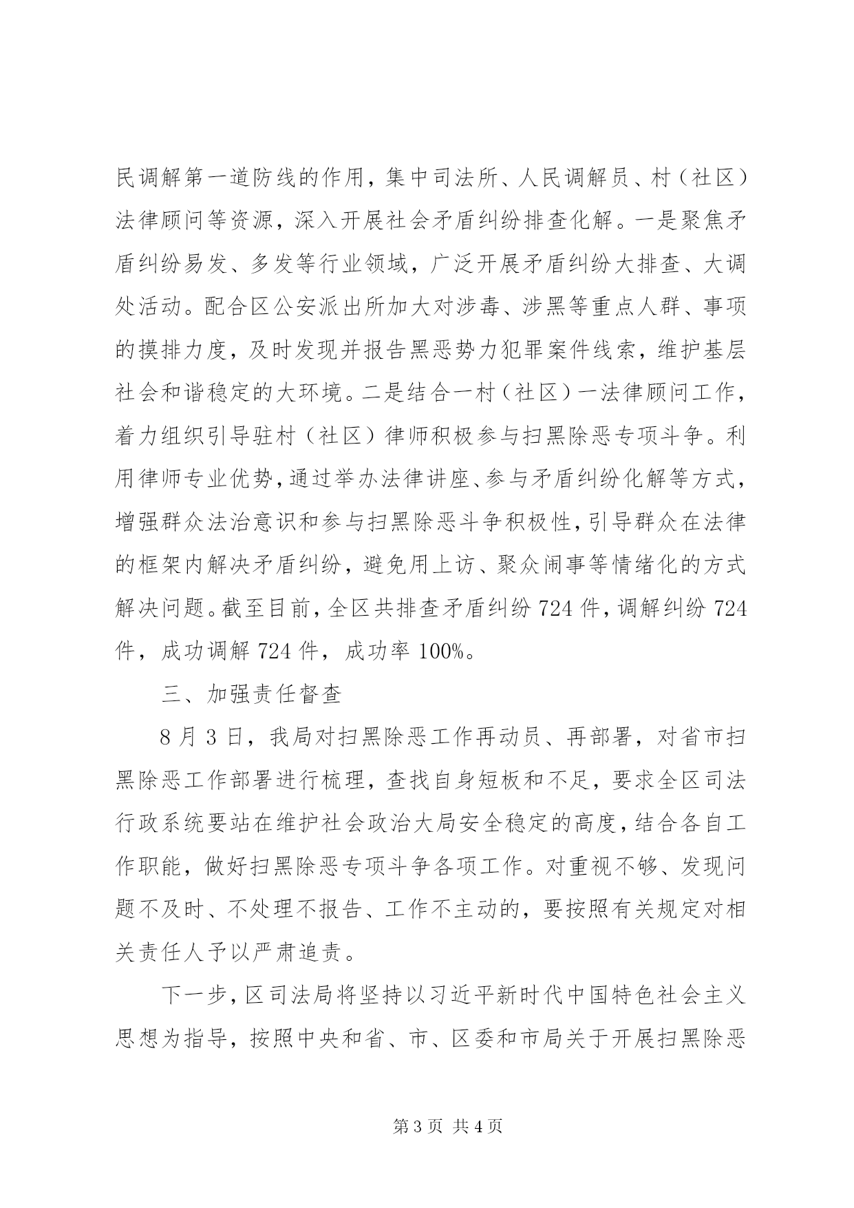 第PAGE\*Arabic\*MERGEFORMAT4页共NUMPAGES\*MERGEFORMAT4页司法局扫黑除恶调研报告一、认真组织部署一是召开党组(扩大)会议,认真学习了习近平总书记关于扫黑除恶斗争重要指示精神,传达学习了全国、全省和全市扫黑除恶专项斗争电视电话会议精神,对开展扫黑除恶专项斗争工作进行动员部署。二是下发《关于在全区司法行政系统开展扫黑除恶专项斗争工作的通知》和《区司法局扫黑除恶专项斗争工作制度》,成立了党组书记为组长,分管领导为副组长,各科室负责人、司法所长为成员的扫黑除恶专项斗争领导小组,明确各科室职能,确保扫黑除恶专项斗争落到实处。三是召开扫黑除恶专项斗争工作推进会,听取相关负责人的工作情况汇报,为落实好专项斗争工作夯实基础。二、抓好工作落实(一)严格落实矫正制度,加强重点人员管控。将专项整治、隐患排查与扫黑除恶专项斗争工作相结合,着力打造全天候、全方位、全过程的社区矫正监管安全天罗地网。一是严格执行定期报告、外出和居住地变更审批、请假、集中教育、社区服务等各项规章制度,对涉毒等社区服刑人员从严管控,坚决防止发生社区服刑人员等特殊人群人员因脱管失控而造成重大刑事案件和极端个人暴力事件。二是充分利用手机定位、每日核查等监管手段,通过对社区服刑人员进行谈话教育和心理疏导等方式,了解掌握其思想行为动态,积极化解不良情绪,消除再违法犯罪心理。三是以司法所为单位,对全区198名社区服刑人员和834名刑满释放人员进行排查,督促社区服刑和刑释解教人员遵纪守法,远离涉黄、涉赌、涉毒、涉黑、涉恶等违法犯罪活动。同时,鼓励社区服刑人员积极向司法局检举揭发违法犯罪线索。截至目前,我区新接收社区服刑人员62人,正在社区服刑198人;新受理审前社会调查委托42件,到省内各监所衔接46人。现暂没有发现涉黑涉恶社区服刑人员。(二)深化普法宣传职能,营造浓厚法治氛围。围绕贯彻落实七五普法规划,主动抢抓扫黑除恶专项斗争有利时机,利用4.15国家安全教育日6.26国际禁毒日等时间节点,聚焦重点区域、重点人群,深入开展法律六进活动。一是通过悬挂横幅、led电子屏滚播、展出展板和举办讲座、现场实例解说等多种形式,广泛宣传宪法、刑法、国家安全法、禁毒法、治安管理处罚法等与深化扫黑除恶专项斗争密切相关法律法规,扶正祛邪,弘扬正气,努力营造扫黑除恶专项斗争的浓厚法治氛围。二是充分发挥基层司法行政职能,利用各司法所辖区电子屏、宣传栏等载体,集中开展扫黑除恶主题宣传,营造全民参与的浓厚氛围。截至目前,全区司法行政系统共开展扫黑除恶相关法治宣传教育活动42场,发放宣传材料8000余份。(三)深入排查矛盾隐患,引导律师积极参与。充分发挥人民调解第一道防线的作用,集中司法所、人民调解员、村(社区)法律顾问等资源,深入开展社会矛盾纠纷排查化解。一是聚焦矛盾纠纷易发、多发等行业领域,广泛开展矛盾纠纷大排查、大调处活动。配合区公安派出所加大对涉毒、涉黑等重点人群、事项的摸排力度,及时发现并报告黑恶势力犯罪案件线索,维护基层社会和谐稳定的大环境。二是结合一村(社区)一法律顾问工作,着力组织引导驻村(社区)律师积极参与扫黑除恶专项斗争。利用律师专业优势,通过举办法律讲座、参与矛盾纠纷化解等方式,增强群众法治意识和参与扫黑除恶斗争积极性,引导群众在法律的框架内解决矛盾纠纷,避免用上访、聚众闹事等情绪化的方式解决问题。截至目前,全区共排查矛盾纠纷724件,调解纠纷724件,成功调解724件,成功率100%。三、加强责任督查8月3日,我局对扫黑除恶工作再动员、再部署,对省市扫黑除恶工作部署进行梳理,查找自身短板和不足,要求全区司法行政系统要站在维护社会政治大局安全稳定的高度,结合各自工作职能,做好扫黑除恶专项斗争各项工作。对重视不够、发现问题不及时、不处理不报告、工作不主动的,要按照有关规定对相关责任人予以严肃追责。下一步,区司法局将坚持以习近平新时代中国特色社会主义思想为指导,按照中央和省、市、区委和市局关于开展扫黑除恶专项斗争的安排部署,继续加大宣传力度,扩大宣传效果,使扫黑除恶专项斗争不断引向深入;继续加强社区矫正管控,开展排查整治回头看行动,避免社区服刑人员和刑释解矫人员重新违法犯罪;继续深化社会矛盾纠纷排查化解,引导群众依法表达诉求,及时化解各种矛盾纠纷;注重加强信息反馈,及时梳理总结在推进扫黑除恶专项斗争工作过程中的好经验、好做法,圆满完成工作任务。