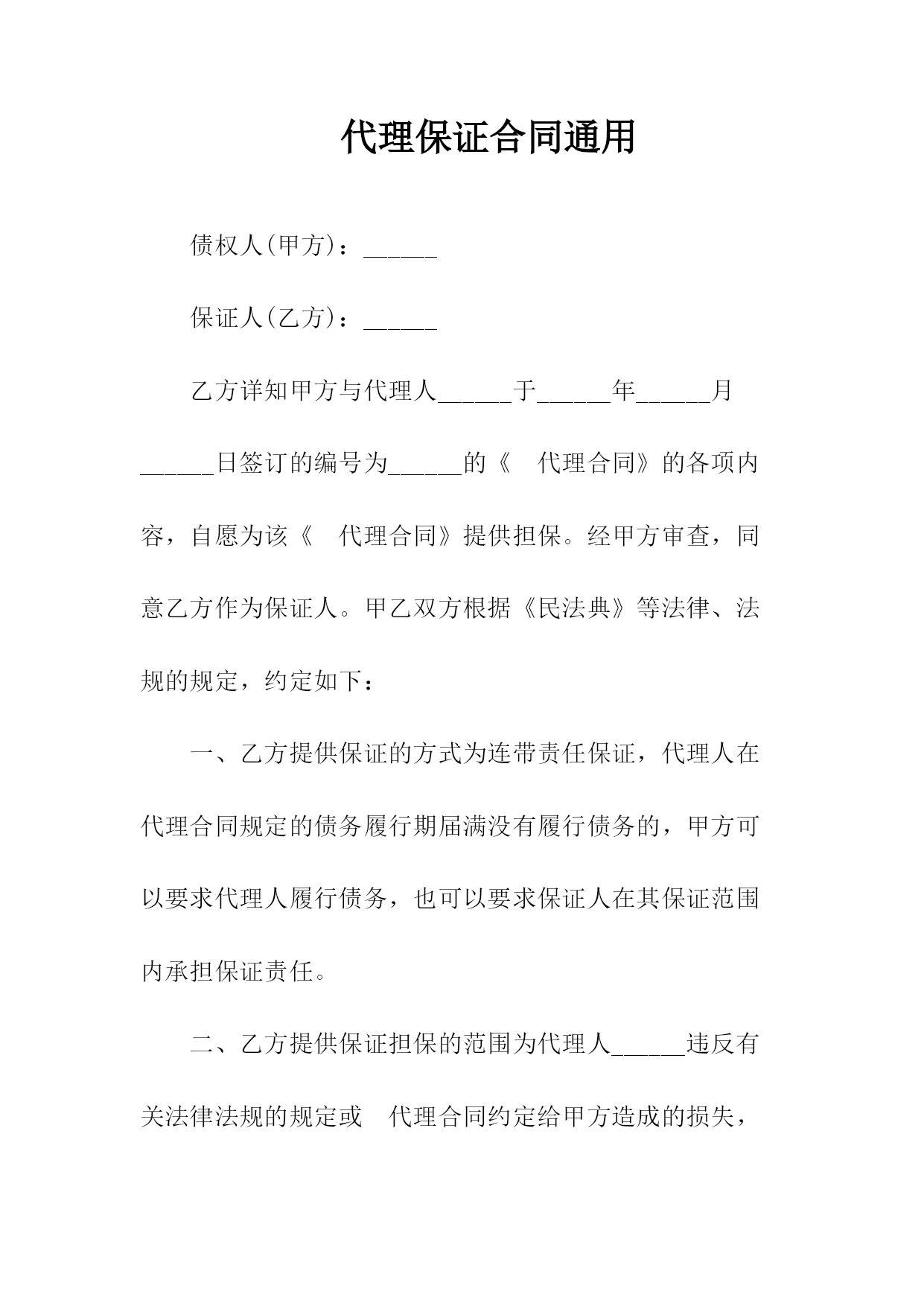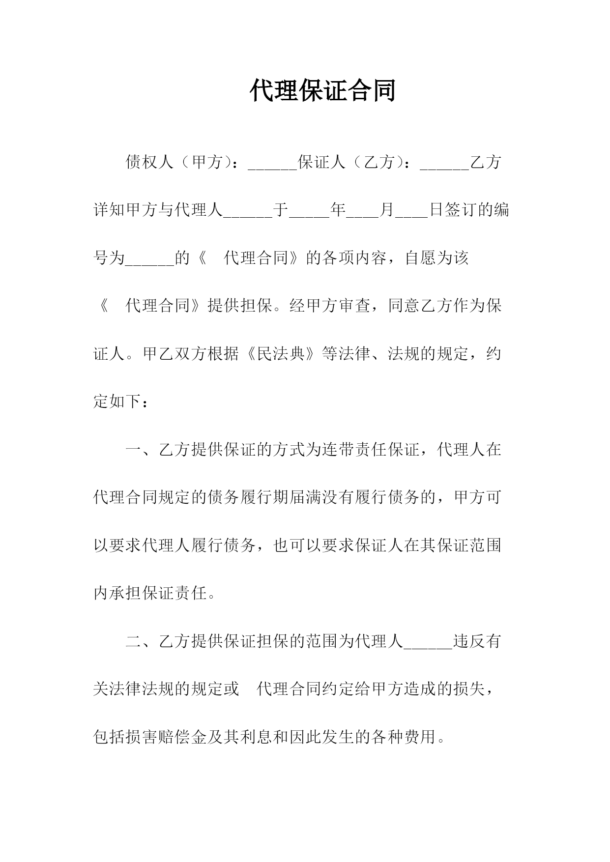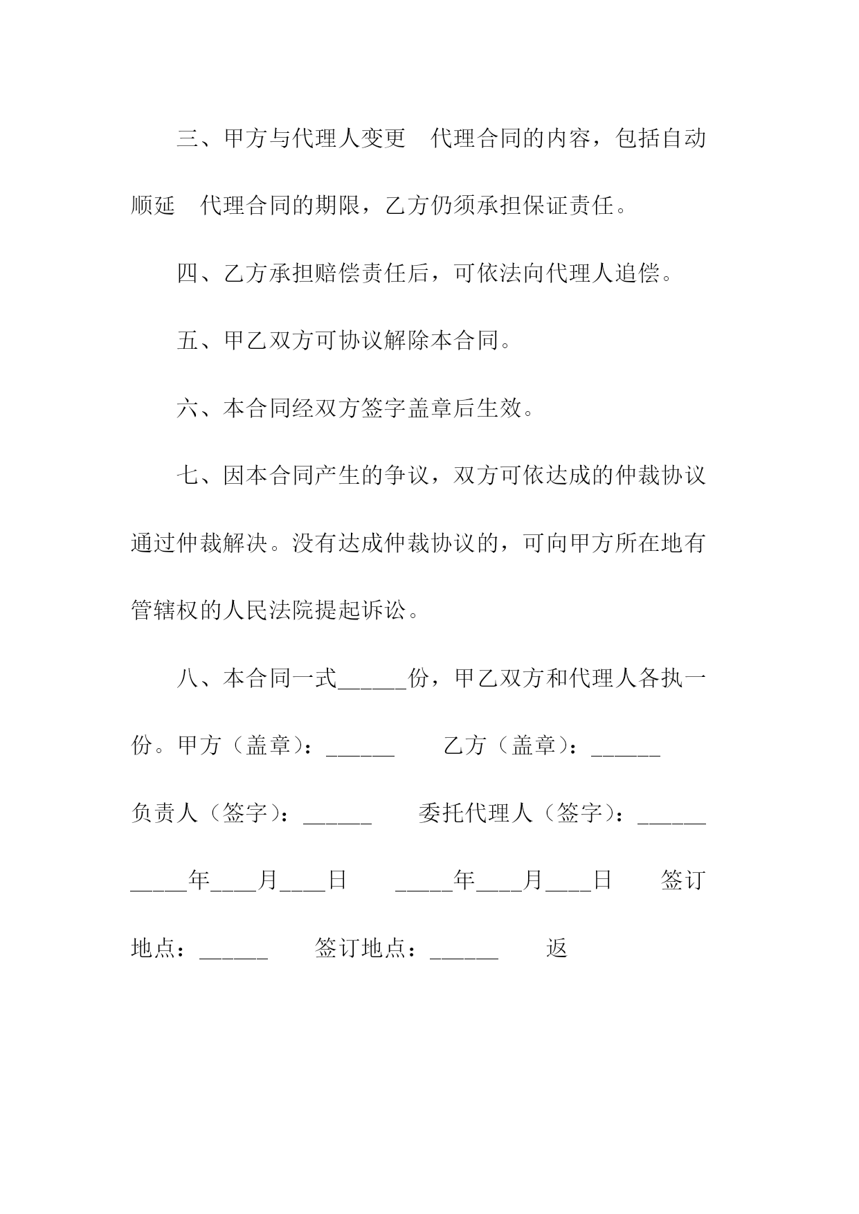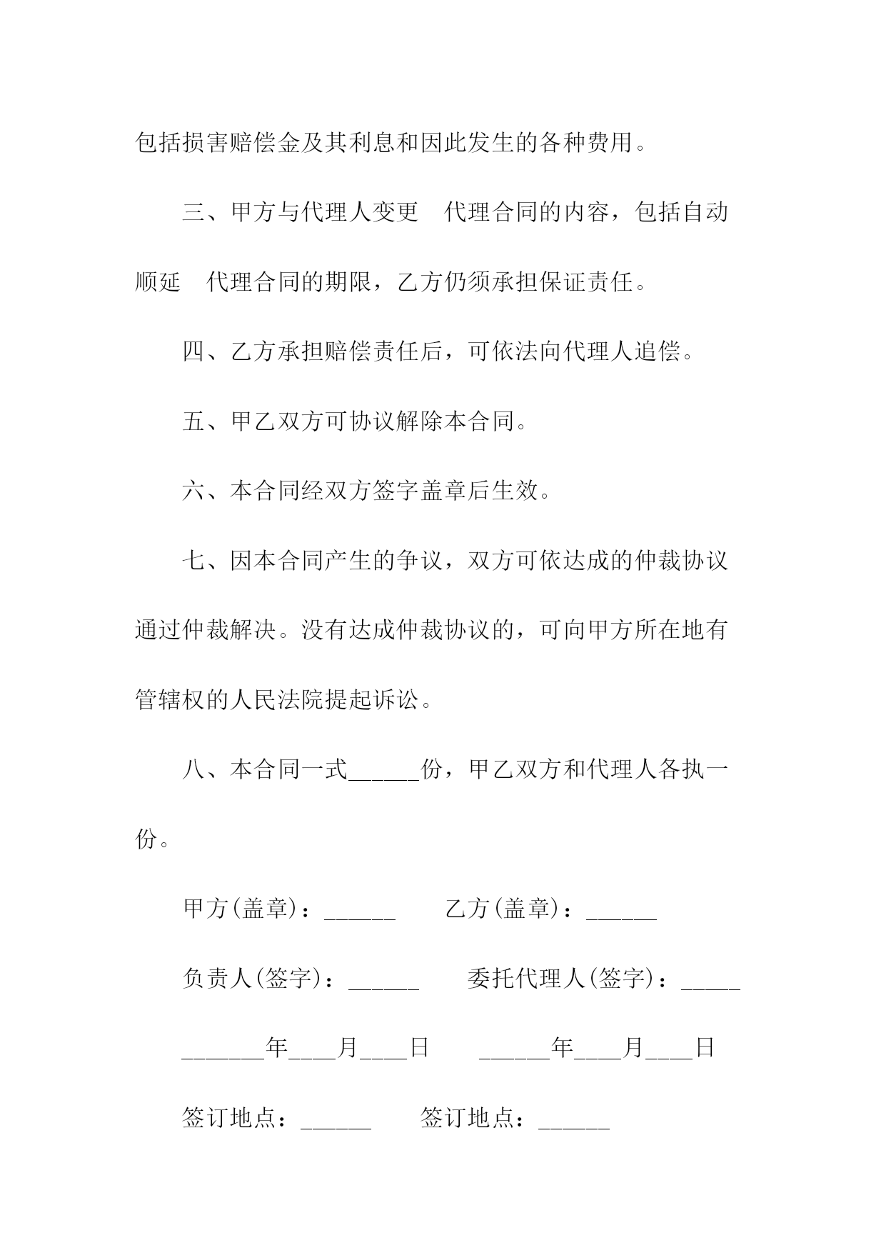 船舶合同书单位:__________船舶名称:__________本公司根据被人__________的要求,由被人向本公司缴付约定的费,按照沿海内河船舶条款和本单载明的条件承保下述船舶。被人兹确认所填内容属实并对本合同条款(包括除外责任部分)及条件的内容已经了解,同意从本保单正式签发之日起合同成立。制造年份:__________制造厂家:__________船舶种类__________船舶用途__________总吨位/马力/客位:__________载重吨:__________船舶尺寸:(总长)__________船质结构:__________(型宽)__________(型深)__________船籍港:__________价值:人民币__________金额:人民币__________航行区域:__________期限:_____个月自_____年_____月_____日零时起至_____年_____月_____日二十四时止基本保费:__________免赔额:__________费率:_____%总费:人民币__________公司(签章):_____________年_____月_____日代理保证合同通用债权人(甲方):______保证人(乙方):______乙方详知甲方与代理人______于______年______月______日签订的编号为______的《代理合同》的各项内容,自愿为该《代理合同》提供担保。经甲方审查,同意乙方作为保证人。甲乙双方根据《民法典》等法律、法规的规定,约定如下:一、乙方提供保证的方式为连带责任保证,代理人在代理合同规定的债务履行期届满没有履行债务的,甲方可以要求代理人履行债务,也可以要求保证人在其保证范围内承担保证责任。二、乙方提供保证担保的范围为代理人______违反有关法律法规的规定或代理合同约定给甲方造成的损失,包括损害赔偿金及其利息和因此发生的各种费用。三、甲方与代理人变更代理合同的内容,包括自动顺延代理合同的期限,乙方仍须承担保证责任。四、乙方承担赔偿责任后,可依法向代理人追偿。五、甲乙双方可协议解除本合同。六、本合同经双方签字盖章后生效。七、因本合同产生的争议,双方可依达成的仲裁协议通过仲裁解决。没有达成仲裁协议的,可向甲方所在地有管辖权的人民法院提起诉讼。八、本合同一式______份,甲乙双方和代理人各执一份。甲方(盖章):______乙方(盖章):______负责人(签字):______委托代理人(签字):____________年____月____日______年____月____日签订地点:______签订地点:______委托代理合同通用(甲方)因**一案,现委托××律师事务所(乙方)律师出庭代理/代理,经双方充分协商,订立合同如下:一、乙方接受甲方的委托,指派律师***为甲方第*审代理人。甲方委托乙方代理权限是:二、律师必须根据事实和法律参加诉讼活动,认真负责地履行律师的职责,维护委托人的合法权益。三、根据国家《关于业务收费标准》的规定,甲方向乙方支付代理费**元,标的费**元。四、乙方为本案调查、出庭所需差旅费,按国家规定标准全部由甲方负担。甲方向乙方支付差旅费*元。五、甲方必须真实地向律师叙述案情,提供证据。在接受委托后,如发现甲方担造事实,弄虚作假,乙方有权终止代理,依本合同所收费用不予退还。六、如乙方无故终止合同,代理费和标的费应全部退还甲方;如甲方无故终止合同,代理费和标的费不予退还。七、如一方要求变更本合同条款需另行协议。八、本合同经甲乙双方或其代表人签字(或盖章)生效。九、本合同有效期限:自签订之日起至本案终结止(判决、调解、案外和解、撤诉及调查结案)。十、本合同一式两份,双方各持一份。甲方:乙方:::年月日代理保证合同债权人(甲方):______保证人(乙方):______乙方详知甲方与代理人______于_____年____月____日签订的编号为______的《代理合同》的各项内容,自愿为该《代理合同》提供担保。经甲方审查,同意乙方作为保证人。甲乙双方根据《民法典》等法律、法规的规定,约定如下:一、乙方提供保证的方式为连带责任保证,代理人在代理合同规定的债务履行期届满没有履行债务的,甲方可以要求代理人履行债务,也可以要求保证人在其保证范围内承担保证责任。二、乙方提供保证担保的范围为代理人______违反有关法律法规的规定或代理合同约定给甲方造成的损失,包括损害赔偿金及其利息和因此发生的各种费用。三、甲方与代理人变更代理合同的内容,包括自动顺延代理合同的期限,乙方仍须承担保证责任。四、乙方承担赔偿责任后,可依法向代理人追偿。五、甲乙双方可协议解除本合同。六、本合同经双方签字盖章后生效。七、因本合同产生的争议,双方可依