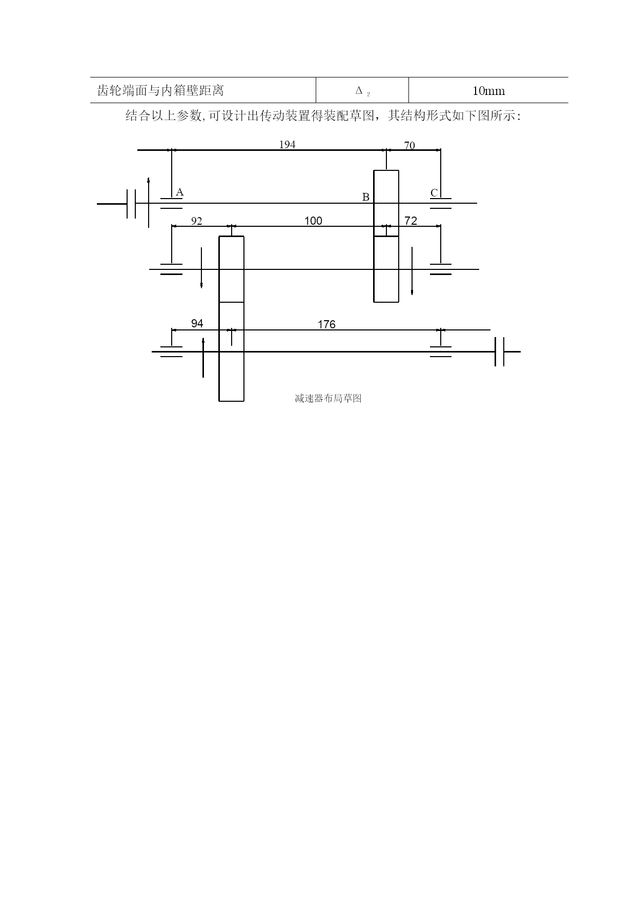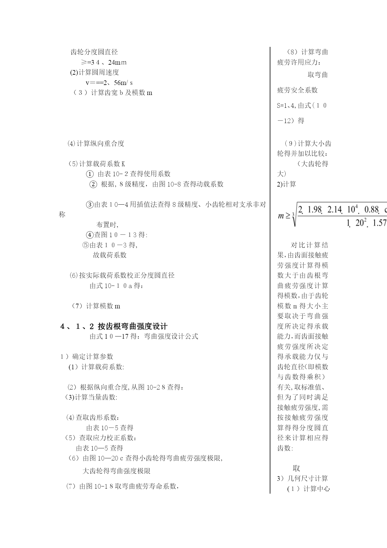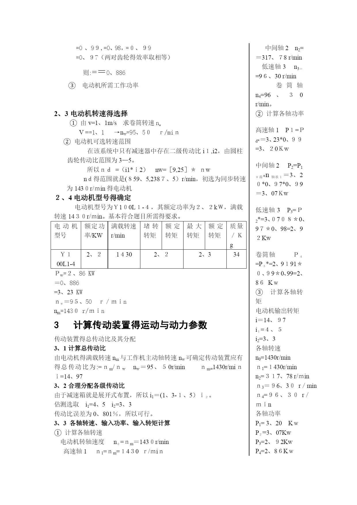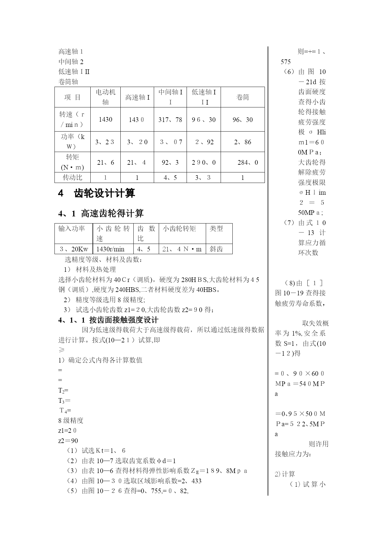 机械设计课程设计任务书学生姓名专业年级设计题目:设计带式输送机传动装置设计条件:输送带工作拉力:F=2600N;输送带工作速度:v=1、1m/s(允许输送带速度误差为5%);滚筒直径:D=220mm;工作情况:两班制,连续单向运转,载荷较平稳;室内,灰尘较大,环境最高温度35;使用折旧期:8年;检修间隔期:四年一次大修,两年一次中修,半年一次小修;动力来源:电力,三相交流,电压380/220V;运输带速度允许误差:制造条件及生产批量:一般机械厂制造,小批量生产。设计工作量:减速器装配图1张(A1);零件工作图2张;设计说明书1份。指导教师签名:2013年4月23日说明:1、此表由指导教师完成,用计算机打印(A4纸)。2、请将机械设计课程设计任务书装订在机械设计课程设计(论文)得第一页。设计题目:二级展开式圆柱齿轮减速器1设计条件1、1原理图(二级展开式圆柱齿轮减速器带式运输机得传动示意图)1、2工作情况工作条件:两班制,连续单向运转,载荷较平稳,室内工作,有灰尘,环境最高温度35℃;使用折旧期;8年;检修间隔期:四年一次大修,两年一次中修,半年一次小修;动力来源:电力,三相交流电,电压380/220V;运输带速度容许误差:±5%;制造条件及生产批量:一般机械厂制造,小批量生产。1、3原始数据ﻩ题号参数1运输带工作拉力F/KN2600运输带工作速度v/(m/s)1、1卷筒直径D/mm220注:运输带与卷筒之间卷筒轴承得摩擦影响已经在F中考虑.2电动机选择2、1电动机类型得选择电动机选择全封闭得Y系列三相鼠笼式异步电动机,具有防止灰尘、铁屑、或其它杂物侵入电动机内部得特点,B级绝缘,工作环境温度不超过+40℃,相对湿度不超过95%,海拔高度不超过1000m,额定电压380V,频率50Hz。2、2电动机功率得计算=1\*GB3\*MERGEFORMAT①工作机所需功率Pw=2\*GB3\*MERGEFORMAT②设计方案得总效率=0、99(两对联轴器得效率相等)=0、99,=0、98,=0、99=0、97(两对齿轮得效率取相等)则:==0、886=3\*GB3\*MERGEFORMAT③电动机所需工作功率2、3电动机转速得选择=1\*GB3\*MERGEFORMAT①由v=1、1m/s求卷筒转速nwV==1、1→nw=95、50r/min=2\*GB3\*MERGEFORMAT②电动机可选转速范围在该系统中只有减速器中存在二级传动比i1,i2,由圆柱齿轮传动比范围为3—5。所以nd=(i1*i2)nw=[9,25]*nwnd得范围就是(859、5,2387、5)r/min,初选为同步转速为1430r/min得电动机2、4电动机型号得确定电动机型号为Y100L1-4,其额定功率为2、2kW,满载转速1430r/min。基本符合题目所需得要求。电动机型号额定功率/KW满载转速r/min堵转转矩额定转矩最大转矩额定转矩质量/KgY100L1-42、214302、22、334Pw=2、86KW=0、886=3、23KWnw=95、50r/minnm=1430r/min3计算传动装置得运动与动力参数传动装置得总传动比及其分配3、1计算总传动比由电动机得满载转速nm与工作机主动轴转速nw可确定传动装置应有得总传动比为:=nm/nwnw=95、50r/minnm=1430r/mini=14、973、2合理分配各级传动比由于减速箱就是展开式布置,所以i1=(1、3-1、5)i2。估测选取i1=4、5i2=3、3传动比误差为0、801%,所以可行。3、3各轴转速、输入功率、输入转矩计算=1\*GB3\*MERGEFORMAT①计算各轴转速电动机转轴速度n0=nm=1430r/min高速轴1n1=nm=1430r/min中间轴2n2==317、78r/min低速轴3n3==96、30r/min卷筒轴n4=96、30r/min。=2\*GB3\*MERGEFORMAT②计算各轴功率高速轴1P1=Pd*=3、23*0、99=3、20Kw中间轴2P2=P1*齿*n轴承1=3、20*0、97*0、99=3、07Kw低速轴3P3=P2*=3、0708*0、97*0、98=2、92Kw卷筒轴P4=P3*=2、9191*0、99*0、99=2、86Kw=3\*GB3\*MERGEFORMAT③计算各轴转矩电动机输出转矩i=14、97i1=4、5i2=3、3各轴转速n0=1430r/minn1=1430r/minn2=317、78r/minn3