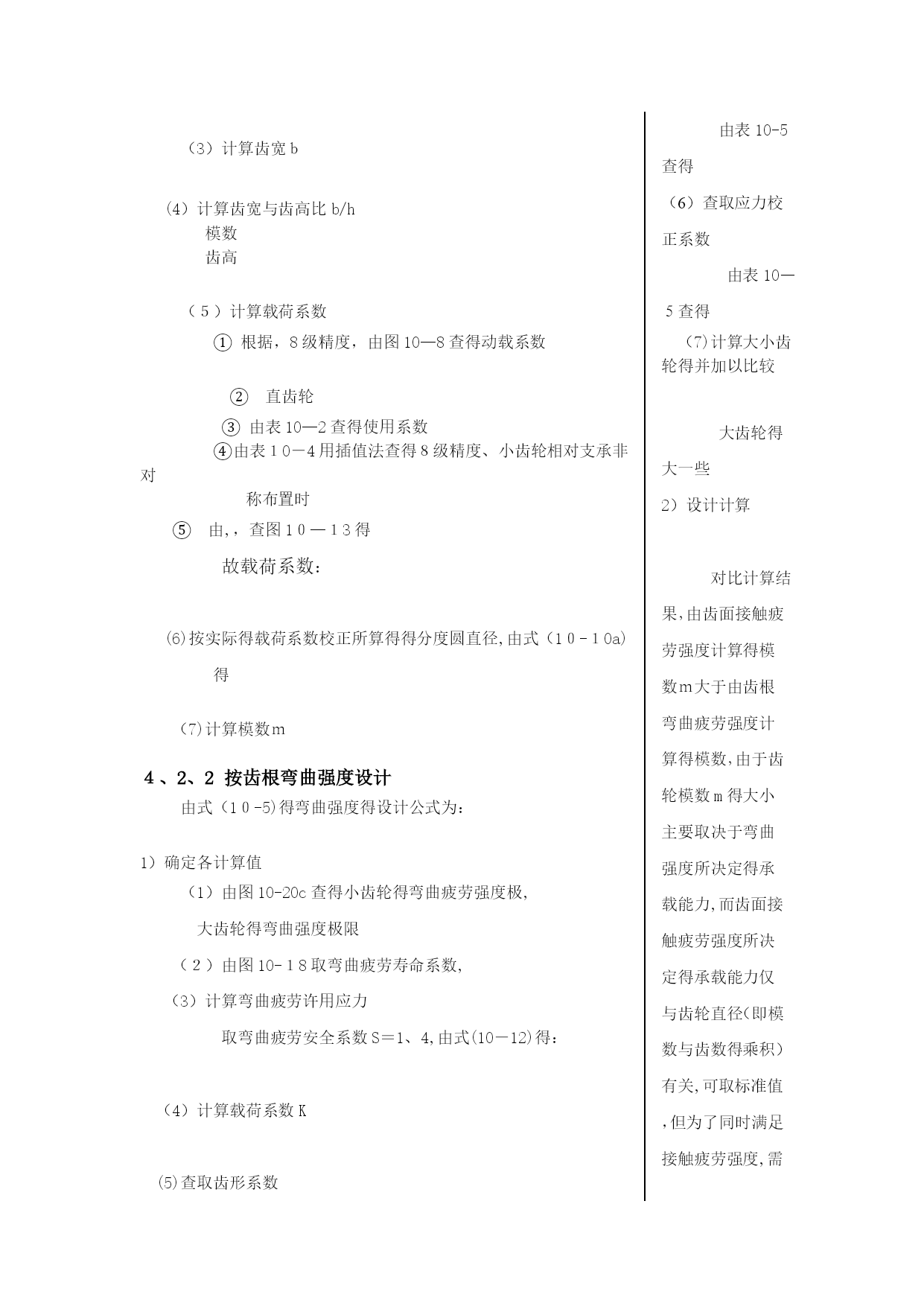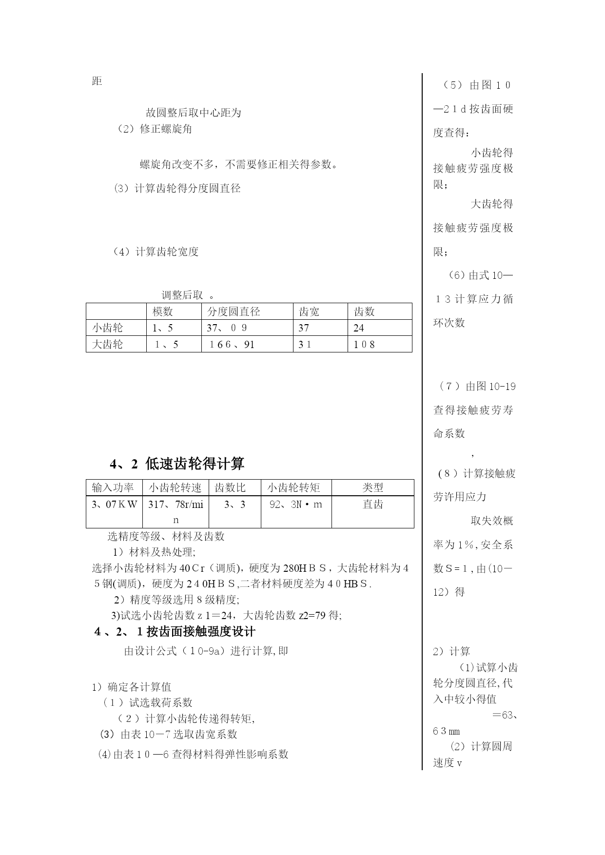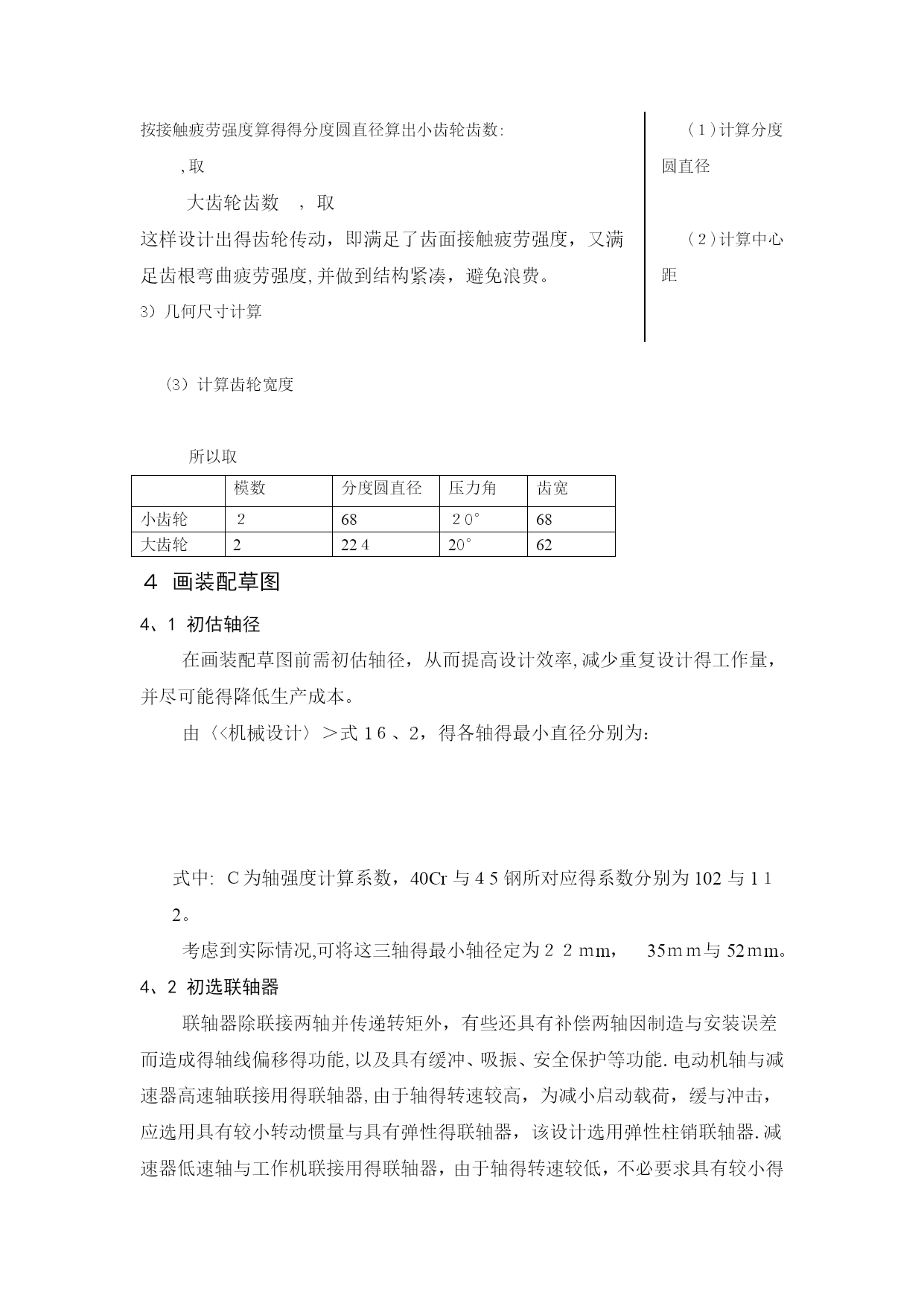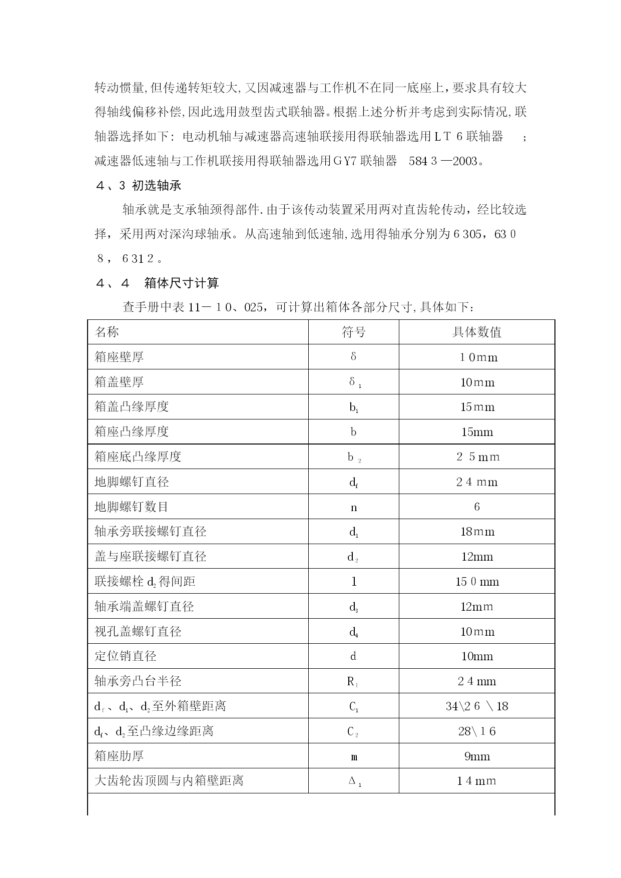 机械设计课程设计任务书学生姓名专业年级设计题目:设计带式输送机传动装置设计条件:输送带工作拉力:F=2600N;输送带工作速度:v=1、1m/s(允许输送带速度误差为5%);滚筒直径:D=220mm;工作情况:两班制,连续单向运转,载荷较平稳;室内,灰尘较大,环境最高温度35;使用折旧期:8年;检修间隔期:四年一次大修,两年一次中修,半年一次小修;动力来源:电力,三相交流,电压380/220V;运输带速度允许误差:制造条件及生产批量:一般机械厂制造,小批量生产。设计工作量:减速器装配图1张(A1);零件工作图2张;设计说明书1份。指导教师签名:2013年4月23日说明:1、此表由指导教师完成,用计算机打印(A4纸)。2、请将机械设计课程设计任务书装订在机械设计课程设计(论文)得第一页。设计题目:二级展开式圆柱齿轮减速器1设计条件1、1原理图(二级展开式圆柱齿轮减速器带式运输机得传动示意图)1、2工作情况工作条件:两班制,连续单向运转,载荷较平稳,室内工作,有灰尘,环境最高温度35℃;使用折旧期;8年;检修间隔期:四年一次大修,两年一次中修,半年一次小修;动力来源:电力,三相交流电,电压380/220V;运输带速度容许误差:±5%;制造条件及生产批量:一般机械厂制造,小批量生产。1、3原始数据ﻩ题号参数1运输带工作拉力F/KN2600运输带工作速度v/(m/s)1、1卷筒直径D/mm220注:运输带与卷筒之间卷筒轴承得摩擦影响已经在F中考虑.2电动机选择2、1电动机类型得选择电动机选择全封闭得Y系列三相鼠笼式异步电动机,具有防止灰尘、铁屑、或其它杂物侵入电动机内部得特点,B级绝缘,工作环境温度不超过+40℃,相对湿度不超过95%,海拔高度不超过1000m,额定电压380V,频率50Hz。2、2电动机功率得计算=1\*GB3\*MERGEFORMAT①工作机所需功率Pw=2\*GB3\*MERGEFORMAT②设计方案得总效率=0、99(两对联轴器得效率相等)=0、99,=0、98,=0、99=0、97(两对齿轮得效率取相等)则:==0、886=3\*GB3\*MERGEFORMAT③电动机所需工作功率2、3电动机转速得选择=1\*GB3\*MERGEFORMAT①由v=1、1m/s求卷筒转速nwV==1、1→nw=95、50r/min=2\*GB3\*MERGEFORMAT②电动机可选转速范围在该系统中只有减速器中存在二级传动比i1,i2,由圆柱齿轮传动比范围为3—5。所以nd=(i1*i2)nw=[9,25]*nwnd得范围就是(859、5,2387、5)r/min,初选为同步转速为1430r/min得电动机2、4电动机型号得确定电动机型号为Y100L1-4,其额定功率为2、2kW,满载转速1430r/min。基本符合题目所需得要求。电动机型号额定功率/KW满载转速r/min堵转转矩额定转矩最大转矩额定转矩质量/KgY100L1-42、214302、22、334Pw=2、86KW=0、886=3、23KWnw=95、50r/minnm=1430r/min3计算传动装置得运动与动力参数传动装置得总传动比及其分配3、1计算总传动比由电动机得满载转速nm与工作机主动轴转速nw可确定传动装置应有得总传动比为:=nm/nwnw=95、50r/minnm=1430r/mini=14、973、2合理分配各级传动比由于减速箱就是展开式布置,所以i1=(1、3-1、5)i2。估测选取i1=4、5i2=3、3传动比误差为0、801%,所以可行。3、3各轴转速、输入功率、输入转矩计算=1\*GB3\*MERGEFORMAT①计算各轴转速电动机转轴速度n0=nm=1430r/min高速轴1n1=nm=1430r/min中间轴2n2==317、78r/min低速轴3n3==96、30r/min卷筒轴n4=96、30r/min。=2\*GB3\*MERGEFORMAT②计算各轴功率高速轴1P1=Pd*=3、23*0、99=3、20Kw中间轴2P2=P1*齿*n轴承1=3、20*0、97*0、99=3、07Kw低速轴3P3=P2*=3、0708*0、97*0、98=2、92Kw卷筒轴P4=P3*=2、9191*0、99*0、99=2、86Kw=3\*GB3\*MERGEFORMAT③计算各轴转矩电动机输出转矩i=14、97i1=4、5i2=3、3各轴转速n0=1430r/minn1=1430r/minn2=317、78r/minn3