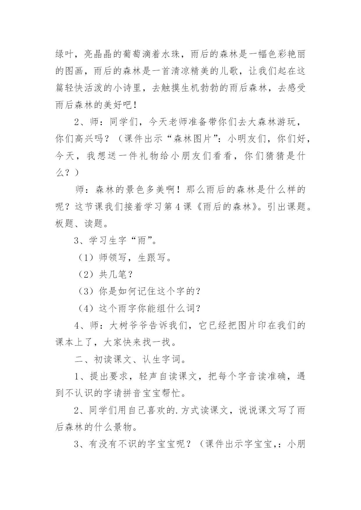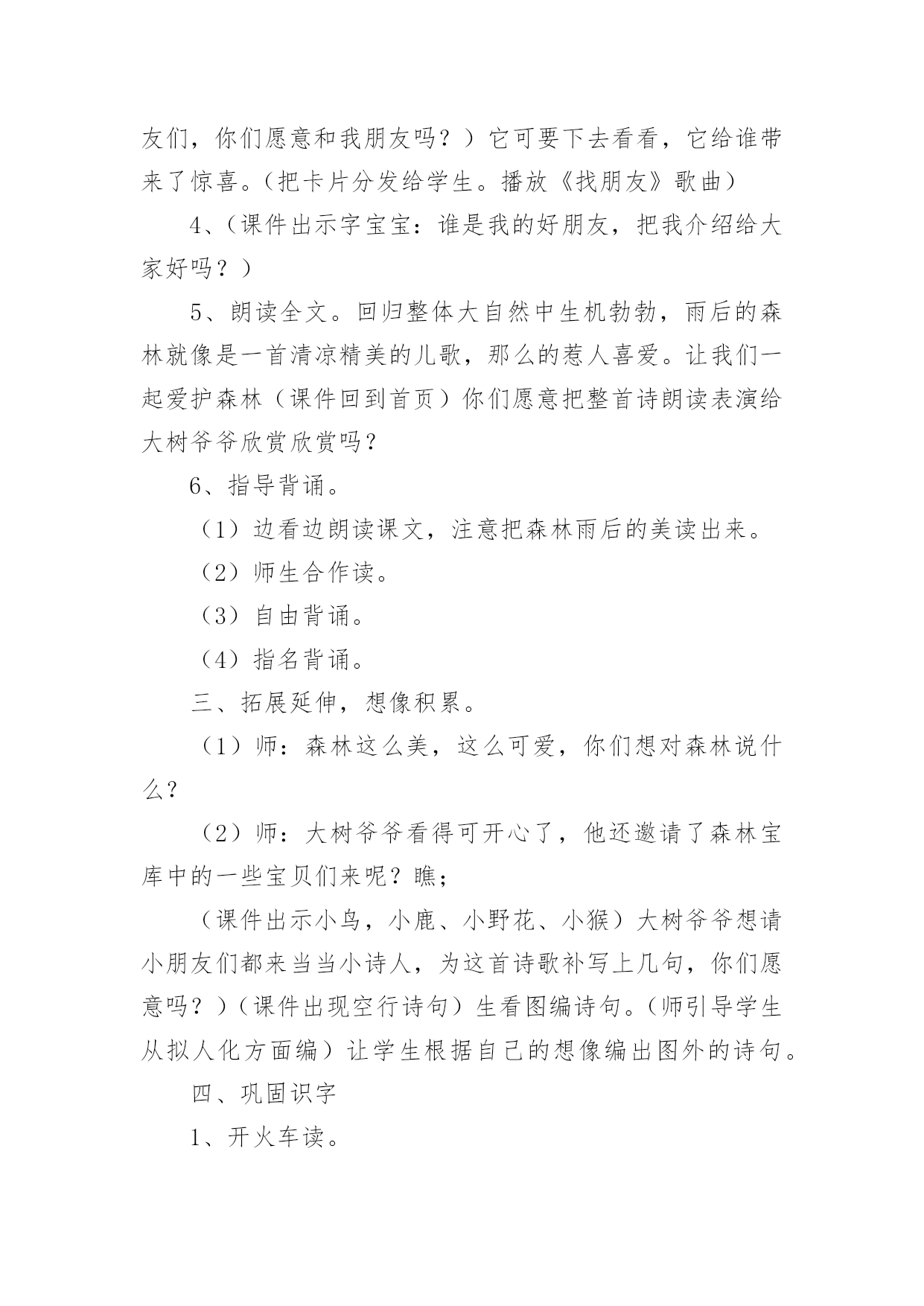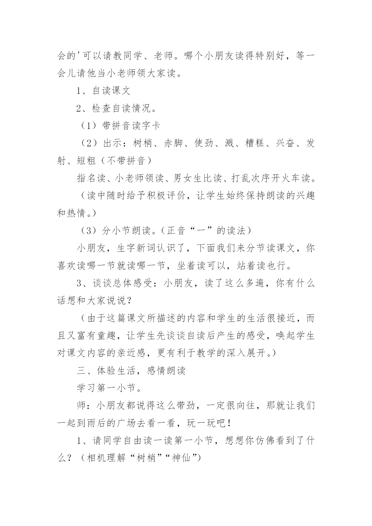 《雨后》教学设计《雨后》教学设计作为一名专为他人授业解惑的人民教师,往往需要进行教学设计编写工作,教学设计是把教学原理转化为教学材料和教学活动的计划。优秀的教学设计都具备一些什么特点呢?下面是小编为大家收集的《雨后》教学设计,仅供参考,欢迎大家阅读。《雨后》教学设计1一、欣赏阅读,激发兴趣1.师:今天,老师给同学们介绍一位德高望重的大作家——冰心。简介作者。许多小朋友都亲切地称她冰心奶奶。今天我们就来学习一篇冰心奶奶写的富有童趣的诗歌《雨后》一课。2.齐读课题3、教师朗读课文或播放“配乐朗读”。想想课文写了些什么?建议让学生欣赏两遍;看课文听朗读,让学生在视听状态下体会和理解课文内容。二、自由读文,初步感受过渡句:你瞧,雨后孩子们玩得多快乐呀!好多小朋友都迫不及待地想加入他们的队伍呢。赶紧借着拼音自由朗读课文,遇到生字、难读的字多读几遍,要把句子读通顺。不会的'可以请教同学、老师。哪个小朋友读得特别好,等一会儿请他当小老师领大家读。1、自读课文2、检查自读情况。(1)带拼音读字卡(2)出示:树梢、赤脚、使劲、溅、糟糕、兴奋、发射、短粗(不带拼音)指名读、小老师领读、男女生比读、打乱次序开火车读。(读中随时给予积极评价,让学生始终保持朗读的兴趣和热情。)(3)分小节朗读。(正音“一”的读法)小朋友,生字新词认识了,下面我们来分节读课文,你喜欢读哪一节就读哪一节,坐着读可以,站着读也行。3、谈谈总体感受:小朋友,读了这么多遍,你有什么话想和大家说说?(由于这篇课文所描述的内容和学生的生活很接近,而且又富有童趣,让学生先谈谈自读后产生的感受,唤起学生对课文内容的亲近感,更有利于教学的深入展开。)三、体验生活,感情朗读学习第一小节。师:小朋友都说得这么带劲,一定很向往,那就让我们一起到雨后的广场去看一看,玩一玩吧!1、请同学自由读一读第一小节,想想你仿佛看到了什么?(相机理解“树梢”“神仙”)2、神仙是什么呢?(有超强的本领,逍遥自在,像孙悟空。自由自在)说他们像神仙,逍遥、自在,多开心呀!如果你就是他们中的一员,你会怎么玩呢?3、刚才,你们玩得那么开心,说得那么起劲,现在,能用有感情的朗读来表达出你们的快乐吗?(指名读、评价:真是一群快乐的孩子们呀!)学第二小节。师:快看,那边的一个小哥哥玩水可真起劲。快读读第二小节,边读边画出小哥哥动作的词语,想想你看出了什么?或你觉得小哥哥怎样?(调皮,好玩,有趣,关心小妹妹)1、找动词:踩喊滑2、指导朗读:小哥哥使劲地踩着水,把水花儿溅起多高。(给使劲换词)他喊:“妹,小心,滑!”(指名读)师:你就是那个小哥哥,妹妹就要过来了,你喊一喊!(细节指导:声调提高或短促)个性朗读3、回归整体。四、学习生字:小哥哥摔倒了以后,会怎样呢,我们下节课学习。现在我们先学习课文的两个生字“梢”“赤”1、巧记字形2、当小书法家提醒字在田字格书写(提示:梢下的月是竖,不是撇。)3、描红4、书写。五:布置作业:1、有感情地朗读课文,背诵第一二小节。2、写生字《雨后》教学设计2【教学目标】1、指导学生认识“伞、红、果、绿、叶、图、画、祖国”9个生字。会写“木、开、水、耳、雨”五个字,学习新笔画“横折撇”。2、帮助学生正确流利地朗读课文,背诵课文,能通过朗读感悟雨后森林的美。3、引导学生发现雨后树木或草地上事物有什么变化。【教学重点】1、指导学生识字写字。2、朗读背诵课文。【教学难点】理解最后一句话的意思,感受大自然的可爱。【教具准备】根据课文内容制作的课件、生字词卡片。【教学过程】一、导入课文,激发兴趣。1、解说:森林里,雨停了,鲜嫩鲜嫩的蘑菇探出头来撑开了小伞,油光肥厚的木耳挂满了老树,圆圆的红果枕头绿叶,亮晶晶的葡萄滴着水珠,雨后的森林是一幅色彩艳丽的图画,雨后的森林是一首清凉精美的儿歌,让我们起在这篇轻快活泼的小诗里,去触摸生机勃勃的雨后森林,去感受雨后森林的美好吧!2、师:同学们,今天老师准备带你们去大森林游玩,你们高兴吗?(课件出示“森林图片”:小明友们,你们好,今天,我想送一件礼物给小朋友们看看,你们猜猜是什么?)师:森林的景色多美啊!那么雨后的森林是什么样的呢?这节课我们接着学习第4课《雨后的森林》。引出课题。板题、读题。3、学习生字“雨”。(1)师领写,生跟写。(2)共几笔?(3)你是如何记住这个字的?(4)这个雨字你能组什么词?4、师:大树爷爷告诉我们,它已经把图片印在我们的课本上了,大家快来找一找。二、初读课文、认生字词。1、提出要求,轻声自读课文,把每个字音读准确,遇到不认识的字请拼音宝宝帮忙。2、同学们用自己喜欢的.方式读课文,说说课文写了雨后森林的什么景物。3、有没有不识的字宝宝呢?(课件出示字宝宝,:小朋友们,你们愿意和我朋友吗?)它可要下去看看,它给谁带来了惊喜。(把卡片分发给学生。
