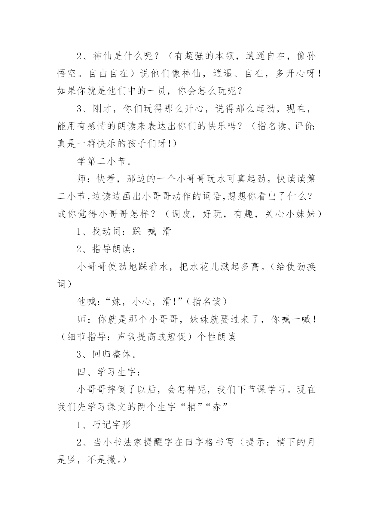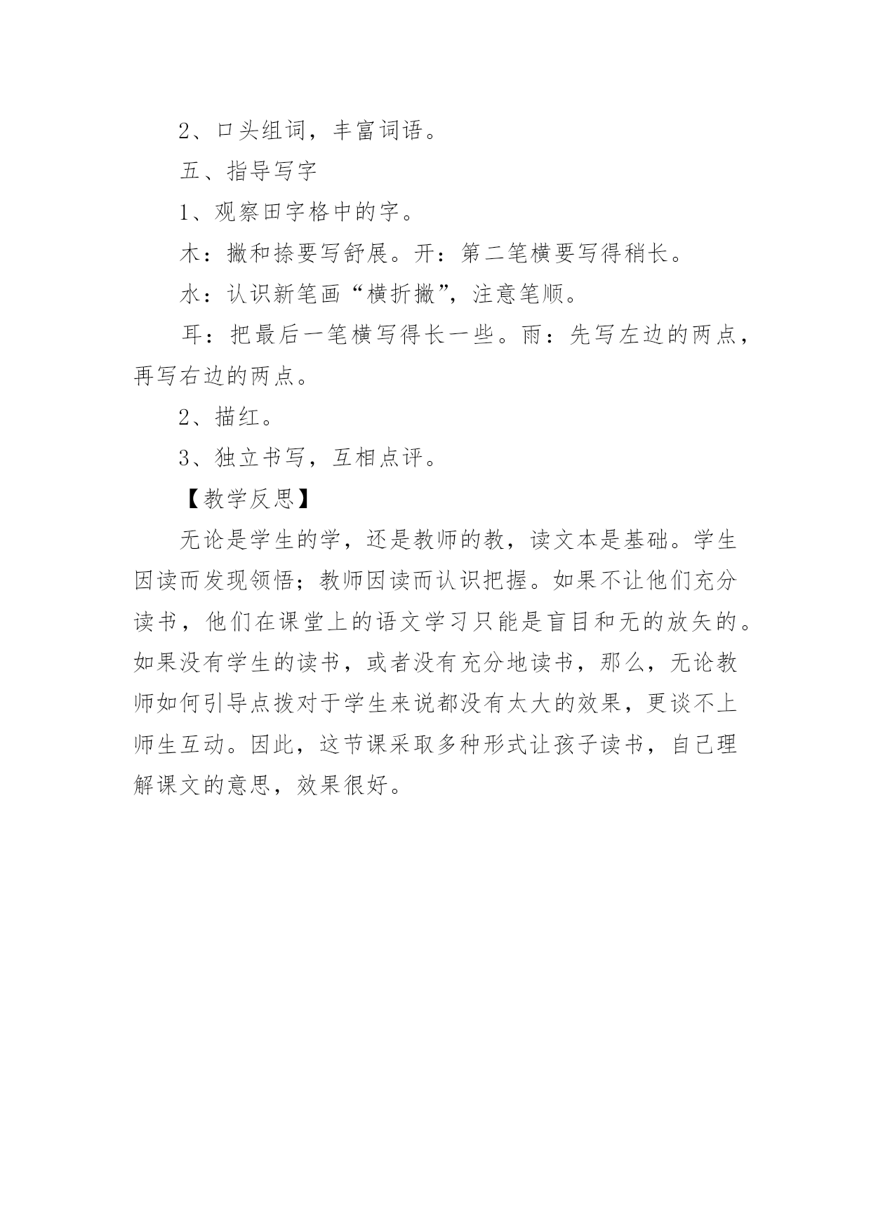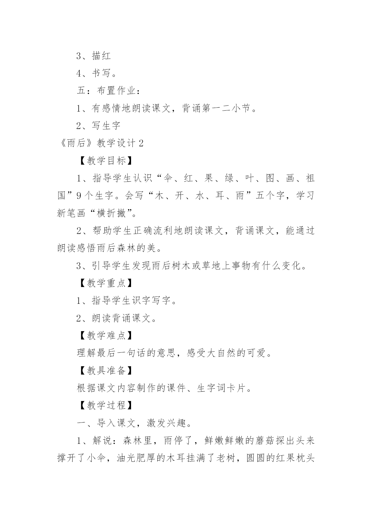 《雨后》教学设计《雨后》教学设计作为一名专为他人授业解惑的人民教师,往往需要进行教学设计编写工作,教学设计是把教学原理转化为教学材料和教学活动的计划。优秀的教学设计都具备一些什么特点呢?下面是小编为大家收集的《雨后》教学设计,仅供参考,欢迎大家阅读。《雨后》教学设计1一、欣赏阅读,激发兴趣1.师:今天,老师给同学们介绍一位德高望重的大作家——冰心。简介作者。许多小朋友都亲切地称她冰心奶奶。今天我们就来学习一篇冰心奶奶写的富有童趣的诗歌《雨后》一课。2.齐读课题3、教师朗读课文或播放“配乐朗读”。想想课文写了些什么?建议让学生欣赏两遍;看课文听朗读,让学生在视听状态下体会和理解课文内容。二、自由读文,初步感受过渡句:你瞧,雨后孩子们玩得多快乐呀!好多小朋友都迫不及待地想加入他们的队伍呢。赶紧借着拼音自由朗读课文,遇到生字、难读的字多读几遍,要把句子读通顺。不会的'可以请教同学、老师。哪个小朋友读得特别好,等一会儿请他当小老师领大家读。1、自读课文2、检查自读情况。(1)带拼音读字卡(2)出示:树梢、赤脚、使劲、溅、糟糕、兴奋、发射、短粗(不带拼音)指名读、小老师领读、男女生比读、打乱次序开火车读。(读中随时给予积极评价,让学生始终保持朗读的兴趣和热情。)(3)分小节朗读。(正音“一”的读法)小朋友,生字新词认识了,下面我们来分节读课文,你喜欢读哪一节就读哪一节,坐着读可以,站着读也行。3、谈谈总体感受:小朋友,读了这么多遍,你有什么话想和大家说说?(由于这篇课文所描述的内容和学生的生活很接近,而且又富有童趣,让学生先谈谈自读后产生的感受,唤起学生对课文内容的亲近感,更有利于教学的深入展开。)三、体验生活,感情朗读学习第一小节。师:小朋友都说得这么带劲,一定很向往,那就让我们一起到雨后的广场去看一看,玩一玩吧!1、请同学自由读一读第一小节,想想你仿佛看到了什么?(相机理解“树梢”“神仙”)2、神仙是什么呢?(有超强的本领,逍遥自在,像孙悟空。自由自在)说他们像神仙,逍遥、自在,多开心呀!如果你就是他们中的一员,你会怎么玩呢?3、刚才,你们玩得那么开心,说得那么起劲,现在,能用有感情的朗读来表达出你们的快乐吗?(指名读、评价:真是一群快乐的孩子们呀!)学第二小节。师:快看,那边的一个小哥哥玩水可真起劲。快读读第二小节,边读边画出小哥哥动作的词语,想想你看出了什么?或你觉得小哥哥怎样?(调皮,好玩,有趣,关心小妹妹)1、找动词:踩喊滑2、指导朗读:小哥哥使劲地踩着水,把水花儿溅起多高。(给使劲换词)他喊:“妹,小心,滑!”(指名读)师:你就是那个小哥哥,妹妹就要过来了,你喊一喊!(细节指导:声调提高或短促)个性朗读3、回归整体。四、学习生字:小哥哥摔倒了以后,会怎样呢,我们下节课学习。现在我们先学习课文的两个生字“梢”“赤”1、巧记字形2、当小书法家提醒字在田字格书写(提示:梢下的月是竖,不是撇。)3、描红4、书写。五:布置作业:1、有感情地朗读课文,背诵第一二小节。2、写生字《雨后》教学设计2【教学目标】1、指导学生认识“伞、红、果、绿、叶、图、画、祖国”9个生字。会写“木、开、水、耳、雨”五个字,学习新笔画“横折撇”。2、帮助学生正确流利地朗读课文,背诵课文,能通过朗读感悟雨后森林的美。3、引导学生发现雨后树木或草地上事物有什么变化。【教学重点】1、指导学生识字写字。2、朗读背诵课文。【教学难点】理解最后一句话的意思,感受大自然的可爱。【教具准备】根据课文内容制作的课件、生字词卡片。【教学过程】一、导入课文,激发兴趣。1、解说:森林里,雨停了,鲜嫩鲜嫩的蘑菇探出头来撑开了小伞,油光肥厚的木耳挂满了老树,圆圆的红果枕头绿叶,亮晶晶的葡萄滴着水珠,雨后的森林是一幅色彩艳丽的图画,雨后的森林是一首清凉精美的儿歌,让我们起在这篇轻快活泼的小诗里,去触摸生机勃勃的雨后森林,去感受雨后森林的美好吧!2、师:同学们,今天老师准备带你们去大森林游玩,你们高兴吗?(课件出示“森林图片”:小明友们,你们好,今天,我想送一件礼物给小朋友们看看,你们猜猜是什么?)师:森林的景色多美啊!那么雨后的森林是什么样的呢?这节课我们接着学习第4课《雨后的森林》。引出课题。板题、读题。3、学习生字“雨”。(1)师领写,生跟写。(2)共几笔?(3)你是如何记住这个字的?(4)这个雨字你能组什么词?4、师:大树爷爷告诉我们,它已经把图片印在我们的课本上了,大家快来找一找。二、初读课文、认生字词。1、提出要求,轻声自读课文,把每个字音读准确,遇到不认识的字请拼音宝宝帮忙。2、同学们用自己喜欢的.方式读课文,说说课文写了雨后森林的什么景物。3、有没有不识的字宝宝呢?(课件出示字宝宝,:小朋友们,你们愿意和我朋友吗?)它可要下去看看,它给谁带来了惊喜。(把卡片分发给学生。