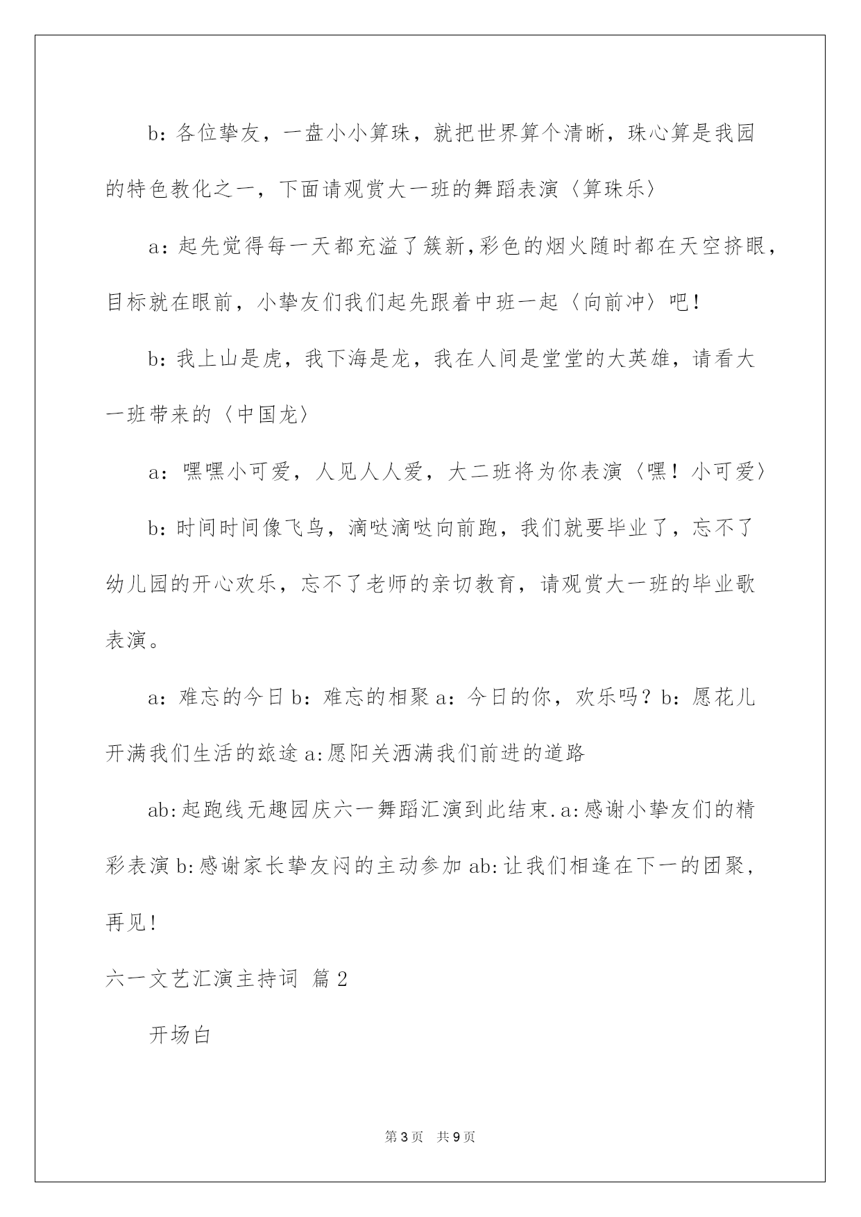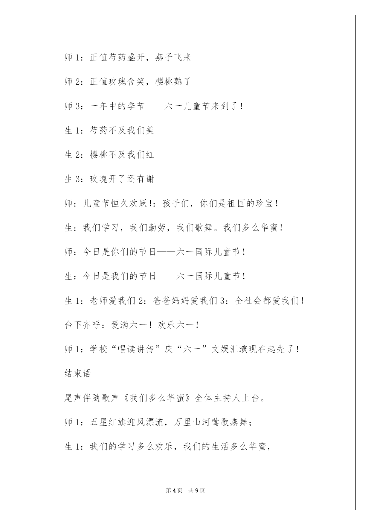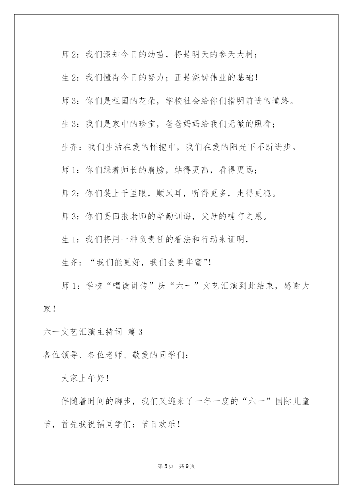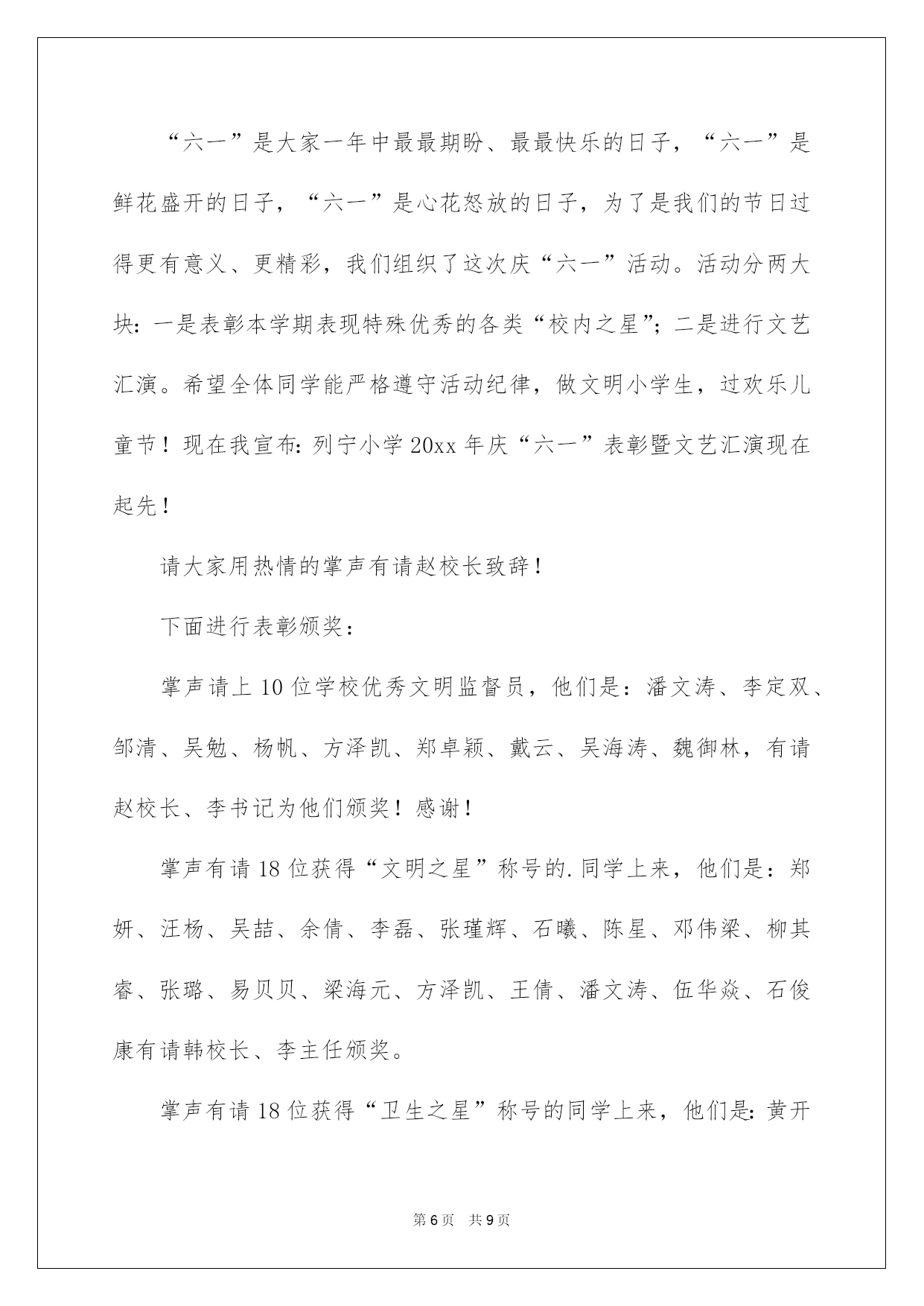 第PAGE\*Arabic\*MERGEFORMAT9页共NUMPAGES\*Arabic\*MERGEFORMAT9页第PAGE\*MERGEFORMAT9页共NUMPAGES\*MERGEFORMAT9页第PAGE\*MERGEFORMAT9页共NUMPAGES\*MERGEFORMAT9页第PAGE\*MERGEFORMAT9页共NUMPAGES\*MERGEFORMAT9页第PAGE\*MERGEFORMAT9页共NUMPAGES\*MERGEFORMAT9页第PAGE\*MERGEFORMAT9页共NUMPAGES\*MERGEFORMAT9页第PAGE\*MERGEFORMAT9页共NUMPAGES\*MERGEFORMAT9页第PAGE\*MERGEFORMAT9页共NUMPAGES\*MERGEFORMAT9页第PAGE\*MERGEFORMAT9页共NUMPAGES\*MERGEFORMAT9页第PAGE\*MERGEFORMAT9页共NUMPAGES\*MERGEFORMAT9页第PAGE\*MERGEFORMAT9页共NUMPAGES\*MERGEFORMAT9页2022六一文艺汇演主持词六一文艺汇演主持词锦集五篇主持词要尽量增加文化内涵、寓教于乐,不断提高观众的文化学问和素养。在人们主动参加各种活动的今日,司仪等是许多场合都须要的角色,那么如何把主持词做到重点主题呢?下面是我为大家整理的六一文艺汇演主持词6篇,仅供参考,欢迎大家阅读。六一文艺汇演主持词篇1a:敬爱的小挚友们b:敬重的家长挚友们!ab:大家上午好!a:感谢大家能从百忙之中抽空来参与我们的六一文艺汇演b:下面起跑线无趣园庆六一文艺汇演正式起先a:我们的祖国旺盛昌盛,我们的祖国繁花似锦,我们在祖国的怀抱中健康成长,下面请观赏舞蹈〈恭喜祖国富起来〉表演者:起跑线无趣园大一班。b:我有一只可爱的小狗,蹦蹦跳跳跟在身后,啦啦啦小狗小狗,我的好挚友,请观赏小班为我们带来的〈我有一只可爱的小狗〉a:立正站好看这里,太惊慌的先稍息,英雄立刻就要出现,请观赏大一班的〈器械操〉表演。b:自己跌到自己爬,喂喂不要怕,你是好娃娃,你看山上为你开红花,下面请观赏小班为你带来的表演〈自己跌到自己爬〉a:天上一颗星,地下一只钉,一棵星舞蹈演出是大一班的节目,请观赏。b:在起跑线无趣园,小挚友们相互帮助,相互激励,亲如一家,共同成长,下面请观赏大二班和饿中班合作演出的舞蹈〈亲亲茉莉花〉a:今日我们团聚一堂,今日我们心情安逸,唱我们好听的歌儿。跳我们好玩的舞蹈,共同迎接和庆祝我们欢乐的节目,请观赏大一班表演的〈欢乐天使〉b:田野里泛着麦香的小麦穗,空中漂移着多彩的花瓣,让我们歌颂丰收的喜悦,歌颂华蜜的生活,请看大二班和中班为我们带来的〈走秀〉a:眼睛瞪得像铜铃,透出侦探家的精明,耳朵竖得像天线,听着一切可疑的声音,大二班和中班再次合作的〈黑猫警长〉就要出场了。b:各位挚友,一盘小小算珠,就把世界算个清晰,珠心算是我园的特色教化之一,下面请观赏大一班的舞蹈表演〈算珠乐〉a:起先觉得每一天都充溢了簇新,彩色的烟火随时都在天空挤眼,目标就在眼前,小挚友们我们起先跟着中班一起〈向前冲〉吧!b:我上山是虎,我下海是龙,我在人间是堂堂的大英雄,请看大一班带来的〈中国龙〉a:嘿嘿小可爱,人见人人爱,大二班将为你表演〈嘿!小可爱〉b:时间时间像飞鸟,滴哒滴哒向前跑,我们就要毕业了,忘不了幼儿园的开心欢乐,忘不了老师的亲切教育,请观赏大一班的毕业歌表演。a:难忘的今日b:难忘的相聚a:今日的你,欢乐吗?b:愿花儿开满我们生活的玈途a:愿阳关洒满我们前进的道路ab:起跑线无趣园庆六一舞蹈汇演到此结束.a:感谢小挚友们的精彩表演b:感谢家长挚友闷的主动参加ab:让我们相逢在下一的团聚,再见!六一文艺汇演主持词篇2开场白师1:正值芍药盛开,燕子飞来师2:正值玫瑰含笑,樱桃熟了师3:一年中的季节——六一儿童节来到了!生1:芍药不及我们美生2:樱桃不及我们红生3:玫瑰开了还有谢师:儿童节恒久欢跃!:孩子们,你们是祖国的珍宝!生:我们学习,我们勤劳,我们歌舞。我们多么华蜜!师:今日是你们的节日——六一国际儿童节!生:今日是我们的节日——六一国际儿童节!生1:老师爱我们2:爸爸妈妈爱我们3:全社会都爱我们!台下齐呼:爱满六一!欢乐六一!师1:学校“唱读讲传”庆“六一”文娱汇演现在起先了!结束语尾声伴随歌声《我们多么华蜜》全体主持人上台。师1:五星红旗迎风漂流,万里山河莺歌燕舞;生1:我们的学习多么欢乐,我们的生活多么华蜜,师2:我们深知今日的幼苗,