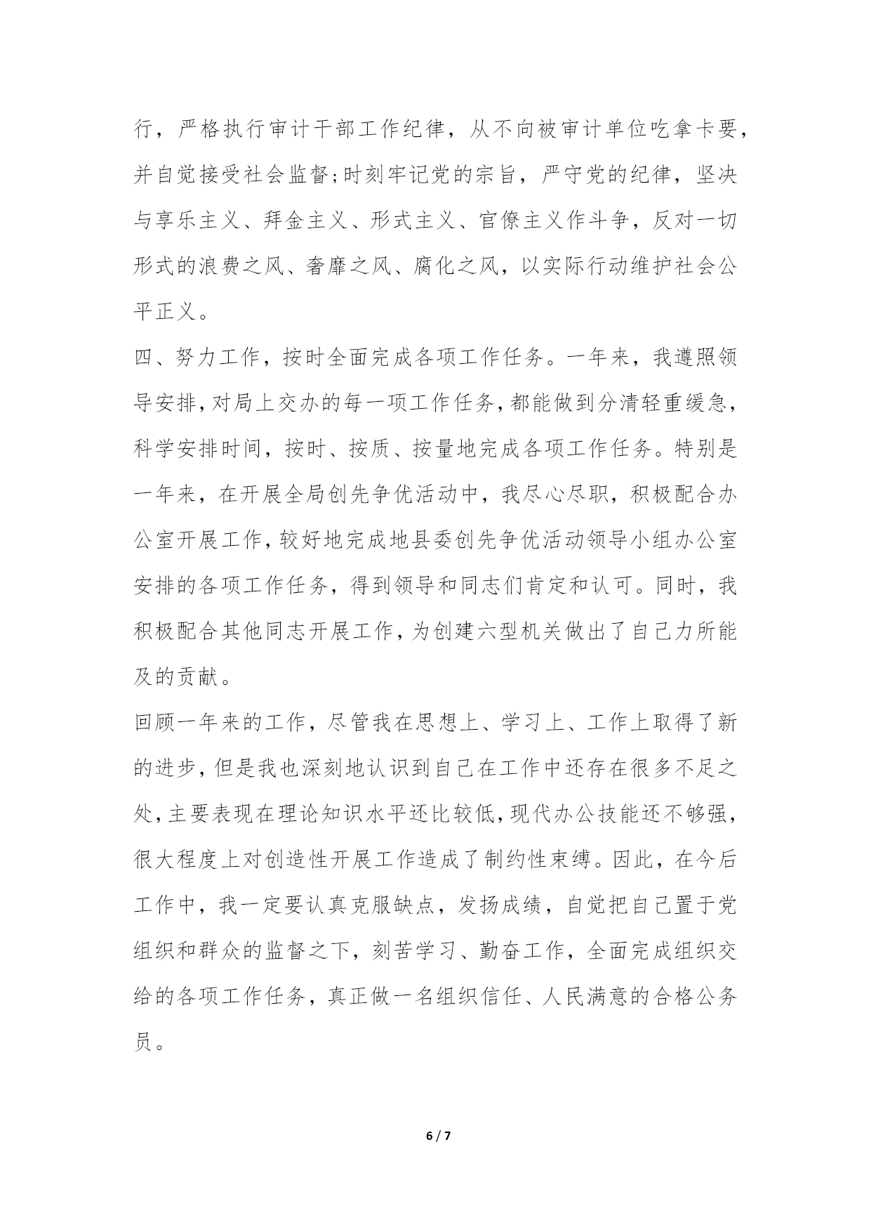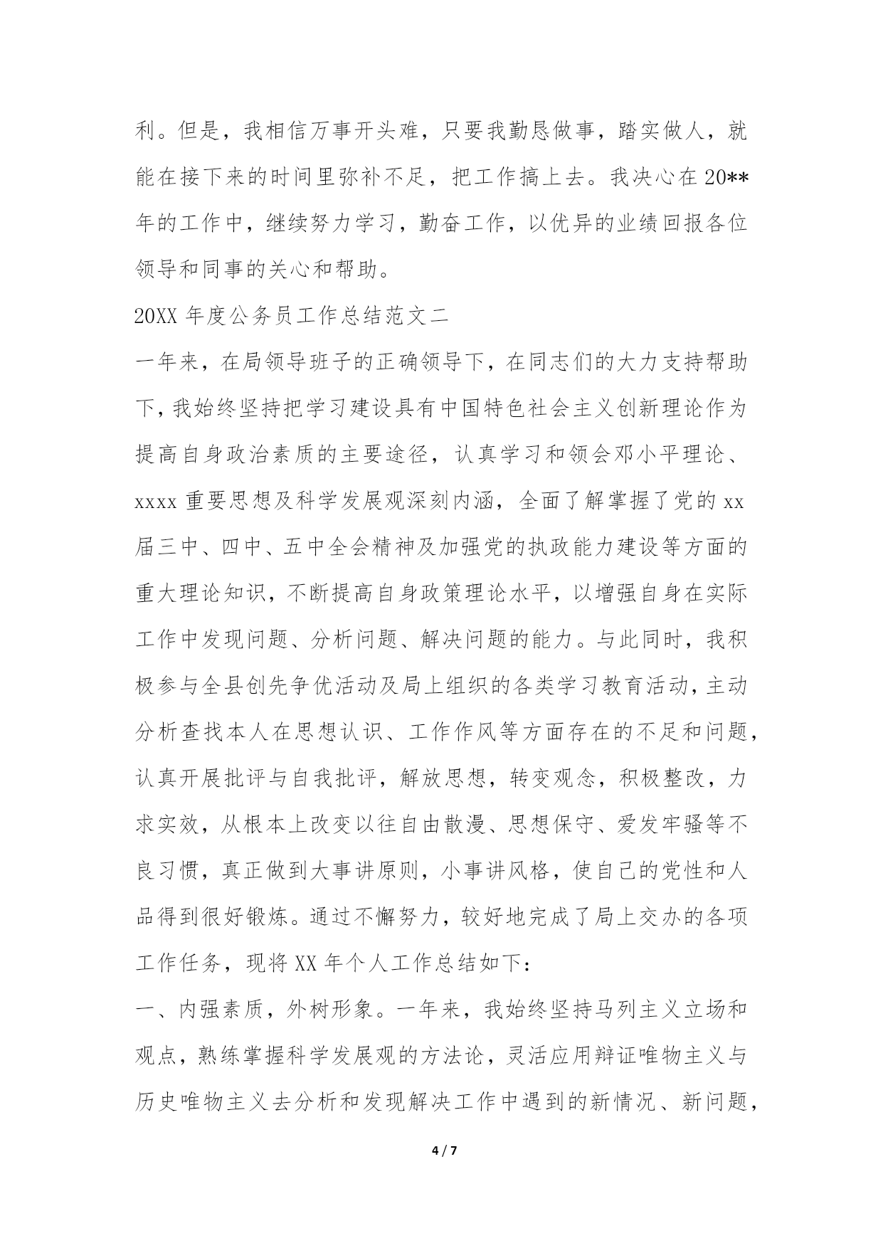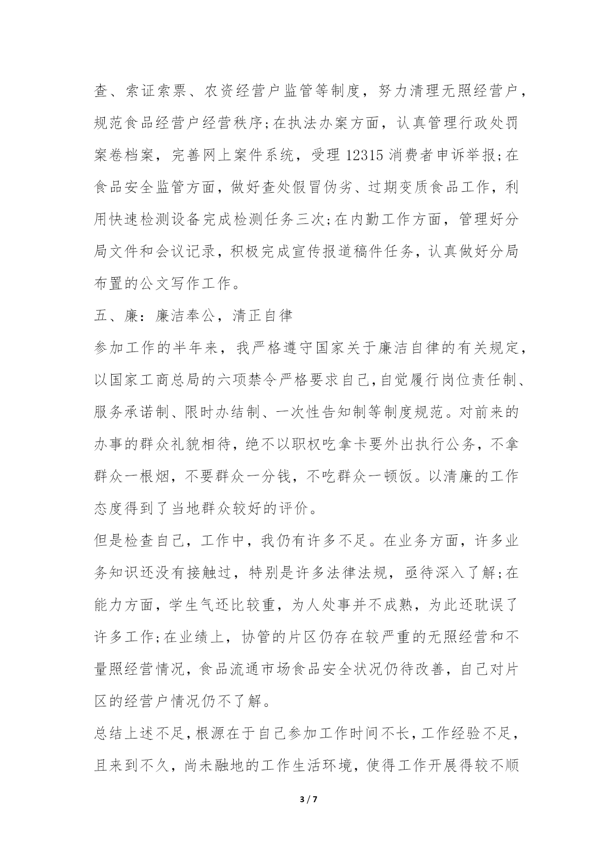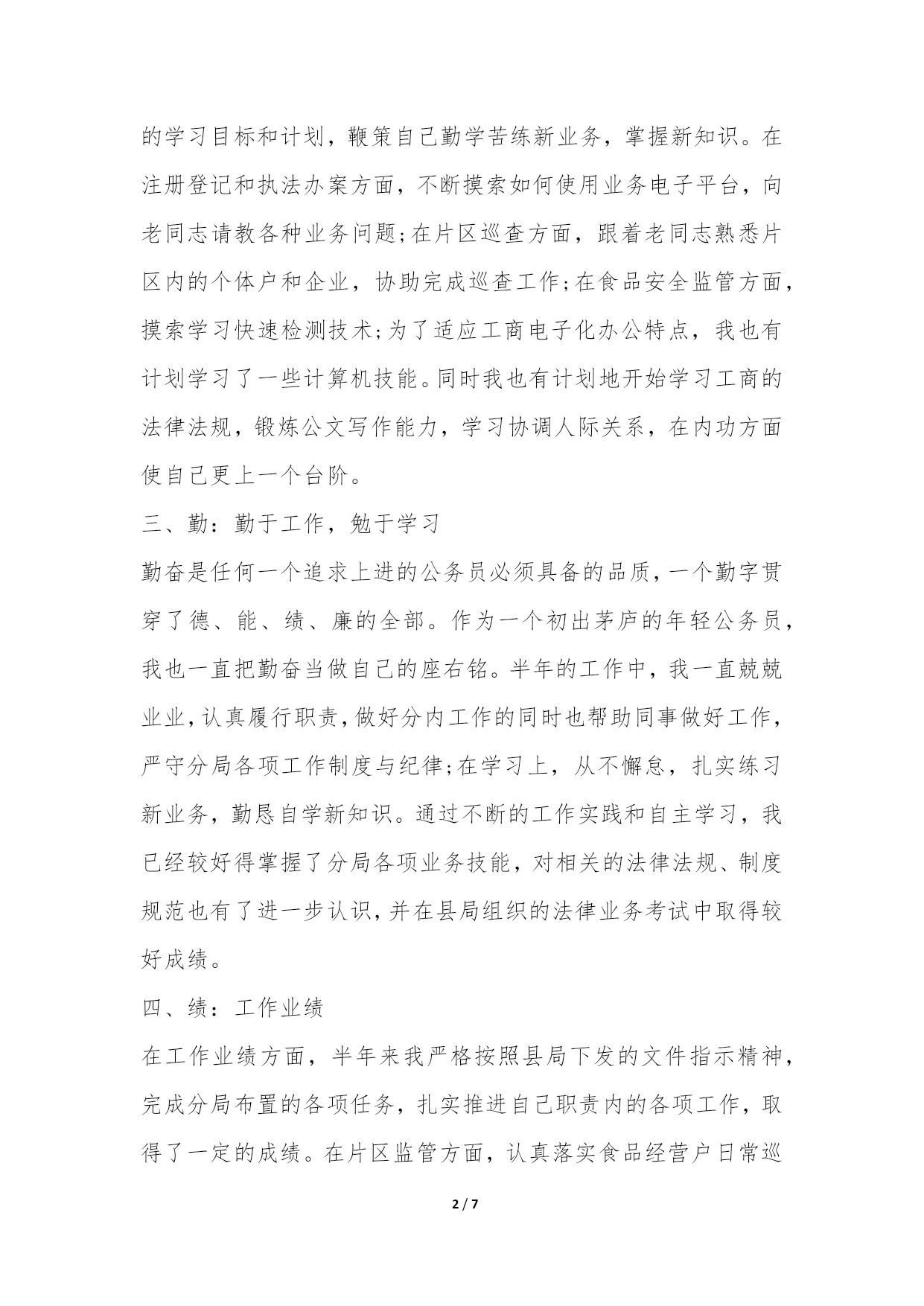 PAGE7/NUMPAGES72022年度公务员工作总结又到了年末的时候了,很多人要写公务员年度考核个人总结的,但是苦于不知道怎么下笔。今天我给大家为您整理了20XX年度公务员工作总结,希望对大家有所帮助。20XX年度公务员工作总结范文一一、德:忠诚可靠,实事求是我认为,公务员的德可体现为忠实二字,即忠诚可靠、实事求是。一个合格的公务员应该忠于党,忠于人民,忠于自己的事业;在日常工作中,更要做到实事求是,谨慎踏实。在半年的工作中,我一直牢记我党的宗旨全心全意为人民服务,在自己职责内的一亩三分地中,深入学习实践以人为本为核心的科学发展观,从我分局辖区内的广大企业、个体工商户以及消费者的根本利益出发,想群众之所想,急群众之所急,利群众之所利,履行好一个基层工商干部的职责。在工作中踏实做事,谦逊待人。努力完成职责内的工作和领导布置的任务,团结同事,尊重领导,支持、配合他人的工作,关心、帮助他人的生活学习。二、能:内外兼修,新旧融会我认为公务员的能可分为内功和外功,内练素质功底,外练业务技术。练好内功可为业务技能打好基础,勤练外功反过来可以强源固本,二者相辅相成,不可偏废。在进入工商系统工作的半年来,面对完全陌生的业务知识和工作环境,我为自己订立了具体的学习目标和计划,鞭策自己勤学苦练新业务,掌握新知识。在注册登记和执法办案方面,不断摸索如何使用业务电子平台,向老同志请教各种业务问题;在片区巡查方面,跟着老同志熟悉片区内的个体户和企业,协助完成巡查工作;在食品安全监管方面,摸索学习快速检测技术;为了适应工商电子化办公特点,我也有计划学习了一些计算机技能。同时我也有计划地开始学习工商的法律法规,锻炼公文写作能力,学习协调人际关系,在内功方面使自己更上一个台阶。三、勤:勤于工作,勉于学习勤奋是任何一个追求上进的公务员必须具备的品质,一个勤字贯穿了德、能、绩、廉的全部。作为一个初出茅庐的年轻公务员,我也一直把勤奋当做自己的座右铭。半年的工作中,我一直兢兢业业,认真履行职责,做好分内工作的同时也帮助同事做好工作,严守分局各项工作制度与纪律;在学习上,从不懈怠,扎实练习新业务,勤恳自学新知识。通过不断的工作实践和自主学习,我已经较好得掌握了分局各项业务技能,对相关的法律法规、制度规范也有了进一步认识,并在县局组织的法律业务考试中取得较好成绩。四、绩:工作业绩在工作业绩方面,半年来我严格按照县局下发的文件指示精神,完成分局布置的各项任务,扎实推进自己职责内的各项工作,取得了一定的成绩。在片区监管方面,认真落实食品经营户日常巡查、索证索票、农资经营户监管等制度,努力清理无照经营户,规范食品经营户经营秩序;在执法办案方面,认真管理行政处罚案卷档案,完善网上案件系统,受理12315消费者申诉举报;在食品安全监管方面,做好查处假冒伪劣、过期变质食品工作,利用快速检测设备完成检测任务三次;在内勤工作方面,管理好分局文件和会议记录,积极完成宣传报道稿件任务,认真做好分局布置的公文写作工作。五、廉:廉洁奉公,清正自律参加工作的半年来,我严格遵守国家关于廉洁自律的有关规定,以国家工商总局的六项禁令严格要求自己,自觉履行岗位责任制、服务承诺制、限时办结制、一次性告知制等制度规范。对前来的办事的群众礼貌相待,绝不以职权吃拿卡要外出执行公务,不拿群众一根烟,不要群众一分钱,不吃群众一顿饭。以清廉的工作态度得到了当地群众较好的评价。但是检查自己,工作中,我仍有许多不足。在业务方面,许多业务知识还没有接触过,特别是许多法律法规,亟待深入了解;在能力方面,学生气还比较重,为人处事并不成熟,为此还耽误了许多工作;在业绩上,协管的片区仍存在较严重的无照经营和不量照经营情况,食品流通市场食品安全状况仍待改善,自己对片区的经营户情况仍不了解。总结上述不足,根源在于自己参加工作时间不长,工作经验不足,且来到不久,尚未融地的工作生活环境,使得工作开展得较不顺利。但是,我相信万事开头难,只要我勤恳做事,踏实做人,就能在接下来的时间里弥补不足,把工作搞上去。我决心在20**年的工作中,继续努力学习,勤奋工作,以优异的业绩回报各位领导和同事的关心和帮助。20XX年度公务员工作总结范文二一年来,在局领导班子的正确领导下,在同志们的大力支持帮助下,我始终坚持把学习建设具有中国特色社会主义创新理论作为提高自身政治素质的主要途径,认真学习和领会邓小平理论、xxxx重要思想及科学发展观深刻内涵,全面了解掌握了党的xx届三中、四中、五中全会精神及加强党的执政能力建设等方面的重大理论知识,不断提高自身政策理论水平,以增强自身在实际工作中发现问题、分析问题、解决问题的能力。与此同时,我积极参与全县创先争优活动及局上组织的各类学习教育活动,主动分析查找本人在思想认识、工作作风等方面存在的不