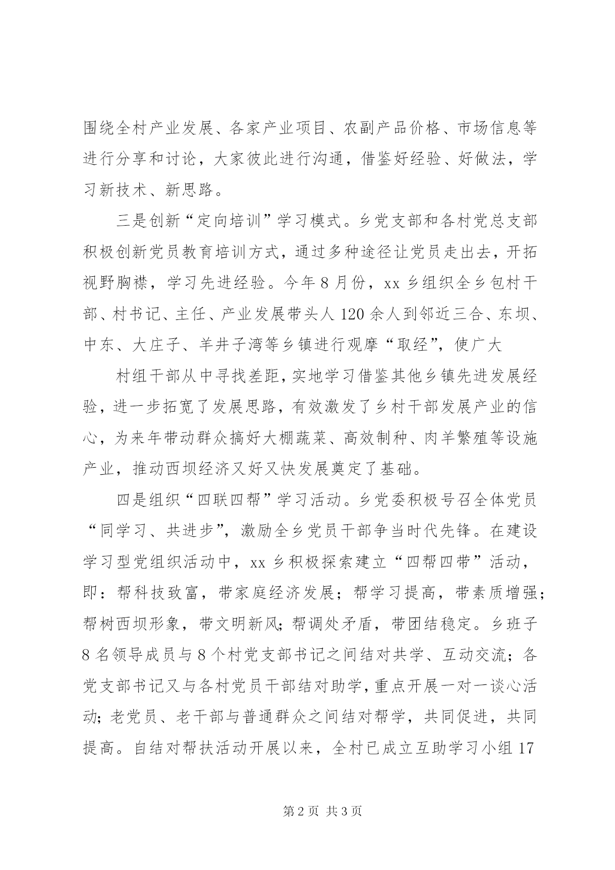 第PAGE\*Arabic\*MERGEFORMAT3页共NUMPAGES\*MERGEFORMAT3页创新干部理论学习的方式xx乡创新学习方式,积极搭建党员干部学习平台近日,xx乡加强党员干部学习阵地建设,认真探索富有特色、形式活泼的学习方式,积极搭建党员干部学习平台,有效助推了创先争优活动的深入开展。一是搭建“网络课堂”学习平台。乡上开通了“xx乡集团网业务”,要求全体机关干部、各村干部统一将各自的手机号码入网,建立了手机飞信网络平台,利用手机飞信网络平台,乡党政办工作人员定期将最近的政策理论、学习热点、市场信息通过手机短信方式发送到全村党员干部手中。党员干部又及时将相关信息通过入户交流,传递给了群众,扩大了学习的覆盖面,提高了群众接受信息的渠道,受到了党员群众的一致好评和欢迎,有效地调动了党员群众的学习热情。二是打造“每周一课”学习载体。乡党政办每周三定期组织全体机关干部集中学习金正昆教授《政务礼仪》视频讲座,切实加强机关干部作风建设、提高机关干部礼仪素养,增强为民服务意识,强化为民服务责任。同时,各村党支部积极打造“每月一课”集中学习平台。“每周一课”紧扣制约全村经济社会发展的难点问题和群众关注的热点问题,学习对象除全体党员外,扩大到村民小组长、致富能人、入党积极分子、群众代表等。近日,每周三晚在各村村委会都有近100名党员干部、群众围坐一起,围绕全村产业发展、各家产业项目、农副产品价格、市场信息等进行分享和讨论,大家彼此进行沟通,借鉴好经验、好做法,学习新技术、新思路。三是创新“定向培训”学习模式。乡党支部和各村党总支部积极创新党员教育培训方式,通过多种途径让党员走出去,开拓视野胸襟,学习先进经验。今年8月份,xx乡组织全乡包村干部、村书记、主任、产业发展带头人120余人到邻近三合、东坝、中东、大庄子、羊井子湾等乡镇进行观摩“取经”,使广大村组干部从中寻找差距,实地学习借鉴其他乡镇先进发展经验,进一步拓宽了发展思路,有效激发了乡村干部发展产业的信心,为来年带动群众搞好大棚蔬菜、高效制种、肉羊繁殖等设施产业,推动西坝经济又好又快发展奠定了基础。四是组织“四联四帮”学习活动。乡党委积极号召全体党员“同学习、共进步”,激励全乡党员干部争当时代先锋。在建设学习型党组织活动中,xx乡积极探索建立“四帮四带”活动,即:帮科技致富,带家庭经济发展;帮学习提高,带素质增强;帮树西坝形象,带文明新风;帮调处矛盾,带团结稳定。乡班子8名领导成员与8个村党支部书记之间结对共学、互动交流;各党支部书记又与各村党员干部结对助学,重点开展一对一谈心活动;老党员、老干部与普通群众之间结对帮学,共同促进,共同提高。自结对帮扶活动开展以来,全村已成立互助学习小组17个,举办互学活动16场次。