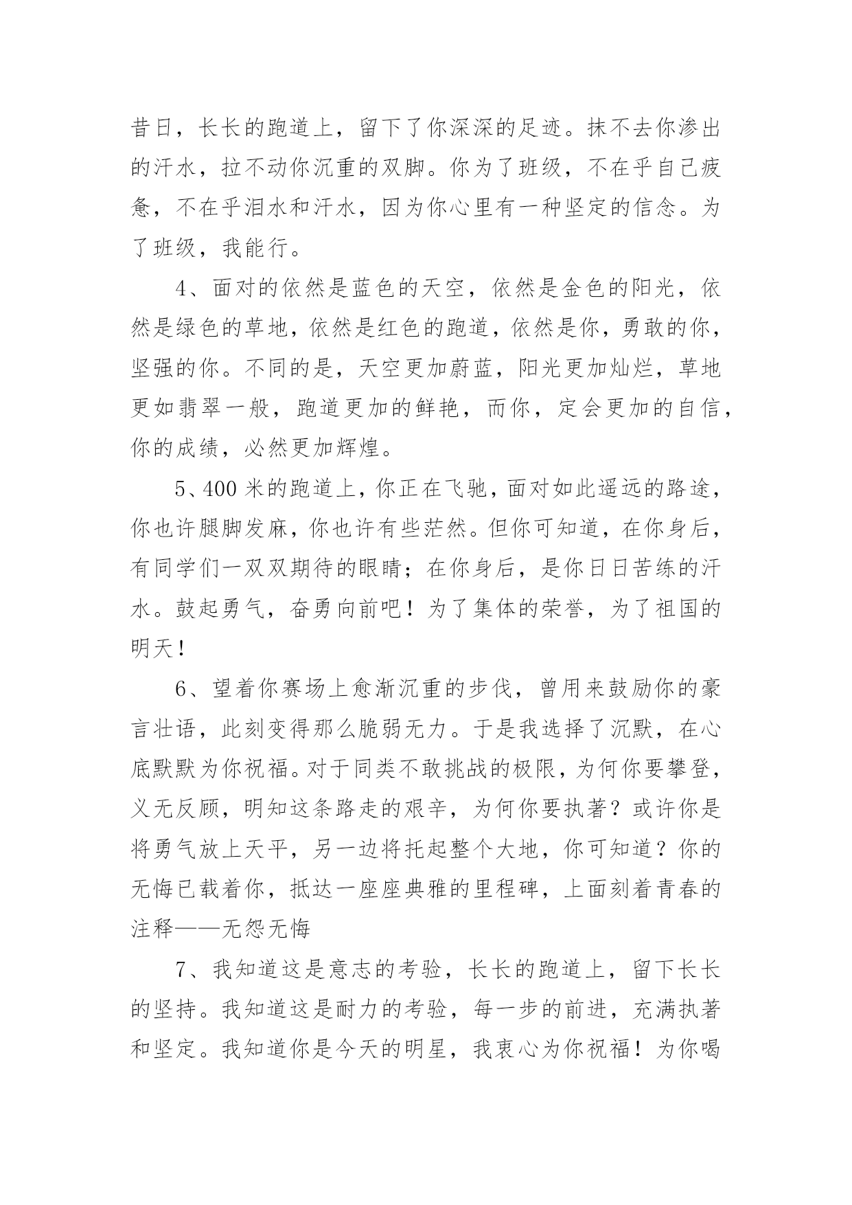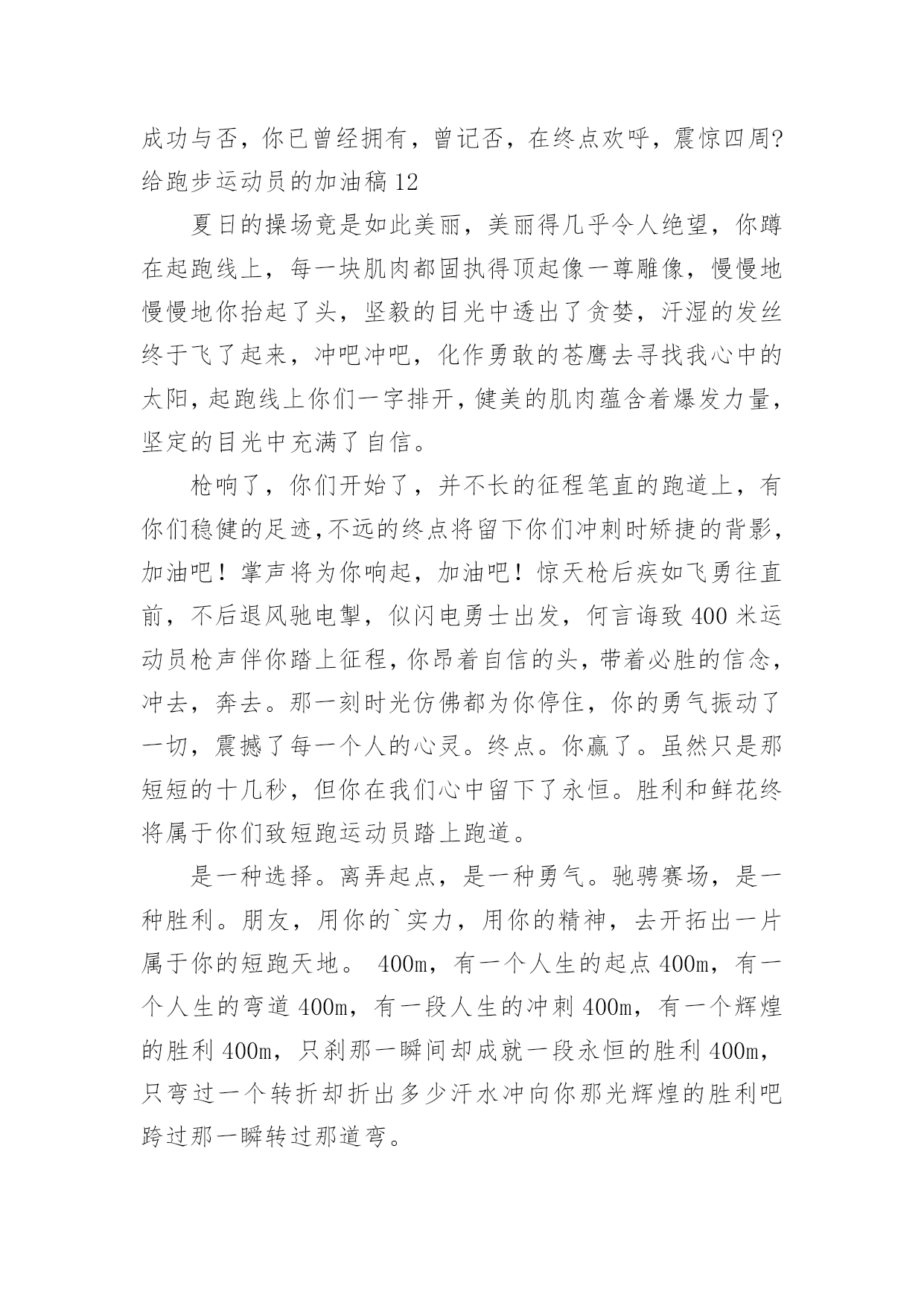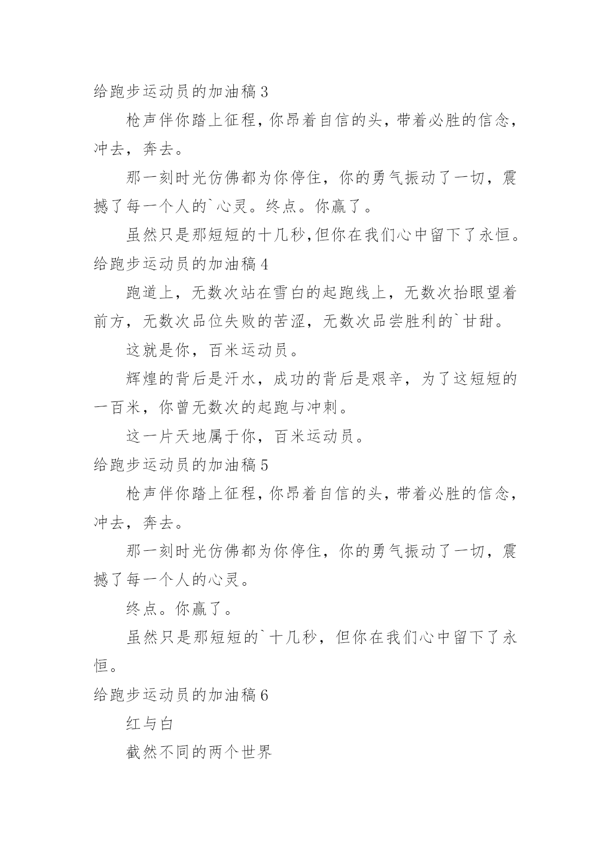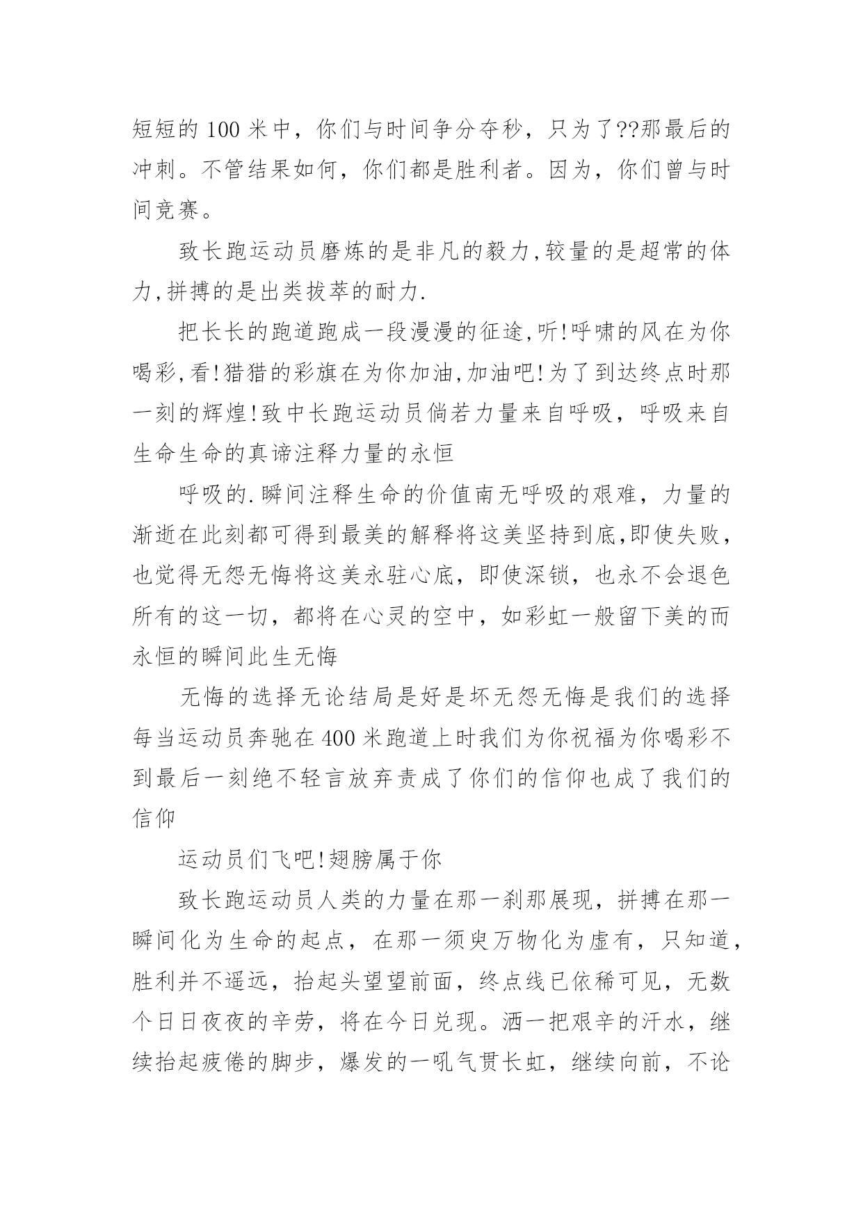 给跑步运动员的加油稿给跑步运动员的加油稿在社会发展不断提速的今天,我们都可能会用到加油稿,加油稿可以促进对方完成目标的进程。如何写一份恰当的加油稿呢?以下是小编精心整理的给跑步运动员的加油稿,希望对大家有所帮助。给跑步运动员的加油稿1跑道上,无数次站在雪白的起跑线上,无数次抬眼望着前方,无数次品位失败的`苦涩,无数次品尝胜利的甘甜,这就是你,百米运动员。辉煌的背后是汗水,成功的背后是艰辛,为了这短短的一百米,你曾无数次的起跑与冲刺。这一片天地属于你,百米运动员。给跑步运动员的加油稿2深深的呼吸,等待你的是100米。相信胜利会属于你们。但在这征途上,需要你用勇敢的心去面对。我们在为你加油,你是否听到了我们发自心中的呐喊?困难和胜利都在向你招手,去呀,快去呀,不要犹豫。快去击败困难、快去夺取胜利!相信你会送给我们一个汗水浸湿的'微笑!给跑步运动员的加油稿3枪声伴你踏上征程,你昂着自信的头,带着必胜的信念,冲去,奔去。那一刻时光仿佛都为你停住,你的勇气振动了一切,震撼了每一个人的`心灵。终点。你赢了。虽然只是那短短的十几秒,但你在我们心中留下了永恒。给跑步运动员的加油稿4跑道上,无数次站在雪白的起跑线上,无数次抬眼望着前方,无数次品位失败的苦涩,无数次品尝胜利的`甘甜。这就是你,百米运动员。辉煌的背后是汗水,成功的背后是艰辛,为了这短短的一百米,你曾无数次的起跑与冲刺。这一片天地属于你,百米运动员。给跑步运动员的加油稿5枪声伴你踏上征程,你昂着自信的头,带着必胜的信念,冲去,奔去。那一刻时光仿佛都为你停住,你的勇气振动了一切,震撼了每一个人的心灵。终点。你赢了。虽然只是那短短的`十几秒,但你在我们心中留下了永恒。给跑步运动员的加油稿6红与白截然不同的两个世界在手中传递传递着成功或失败你充满激情地颠簸着在运动员手中你简直是一根魔术杖牵动着全场观众的'心弦终点处你被成功者激动地高高抛起你被失败者愤恨地甩出很远给跑步运动员的加油稿71、望着绿茵场上你愈渐沉重的步伐,赛前鼓励你的豪言壮语已变得苍白无力,此刻的我只有沉默,只能在心底为你默默地祈祷和祝福。明知赛场上的五千米是你的极限,你为什么还要义无返顾地去挑战?我想因为终点是一座辉煌的里程碑,上面篆刻着蓬勃青春的注释——爱拼才会赢。2、你是否感到,烈日的照射,那是烈日对你的祝福。你是否感到,彩旗的摇摆,那是彩旗对你的呐喊。人们的注视,那是人们对你的希望。祝福在你身边,呐喊在你耳边,希望在你心中。滴滴汗水,飘洒在绿茵场上,伴随着矫健的步伐,奏出希望的乐章。一种种信念,放在蔚蓝的天空,伴随着你那深沉的`眼光,画出美丽的弧线。人生能有几回搏?千百双眼睛注视着你,为了希望、为了胜利,跑出青春的梦想。3、也许你心里忐忑不安,我们的心里早已热血沸腾。昔日,长长的跑道上,留下了你深深的足迹。抹不去你渗出的汗水,拉不动你沉重的双脚。你为了班级,不在乎自己疲惫,不在乎泪水和汗水,因为你心里有一种坚定的信念。为了班级,我能行。4、面对的依然是蓝色的天空,依然是金色的阳光,依然是绿色的草地,依然是红色的跑道,依然是你,勇敢的你,坚强的你。不同的是,天空更加蔚蓝,阳光更加灿烂,草地更如翡翠一般,跑道更加的鲜艳,而你,定会更加的自信,你的成绩,必然更加辉煌。5、400米的跑道上,你正在飞驰,面对如此遥远的路途,你也许腿脚发麻,你也许有些茫然。但你可知道,在你身后,有同学们一双双期待的眼睛;在你身后,是你日日苦练的汗水。鼓起勇气,奋勇向前吧!为了集体的荣誉,为了祖国的明天!6、望着你赛场上愈渐沉重的步伐,曾用来鼓励你的豪言壮语,此刻变得那么脆弱无力。于是我选择了沉默,在心底默默为你祝福。对于同类不敢挑战的极限,为何你要攀登,义无反顾,明知这条路走的艰辛,为何你要执著?或许你是将勇气放上天平,另一边将托起整个大地,你可知道?你的无悔已载着你,抵达一座座典雅的里程碑,上面刻着青春的注释——无怨无悔7、我知道这是意志的考验,长长的跑道上,留下长长的坚持。我知道这是耐力的考验,每一步的前进,充满执著和坚定。我知道你是今天的明星,我衷心为你祝福!为你喝彩!给跑步运动员的加油稿8200M,有一个人生的起点200M,有一个人生的弯道200M,有一段人生的.冲刺200M,有一个辉煌的胜利200M,只刹那一瞬间却成就一段永恒的胜利200M,只弯过一个转折却折出多少汗水冲向你那光辉煌的胜利吧跨过那一瞬转过那道弯胜利在向你招手给跑步运动员的加油稿9跑道上,无数次站在雪白的起跑线上,无数次抬眼望着前方,无数次品位失败的苦涩,无数次品尝胜利的甘甜。这就是你,百米运动员。辉煌的背后是汗水,成功的背后是艰辛,为了这短短的一百米,你曾无数次的'起跑与冲刺。这一片天地属于你,百米运动员。给跑步运动员的加油稿10深深的呼吸,等待你的是100米。相信胜