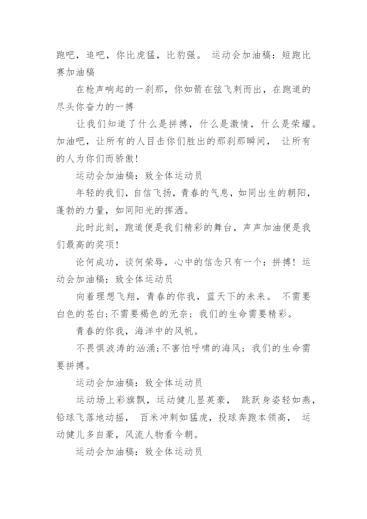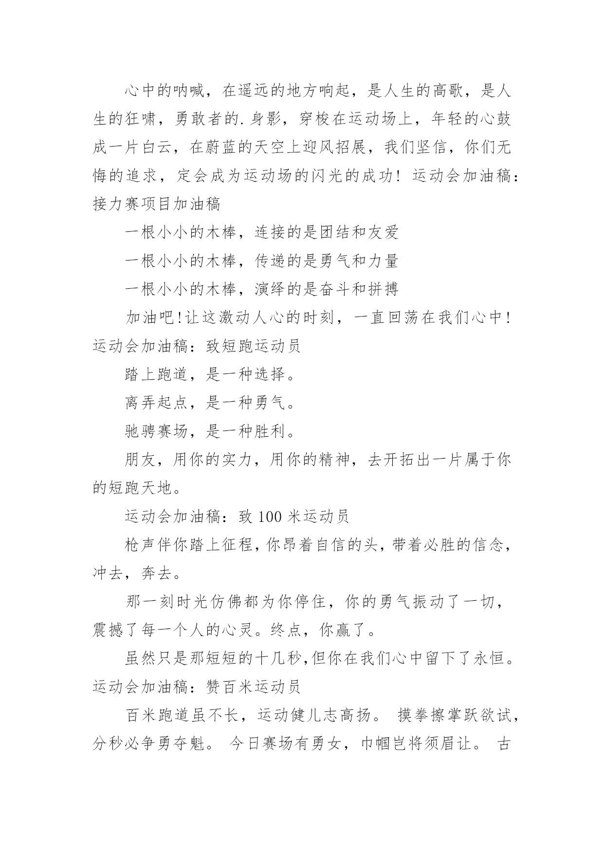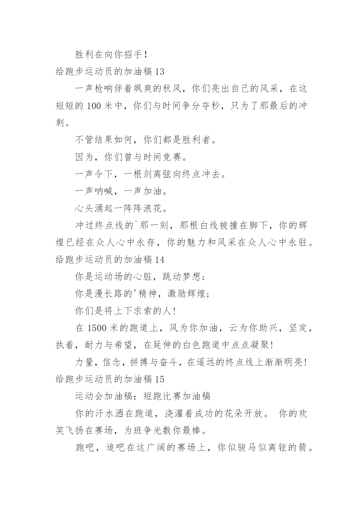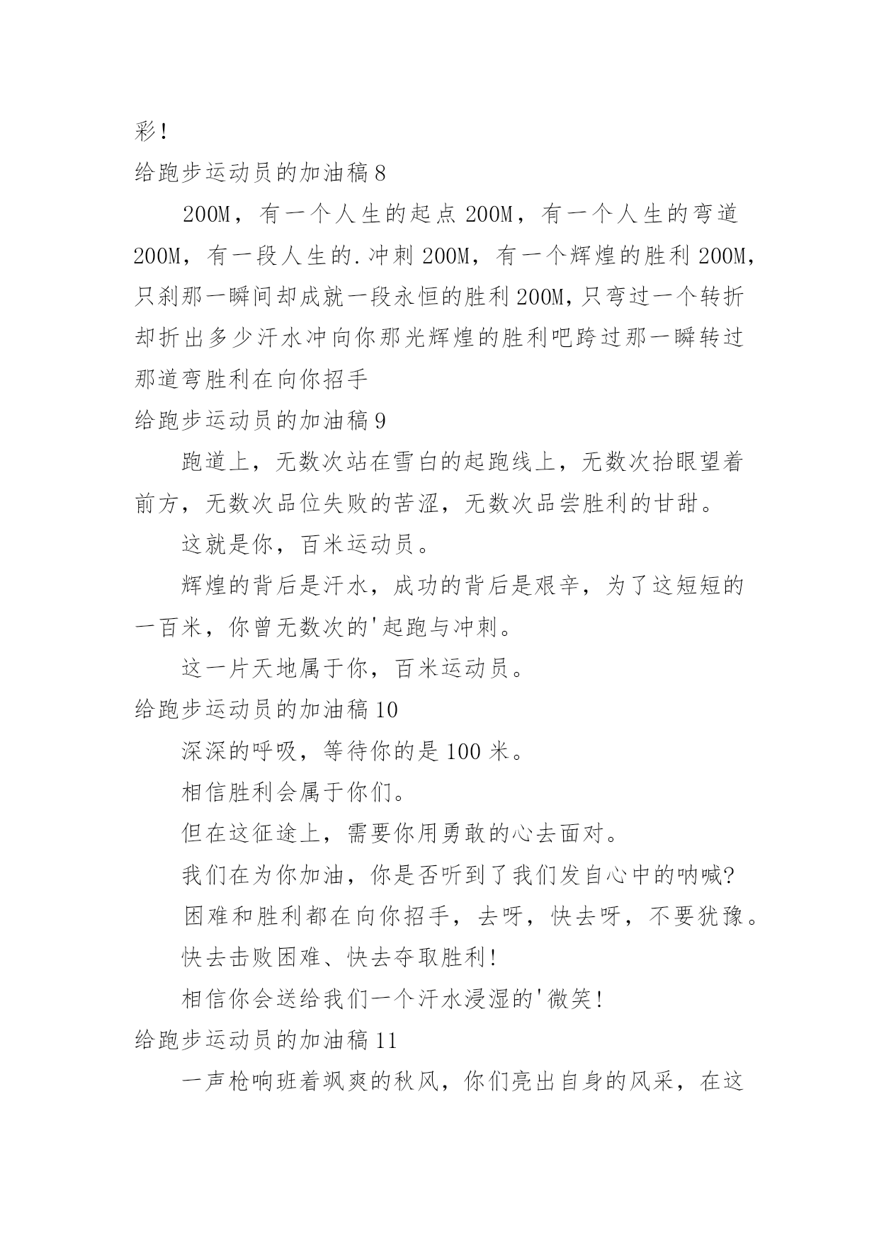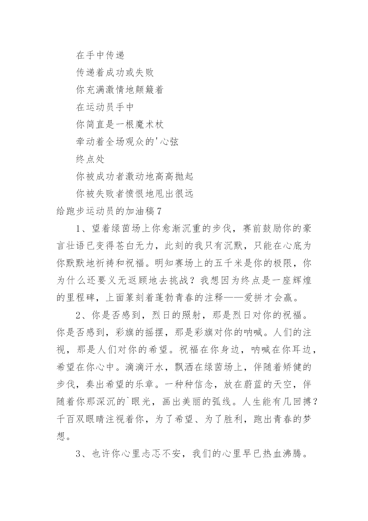 给跑步运动员的加油稿给跑步运动员的加油稿在社会发展不断提速的今天,我们都可能会用到加油稿,加油稿可以促进对方完成目标的进程。如何写一份恰当的加油稿呢?以下是小编精心整理的给跑步运动员的加油稿,希望对大家有所帮助。给跑步运动员的加油稿1跑道上,无数次站在雪白的起跑线上,无数次抬眼望着前方,无数次品位失败的`苦涩,无数次品尝胜利的甘甜,这就是你,百米运动员。辉煌的背后是汗水,成功的背后是艰辛,为了这短短的一百米,你曾无数次的起跑与冲刺。这一片天地属于你,百米运动员。给跑步运动员的加油稿2深深的呼吸,等待你的是100米。相信胜利会属于你们。但在这征途上,需要你用勇敢的心去面对。我们在为你加油,你是否听到了我们发自心中的呐喊?困难和胜利都在向你招手,去呀,快去呀,不要犹豫。快去击败困难、快去夺取胜利!相信你会送给我们一个汗水浸湿的'微笑!给跑步运动员的加油稿3枪声伴你踏上征程,你昂着自信的头,带着必胜的信念,冲去,奔去。那一刻时光仿佛都为你停住,你的勇气振动了一切,震撼了每一个人的`心灵。终点。你赢了。虽然只是那短短的十几秒,但你在我们心中留下了永恒。给跑步运动员的加油稿4跑道上,无数次站在雪白的起跑线上,无数次抬眼望着前方,无数次品位失败的苦涩,无数次品尝胜利的`甘甜。这就是你,百米运动员。辉煌的背后是汗水,成功的背后是艰辛,为了这短短的一百米,你曾无数次的起跑与冲刺。这一片天地属于你,百米运动员。给跑步运动员的加油稿5枪声伴你踏上征程,你昂着自信的头,带着必胜的信念,冲去,奔去。那一刻时光仿佛都为你停住,你的勇气振动了一切,震撼了每一个人的心灵。终点。你赢了。虽然只是那短短的`十几秒,但你在我们心中留下了永恒。给跑步运动员的加油稿6红与白截然不同的两个世界在手中传递传递着成功或失败你充满激情地颠簸着在运动员手中你简直是一根魔术杖牵动着全场观众的'心弦终点处你被成功者激动地高高抛起你被失败者愤恨地甩出很远给跑步运动员的加油稿71、望着绿茵场上你愈渐沉重的步伐,赛前鼓励你的豪言壮语已变得苍白无力,此刻的我只有沉默,只能在心底为你默默地祈祷和祝福。明知赛场上的五千米是你的极限,你为什么还要义无返顾地去挑战?我想因为终点是一座辉煌的里程碑,上面篆刻着蓬勃青春的注释——爱拼才会赢。2、你是否感到,烈日的照射,那是烈日对你的祝福。你是否感到,彩旗的摇摆,那是彩旗对你的呐喊。人们的注视,那是人们对你的希望。祝福在你身边,呐喊在你耳边,希望在你心中。滴滴汗水,飘洒在绿茵场上,伴随着矫健的步伐,奏出希望的乐章。一种种信念,放在蔚蓝的天空,伴随着你那深沉的`眼光,画出美丽的弧线。人生能有几回搏?千百双眼睛注视着你,为了希望、为了胜利,跑出青春的梦想。3、也许你心里忐忑不安,我们的心里早已热血沸腾。昔日,长长的跑道上,留下了你深深的足迹。抹不去你渗出的汗水,拉不动你沉重的双脚。你为了班级,不在乎自己疲惫,不在乎泪水和汗水,因为你心里有一种坚定的信念。为了班级,我能行。4、面对的依然是蓝色的天空,依然是金色的阳光,依然是绿色的草地,依然是红色的跑道,依然是你,勇敢的你,坚强的你。不同的是,天空更加蔚蓝,阳光更加灿烂,草地更如翡翠一般,跑道更加的鲜艳,而你,定会更加的自信,你的成绩,必然更加辉煌。5、400米的跑道上,你正在飞驰,面对如此遥远的路途,你也许腿脚发麻,你也许有些茫然。但你可知道,在你身后,有同学们一双双期待的眼睛;在你身后,是你日日苦练的汗水。鼓起勇气,奋勇向前吧!为了集体的荣誉,为了祖国的明天!6、望着你赛场上愈渐沉重的步伐,曾用来鼓励你的豪言壮语,此刻变得那么脆弱无力。于是我选择了沉默,在心底默默为你祝福。对于同类不敢挑战的极限,为何你要攀登,义无反顾,明知这条路走的艰辛,为何你要执著?或许你是将勇气放上天平,另一边将托起整个大地,你可知道?你的无悔已载着你,抵达一座座典雅的里程碑,上面刻着青春的注释——无怨无悔7、我知道这是意志的考验,长长的跑道上,留下长长的坚持。我知道这是耐力的考验,每一步的前进,充满执著和坚定。我知道你是今天的明星,我衷心为你祝福!为你喝彩!给跑步运动员的加油稿8200M,有一个人生的起点200M,有一个人生的弯道200M,有一段人生的.冲刺200M,有一个辉煌的胜利200M,只刹那一瞬间却成就一段永恒的胜利200M,只弯过一个转折却折出多少汗水冲向你那光辉煌的胜利吧跨过那一瞬转过那道弯胜利在向你招手给跑步运动员的加油稿9跑道上,无数次站在雪白的起跑线上,无数次抬眼望着前方,无数次品位失败的苦涩,无数次品尝胜利的甘甜。这就是你,百米运动员。辉煌的背后是汗水,成功的背后是艰辛,为了这短短的一百米,你曾无数次的'起跑与冲刺。这一片天地属于你,百米运动员。给跑步运动员的加油稿10深深的呼吸,等待你的是100米。相信胜