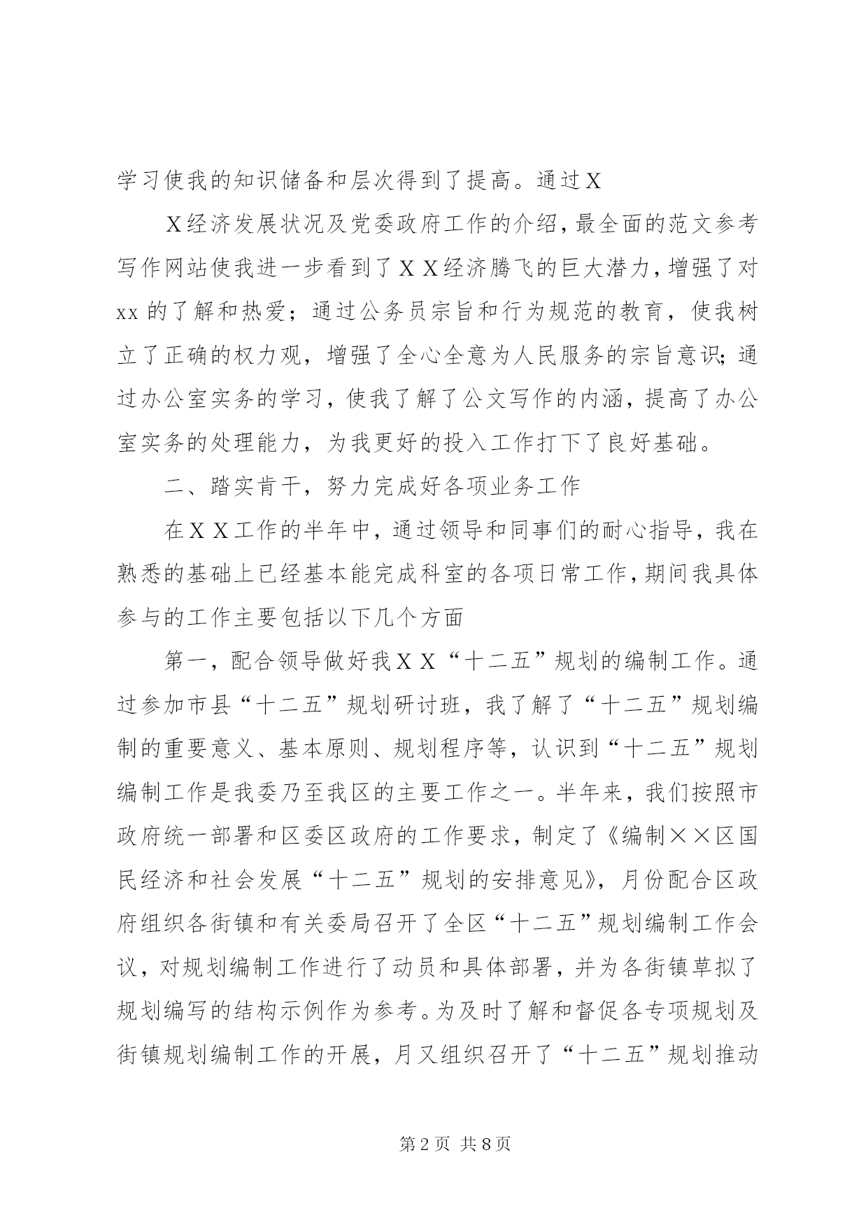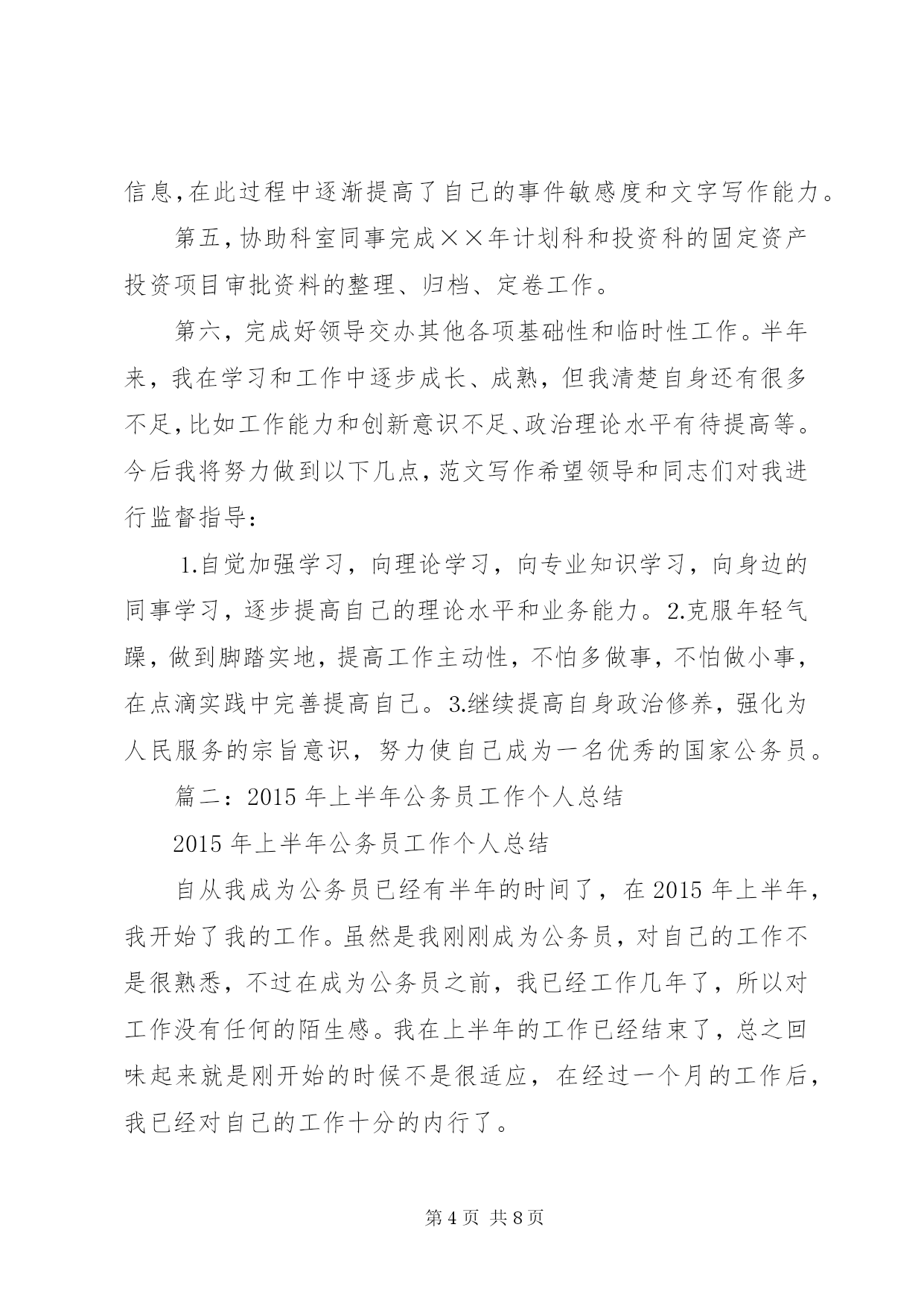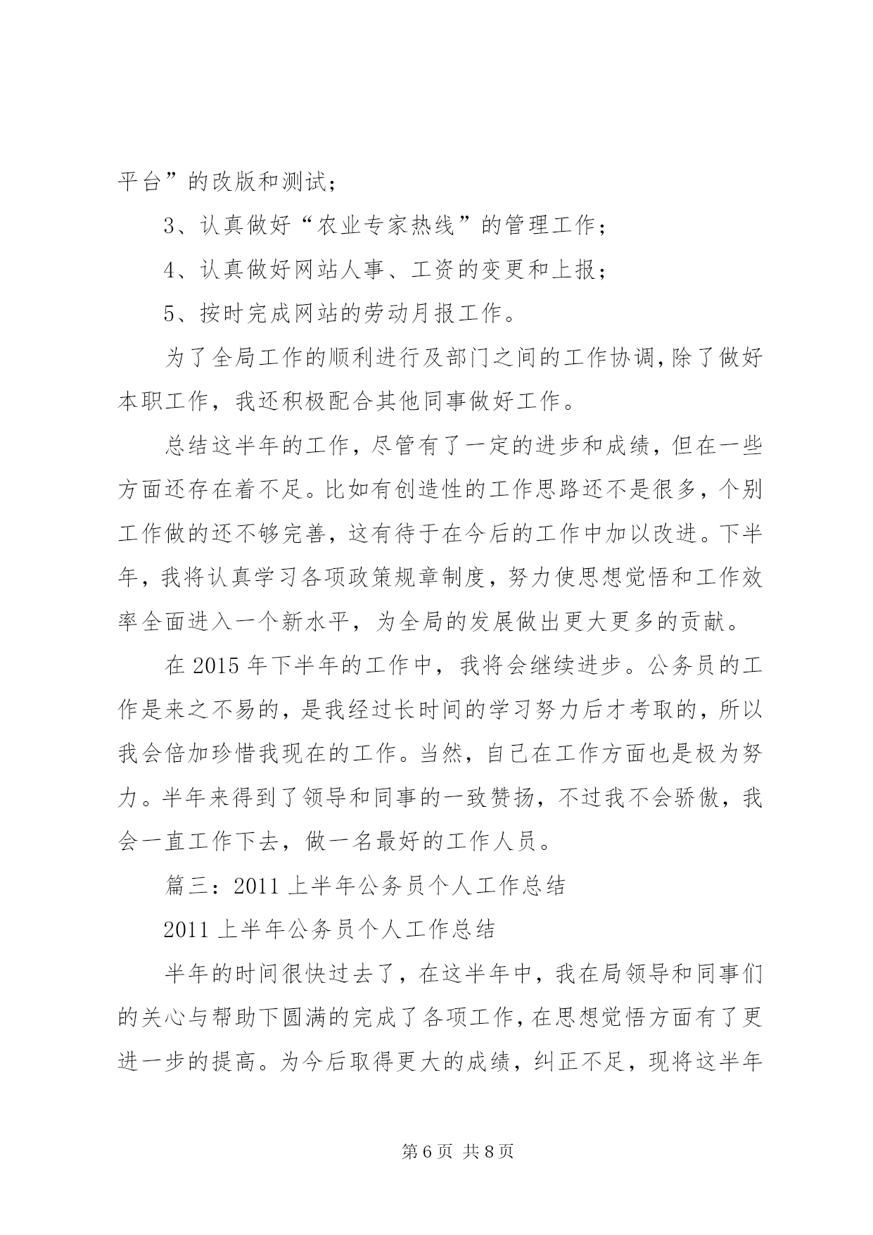 第PAGE\*Arabic\*MERGEFORMAT8页共NUMPAGES\*MERGEFORMAT8页公务员上半年工作总结篇一:公务员半年工作总结公务员半年工作总结转眼我到单位工作已经半年了。这半年是我人生经历中重要的一段,工作期间在领导的培养帮助下、同志们的关心支持下,我逐步完成着从象牙塔到政府机关、从大学生到国家公务员的环境和角色的双重转变和适应。岁首年终,我静心回顾这半年的工作生活,收获颇丰。现将半年来的学习工作情况总结一、加强理论学习,提高个人素质首先,自觉加强政治理论学习,提高党性修养。两委浓厚的政治学习氛围深深的感染着我,我积极参加委内组织的各项学习活动,并注重自学,认真学习了十七届六中全会关于xxxxx的决定等,进一步提高了自己的理论水平与政治素质,保证自己在思想上与党保持高度一致,强化廉洁自律的自觉性。其次,在业务学习方面,我虚心向身边的同事请教,通过多看多听多想多问多做,努力使自己在尽短的时间内熟悉工作环境和内容。同时,我还自觉学习XXXX投资项目备案、核准暂行管理办法、行政许可法等与工作相关的政策、法律常识,积累自己的业务知识。此外,根据组织安排我参加xxxxx公务员初任培训。在为期XXXX的培训生活中,严格的军训磨练了我的意志,丰富的课程学习使我的知识储备和层次得到了提高。通过XX经济发展状况及党委政府工作的介绍,最全面的范文参考写作网站使我进一步看到了XX经济腾飞的巨大潜力,增强了对xx的了解和热爱;通过公务员宗旨和行为规范的教育,使我树立了正确的权力观,增强了全心全意为人民服务的宗旨意识;通过办公室实务的学习,使我了解了公文写作的内涵,提高了办公室实务的处理能力,为我更好的投入工作打下了良好基础。二、踏实肯干,努力完成好各项业务工作在XX工作的半年中,通过领导和同事们的耐心指导,我在熟悉的基础上已经基本能完成科室的各项日常工作,期间我具体参与的工作主要包括以下几个方面第一,配合领导做好我XX“十二五”规划的编制工作。通过参加市县“十二五”规划研讨班,我了解了“十二五”规划编制的重要意义、基本原则、规划程序等,认识到“十二五”规划编制工作是我委乃至我区的主要工作之一。半年来,我们按照市政府统一部署和区委区政府的工作要求,制定了《编制××区国民经济和社会发展“十二五”规划的安排意见》,月份配合区政府组织各街镇和有关委局召开了全区“十二五”规划编制工作会议,对规划编制工作进行了动员和具体部署,并为各街镇草拟了规划编写的结构示例作为参考。为及时了解和督促各专项规划及街镇规划编制工作的开展,月又组织召开了“十二五”规划推动会。范文top100期间,我自觉加强相关知识的学习,密切关注国家及xxx“十二五”规划的政策理论和进展动态,收集学习我xxx及XXX市“十二五”计划的成功经验,为专向规划的编制单位提供依据和素材,同时通过学习调研、听取和参与领导们关于规划的讨论,使我逐渐加深了对我区整体状况的了解,为我处理其他工作奠定了基础。第二,做好全区各类固定资产投资项目的汇总上报工作。今年月份以来,根据市发改委下发的通知要求,我科积极开展工作,布臵并督促各街镇及相关委局进行调查汇报,根据各单位的汇报情况,我们先后对我区汽车零部件企业基本情况和项目情况、工业投资万以上的项目等进行了核实、汇总、筛选、上报。这些工作加深了我对我区固定资产投资状况的了解,同时加强了我区固定资产投资项目的储备,也为我区“十一五”规划提供了强大的项目支撑。第四,配合科室做好各项文字写作和信息报送工作。半年来,我先后参与起草了《××区农村经济工作座谈会议材料》、《××区服务业发展情况汇报材料》、《某科××年工作要点》等多篇文章。我从月份开始担任科室信息员,负责根据科室的重点工作和突出事件撰写信息。在科长的指导下,我先后完成了我区召开“十一五”规划编制工作会议、××项目获得国债资金支持、××项目获得市服务业引导资金支持等多篇信息,在此过程中逐渐提高了自己的事件敏感度和文字写作能力。第五,协助科室同事完成××年计划科和投资科的固定资产投资项目审批资料的整理、归档、定卷工作。第六,完成好领导交办其他各项基础性和临时性工作。半年来,我在学习和工作中逐步成长、成熟,但我清楚自身还有很多不足,比如工作能力和创新意识不足、政治理论水平有待提高等。今后我将努力做到以下几点,范文写作希望领导和同志们对我进行监督指导:⒈自觉加强学习,向理论学习,向专业知识学习,向身边的同事学习,逐步提高自己的理论水平和业务能力。⒉克服年轻气躁,做到脚踏实地,提高工作主动性,不怕多做事,不怕做小事,在点滴实践中完善提高自己。⒊继续提高自身政治修养,强化为人民服务的宗旨意识,努力使自己成为一名优秀的国家公务员。篇二:2015年上半年公务员工作个人总结2015年上