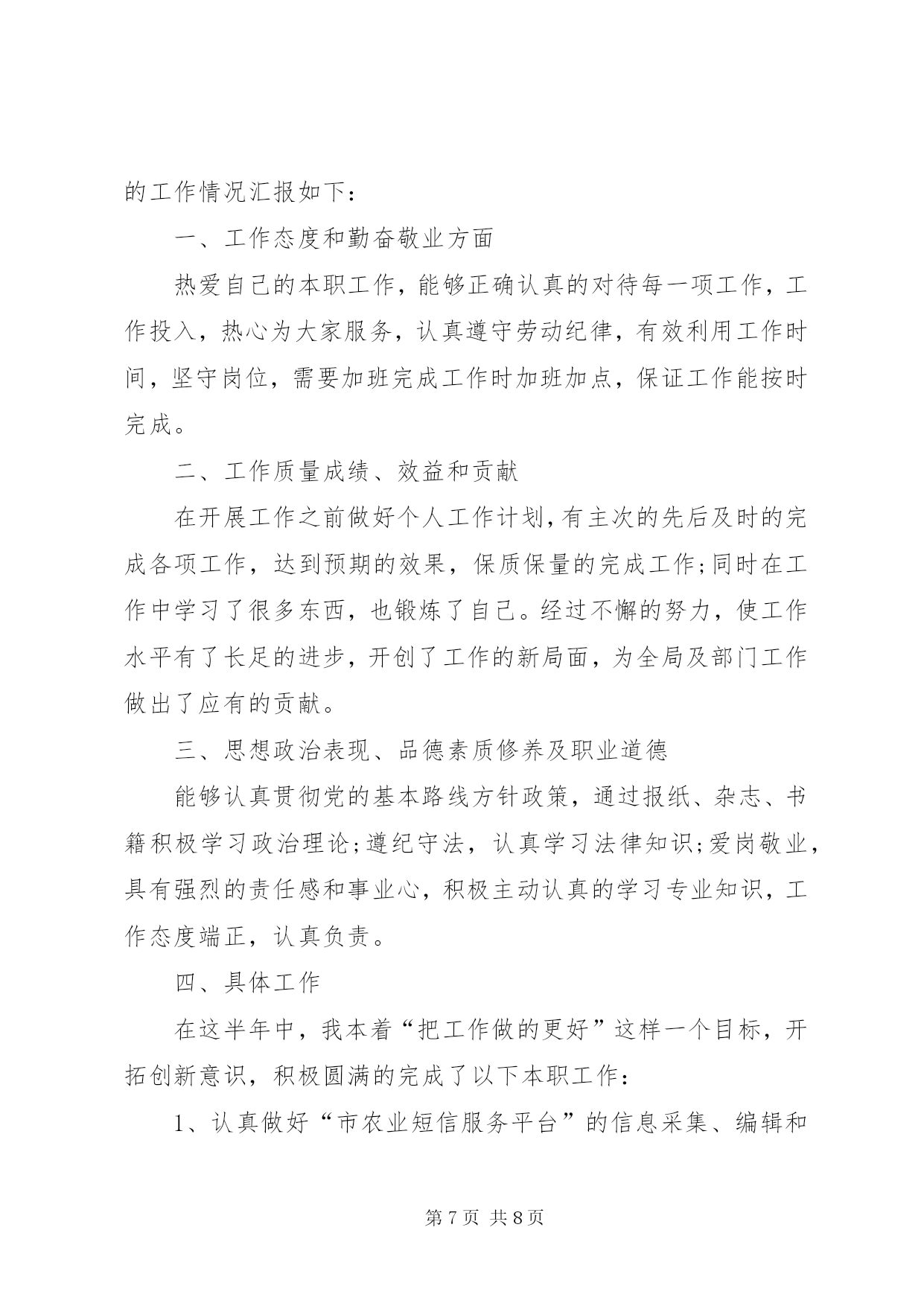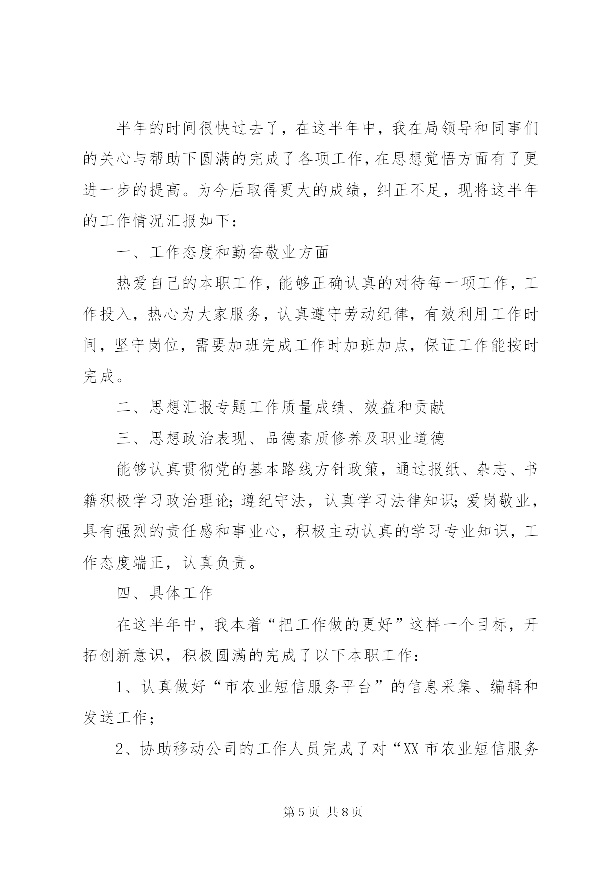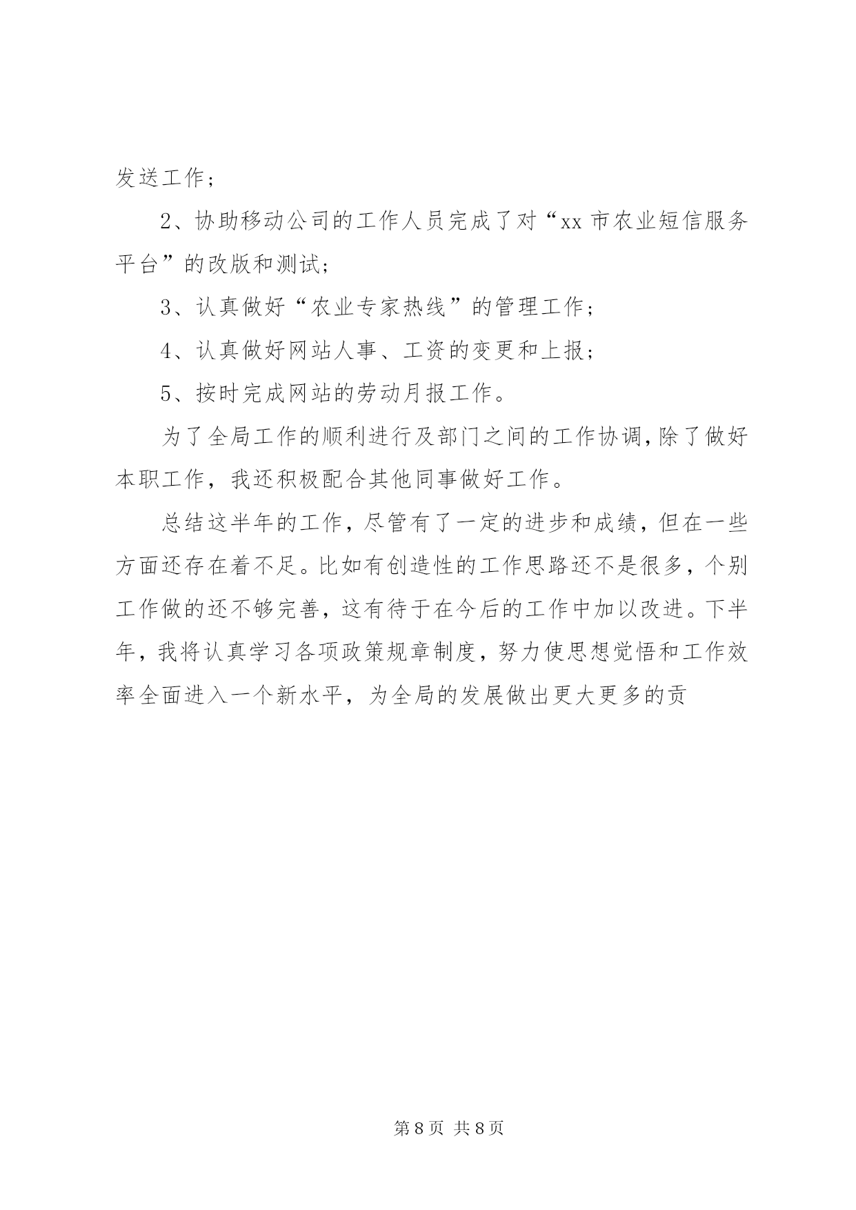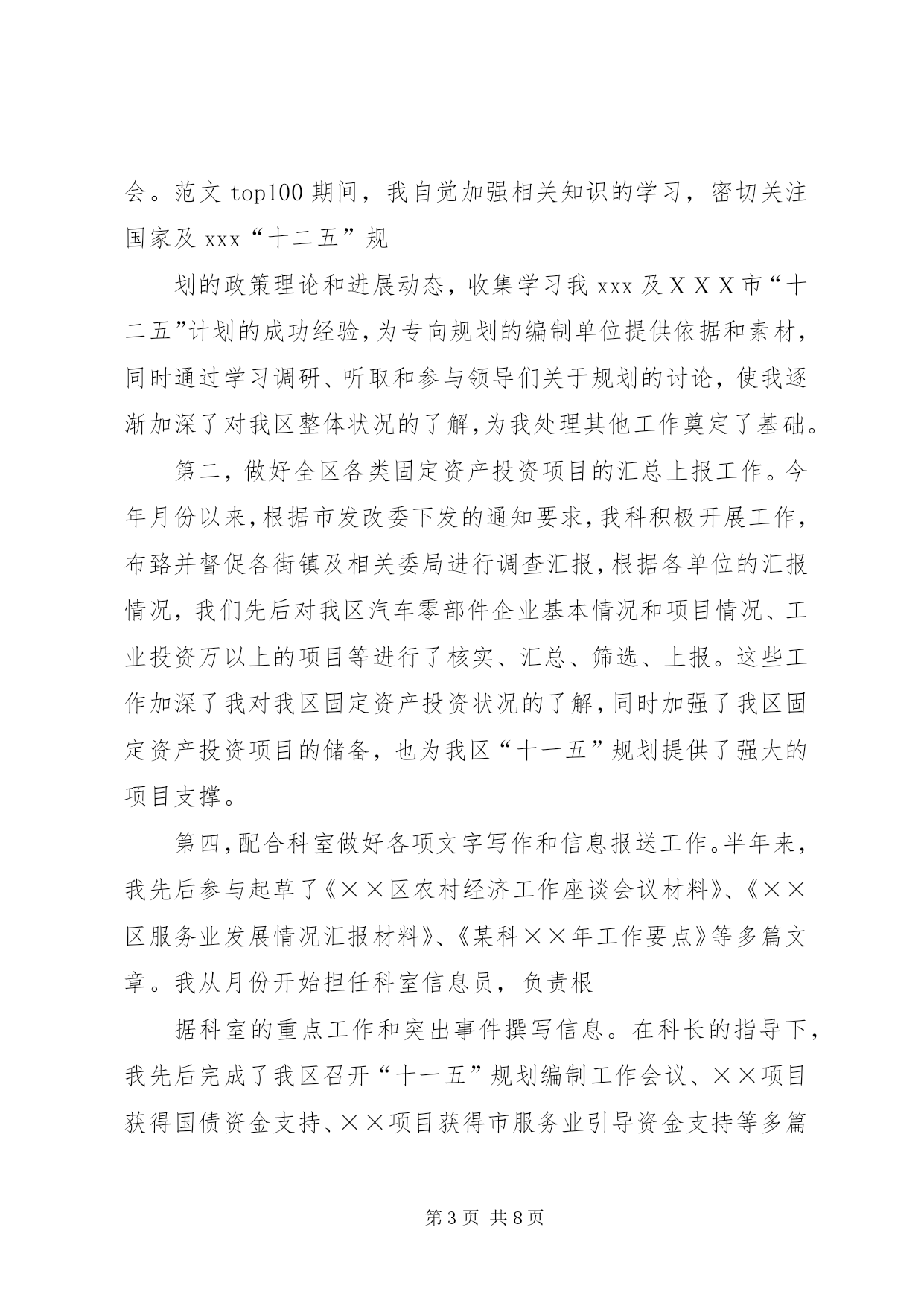 第PAGE\*Arabic\*MERGEFORMAT8页共NUMPAGES\*MERGEFORMAT8页公务员上半年工作总结篇一:公务员半年工作总结公务员半年工作总结转眼我到单位工作已经半年了。这半年是我人生经历中重要的一段,工作期间在领导的培养帮助下、同志们的关心支持下,我逐步完成着从象牙塔到政府机关、从大学生到国家公务员的环境和角色的双重转变和适应。岁首年终,我静心回顾这半年的工作生活,收获颇丰。现将半年来的学习工作情况总结一、加强理论学习,提高个人素质首先,自觉加强政治理论学习,提高党性修养。两委浓厚的政治学习氛围深深的感染着我,我积极参加委内组织的各项学习活动,并注重自学,认真学习了十七届六中全会关于xxxxx的决定等,进一步提高了自己的理论水平与政治素质,保证自己在思想上与党保持高度一致,强化廉洁自律的自觉性。其次,在业务学习方面,我虚心向身边的同事请教,通过多看多听多想多问多做,努力使自己在尽短的时间内熟悉工作环境和内容。同时,我还自觉学习XXXX投资项目备案、核准暂行管理办法、行政许可法等与工作相关的政策、法律常识,积累自己的业务知识。此外,根据组织安排我参加xxxxx公务员初任培训。在为期XXXX的培训生活中,严格的军训磨练了我的意志,丰富的课程学习使我的知识储备和层次得到了提高。通过XX经济发展状况及党委政府工作的介绍,最全面的范文参考写作网站使我进一步看到了XX经济腾飞的巨大潜力,增强了对xx的了解和热爱;通过公务员宗旨和行为规范的教育,使我树立了正确的权力观,增强了全心全意为人民服务的宗旨意识;通过办公室实务的学习,使我了解了公文写作的内涵,提高了办公室实务的处理能力,为我更好的投入工作打下了良好基础。二、踏实肯干,努力完成好各项业务工作在XX工作的半年中,通过领导和同事们的耐心指导,我在熟悉的基础上已经基本能完成科室的各项日常工作,期间我具体参与的工作主要包括以下几个方面第一,配合领导做好我XX“十二五”规划的编制工作。通过参加市县“十二五”规划研讨班,我了解了“十二五”规划编制的重要意义、基本原则、规划程序等,认识到“十二五”规划编制工作是我委乃至我区的主要工作之一。半年来,我们按照市政府统一部署和区委区政府的工作要求,制定了《编制××区国民经济和社会发展“十二五”规划的安排意见》,月份配合区政府组织各街镇和有关委局召开了全区“十二五”规划编制工作会议,对规划编制工作进行了动员和具体部署,并为各街镇草拟了规划编写的结构示例作为参考。为及时了解和督促各专项规划及街镇规划编制工作的开展,月又组织召开了“十二五”规划推动会。范文top100期间,我自觉加强相关知识的学习,密切关注国家及xxx“十二五”规划的政策理论和进展动态,收集学习我xxx及XXX市“十二五”计划的成功经验,为专向规划的编制单位提供依据和素材,同时通过学习调研、听取和参与领导们关于规划的讨论,使我逐渐加深了对我区整体状况的了解,为我处理其他工作奠定了基础。第二,做好全区各类固定资产投资项目的汇总上报工作。今年月份以来,根据市发改委下发的通知要求,我科积极开展工作,布臵并督促各街镇及相关委局进行调查汇报,根据各单位的汇报情况,我们先后对我区汽车零部件企业基本情况和项目情况、工业投资万以上的项目等进行了核实、汇总、筛选、上报。这些工作加深了我对我区固定资产投资状况的了解,同时加强了我区固定资产投资项目的储备,也为我区“十一五”规划提供了强大的项目支撑。第四,配合科室做好各项文字写作和信息报送工作。半年来,我先后参与起草了《××区农村经济工作座谈会议材料》、《××区服务业发展情况汇报材料》、《某科××年工作要点》等多篇文章。我从月份开始担任科室信息员,负责根据科室的重点工作和突出事件撰写信息。在科长的指导下,我先后完成了我区召开“十一五”规划编制工作会议、××项目获得国债资金支持、××项目获得市服务业引导资金支持等多篇信息,在此过程中逐渐提高了自己的事件敏感度和文字写作能力。第五,协助科室同事完成××年计划科和投资科的固定资产投资项目审批资料的整理、归档、定卷工作。第六,完成好领导交办其他各项基础性和临时性工作。半年来,我在学习和工作中逐步成长、成熟,但我清楚自身还有很多不足,比如工作能力和创新意识不足、政治理论水平有待提高等。今后我将努力做到以下几点,范文写作希望领导和同志们对我进行监督指导:⒈自觉加强学习,向理论学习,向专业知识学习,向身边的同事学习,逐步提高自己的理论水平和业务能力。⒉克服年轻气躁,做到脚踏实地,提高工作主动性,不怕多做事,不怕做小事,在点滴实践中完善提高自己。⒊继续提高自身政治修养,强化为人民服务的宗旨意识,努力使自己成为一名优秀的国家公务员。篇二:2015年上半年公务员工作个人总结2015年上