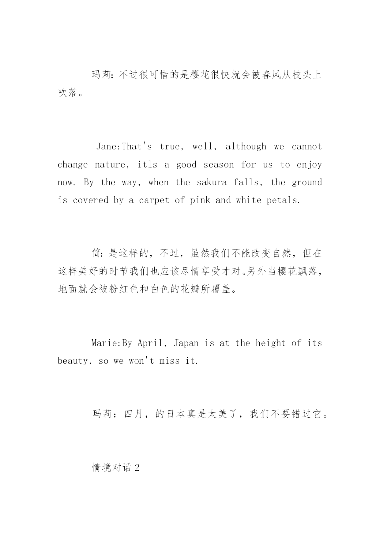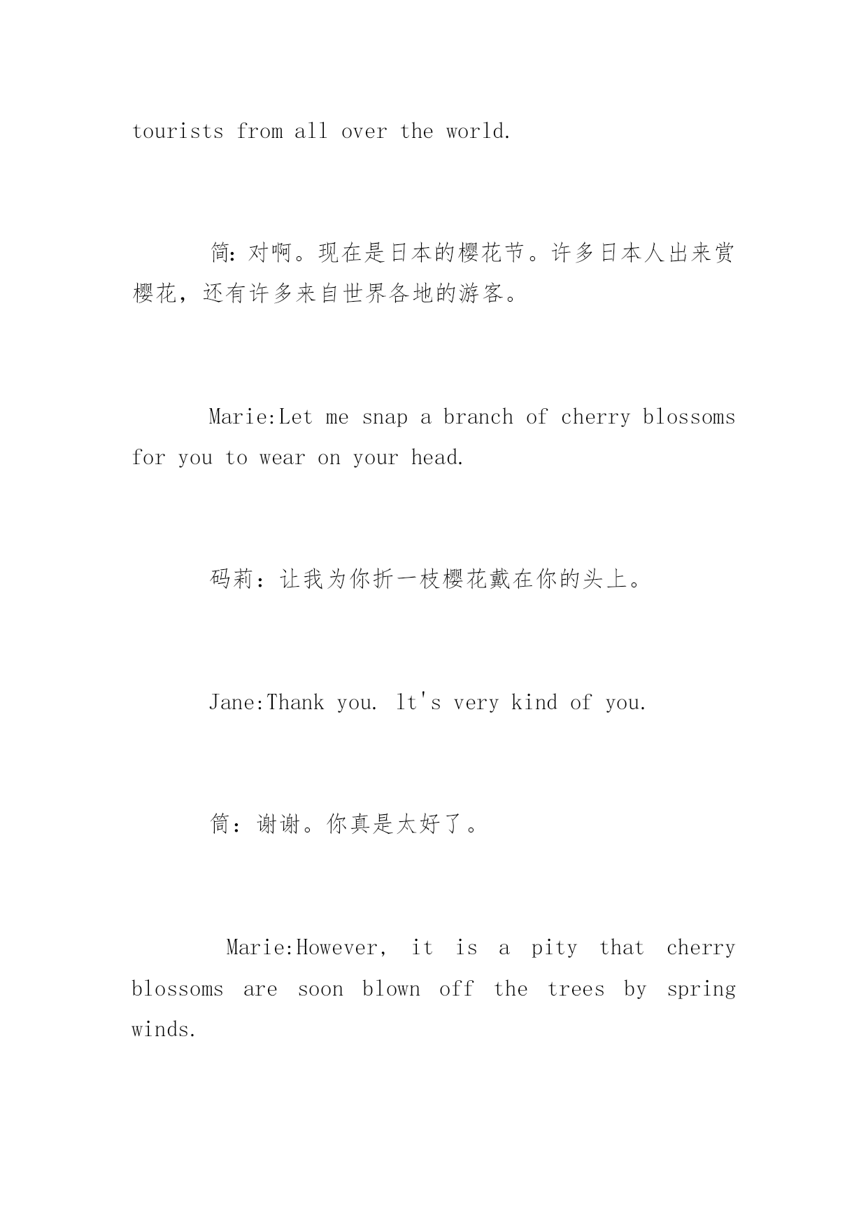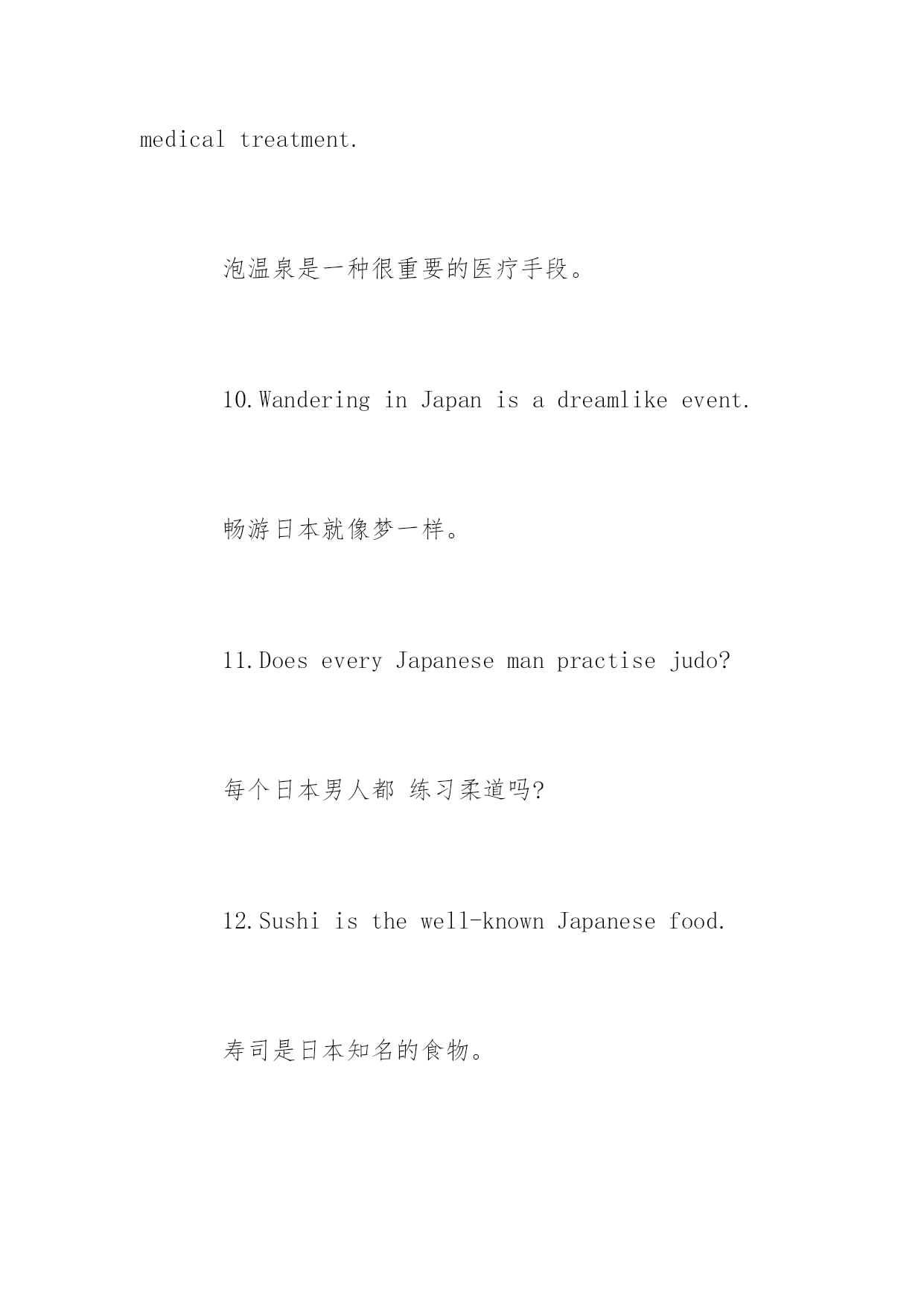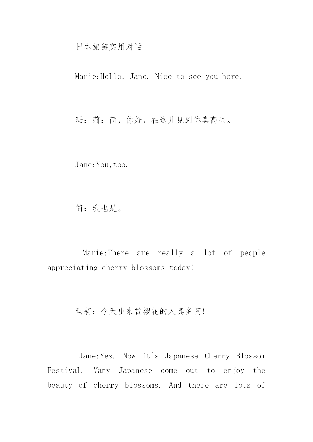 日本旅游口语对话日本旅游实用口语对话准备去日本旅游的朋友,可以看看小编整理的日本旅游实用口语对话,希望对大家有所帮助,更多消息请关注应届毕业生网。日本旅游实用口语UsefulExpressions体验旅游1.Ifyoulikeshopping,youmaychoosetotraveltoJapan.如果你喜欢购物,你可以选择去日本旅游。2.Japanistheheavenofcomicfans.日本是漫画迷的天堂。3.KimonoisthetraditionalcostumeinJapan.和服是日本的传统服饰。4.DidyoueverclimbMountFujiwhenyouwereinJapan?你在日本的时候曾爬过富士山吗?5.CherryblossomismeaningfulinJapaneseculture.樱花在日本文化中意义深远。6.Asacoastalcity,youcanfindmanyvolcanoesinKyoto.作为一个沿海城市,你可以在京都找到很多火山。7.Takingabathinhotspringsisgoodforcuringyourinjury.泡温泉有益于伤后恢复。8.JapansharessomesimilaritywithChinainculture.日本跟中国在文化方面有相似之处。9.Soakinginhotspringisanimportantmedicaltreatment.泡温泉是一种很重要的医疗手段。10.WanderinginJapanisadreamlikeevent.畅游日本就像梦一样。11.DoeseveryJapanesemanpractisejudo?每个日本男人都练习柔道吗?12.Sushiisthewell-knownJapanesefood.寿司是日本知名的食物。日本旅游实用对话Marie:Hello,Jane.Nicetoseeyouhere.玛:莉:简,你好,在这儿见到你真高兴。Jane:You,too.简:我也是。Marie:Therearereallyalotofpeopleappreciatingcherryblossomstoday!玛莉:今天出来赏樱花的人真多啊!Jane:Yes.Nowit'sJapaneseCherryBlossomFestival.ManyJapanesecomeouttoenjoythebeautyofcherryblossoms.Andtherearelotsoftouristsfromallovertheworld.简:对啊。现在是日本的樱花节。许多日本人出来赏樱花,还有许多来自世界各地的游客。Marie:Letmesnapabranchofcherryblossomsforyoutowearonyourhead.码莉:让我为你折一枝樱花戴在你的头上。Jane:Thankyou.lt'sverykindofyou.筒:谢谢。你真是太好了。Marie:However,itisapitythatcherryblossomsaresoonblownoffthetreesbyspringwinds.玛莉:不过很可惜的是樱花很快就会被春风从枝头上吹落。Jane:That'strue,well,althoughwecannotchangenature,itlsagoodseasonforustoenjoynow.Bytheway,whenthesakurafalls,thegroundiscoveredbyacarpetofpinkandwhitepetals.筒:是这样的,不过,虽然我们不能改变自然,但在这样美好的时节我们也应该尽情享受才对。另外当樱花飘落,地面就会被粉红色和白色的花瓣所覆盖。Marie:ByApril,Japanisattheheightofitsbeauty,sowewon'tmissit.玛莉:四月,的日本真是太美了,我们不要错过它。情境对话2TalkingaboutJapan谈论日本Alice:I'veheardsomuchaboutJapan.Isitabeautifulcountry?艾莉丝:我曾听说过许多有关日本的事。这个国家很美吗?Bob:NoteveryonethinksJapanisbeautiful,buttomeitsbeautyisbreathtaking鲍勃:并不是每个人都认为日本美,但对我来说,它的美真是让人叹为观止。Alice:WillyoudescribethegeographyofJapan?艾莉丝:你来描述一下日本的地理状况好吗?Bob:Well,it'sma