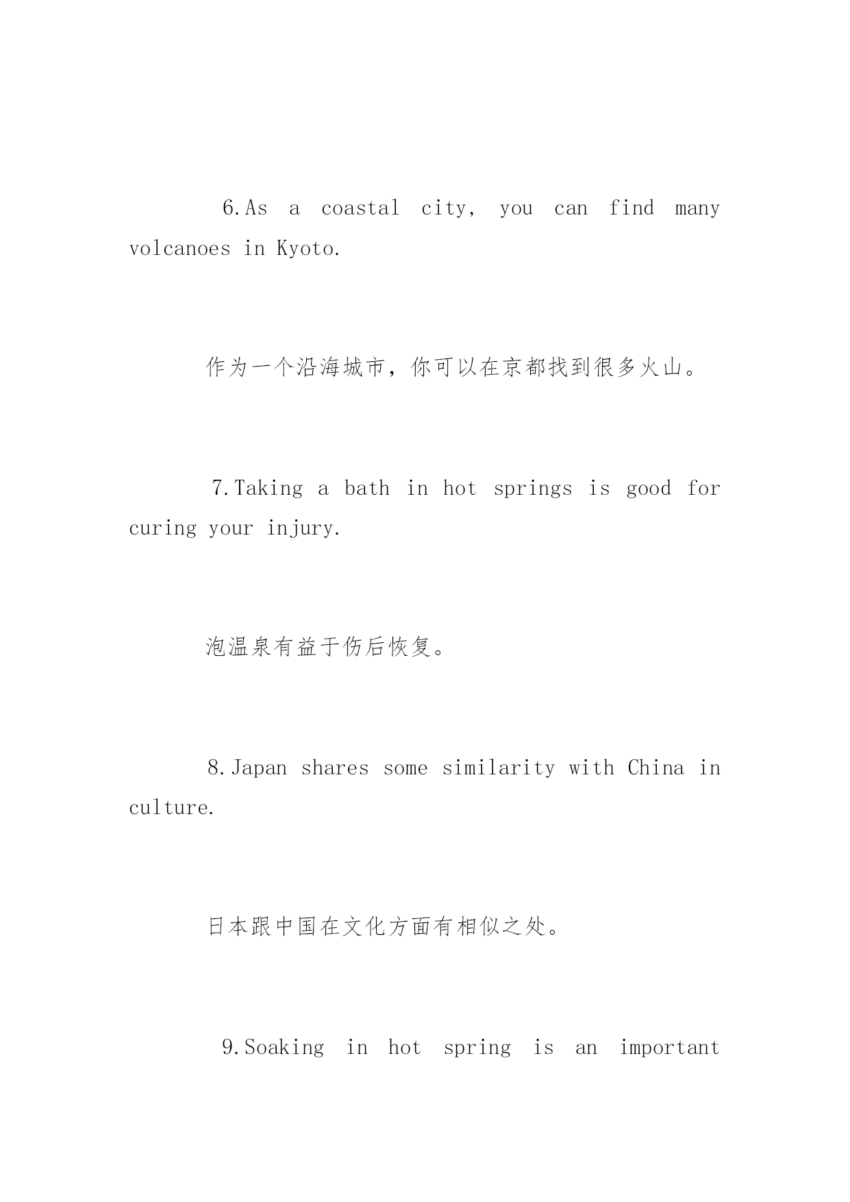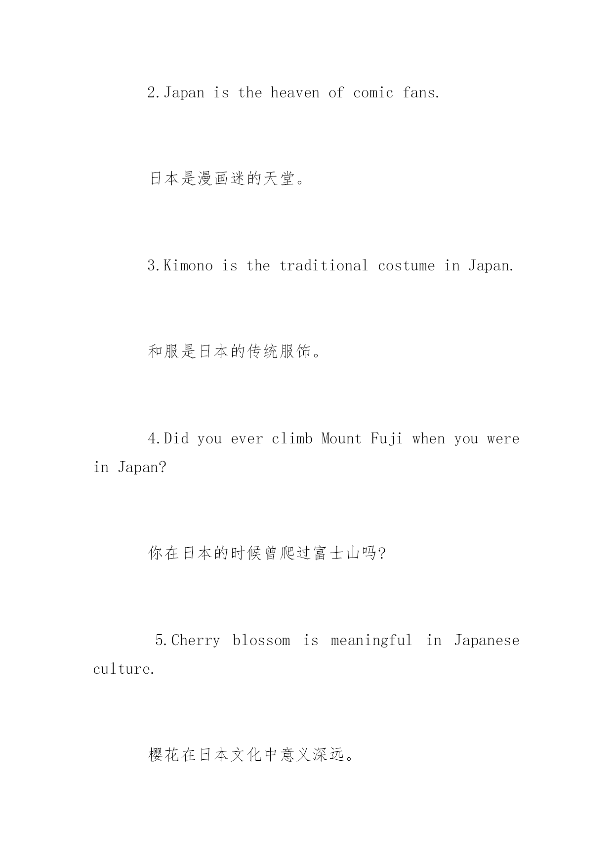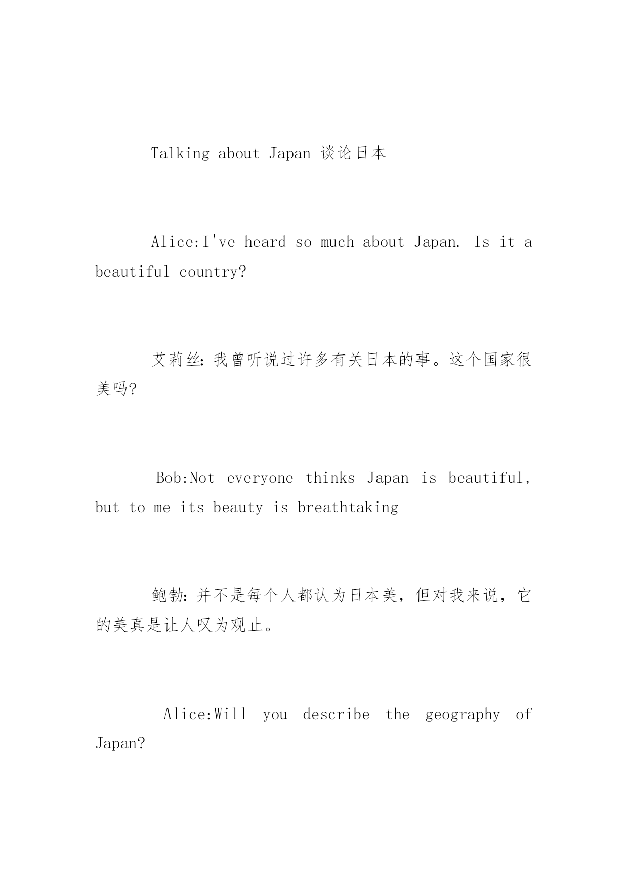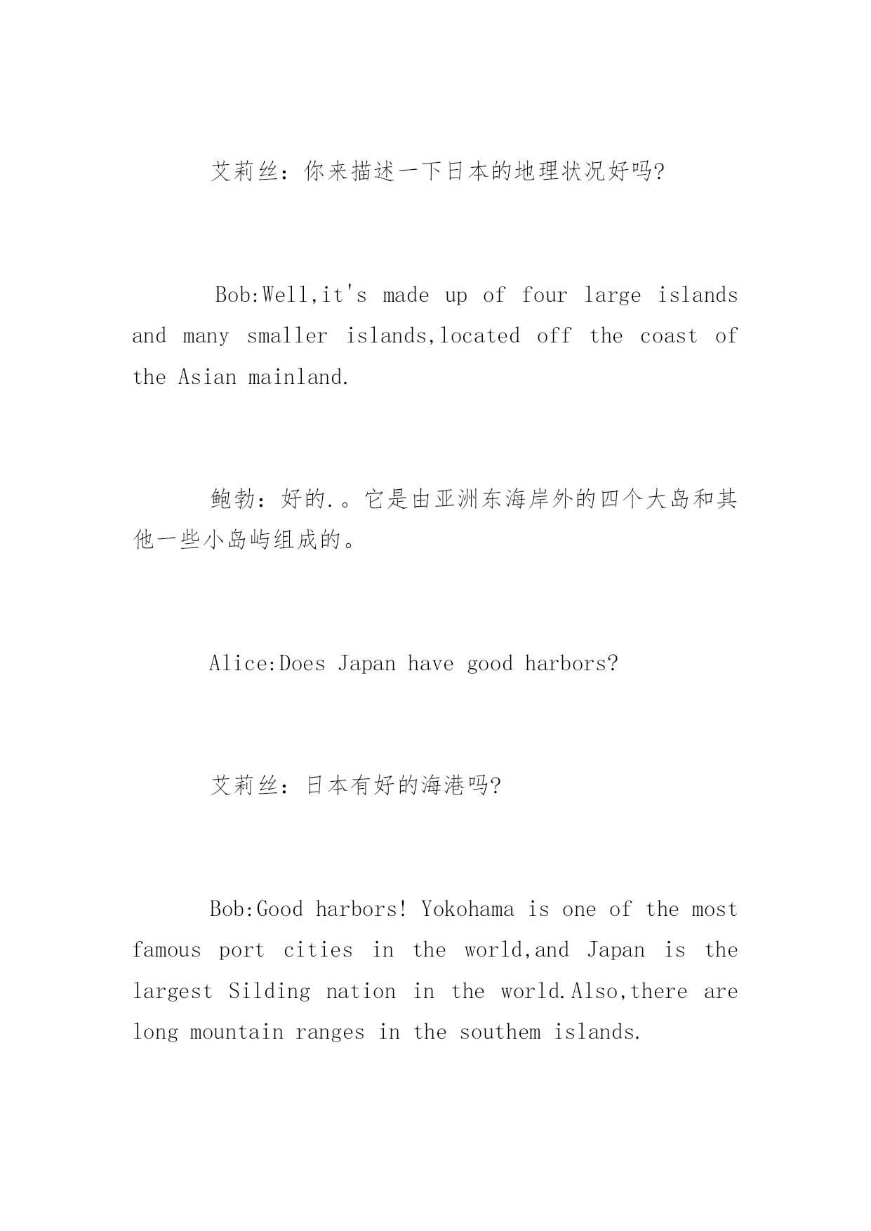 日本旅游口语对话日本旅游实用口语对话准备去日本旅游的朋友,可以看看小编整理的日本旅游实用口语对话,希望对大家有所帮助,更多消息请关注应届毕业生网。日本旅游实用口语UsefulExpressions体验旅游1.Ifyoulikeshopping,youmaychoosetotraveltoJapan.如果你喜欢购物,你可以选择去日本旅游。2.Japanistheheavenofcomicfans.日本是漫画迷的天堂。3.KimonoisthetraditionalcostumeinJapan.和服是日本的传统服饰。4.DidyoueverclimbMountFujiwhenyouwereinJapan?你在日本的时候曾爬过富士山吗?5.CherryblossomismeaningfulinJapaneseculture.樱花在日本文化中意义深远。6.Asacoastalcity,youcanfindmanyvolcanoesinKyoto.作为一个沿海城市,你可以在京都找到很多火山。7.Takingabathinhotspringsisgoodforcuringyourinjury.泡温泉有益于伤后恢复。8.JapansharessomesimilaritywithChinainculture.日本跟中国在文化方面有相似之处。9.Soakinginhotspringisanimportantmedicaltreatment.泡温泉是一种很重要的医疗手段。10.WanderinginJapanisadreamlikeevent.畅游日本就像梦一样。11.DoeseveryJapanesemanpractisejudo?每个日本男人都练习柔道吗?12.Sushiisthewell-knownJapanesefood.寿司是日本知名的食物。日本旅游实用对话Marie:Hello,Jane.Nicetoseeyouhere.玛:莉:简,你好,在这儿见到你真高兴。Jane:You,too.简:我也是。Marie:Therearereallyalotofpeopleappreciatingcherryblossomstoday!玛莉:今天出来赏樱花的人真多啊!Jane:Yes.Nowit'sJapaneseCherryBlossomFestival.ManyJapanesecomeouttoenjoythebeautyofcherryblossoms.Andtherearelotsoftouristsfromallovertheworld.简:对啊。现在是日本的樱花节。许多日本人出来赏樱花,还有许多来自世界各地的游客。Marie:Letmesnapabranchofcherryblossomsforyoutowearonyourhead.码莉:让我为你折一枝樱花戴在你的头上。Jane:Thankyou.lt'sverykindofyou.筒:谢谢。你真是太好了。Marie:However,itisapitythatcherryblossomsaresoonblownoffthetreesbyspringwinds.玛莉:不过很可惜的是樱花很快就会被春风从枝头上吹落。Jane:That'strue,well,althoughwecannotchangenature,itlsagoodseasonforustoenjoynow.Bytheway,whenthesakurafalls,thegroundiscoveredbyacarpetofpinkandwhitepetals.筒:是这样的,不过,虽然我们不能改变自然,但在这样美好的时节我们也应该尽情享受才对。另外当樱花飘落,地面就会被粉红色和白色的花瓣所覆盖。Marie:ByApril,Japanisattheheightofitsbeauty,sowewon'tmissit.玛莉:四月,的日本真是太美了,我们不要错过它。情境对话2TalkingaboutJapan谈论日本Alice:I'veheardsomuchaboutJapan.Isitabeautifulcountry?艾莉丝:我曾听说过许多有关日本的事。这个国家很美吗?Bob:NoteveryonethinksJapanisbeautiful,buttomeitsbeautyisbreathtaking鲍勃:并不是每个人都认为日本美,但对我来说,它的美真是让人叹为观止。Alice:WillyoudescribethegeographyofJapan?艾莉丝:你来描述一下日本的地理状况好吗?Bob:Well,it'sma