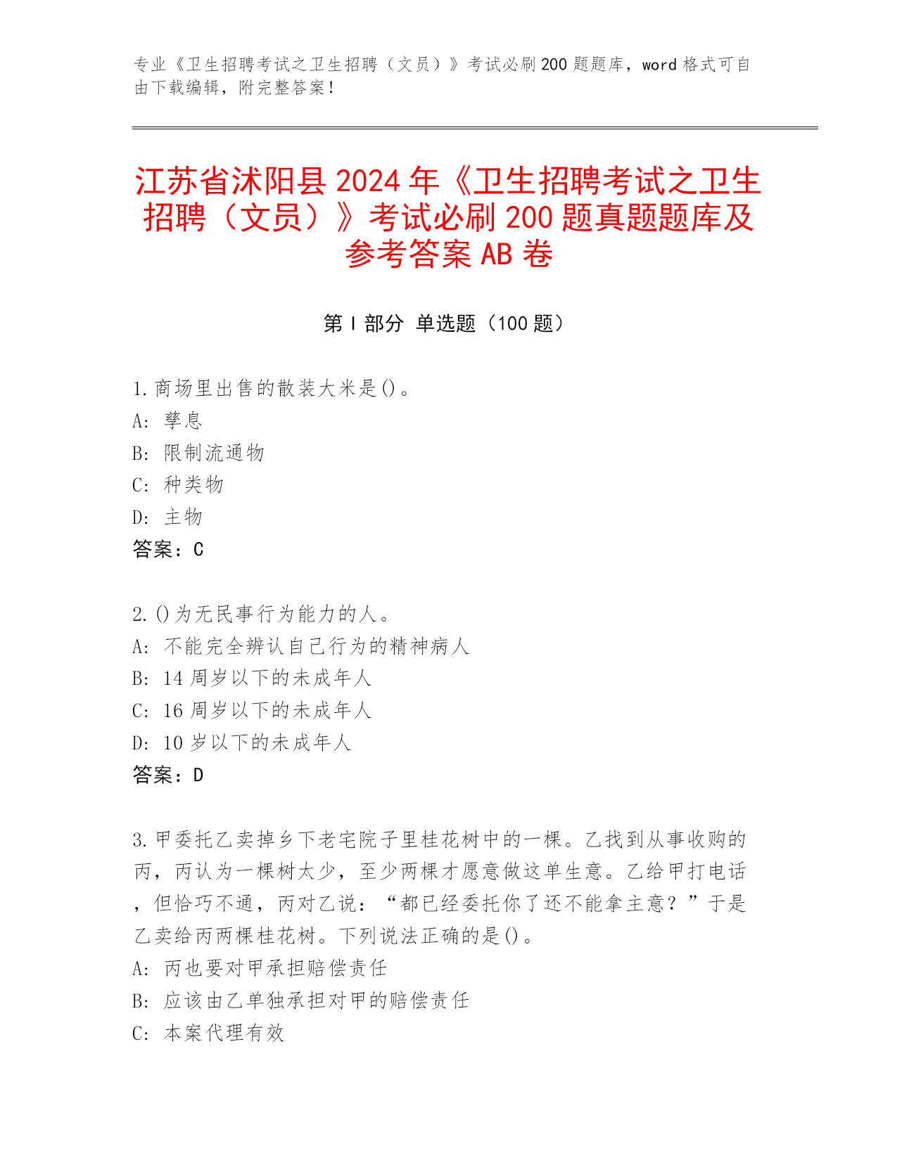 江苏省沭阳县2024年《卫生招聘考试之卫生招聘(文员)》考试必刷200题真题题库及参考答案AB卷