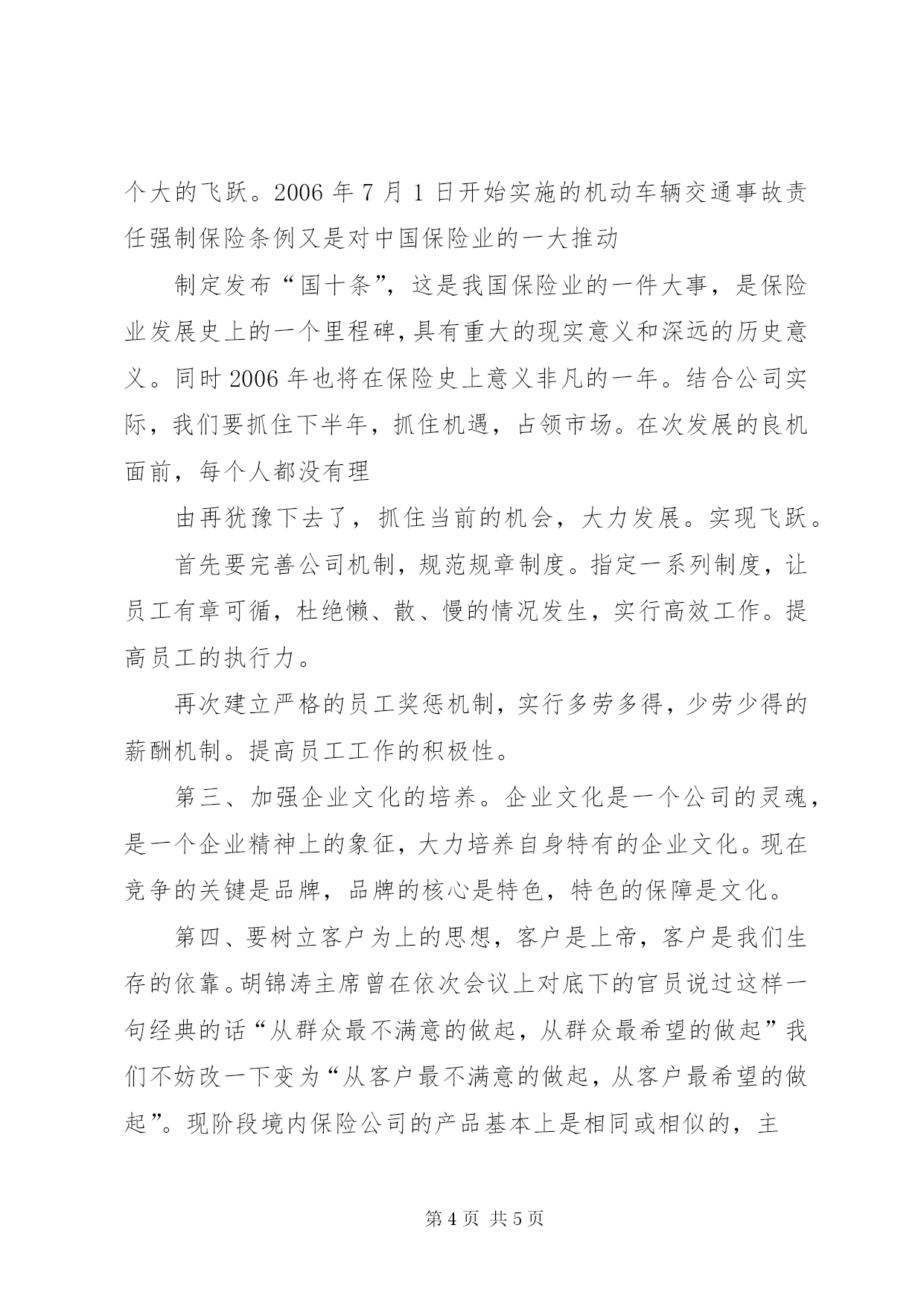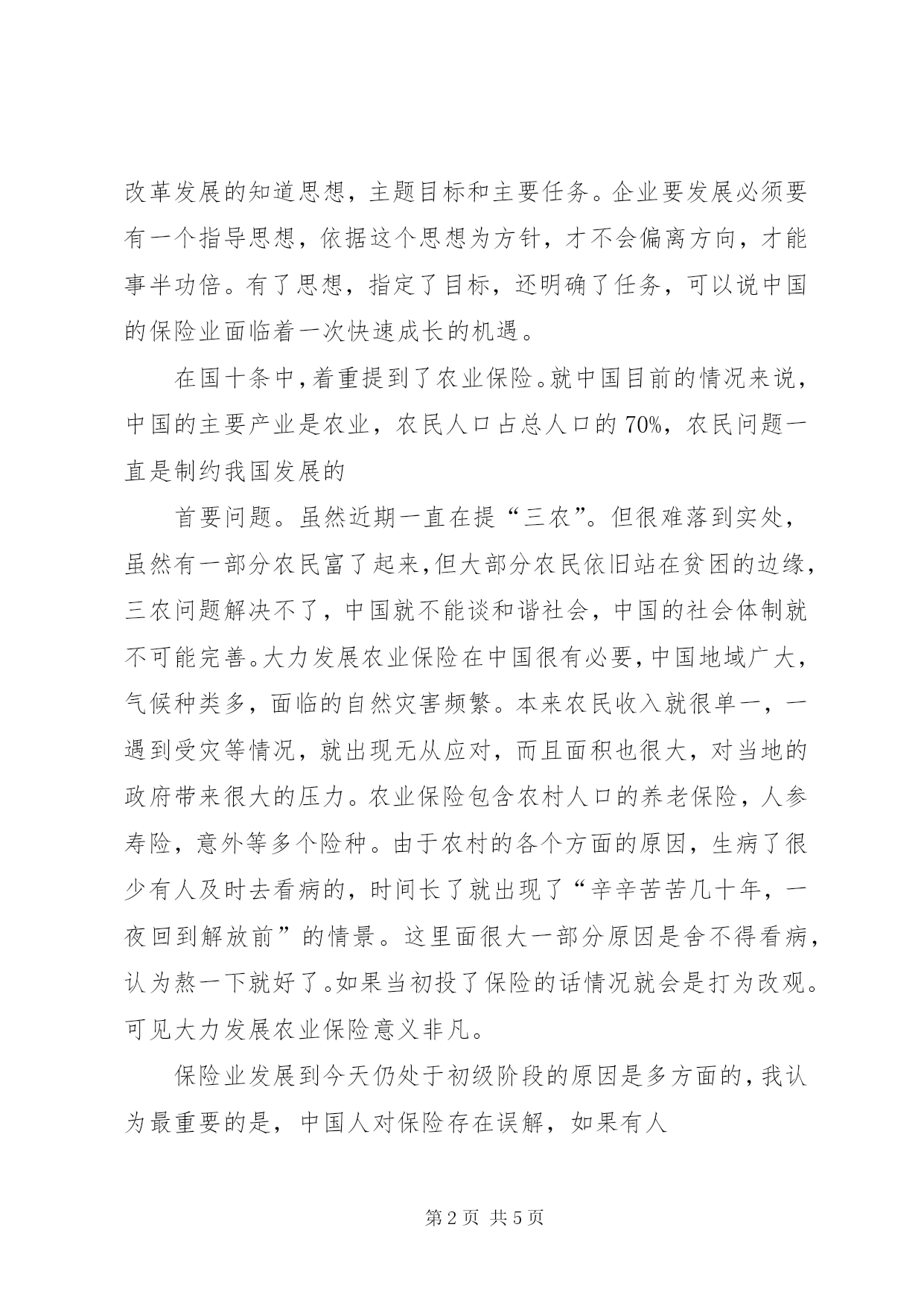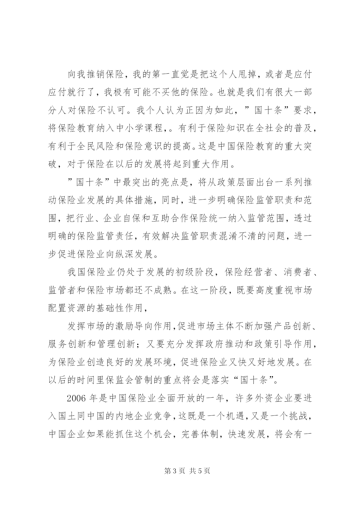 第PAGE\*Arabic\*MERGEFORMAT5页共NUMPAGES\*MERGEFORMAT5页学习保险“国十条”体会保险行业学习“国十条”的心得体会保险行业学习“国十条”的心得体会2007-02-0612:26:49保险行业学习“国十条”的心得体会国十条的出台对保险行业来说是一个很好的机会,保险行业面临着一个快速发展的大好时机,回顾中国保险业发展的这几十年,经历了很多的坎坷,也走了不少的曲折,现在机会终于在中国保险业“千呼万唤”中掀开了序幕。在发达国家,保险业已经渗透到经济的各行各业、社会的各个领域和人们生活的各个方面。一定意义上,保险业的现代化程度是衡量一个国家和地区市场经济发展水平的标志,保险业的发达程度是衡量一个社会进步和谐的标志。在我国人均gdp从1000美元迈向3000美元的关键时期,必须大力发展保险业,为经济社会发展提供全面的风险保障。国十条首先把保险业的意义说明的很透彻,保险行业具有经济补偿,资金融通,和社会管理的功能,是市场经济下的奉贤管理的有限手段,是社会保障的重要组成部分。先阶段中国正处于向市场经济转型的重要阶段,大力发展保险业还对完善社会主义市场经济、构建和谐社会有着重大意义。国十条在明确了保险业的社会意义后就指明、了加快保险业改革发展的知道思想,主题目标和主要任务。企业要发展必须要有一个指导思想,依据这个思想为方针,才不会偏离方向,才能事半功倍。有了思想,指定了目标,还明确了任务,可以说中国的保险业面临着一次快速成长的机遇。在国十条中,着重提到了农业保险。就中国目前的情况来说,中国的主要产业是农业,农民人口占总人口的70%,农民问题一直是制约我国发展的首要问题。虽然近期一直在提“三农”。但很难落到实处,虽然有一部分农民富了起来,但大部分农民依旧站在贫困的边缘,三农问题解决不了,中国就不能谈和谐社会,中国的社会体制就不可能完善。大力发展农业保险在中国很有必要,中国地域广大,气候种类多,面临的自然灾害频繁。本来农民收入就很单一,一遇到受灾等情况,就出现无从应对,而且面积也很大,对当地的政府带来很大的压力。农业保险包含农村人口的养老保险,人参寿险,意外等多个险种。由于农村的各个方面的原因,生病了很少有人及时去看病的,时间长了就出现了“辛辛苦苦几十年,一夜回到解放前”的情景。这里面很大一部分原因是舍不得看病,认为熬一下就好了。如果当初投了保险的话情况就会是打为改观。可见大力发展农业保险意义非凡。保险业发展到今天仍处于初级阶段的原因是多方面的,我认为最重要的是,中国人对保险存在误解,如果有人向我推销保险,我的第一直觉是把这个人甩掉,或者是应付应付就行了,我极有可能不买他的保险。也就是我们有很大一部分人对保险不认可。我个人认为正因为如此,”国十条”要求,将保险教育纳入中小学课程,。有利于保险知识在全社会的普及,有利于全民风险和保险意识的提高。这是中国保险教育的重大突破,对于保险在以后的发展将起到重大作用。”国十条”中最突出的亮点是,将从政策层面出台一系列推动保险业发展的具体措施,同时,进一步明确保险监管职责和范围,把行业、企业自保和互助合作保险统一纳入监管范围,透过明确的保险监管责任,有效解决监管职责混淆不清的问题,进一步促进保险业向纵深发展。我国保险业仍处于发展的初级阶段,保险经营者、消费者、监管者和保险市场都还不成熟。在这一阶段,既要高度重视市场配置资源的基础性作用,发挥市场的激励导向作用,促进市场主体不断加强产品创新、服务创新和管理创新;又要充分发挥政府推动和政策引导作用,为保险业创造良好的发展环境,促进保险业又快又好地发展。在以后的时间里保监会管制的重点将会是落实“国十条”。2006年是中国保险业全面开放的一年,许多外资企业要进入国土同中国的内地企业竞争,这既是一个机遇,又是一个挑战,中国企业如果能抓住这个机会,完善体制,快速发展,将会有一个大的飞跃。2006年7月1日开始实施的机动车辆交通事故责任强制保险条例又是对中国保险业的一大推动制定发布“国十条”,这是我国保险业的一件大事,是保险业发展史上的一个里程碑,具有重大的现实意义和深远的历史意义。同时2006年也将在保险史上意义非凡的一年。结合公司实际,我们要抓住下半年,抓住机遇,占领市场。在次发展的良机面前,每个人都没有理由再犹豫下去了,抓住当前的机会,大力发展。实现飞跃。首先要完善公司机制,规范规章制度。指定一系列制度,让员工有章可循,杜绝懒、散、慢的情况发生,实行高效工作。提高员工的执行力。再次建立严格的员工奖惩机制,实行多劳多得,少劳少得的薪酬机制。提高员工工作的积极性。第三、加强企业文化的培养。企业文化是一个公司的灵魂,是一个企业精神上的象征,大力培养自身特有的企业文化。现在竞争的关键是品牌,品牌的核心是特色,特