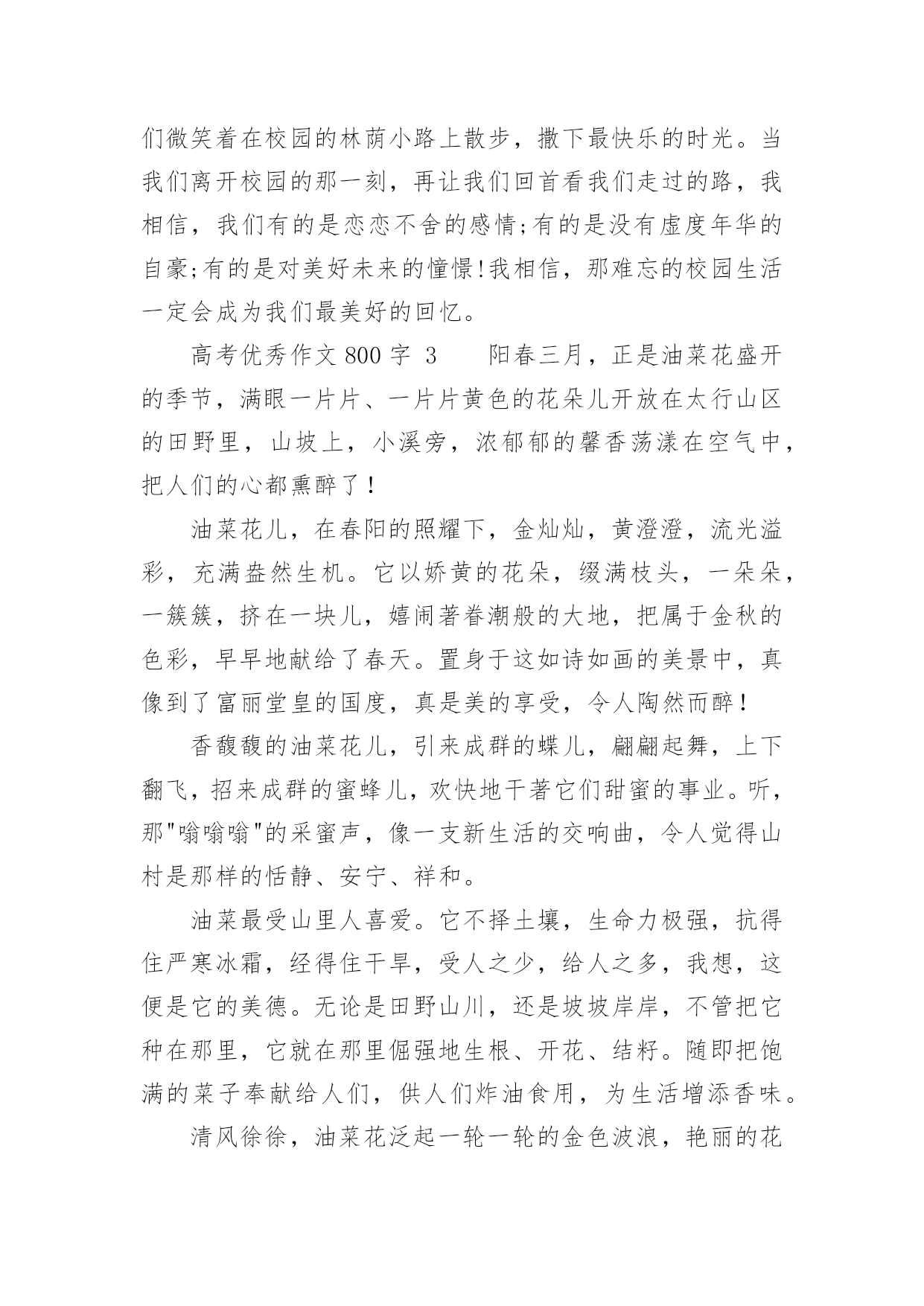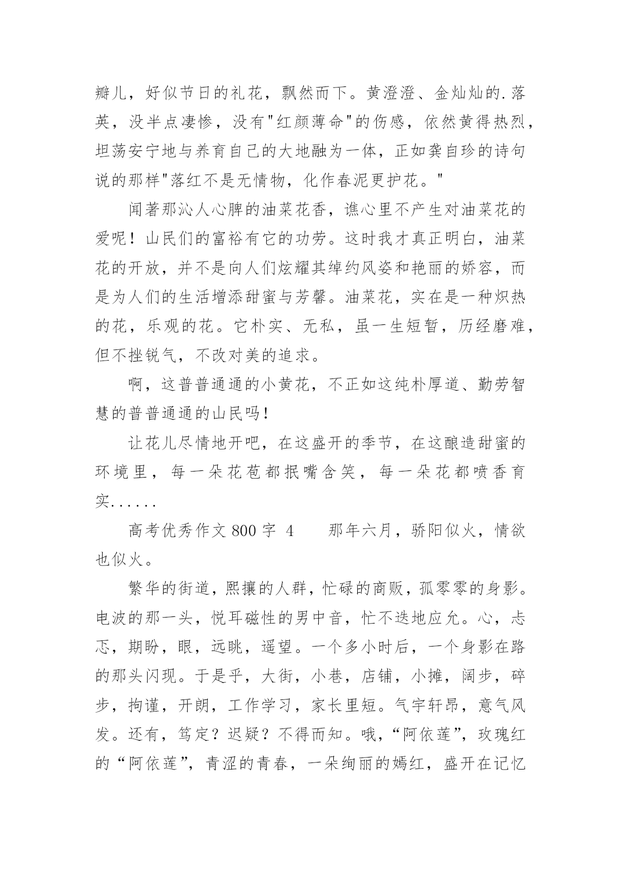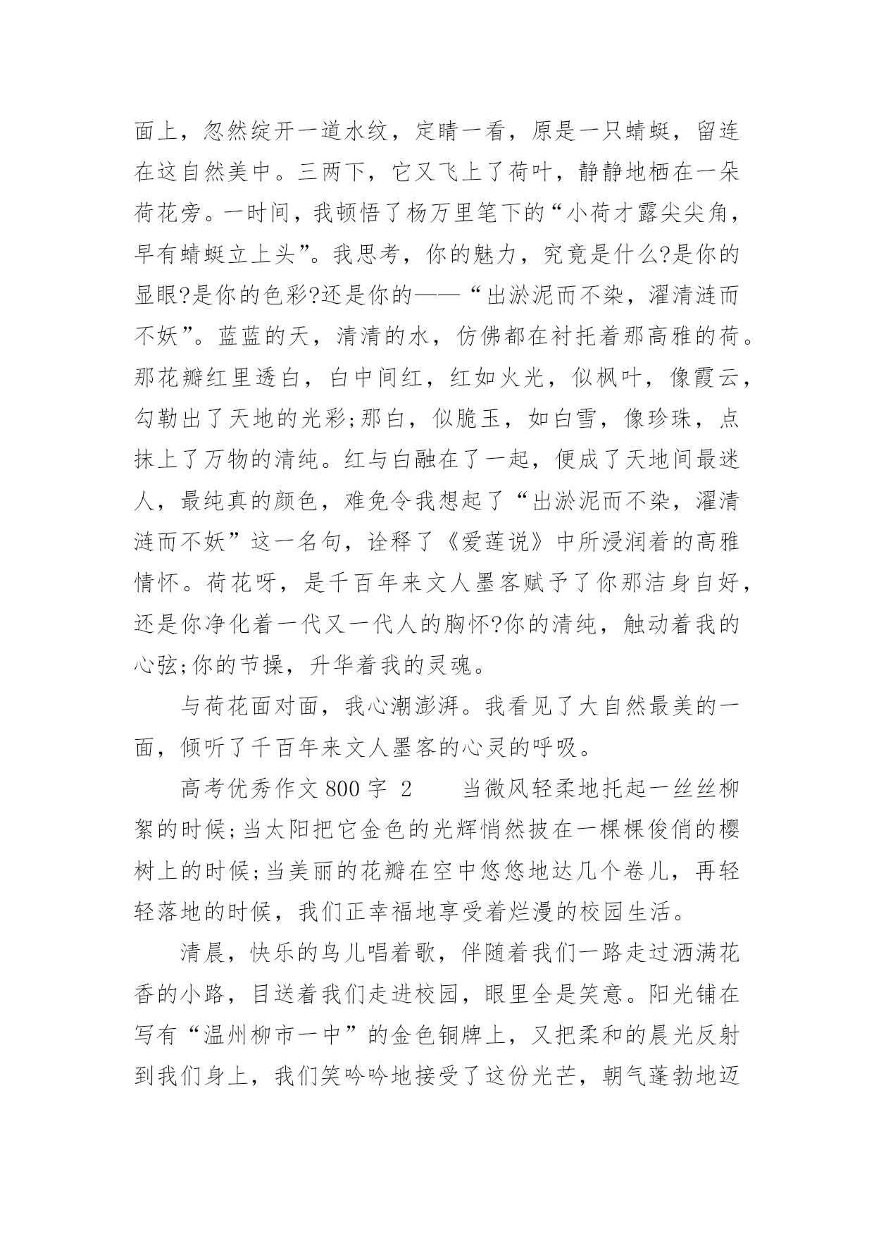 高考优秀作文800字高考优秀作文800字(精选51篇)在平凡的学习、工作、生活中,大家都跟作文打过交道吧,借助作文可以宣泄心中的情感,调节自己的心情。为了让您在写作文时更加简单方便,以下是小编为大家收集的高考优秀作文800字,欢迎阅读与收藏。高考优秀作文800字1我站立在池塘边,面朝着这一池荷花,看到了它的身姿,它的色彩,我心潮澎湃。七八月的风,轻抚着池塘中一片片碧绿的荷花,它们在这池塘中起伏着,映衬着那几朵还没完全绽放的荷花。随着这荷叶的舞动,那荷花的袅娜的身姿仿佛也已在这块碧玉上舞动起来,天地间的神采仿佛都从那花瓣上倾泻出来,流入我的眼中,映在我的心中。那花,仿佛集天地神采于一体,化万物灵气于一身。我直视着那一池荷花,屏住了呼吸,不敢动。怕一动,惊破了这恬静而又安详的梦,只是静静的让大自然的美丽浸入其中。“接天莲叶无穷碧,映日荷花别样红”。面对这一池荷花,我感到它们在对我笑,笑出了霞云的神采,笑出了枫叶的音韵。那白玉般的花瓣上缀着几点红星,似是天地间最深沉的颜色。虽然它们还未绽放,但我仿佛看见了“接天莲叶无穷碧,映日荷花别样红”的场景,感受到了杨万里那难以言语的澎湃心境。荷花呀,是自然将它的美丽给予了你,还是你用自己的美丽装点着自然?“小荷才露尖尖角,早有蜻蜓立上头”。那明镜般的`水面上,忽然绽开一道水纹,定睛一看,原是一只蜻蜓,留连在这自然美中。三两下,它又飞上了荷叶,静静地栖在一朵荷花旁。一时间,我顿悟了杨万里笔下的“小荷才露尖尖角,早有蜻蜓立上头”。我思考,你的魅力,究竟是什么?是你的显眼?是你的色彩?还是你的——“出淤泥而不染,濯清涟而不妖”。蓝蓝的天,清清的水,仿佛都在衬托着那高雅的荷。那花瓣红里透白,白中间红,红如火光,似枫叶,像霞云,勾勒出了天地的光彩;那白,似脆玉,如白雪,像珍珠,点抹上了万物的清纯。红与白融在了一起,便成了天地间最迷人,最纯真的颜色,难免令我想起了“出淤泥而不染,濯清涟而不妖”这一名句,诠释了《爱莲说》中所浸润着的高雅情怀。荷花呀,是千百年来文人墨客赋予了你那洁身自好,还是你净化着一代又一代人的胸怀?你的清纯,触动着我的心弦;你的节操,升华着我的灵魂。与荷花面对面,我心潮澎湃。我看见了大自然最美的一面,倾听了千百年来文人墨客的心灵的呼吸。高考优秀作文800字2当微风轻柔地托起一丝丝柳絮的时候;当太阳把它金色的光辉悄然披在一棵棵俊俏的樱树上的时候;当美丽的花瓣在空中悠悠地达几个卷儿,再轻轻落地的时候,我们正幸福地享受着烂漫的校园生活。清晨,快乐的鸟儿唱着歌,伴随着我们一路走过洒满花香的小路,目送着我们走进校园,眼里全是笑意。阳光铺在写有“温州柳市一中”的金色铜牌上,又把柔和的晨光反射到我们身上,我们笑吟吟地接受了这份光芒,朝气蓬勃地迈进校园,在去教室的路上,我们每天都能看见漂亮的花坛与水池、挺拔的槐书与婀娜的垂柳;我们时常碰见自己的同学或是外班的好伙伴,友好地招一招手,亲热地拍一拍背,亲切地问候两句,聊一聊最近做了些什么。走进洒满晨光的教室,安置好书包与作业,长长地吁一口气,开始一天的学习生活。课堂上,我们尽情地展开我们的才能,大胆地说出自己独到的见解,认真地记好我们要领悟的知识与要点。为了让鸟儿也为我们喝彩,为了让大树也赞许地点头,为了让花儿也为之倾心,让那片片在空中飞舞的花瓣上满载着赞赏与希望的寄语,我们努力着!我们喜欢课间,喜欢那可以让我们自由发挥的十分钟。我们一起谈心来增进彼此之间的友谊,增添那宝贵的心灵财富;我们一起讨论问题来提高彼此的成绩,让自己更加的充实与睿智。有的依傍在栏杆上,凭栏远眺;有的聚集在长廊上,谈笑风生;有的坐在雕塑下,沐浴阳光,享受这最美好的金色年华。我们融入在集体之中,每个班级都是一个家,我们在一起朝夕相处,无不希望自己的“家”能够出类拔萃。因此,我们在运动会上看见了每个运动员那如离弦之箭一般的冲劲,整装待发的气势,战无不胜的决心。我们还看见了一个个拉拉队加油助威的庞大的阵势——有挥舞着双臂的`,有跳起来大声喊的,个个神气活现。我们在学习中成长着,我们在成长中学习着,现在,我们微笑着在校园的林荫小路上散步,撒下最快乐的时光。当我们离开校园的那一刻,再让我们回首看我们走过的路,我相信,我们有的是恋恋不舍的感情;有的是没有虚度年华的自豪;有的是对美好未来的憧憬!我相信,那难忘的校园生活一定会成为我们最美好的回忆。高考优秀作文800字3阳春三月,正是油菜花盛开的季节,满眼一片片、一片片黄色的花朵儿开放在太行山区的田野里,山坡上,小溪旁,浓郁郁的馨香荡漾在空气中,把人们的心都熏醉了!油菜花儿,在春阳的照耀下,金灿灿,黄澄澄,流光溢彩,充满盎然生机。它以娇黄的花朵,缀满枝头,一朵朵,一簇簇,挤在一块儿,嬉闹著眷潮般的大地,把属于金秋的色彩,早早地献给了春天。置身于这如