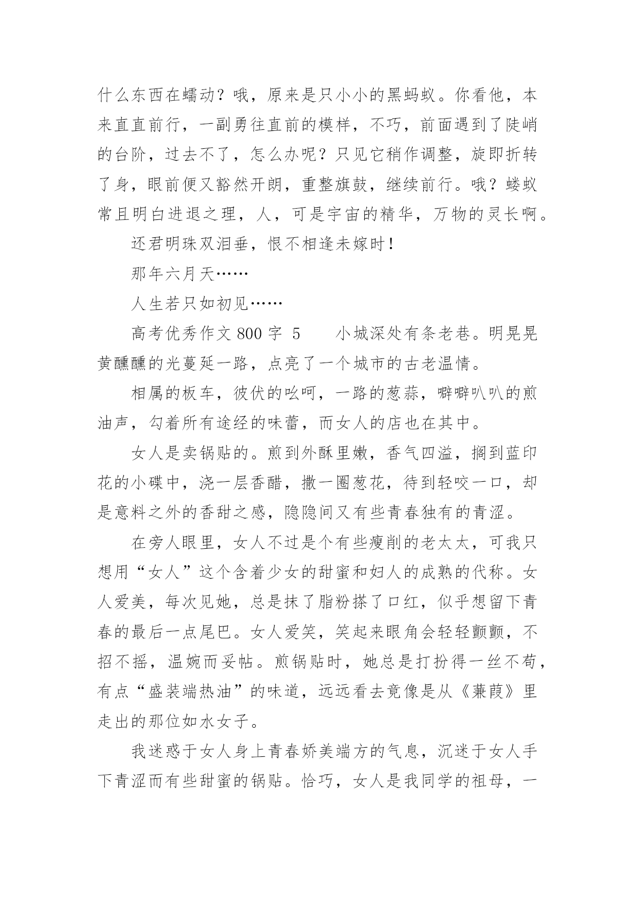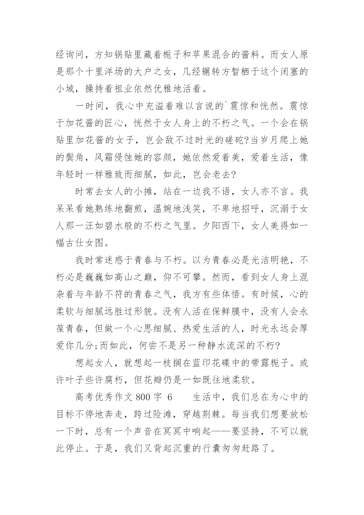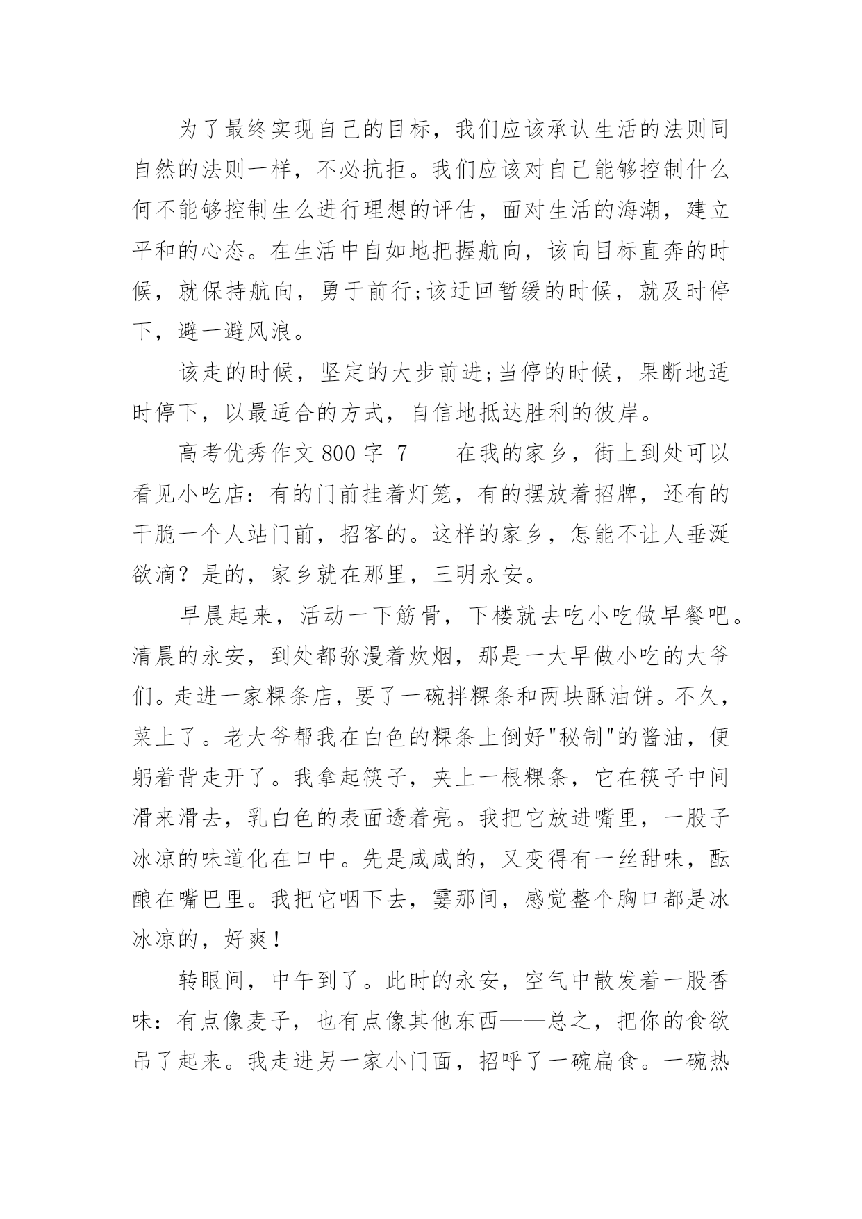 高考优秀作文800字高考优秀作文800字(精选51篇)在平凡的学习、工作、生活中,大家都跟作文打过交道吧,借助作文可以宣泄心中的情感,调节自己的心情。为了让您在写作文时更加简单方便,以下是小编为大家收集的高考优秀作文800字,欢迎阅读与收藏。高考优秀作文800字1我站立在池塘边,面朝着这一池荷花,看到了它的身姿,它的色彩,我心潮澎湃。七八月的风,轻抚着池塘中一片片碧绿的荷花,它们在这池塘中起伏着,映衬着那几朵还没完全绽放的荷花。随着这荷叶的舞动,那荷花的袅娜的身姿仿佛也已在这块碧玉上舞动起来,天地间的神采仿佛都从那花瓣上倾泻出来,流入我的眼中,映在我的心中。那花,仿佛集天地神采于一体,化万物灵气于一身。我直视着那一池荷花,屏住了呼吸,不敢动。怕一动,惊破了这恬静而又安详的梦,只是静静的让大自然的美丽浸入其中。“接天莲叶无穷碧,映日荷花别样红”。面对这一池荷花,我感到它们在对我笑,笑出了霞云的神采,笑出了枫叶的音韵。那白玉般的花瓣上缀着几点红星,似是天地间最深沉的颜色。虽然它们还未绽放,但我仿佛看见了“接天莲叶无穷碧,映日荷花别样红”的场景,感受到了杨万里那难以言语的澎湃心境。荷花呀,是自然将它的美丽给予了你,还是你用自己的美丽装点着自然?“小荷才露尖尖角,早有蜻蜓立上头”。那明镜般的`水面上,忽然绽开一道水纹,定睛一看,原是一只蜻蜓,留连在这自然美中。三两下,它又飞上了荷叶,静静地栖在一朵荷花旁。一时间,我顿悟了杨万里笔下的“小荷才露尖尖角,早有蜻蜓立上头”。我思考,你的魅力,究竟是什么?是你的显眼?是你的色彩?还是你的——“出淤泥而不染,濯清涟而不妖”。蓝蓝的天,清清的水,仿佛都在衬托着那高雅的荷。那花瓣红里透白,白中间红,红如火光,似枫叶,像霞云,勾勒出了天地的光彩;那白,似脆玉,如白雪,像珍珠,点抹上了万物的清纯。红与白融在了一起,便成了天地间最迷人,最纯真的颜色,难免令我想起了“出淤泥而不染,濯清涟而不妖”这一名句,诠释了《爱莲说》中所浸润着的高雅情怀。荷花呀,是千百年来文人墨客赋予了你那洁身自好,还是你净化着一代又一代人的胸怀?你的清纯,触动着我的心弦;你的节操,升华着我的灵魂。与荷花面对面,我心潮澎湃。我看见了大自然最美的一面,倾听了千百年来文人墨客的心灵的呼吸。高考优秀作文800字2当微风轻柔地托起一丝丝柳絮的时候;当太阳把它金色的光辉悄然披在一棵棵俊俏的樱树上的时候;当美丽的花瓣在空中悠悠地达几个卷儿,再轻轻落地的时候,我们正幸福地享受着烂漫的校园生活。清晨,快乐的鸟儿唱着歌,伴随着我们一路走过洒满花香的小路,目送着我们走进校园,眼里全是笑意。阳光铺在写有“温州柳市一中”的金色铜牌上,又把柔和的晨光反射到我们身上,我们笑吟吟地接受了这份光芒,朝气蓬勃地迈进校园,在去教室的路上,我们每天都能看见漂亮的花坛与水池、挺拔的槐书与婀娜的垂柳;我们时常碰见自己的同学或是外班的好伙伴,友好地招一招手,亲热地拍一拍背,亲切地问候两句,聊一聊最近做了些什么。走进洒满晨光的教室,安置好书包与作业,长长地吁一口气,开始一天的学习生活。课堂上,我们尽情地展开我们的才能,大胆地说出自己独到的见解,认真地记好我们要领悟的知识与要点。为了让鸟儿也为我们喝彩,为了让大树也赞许地点头,为了让花儿也为之倾心,让那片片在空中飞舞的花瓣上满载着赞赏与希望的寄语,我们努力着!我们喜欢课间,喜欢那可以让我们自由发挥的十分钟。我们一起谈心来增进彼此之间的友谊,增添那宝贵的心灵财富;我们一起讨论问题来提高彼此的成绩,让自己更加的充实与睿智。有的依傍在栏杆上,凭栏远眺;有的聚集在长廊上,谈笑风生;有的坐在雕塑下,沐浴阳光,享受这最美好的金色年华。我们融入在集体之中,每个班级都是一个家,我们在一起朝夕相处,无不希望自己的“家”能够出类拔萃。因此,我们在运动会上看见了每个运动员那如离弦之箭一般的冲劲,整装待发的气势,战无不胜的决心。我们还看见了一个个拉拉队加油助威的庞大的阵势——有挥舞着双臂的`,有跳起来大声喊的,个个神气活现。我们在学习中成长着,我们在成长中学习着,现在,我们微笑着在校园的林荫小路上散步,撒下最快乐的时光。当我们离开校园的那一刻,再让我们回首看我们走过的路,我相信,我们有的是恋恋不舍的感情;有的是没有虚度年华的自豪;有的是对美好未来的憧憬!我相信,那难忘的校园生活一定会成为我们最美好的回忆。高考优秀作文800字3阳春三月,正是油菜花盛开的季节,满眼一片片、一片片黄色的花朵儿开放在太行山区的田野里,山坡上,小溪旁,浓郁郁的馨香荡漾在空气中,把人们的心都熏醉了!油菜花儿,在春阳的照耀下,金灿灿,黄澄澄,流光溢彩,充满盎然生机。它以娇黄的花朵,缀满枝头,一朵朵,一簇簇,挤在一块儿,嬉闹著眷潮般的大地,把属于金秋的色彩,早早地献给了春天。置身于这如