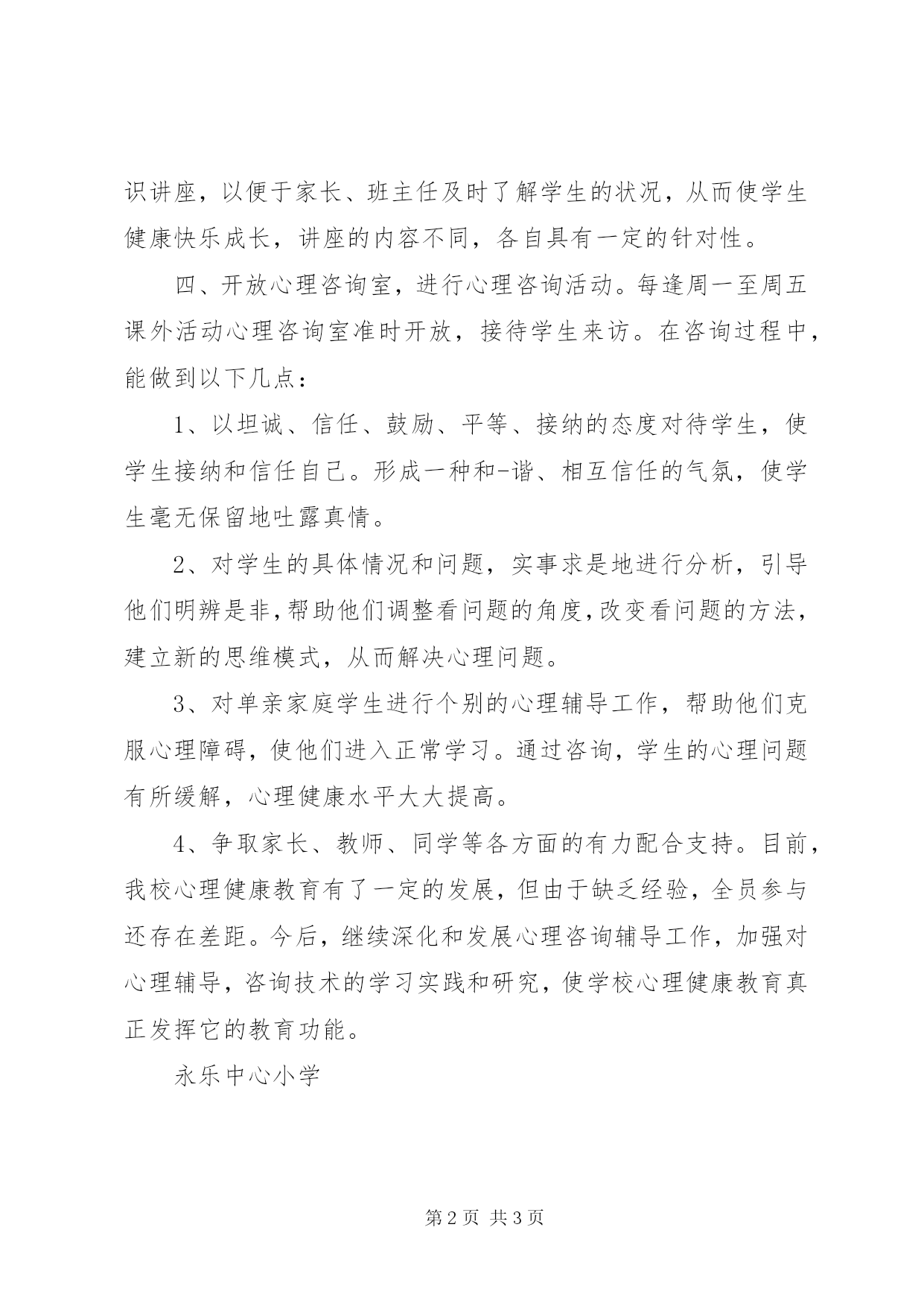 第PAGE\*Arabic\*MERGEFORMAT3页共NUMPAGES\*MERGEFORMAT3页小学心理咨询室年度工作总结心理咨询室工作总结在大力倡导素质教育的今天,学校除了给学生传授知识外,更应是一个帮助学生认识自我、发展潜能、学习解决问题和提升人际沟通等能力的地方,学校心理咨询室作为学校的一个部门将致力于支持、配合学校、老师、家长帮助学生适应、改善及解决在学校、家庭、或成长方面的心理问题,让学生能发展潜能,尽显所长。本学期,从总的情况来看学生心理工作已经开展起来,大体态势良好,学生心理普遍得到大水平的提高。但是,由于心理健康教育开展时间不久,心理健康教育的经验不足,相当一部分学生的心理仍然处于亚健康水平。现就本学年,心理咨询室在这方面的工作情况做出如下总结。一、心理咨询室得到学校领导的大力支持室内环境优雅、温馨、舒适。在这里,学生可以敞开心扉,吐露心声,把来时的郁闷一扫而光。二、心理咨询室老师不仅具有一定专业知识,也是学校的班主任,对学生心理非常了解,具有丰富的工作经验,而且工作认真细致,观察缜密,善于发现学生中存在的问题,及时作好学生的心理疏导工作。三、心理咨询室安排了面向全校家长、班主任的心理健康知识讲座,以便于家长、班主任及时了解学生的状况,从而使学生健康快乐成长,讲座的内容不同,各自具有一定的针对性。四、开放心理咨询室,进行心理咨询活动。每逢周一至周五课外活动心理咨询室准时开放,接待学生来访。在咨询过程中,能做到以下几点:1、以坦诚、信任、鼓励、平等、接纳的态度对待学生,使学生接纳和信任自己。形成一种和-谐、相互信任的气氛,使学生毫无保留地吐露真情。2、对学生的具体情况和问题,实事求是地进行分析,引导他们明辨是非,帮助他们调整看问题的角度,改变看问题的方法,建立新的思维模式,从而解决心理问题。3、对单亲家庭学生进行个别的心理辅导工作,帮助他们克服心理障碍,使他们进入正常学习。通过咨询,学生的心理问题有所缓解,心理健康水平大大提高。4、争取家长、教师、同学等各方面的有力配合支持。目前,我校心理健康教育有了一定的发展,但由于缺乏经验,全员参与还存在差距。今后,继续深化和发展心理咨询辅导工作,加强对心理辅导,咨询技术的学习实践和研究,使学校心理健康教育真正发挥它的教育功能。永乐中心小学2016.7