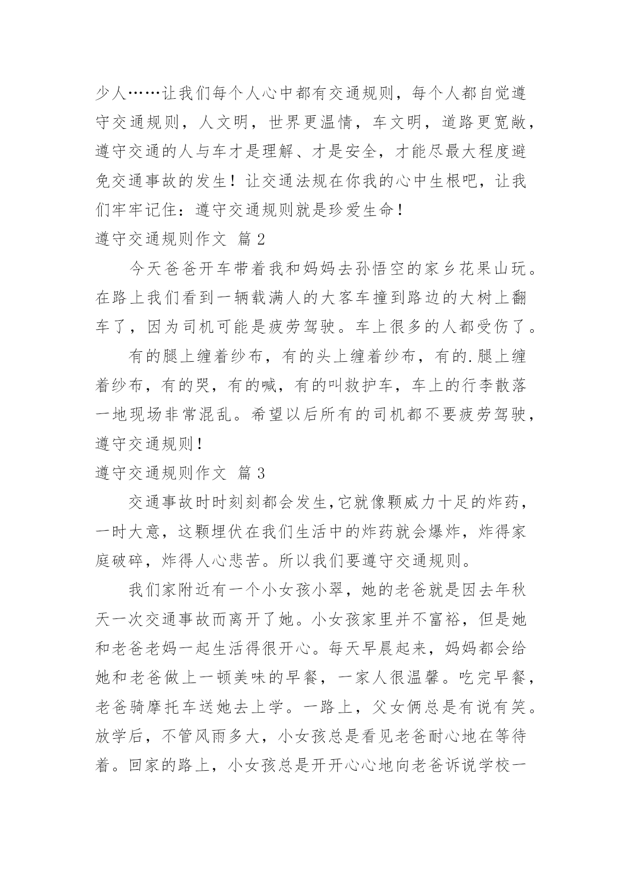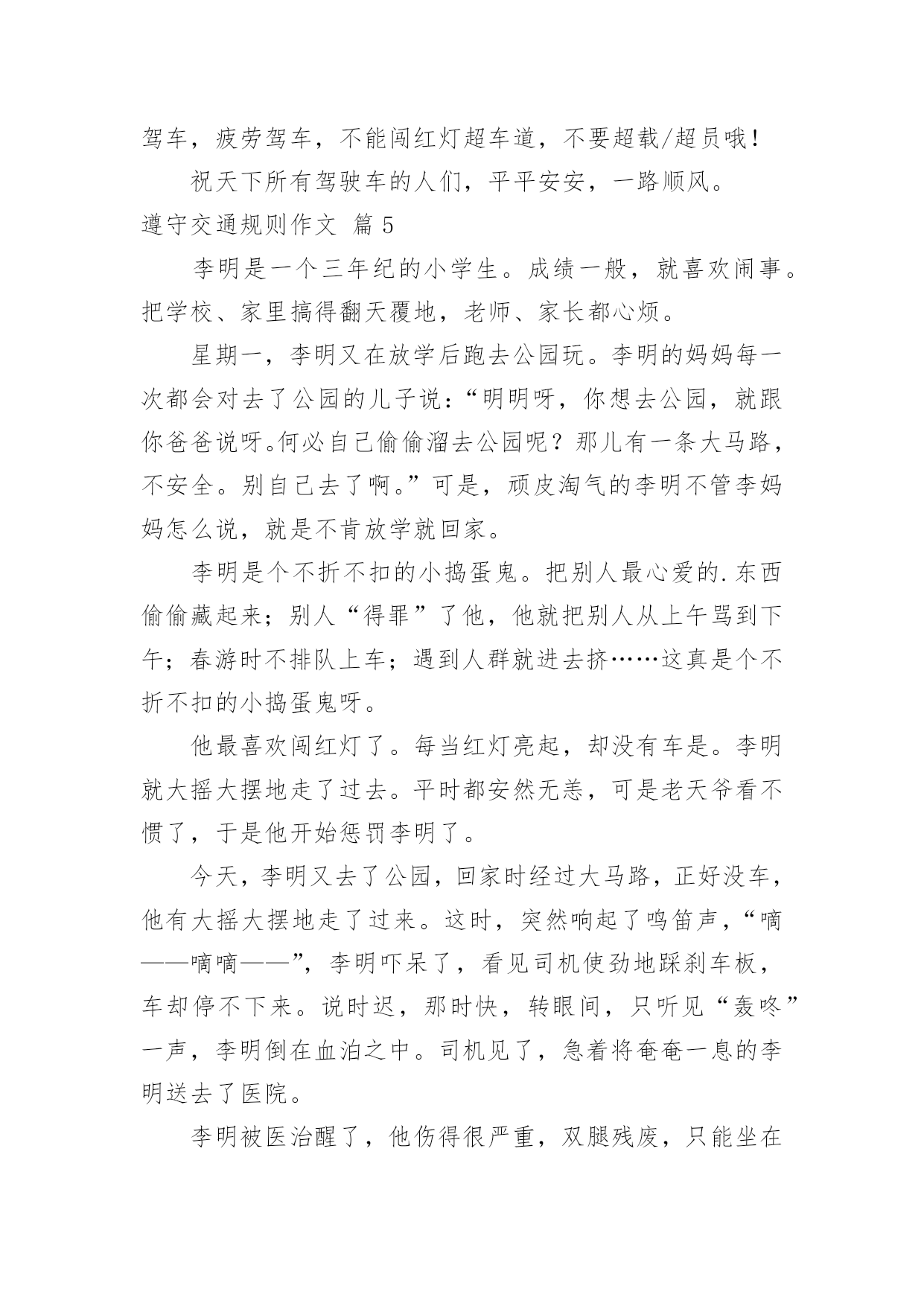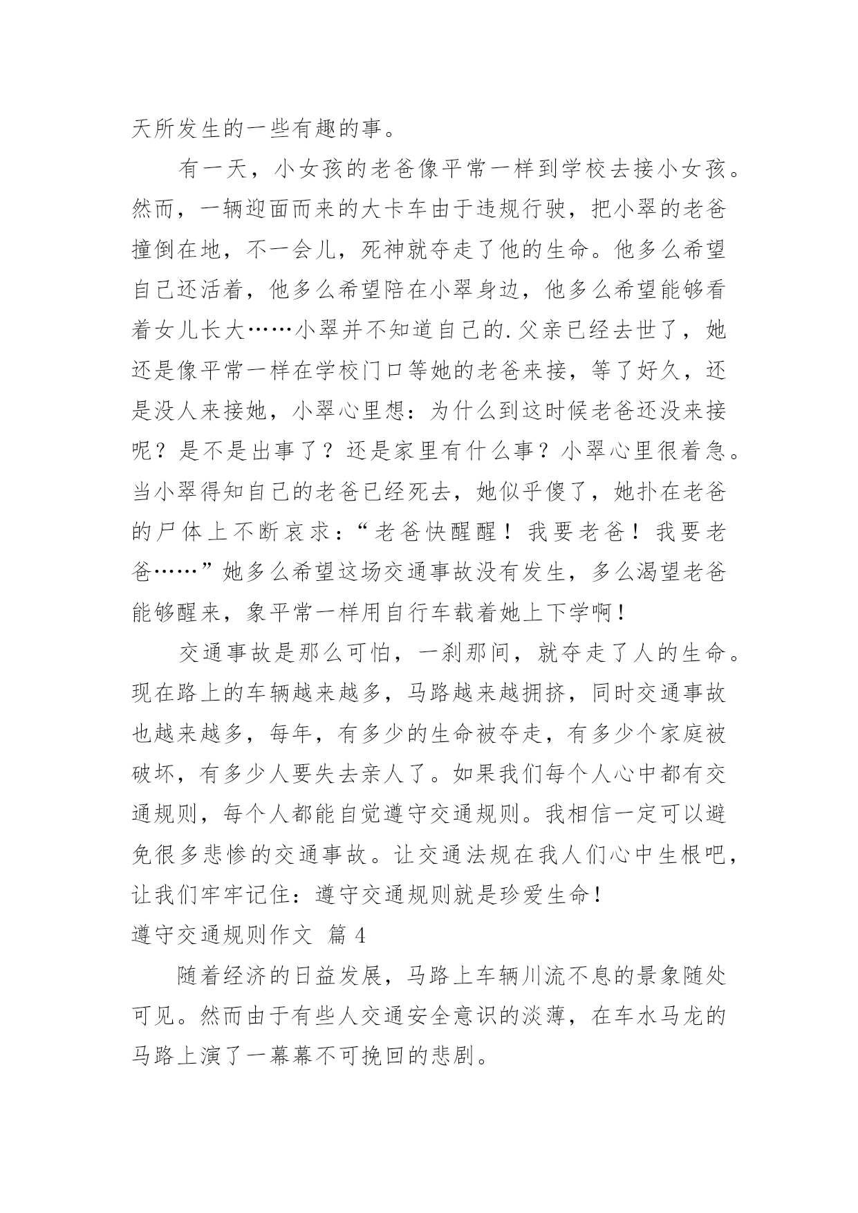 遵守交通规则作文【精选】遵守交通规则作文5篇在学习、工作或生活中,许多人都有过写作文的经历,对作文都不陌生吧,通过作文可以把我们那些零零散散的思想,聚集在一块。那么,怎么去写作文呢?以下是小编整理的遵守交通规则作文7篇,仅供参考,欢迎大家阅读。遵守交通规则作文篇1“越来越好……”歌唱家宋祖英的一首《好日子》唱出了现今的发展,是的,现在人们的腰包越来越鼓,处处新宅,幢幢楼房如雨后春笋[注:指春天下雨后,竹笋一下子就长出来很多。比喻事物迅速大量地涌现出来。]般拔地而起,汽车别墅也不再是城里人的专利,农家小院出入的也几乎没有了牛车马车,取而代之[注:指夺取别人的地位而由自己代替。现也指以某一事物代替另一事物。]的是摩托车、三轮车、汽车了,可这些车辆的主人们很多没有驾照,买了车练几天,觉得熟练便上路了。安全意识淡薄,有时就给幸福的生活蒙上了一层阴影,成为和谐社会里不和谐的隐患。我是一个农村的`孩子,每年的秋忙季节,有人晾花生占上段公路、碾高粱用上一整段公路,更有甚者,在仅剩的路边也要设置障碍,力求把所有车辆都碾压在高粱穗上。还有那上下学的路上,有多少接送孩子的家长无证驾驶、不戴头盔等等……还有很多交通问题,比如赶会赶集,时占在公路上,人车拥堵使中午放学的孩子不能按时回家呢!这些人啊我想对你们说,人的生命是宝贵的,人的一生就只有一次生命,我们应该爱惜生命。注意交通安全也是爱惜生命的一部分。可是有人总是侥幸的认为,灾难遇上会绕道走,正是因为这样的心理作祟,交通事故成了一个很大的问题。曾经我经历过这样一个交通事故:那是一个晴朗的日子,我和妈妈步行去外婆家,突然,一辆车“唰”地一下擦肩而过,我定睛一看,原来是一个男孩骑着自行车,不知要去哪儿,由于他骑得太快了,差一点儿就撞上了马路上的行人。有人劝他不要骑得那么快,可他不听劝告,继续骑他的“飞车”,脸上不时露出得意而急促的神情。我想:这个男孩可能是有什么急事吧!要不然他怎么会骑得那么快呢?但这样很有可能会发生交通事故的。我这样想着往前走,就在前面一个拐弯的地方,看见许多人围在路中央。“啊”我不禁惊叫起来。这不是刚才骑“飞车”的那个男孩吗,他怎么被车撞了?我听见旁观者议论纷纷,“唉!这孩子这可怜啊!刚才不小心撞上了一辆大卡车,连人带车一起飞了出去。”“如果这个孩子车骑得慢一点,如果那个开车的开慢一点,如果……”可是,再多的“如果”也不能使这朵已经完全凋谢的蓓蕾重新开放。这个男孩的父母不知为这个倒在血泊中的孩子操了多少心,可现在只能眼睁睁地看着自己的孩子离去,让父母悲痛万分……交通事故是那么可怕,刹那间,夺走了人的生命,让家庭不再幸福,有多少人留下了悲痛,多少人失去了亲人,多少人……让我们每个人心中都有交通规则,每个人都自觉遵守交通规则,人文明,世界更温情,车文明,道路更宽敞,遵守交通的人与车才是理解、才是安全,才能尽最大程度避免交通事故的发生!让交通法规在你我的心中生根吧,让我们牢牢记住:遵守交通规则就是珍爱生命!遵守交通规则作文篇2今天爸爸开车带着我和妈妈去孙悟空的家乡花果山玩。在路上我们看到一辆载满人的大客车撞到路边的大树上翻车了,因为司机可能是疲劳驾驶。车上很多的人都受伤了。有的腿上缠着纱布,有的头上缠着纱布,有的.腿上缠着纱布,有的哭,有的喊,有的叫救护车,车上的行李散落一地现场非常混乱。希望以后所有的司机都不要疲劳驾驶,遵守交通规则!遵守交通规则作文篇3交通事故时时刻刻都会发生,它就像颗威力十足的炸药,一时大意,这颗埋伏在我们生活中的炸药就会爆炸,炸得家庭破碎,炸得人心悲苦。所以我们要遵守交通规则。我们家附近有一个小女孩小翠,她的老爸就是因去年秋天一次交通事故而离开了她。小女孩家里并不富裕,但是她和老爸老妈一起生活得很开心。每天早晨起来,妈妈都会给她和老爸做上一顿美味的早餐,一家人很温馨。吃完早餐,老爸骑摩托车送她去上学。一路上,父女俩总是有说有笑。放学后,不管风雨多大,小女孩总是看见老爸耐心地在等待着。回家的路上,小女孩总是开开心心地向老爸诉说学校一天所发生的一些有趣的事。有一天,小女孩的老爸像平常一样到学校去接小女孩。然而,一辆迎面而来的大卡车由于违规行驶,把小翠的老爸撞倒在地,不一会儿,死神就夺走了他的生命。他多么希望自己还活着,他多么希望陪在小翠身边,他多么希望能够看着女儿长大……小翠并不知道自己的.父亲已经去世了,她还是像平常一样在学校门口等她的老爸来接,等了好久,还是没人来接她,小翠心里想:为什么到这时候老爸还没来接呢?是不是出事了?还是家里有什么事?小翠心里很着急。当小翠得知自己的老爸已经死去,她似乎傻了,她扑在老爸的尸体上不断哀求:“老爸快醒醒!我要老爸!我要老爸……”她多么希望这场交通事故没有发生,多么渴望老爸能够醒来,象平常一样用自行车载着她上下学啊!交通事故是那