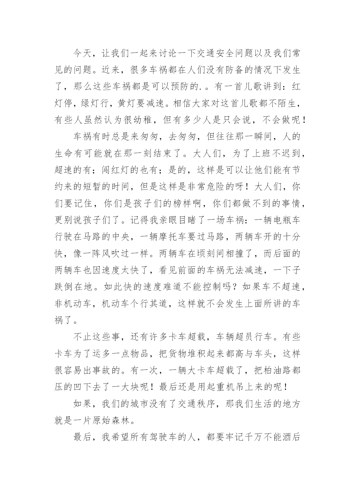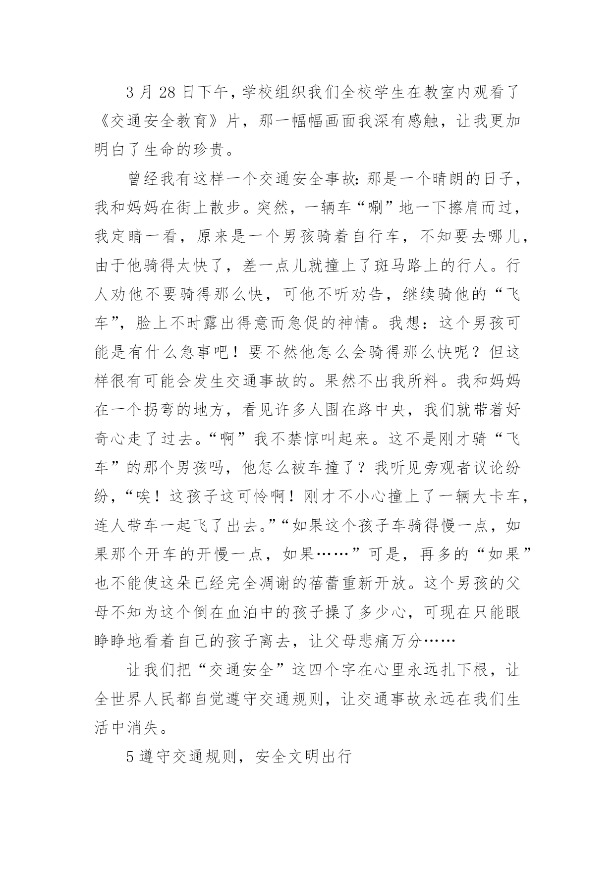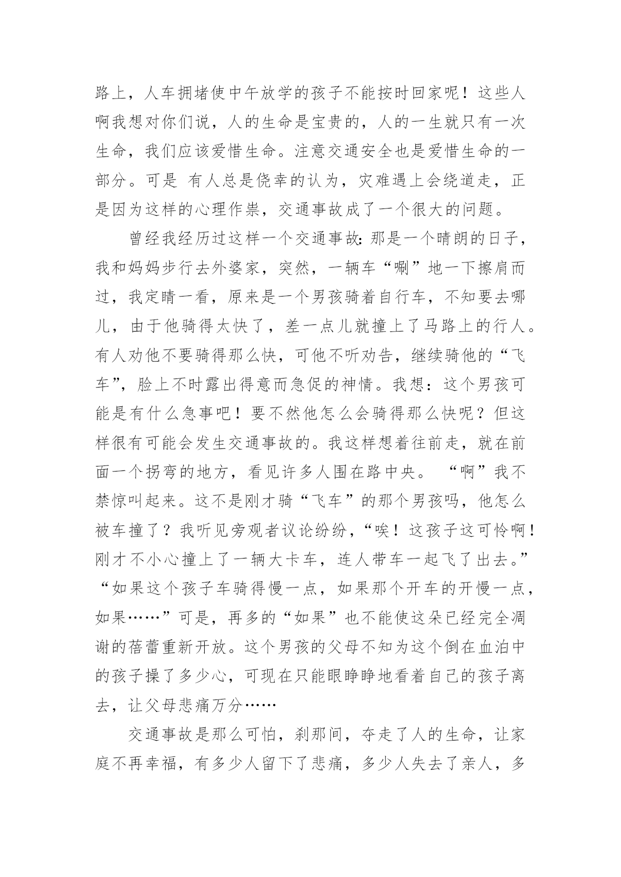 遵守交通规则作文【精选】遵守交通规则作文5篇在学习、工作或生活中,许多人都有过写作文的经历,对作文都不陌生吧,通过作文可以把我们那些零零散散的思想,聚集在一块。那么,怎么去写作文呢?以下是小编整理的遵守交通规则作文7篇,仅供参考,欢迎大家阅读。遵守交通规则作文篇1“越来越好……”歌唱家宋祖英的一首《好日子》唱出了现今的发展,是的,现在人们的腰包越来越鼓,处处新宅,幢幢楼房如雨后春笋[注:指春天下雨后,竹笋一下子就长出来很多。比喻事物迅速大量地涌现出来。]般拔地而起,汽车别墅也不再是城里人的专利,农家小院出入的也几乎没有了牛车马车,取而代之[注:指夺取别人的地位而由自己代替。现也指以某一事物代替另一事物。]的是摩托车、三轮车、汽车了,可这些车辆的主人们很多没有驾照,买了车练几天,觉得熟练便上路了。安全意识淡薄,有时就给幸福的生活蒙上了一层阴影,成为和谐社会里不和谐的隐患。我是一个农村的`孩子,每年的秋忙季节,有人晾花生占上段公路、碾高粱用上一整段公路,更有甚者,在仅剩的路边也要设置障碍,力求把所有车辆都碾压在高粱穗上。还有那上下学的路上,有多少接送孩子的家长无证驾驶、不戴头盔等等……还有很多交通问题,比如赶会赶集,时占在公路上,人车拥堵使中午放学的孩子不能按时回家呢!这些人啊我想对你们说,人的生命是宝贵的,人的一生就只有一次生命,我们应该爱惜生命。注意交通安全也是爱惜生命的一部分。可是有人总是侥幸的认为,灾难遇上会绕道走,正是因为这样的心理作祟,交通事故成了一个很大的问题。曾经我经历过这样一个交通事故:那是一个晴朗的日子,我和妈妈步行去外婆家,突然,一辆车“唰”地一下擦肩而过,我定睛一看,原来是一个男孩骑着自行车,不知要去哪儿,由于他骑得太快了,差一点儿就撞上了马路上的行人。有人劝他不要骑得那么快,可他不听劝告,继续骑他的“飞车”,脸上不时露出得意而急促的神情。我想:这个男孩可能是有什么急事吧!要不然他怎么会骑得那么快呢?但这样很有可能会发生交通事故的。我这样想着往前走,就在前面一个拐弯的地方,看见许多人围在路中央。“啊”我不禁惊叫起来。这不是刚才骑“飞车”的那个男孩吗,他怎么被车撞了?我听见旁观者议论纷纷,“唉!这孩子这可怜啊!刚才不小心撞上了一辆大卡车,连人带车一起飞了出去。”“如果这个孩子车骑得慢一点,如果那个开车的开慢一点,如果……”可是,再多的“如果”也不能使这朵已经完全凋谢的蓓蕾重新开放。这个男孩的父母不知为这个倒在血泊中的孩子操了多少心,可现在只能眼睁睁地看着自己的孩子离去,让父母悲痛万分……交通事故是那么可怕,刹那间,夺走了人的生命,让家庭不再幸福,有多少人留下了悲痛,多少人失去了亲人,多少人……让我们每个人心中都有交通规则,每个人都自觉遵守交通规则,人文明,世界更温情,车文明,道路更宽敞,遵守交通的人与车才是理解、才是安全,才能尽最大程度避免交通事故的发生!让交通法规在你我的心中生根吧,让我们牢牢记住:遵守交通规则就是珍爱生命!遵守交通规则作文篇2今天爸爸开车带着我和妈妈去孙悟空的家乡花果山玩。在路上我们看到一辆载满人的大客车撞到路边的大树上翻车了,因为司机可能是疲劳驾驶。车上很多的人都受伤了。有的腿上缠着纱布,有的头上缠着纱布,有的.腿上缠着纱布,有的哭,有的喊,有的叫救护车,车上的行李散落一地现场非常混乱。希望以后所有的司机都不要疲劳驾驶,遵守交通规则!遵守交通规则作文篇3交通事故时时刻刻都会发生,它就像颗威力十足的炸药,一时大意,这颗埋伏在我们生活中的炸药就会爆炸,炸得家庭破碎,炸得人心悲苦。所以我们要遵守交通规则。我们家附近有一个小女孩小翠,她的老爸就是因去年秋天一次交通事故而离开了她。小女孩家里并不富裕,但是她和老爸老妈一起生活得很开心。每天早晨起来,妈妈都会给她和老爸做上一顿美味的早餐,一家人很温馨。吃完早餐,老爸骑摩托车送她去上学。一路上,父女俩总是有说有笑。放学后,不管风雨多大,小女孩总是看见老爸耐心地在等待着。回家的路上,小女孩总是开开心心地向老爸诉说学校一天所发生的一些有趣的事。有一天,小女孩的老爸像平常一样到学校去接小女孩。然而,一辆迎面而来的大卡车由于违规行驶,把小翠的老爸撞倒在地,不一会儿,死神就夺走了他的生命。他多么希望自己还活着,他多么希望陪在小翠身边,他多么希望能够看着女儿长大……小翠并不知道自己的.父亲已经去世了,她还是像平常一样在学校门口等她的老爸来接,等了好久,还是没人来接她,小翠心里想:为什么到这时候老爸还没来接呢?是不是出事了?还是家里有什么事?小翠心里很着急。当小翠得知自己的老爸已经死去,她似乎傻了,她扑在老爸的尸体上不断哀求:“老爸快醒醒!我要老爸!我要老爸……”她多么希望这场交通事故没有发生,多么渴望老爸能够醒来,象平常一样用自行车载着她上下学啊!交通事故是那