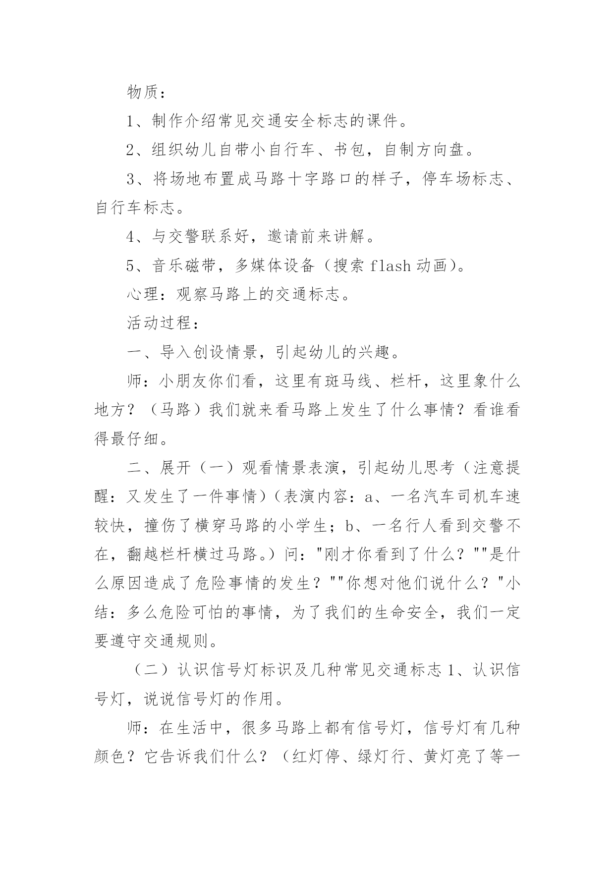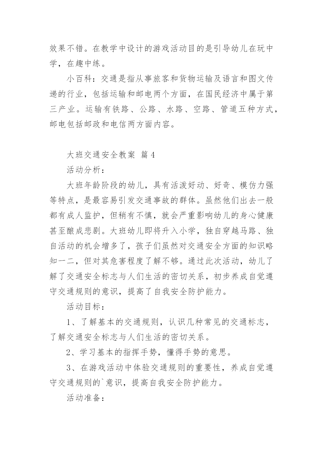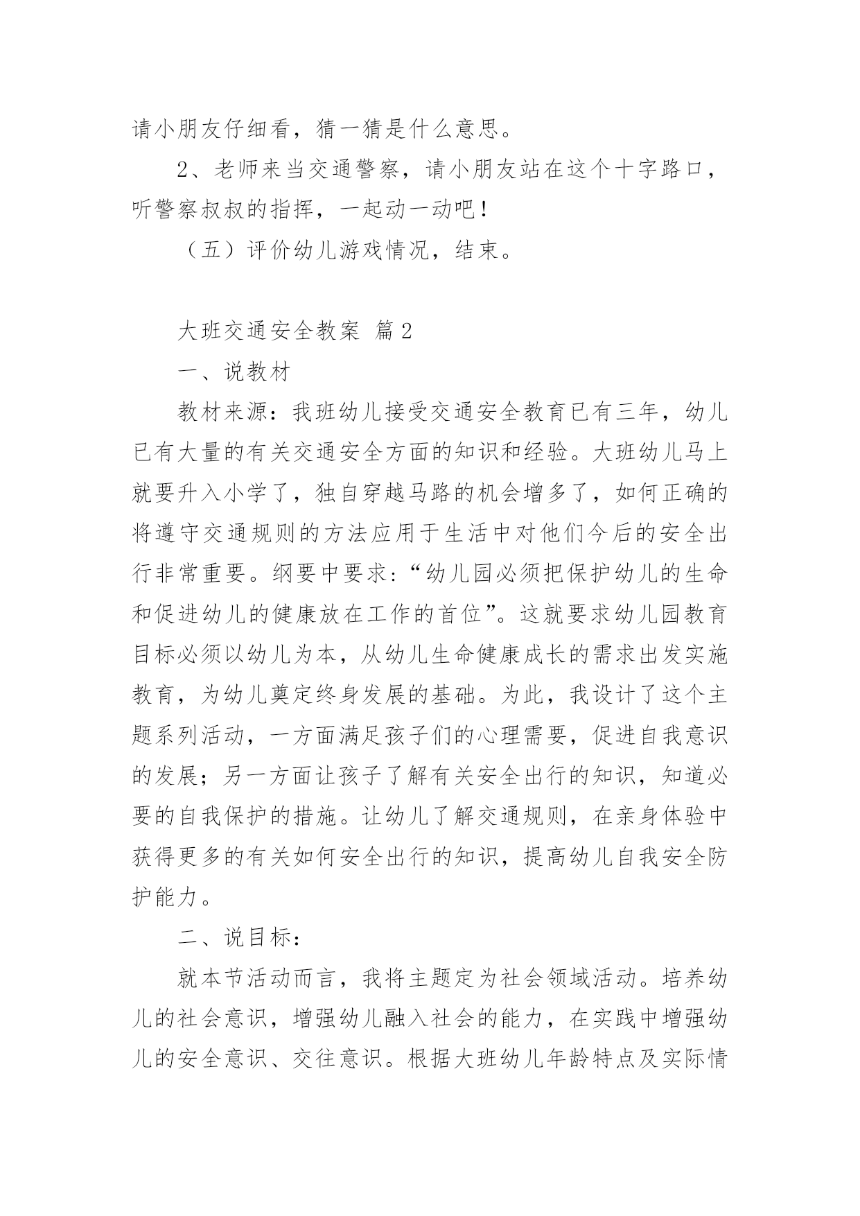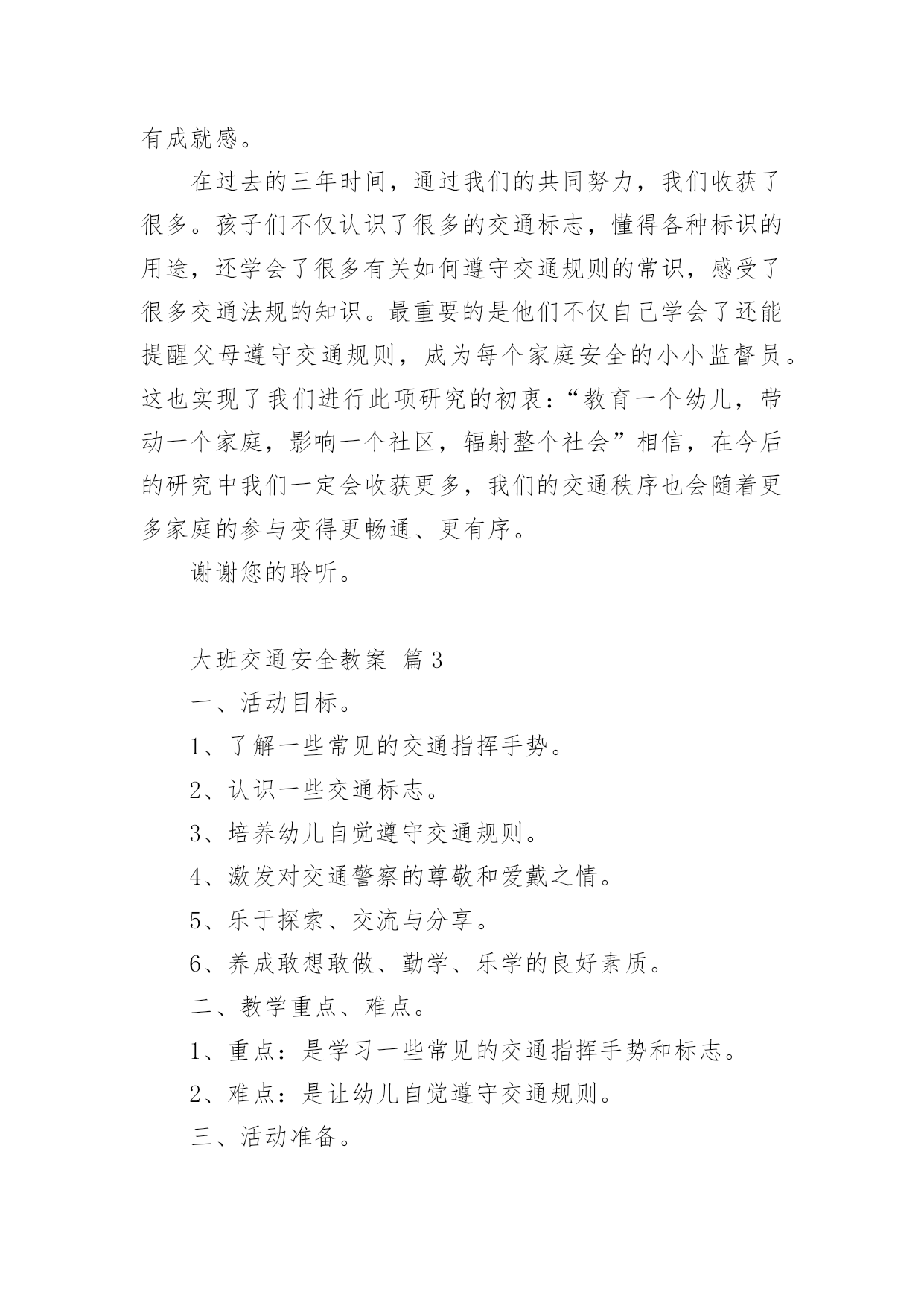 大班交通安全教案大班交通安全教案(精选11篇)作为一名辛苦耕耘的教育工作者,就不得不需要编写教案,教案是备课向课堂教学转化的关节点。如何把教案做到重点突出呢?以下是小编帮大家整理的大班交通安全教案,仅供参考,希望能够帮助到大家。大班交通安全教案篇1一、活动目标:1、让幼儿在交流活动中认识一些常见的交通标志。2、让幼儿在游戏活动中体验交通规则的重要性,从而自觉地遵守交通规则。3、让幼儿在合作学习中学得一些基本的学习方法。二、活动准备:1、精心布置活动场景。2、收集各种交通标志(照片或图片)。3、字卡:交通安全、红灯停,绿灯行、人行道、非机动车道、汽车道。三、活动过程:(一)展开联想,揭示活动主题1、出示交通事故图片,请幼儿仔细观察。提问:孩子们,刚才你们看到了什么?想到了什么?2、多么可怕的车祸,为了不让这样的事情再发生,我们一定要注意交通安全。(出示字卡“交通安全”)(二)在活动中体会交通规则的重要性1、孩子们,看看我们坐的队形像什么?十字路口的学问可多了,现在我们就在十字路口做个游戏。老师请出三个司机,三个骑车的以及五个行人。参加游戏活动的`孩子听到老师说完“开始”之后,立即向自己的对面出发。其他孩子仔细观察,看看会发生什么事情?(1)孩子们,刚才你们看到了什么?你们想说什么?(2)如果生活中也是这样可不行啊!为什么会发生这种情况呢?(3)(教师拿出信号灯标志)这是什么?谁能编句儿歌来说说信号灯的作用。(将标志贴在黑板上)幼儿回答后出示字卡“红灯停,绿灯行”。2、认识了红绿灯,我们还要知道自己应该走哪条路,这就要知道每条路的名称。孩子们,看看这个十字路口,你认识这些道路吗?(人行道、非机动车道、汽车道)(三)初步了解常见交通标志的作用(出示交通标志)在车辆穿梭的马路上,除了信号灯这个交通标志外,还有很多交通标志,这些交通标志都有什么用呢?(四)现场指挥1、刚才我们认识的交通标志对维护交通安全起着重要的作用。车辆的顺畅,人们的生命安全,更离不开交通警察。老师向交警叔叔学了一些指挥交通的本领,请小朋友仔细看,猜一猜是什么意思。2、老师来当交通警察,请小朋友站在这个十字路口,听警察叔叔的指挥,一起动一动吧!(五)评价幼儿游戏情况,结束。大班交通安全教案篇2一、说教材教材来源:我班幼儿接受交通安全教育已有三年,幼儿已有大量的有关交通安全方面的知识和经验。大班幼儿马上就要升入小学了,独自穿越马路的机会增多了,如何正确的将遵守交通规则的方法应用于生活中对他们今后的安全出行非常重要。纲要中要求:“幼儿园必须把保护幼儿的生命和促进幼儿的健康放在工作的首位”。这就要求幼儿园教育目标必须以幼儿为本,从幼儿生命健康成长的需求出发实施教育,为幼儿奠定终身发展的基础。为此,我设计了这个主题系列活动,一方面满足孩子们的心理需要,促进自我意识的发展;另一方面让孩子了解有关安全出行的知识,知道必要的自我保护的措施。让幼儿了解交通规则,在亲身体验中获得更多的有关如何安全出行的知识,提高幼儿自我安全防护能力。二、说目标:就本节活动而言,我将主题定为社会领域活动。培养幼儿的社会意识,增强幼儿融入社会的能力,在实践中增强幼儿的安全意识、交往意识。根据大班幼儿年龄特点及实际情况,确立了认知、能力、情感等方面的目标,融合了语言、科学、社会、艺术领域的整合,在纲要精神的引领和我班幼儿认知能力的'实际水平下,根据20xx年新交法规定,我将目标分解为三个小目标:1.了解交通标线的作用,有初步的交通安全意识。2.复习一些常见的交通标志。3.在集体创造未来道路设施中,感受交通规则的重要性和集体创造的快乐。三、说重、难点:根据目标,我把活动重点定位于:了解交通标线的作用。通过观察、比较、播放录像、交流分享、展示自己的作品,使活动得到深化。活动的难点是:让幼儿感受几种标线的不同,理解各标线的作用,并能在生活中提示父母按马路标线的指示安全行驶。主要是通过引导幼儿积极思考、探索、自主操作等方式,培养幼儿合作学习的意识和发散思维的能力.四、说准备:在目标定位后,树立趣味性、活动性,寓教育于生活、游戏中。因此,我作了以下活动准备1.马路上车流的声音、撞车急刹车的声音,2介绍马路标线的ppt、3.交互式白板课件“谁走错了”、4.违反交通规则挂图、5.知识准备:幼儿与家长一同搜集的各种交通标志、6、前经验的准备:幼儿已掌握很多的有关交通安全的知识。在这段视频中大家可以看出,家长并不能完全按交通法规安全出行,所以我们将十二五课题的重点定位在家园合理进行幼儿交通安全教育的研究上,使幼儿交通安全教育进一步升华。五、说教学过程:《纲要》指出:“教师应成为幼儿学习的支持者、合作者、引导者。因此在组织本次活动时我采用环环相扣的活动程序,活动流程如下:激发兴趣——自由探索——收获新知——交流新知——操作