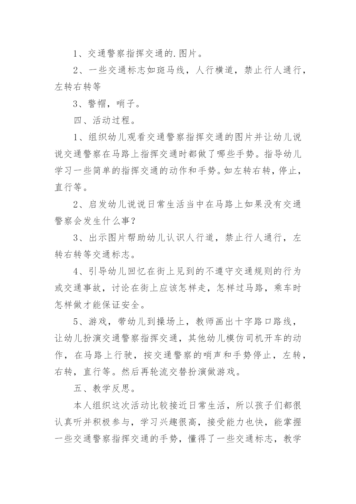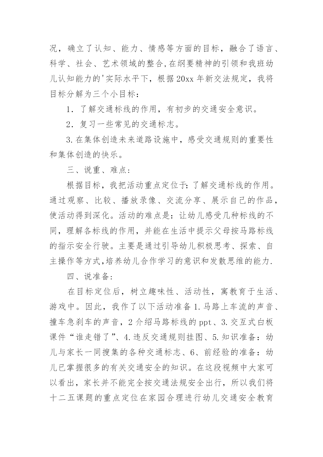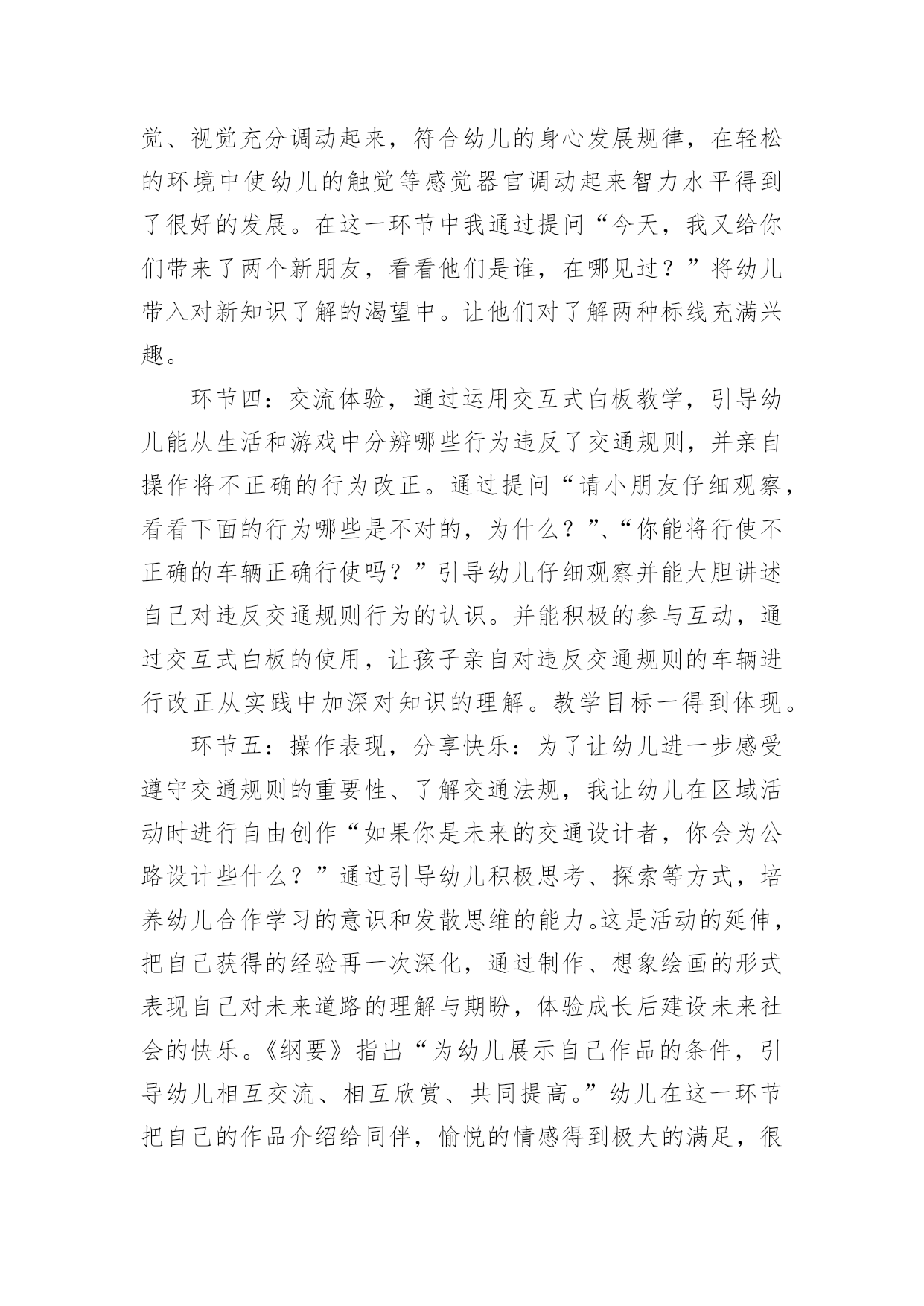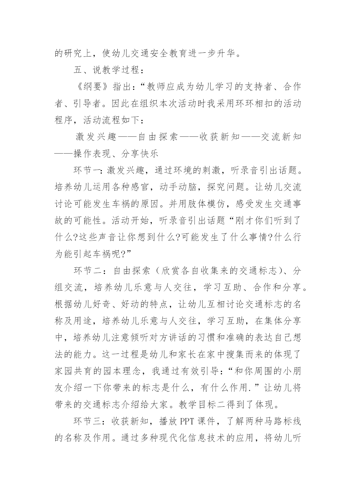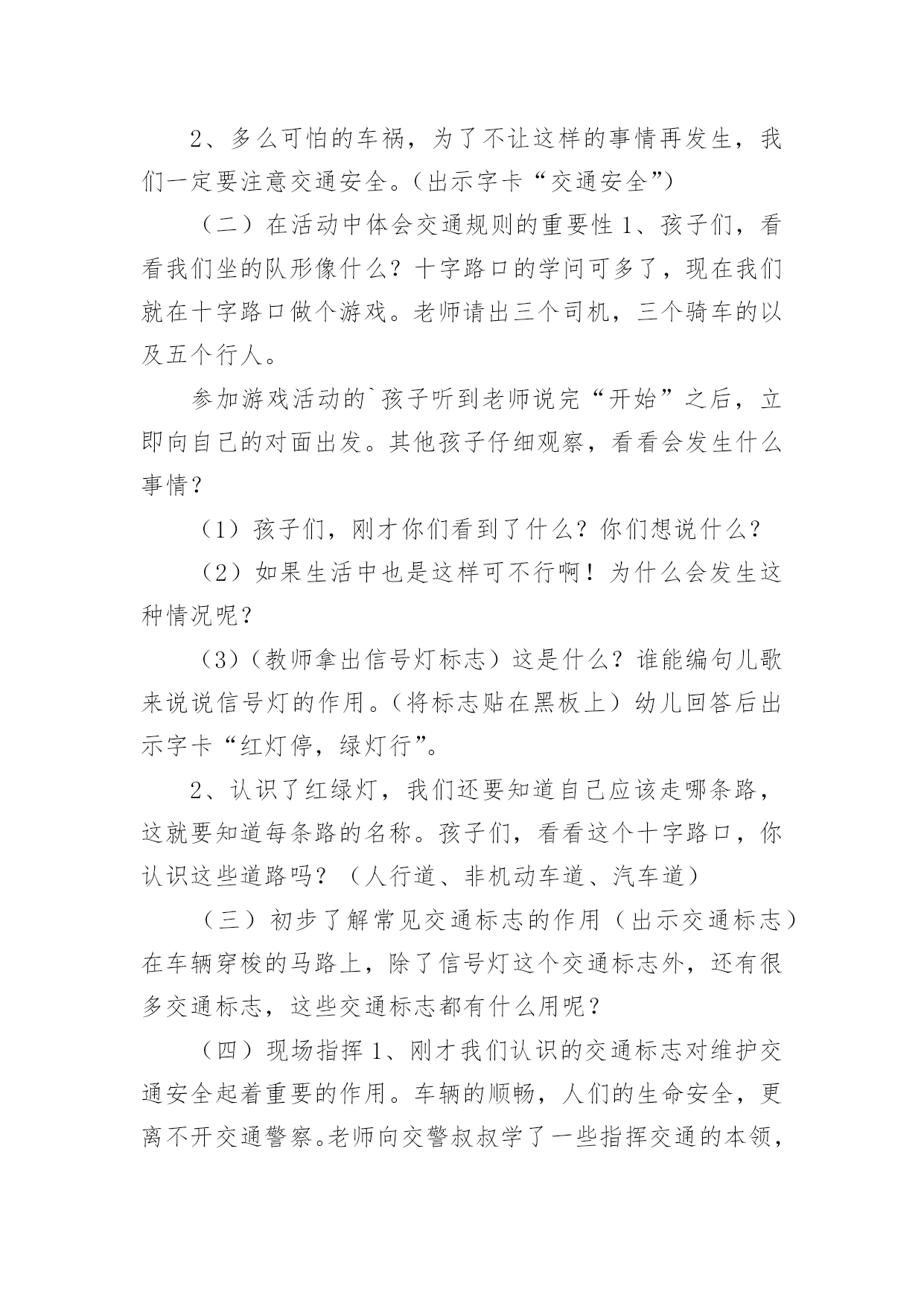 大班交通安全教案大班交通安全教案(精选11篇)作为一名辛苦耕耘的教育工作者,就不得不需要编写教案,教案是备课向课堂教学转化的关节点。如何把教案做到重点突出呢?以下是小编帮大家整理的大班交通安全教案,仅供参考,希望能够帮助到大家。大班交通安全教案篇1一、活动目标:1、让幼儿在交流活动中认识一些常见的交通标志。2、让幼儿在游戏活动中体验交通规则的重要性,从而自觉地遵守交通规则。3、让幼儿在合作学习中学得一些基本的学习方法。二、活动准备:1、精心布置活动场景。2、收集各种交通标志(照片或图片)。3、字卡:交通安全、红灯停,绿灯行、人行道、非机动车道、汽车道。三、活动过程:(一)展开联想,揭示活动主题1、出示交通事故图片,请幼儿仔细观察。提问:孩子们,刚才你们看到了什么?想到了什么?2、多么可怕的车祸,为了不让这样的事情再发生,我们一定要注意交通安全。(出示字卡“交通安全”)(二)在活动中体会交通规则的重要性1、孩子们,看看我们坐的队形像什么?十字路口的学问可多了,现在我们就在十字路口做个游戏。老师请出三个司机,三个骑车的以及五个行人。参加游戏活动的`孩子听到老师说完“开始”之后,立即向自己的对面出发。其他孩子仔细观察,看看会发生什么事情?(1)孩子们,刚才你们看到了什么?你们想说什么?(2)如果生活中也是这样可不行啊!为什么会发生这种情况呢?(3)(教师拿出信号灯标志)这是什么?谁能编句儿歌来说说信号灯的作用。(将标志贴在黑板上)幼儿回答后出示字卡“红灯停,绿灯行”。2、认识了红绿灯,我们还要知道自己应该走哪条路,这就要知道每条路的名称。孩子们,看看这个十字路口,你认识这些道路吗?(人行道、非机动车道、汽车道)(三)初步了解常见交通标志的作用(出示交通标志)在车辆穿梭的马路上,除了信号灯这个交通标志外,还有很多交通标志,这些交通标志都有什么用呢?(四)现场指挥1、刚才我们认识的交通标志对维护交通安全起着重要的作用。车辆的顺畅,人们的生命安全,更离不开交通警察。老师向交警叔叔学了一些指挥交通的本领,请小朋友仔细看,猜一猜是什么意思。2、老师来当交通警察,请小朋友站在这个十字路口,听警察叔叔的指挥,一起动一动吧!(五)评价幼儿游戏情况,结束。大班交通安全教案篇2一、说教材教材来源:我班幼儿接受交通安全教育已有三年,幼儿已有大量的有关交通安全方面的知识和经验。大班幼儿马上就要升入小学了,独自穿越马路的机会增多了,如何正确的将遵守交通规则的方法应用于生活中对他们今后的安全出行非常重要。纲要中要求:“幼儿园必须把保护幼儿的生命和促进幼儿的健康放在工作的首位”。这就要求幼儿园教育目标必须以幼儿为本,从幼儿生命健康成长的需求出发实施教育,为幼儿奠定终身发展的基础。为此,我设计了这个主题系列活动,一方面满足孩子们的心理需要,促进自我意识的发展;另一方面让孩子了解有关安全出行的知识,知道必要的自我保护的措施。让幼儿了解交通规则,在亲身体验中获得更多的有关如何安全出行的知识,提高幼儿自我安全防护能力。二、说目标:就本节活动而言,我将主题定为社会领域活动。培养幼儿的社会意识,增强幼儿融入社会的能力,在实践中增强幼儿的安全意识、交往意识。根据大班幼儿年龄特点及实际情况,确立了认知、能力、情感等方面的目标,融合了语言、科学、社会、艺术领域的整合,在纲要精神的引领和我班幼儿认知能力的'实际水平下,根据20xx年新交法规定,我将目标分解为三个小目标:1.了解交通标线的作用,有初步的交通安全意识。2.复习一些常见的交通标志。3.在集体创造未来道路设施中,感受交通规则的重要性和集体创造的快乐。三、说重、难点:根据目标,我把活动重点定位于:了解交通标线的作用。通过观察、比较、播放录像、交流分享、展示自己的作品,使活动得到深化。活动的难点是:让幼儿感受几种标线的不同,理解各标线的作用,并能在生活中提示父母按马路标线的指示安全行驶。主要是通过引导幼儿积极思考、探索、自主操作等方式,培养幼儿合作学习的意识和发散思维的能力.四、说准备:在目标定位后,树立趣味性、活动性,寓教育于生活、游戏中。因此,我作了以下活动准备1.马路上车流的声音、撞车急刹车的声音,2介绍马路标线的ppt、3.交互式白板课件“谁走错了”、4.违反交通规则挂图、5.知识准备:幼儿与家长一同搜集的各种交通标志、6、前经验的准备:幼儿已掌握很多的有关交通安全的知识。在这段视频中大家可以看出,家长并不能完全按交通法规安全出行,所以我们将十二五课题的重点定位在家园合理进行幼儿交通安全教育的研究上,使幼儿交通安全教育进一步升华。五、说教学过程:《纲要》指出:“教师应成为幼儿学习的支持者、合作者、引导者。因此在组织本次活动时我采用环环相扣的活动程序,活动流程如下:激发兴趣——自由探索——收获新知——交流新知——操作
