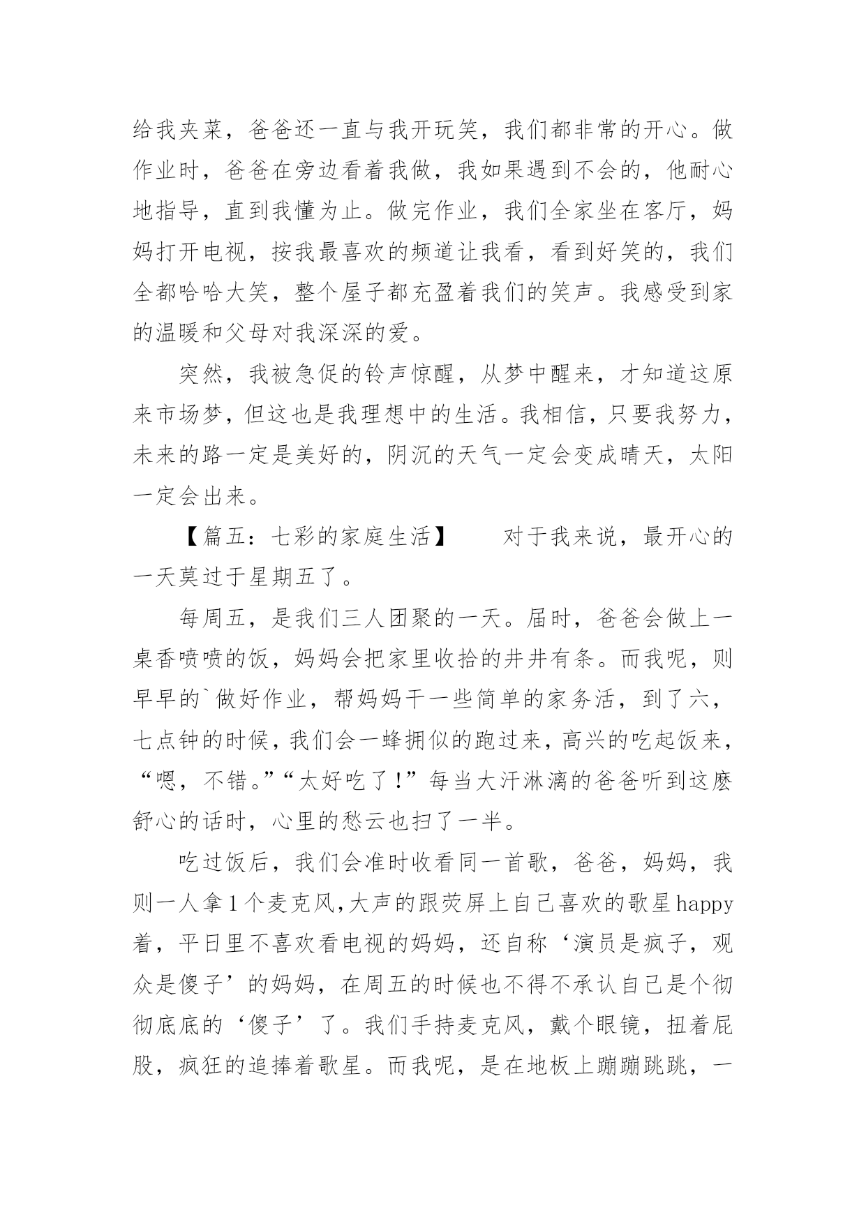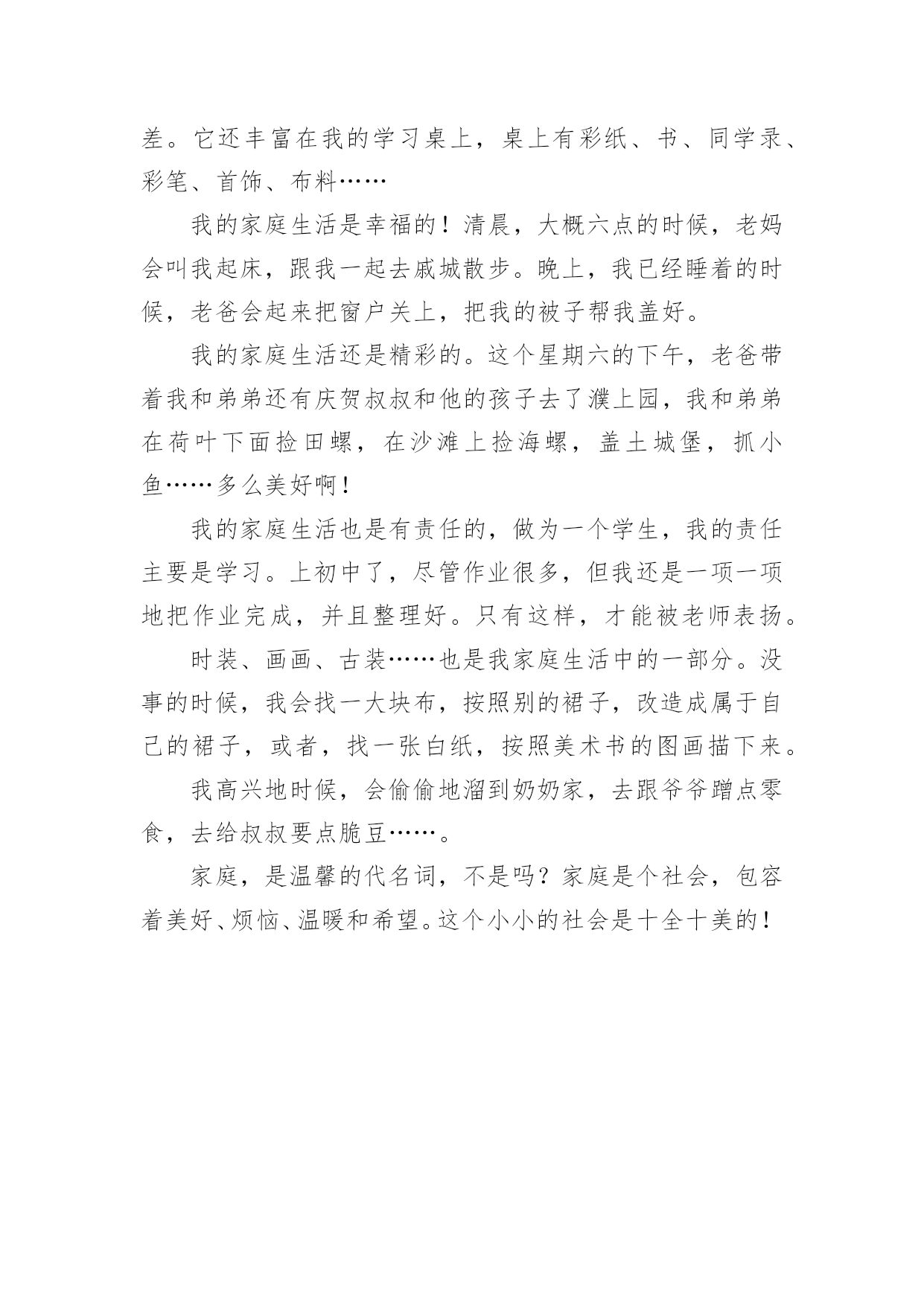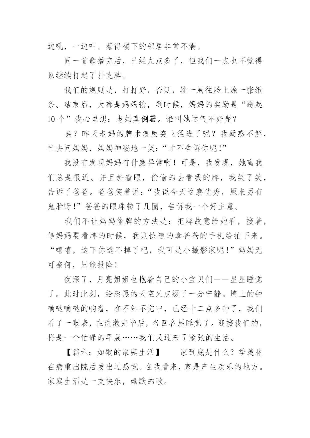讨论家庭生活的作文讨论家庭生活的作文我有一个幸福美满的家庭,每天发生的趣事像五彩斑斓的梦,像玲珑剔透的珍珠,使人向往,像你将一块巧克力放进嘴里,虽然嚼化了,但它那香浓可口的味道值得你细细地品位。其中,有一件趣事让我久不能忘怀。下面是家庭生活作文,欢迎参考阅读!【篇一:家庭生活】在我的家庭生活中,有许须多多使人快乐的事情,这些事情仿佛是天空上的星星,每颗星都记着我家庭生活中的快乐、美好、温馨的瞬间,今天,我摘那最耀眼的一颗星。我们家有一个规矩,谁先到家谁先做饭,后回来的洗完。一般都是妈妈先回家,爸爸后回家。可是,这一天爸爸和妈妈同一时间回来了。这汇麻烦来了,到底谁去做饭了成了”难题|了。于是引发了一场激烈的“家庭官司打战”,谁来当法官呢?当然是铁面无私、大公无私的鄙人——罗文彧了。俗话说:“清官难断家务事。”判给谁,另一方都不会愿意。只好听听双方的叙述在说吧!首先,有原告妈妈来说:“法官大人,我看见被告回家时故意在楼道口站一会,拖延时间,分明是在逃避做饭。”“现在由被告为自己辨论。”“法官大人,我只是在看了一会书而已,难道也算在拖延时间吗?由没闲着。”听完两位的争论。我“宣判”最后结果。让爸爸去做饭,妈妈洗碗。听到这话,妈妈的得意劲儿别提由多美了,爸爸呀只好乖乖的进厨房啰。我的家庭的趣事还有很多很多,等有机会了再慢慢给你们细细说来吧!【篇二:我的家庭生活】家,一个多么熟悉的字眼,在我看来,家只不过是一幢房子,是家人归宿的地方。然而“家庭”却不同,“家庭”它是与自己至亲至爱的人组成的一个集体。我家是一个大家庭,我们三代人在一起生活着。我们家人虽多,日子却过的简单,平淡,并不象别的家庭一样,充满欢声笑语。以前,每天早上,爸爸。妈妈工作比较忙,没时间照顾我的起居饮食,除了晚饭,我几乎每天都在学校食堂吃,爷爷。奶奶知道后,特意从老家搬过来,每天为我准备好饭菜,使我一回家能吃到香喷喷的饭菜。爷爷。奶奶来了之后,两手可不闲着,每天为我们擦地洗衣等,妈妈怕两位老人累着,早早把该干的活儿都干完了,可他两总能找出什么活儿来干。妈妈常劝他们说:“爸。妈,你们别干了,这些活我来干行了。”可爷爷。奶奶却说:“你们俩每天上班这么累了,回来还要干这些活,怎么忙的来,我闲着是闲着,能干多少是多少吧!”不过,爸爸。妈妈还是蛮孝顺的,每月都为爷爷。奶奶添几件新一什么的,使我都有点羡慕了。每天晚上,我们很少聚在一起聊天。爸爸总在书房里弄他的文件,奶奶与妈妈则在一起为我们补些衣物什么的。爷爷则在那看报纸或找邻家老大爷下象棋。我则在看我的电视。虽然我们都在各干各的事,但我们耳边常传来一声声关心的话语,比如:奶奶常常对我说:“看电视时别吃太多零食,容易积食或别看太久电视,对眼睛不好等。”爸爸。妈妈常会对爷爷。奶奶说:“爸,妈你们别熬那么晚,快去睡吧。”……我的家庭生活虽然平淡,却从这平淡之中突出了和谐与幸福,这是我的家庭,一个普普通通的家庭。【篇三:坎坎坷坷的家庭生活作文】家庭的生活是一个人生活的本质,我们每一个人都会有自己的私人生活空间,那么这个私人空间将是家。然而有时候家便不是童话中的那么完美,那么幸福,那么快乐。我相信每一个人都有家,然而这些人真的很幸福吗?我相信不是的他们每一个人都一定很幸福,只是他们在外面表面是开开心心,嘻嘻哈哈的,实际上心中有压不住的伤感,凄惨。只不过不想让他人知道罢了。我的家庭,哦,我也说不出是好是坏,但是我很不爽,因为我的家庭太过完美,完美的让我喘不过气来。在我的眼中我的父母,哥哥姐姐,爷爷奶奶都真是太完美了。小时候,我什么都不懂的时候,有一次,我正在阳台上面看书,可是我要翻书时一不小心把书落到了一楼,谁知道,这个时候奶奶出来了,书本正好砸到了她的头上,爸爸看到后打了我。我又有什么可以说的呢?随着时间的飞逝,我又飞到了初中,有一次爸爸妈妈出去打马吊,我正要睡觉时,姐姐莫名其妙的和我吵了起来,妈妈回来了,看到这样只问姐姐下了结论,把爸爸找了回来。爸爸回来时我正在上厕所,面对妈妈的推门我一不做,二不休把门反锁了起来。可是,等我开门是锁却坏了,开不开。我在里面,爸爸妈妈在外面边骂边敲门。最后终于开了,爸爸一进来甩了我两巴掌,还打我的手。我当时没说什么,我不是不敢说,而是说了又有什么用?生活真是不好过,因为这太坎坷了。【篇四:我理想中的家庭生活】走在路上,望着还未走过的路,感觉未走的路好长好长。慢慢地走着,一徐风吹过,感觉好冷好冷。抬头仰望着天空,天空阴沉沉的,感觉好静好静。这段时间的我,总是闷闷不乐,喜欢自己一个人独自在安静的角落待着。我与家人也越来越没话说,有时一天下来,也只才说了一两句话,那几句话也只是与父母吵架时所说的话,所以与父母的关系越来越疏远了。今天,我又走到了那个角落坐着,不知不觉进入了梦乡。应该是这几天一直让自己用不停地做事