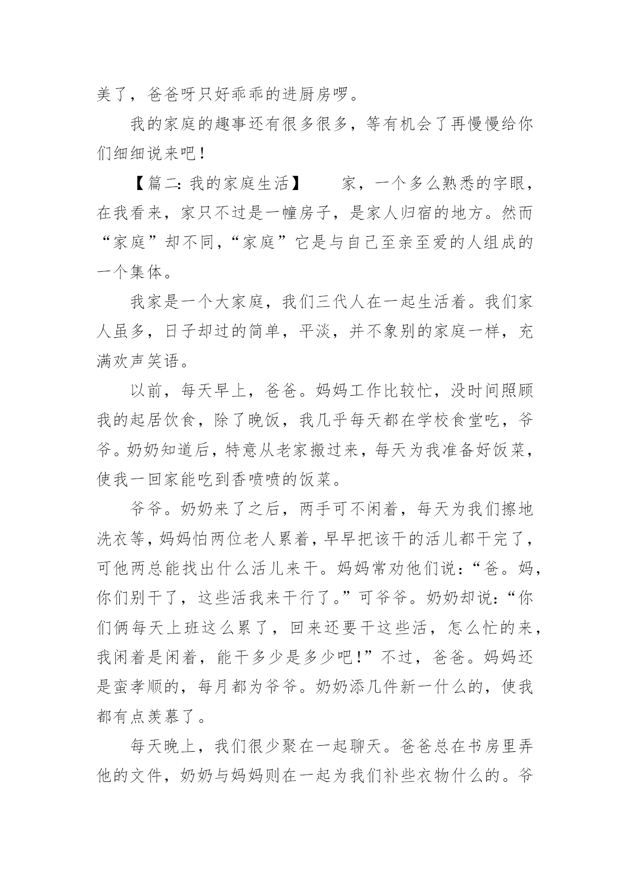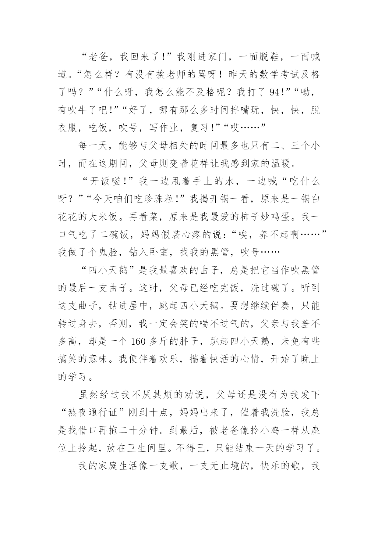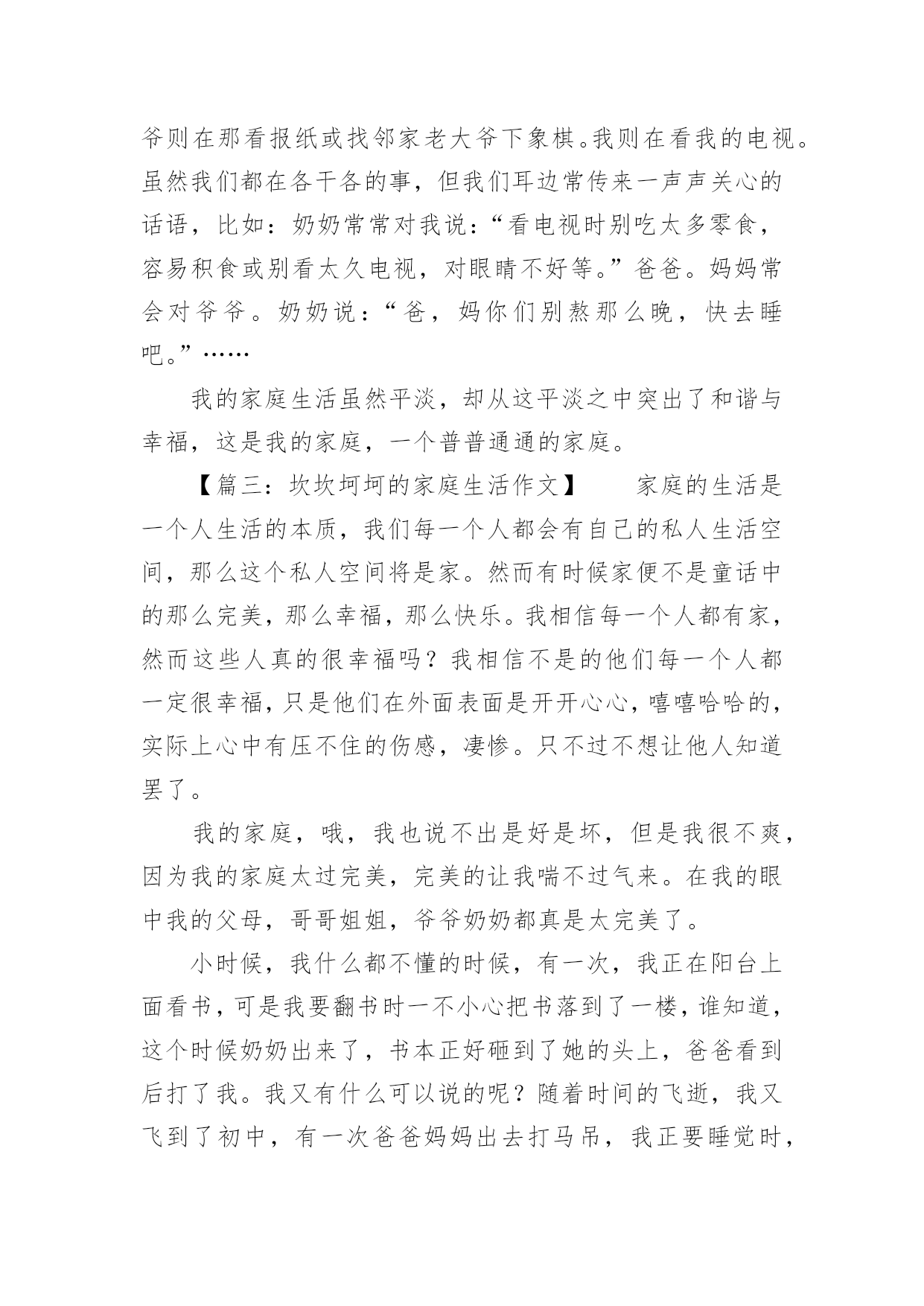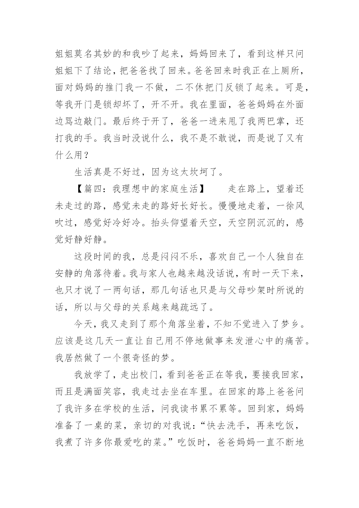 讨论家庭生活的作文讨论家庭生活的作文我有一个幸福美满的家庭,每天发生的趣事像五彩斑斓的梦,像玲珑剔透的珍珠,使人向往,像你将一块巧克力放进嘴里,虽然嚼化了,但它那香浓可口的味道值得你细细地品位。其中,有一件趣事让我久不能忘怀。下面是家庭生活作文,欢迎参考阅读!【篇一:家庭生活】在我的家庭生活中,有许须多多使人快乐的事情,这些事情仿佛是天空上的星星,每颗星都记着我家庭生活中的快乐、美好、温馨的瞬间,今天,我摘那最耀眼的一颗星。我们家有一个规矩,谁先到家谁先做饭,后回来的洗完。一般都是妈妈先回家,爸爸后回家。可是,这一天爸爸和妈妈同一时间回来了。这汇麻烦来了,到底谁去做饭了成了”难题|了。于是引发了一场激烈的“家庭官司打战”,谁来当法官呢?当然是铁面无私、大公无私的鄙人——罗文彧了。俗话说:“清官难断家务事。”判给谁,另一方都不会愿意。只好听听双方的叙述在说吧!首先,有原告妈妈来说:“法官大人,我看见被告回家时故意在楼道口站一会,拖延时间,分明是在逃避做饭。”“现在由被告为自己辨论。”“法官大人,我只是在看了一会书而已,难道也算在拖延时间吗?由没闲着。”听完两位的争论。我“宣判”最后结果。让爸爸去做饭,妈妈洗碗。听到这话,妈妈的得意劲儿别提由多美了,爸爸呀只好乖乖的进厨房啰。我的家庭的趣事还有很多很多,等有机会了再慢慢给你们细细说来吧!【篇二:我的家庭生活】家,一个多么熟悉的字眼,在我看来,家只不过是一幢房子,是家人归宿的地方。然而“家庭”却不同,“家庭”它是与自己至亲至爱的人组成的一个集体。我家是一个大家庭,我们三代人在一起生活着。我们家人虽多,日子却过的简单,平淡,并不象别的家庭一样,充满欢声笑语。以前,每天早上,爸爸。妈妈工作比较忙,没时间照顾我的起居饮食,除了晚饭,我几乎每天都在学校食堂吃,爷爷。奶奶知道后,特意从老家搬过来,每天为我准备好饭菜,使我一回家能吃到香喷喷的饭菜。爷爷。奶奶来了之后,两手可不闲着,每天为我们擦地洗衣等,妈妈怕两位老人累着,早早把该干的活儿都干完了,可他两总能找出什么活儿来干。妈妈常劝他们说:“爸。妈,你们别干了,这些活我来干行了。”可爷爷。奶奶却说:“你们俩每天上班这么累了,回来还要干这些活,怎么忙的来,我闲着是闲着,能干多少是多少吧!”不过,爸爸。妈妈还是蛮孝顺的,每月都为爷爷。奶奶添几件新一什么的,使我都有点羡慕了。每天晚上,我们很少聚在一起聊天。爸爸总在书房里弄他的文件,奶奶与妈妈则在一起为我们补些衣物什么的。爷爷则在那看报纸或找邻家老大爷下象棋。我则在看我的电视。虽然我们都在各干各的事,但我们耳边常传来一声声关心的话语,比如:奶奶常常对我说:“看电视时别吃太多零食,容易积食或别看太久电视,对眼睛不好等。”爸爸。妈妈常会对爷爷。奶奶说:“爸,妈你们别熬那么晚,快去睡吧。”……我的家庭生活虽然平淡,却从这平淡之中突出了和谐与幸福,这是我的家庭,一个普普通通的家庭。【篇三:坎坎坷坷的家庭生活作文】家庭的生活是一个人生活的本质,我们每一个人都会有自己的私人生活空间,那么这个私人空间将是家。然而有时候家便不是童话中的那么完美,那么幸福,那么快乐。我相信每一个人都有家,然而这些人真的很幸福吗?我相信不是的他们每一个人都一定很幸福,只是他们在外面表面是开开心心,嘻嘻哈哈的,实际上心中有压不住的伤感,凄惨。只不过不想让他人知道罢了。我的家庭,哦,我也说不出是好是坏,但是我很不爽,因为我的家庭太过完美,完美的让我喘不过气来。在我的眼中我的父母,哥哥姐姐,爷爷奶奶都真是太完美了。小时候,我什么都不懂的时候,有一次,我正在阳台上面看书,可是我要翻书时一不小心把书落到了一楼,谁知道,这个时候奶奶出来了,书本正好砸到了她的头上,爸爸看到后打了我。我又有什么可以说的呢?随着时间的飞逝,我又飞到了初中,有一次爸爸妈妈出去打马吊,我正要睡觉时,姐姐莫名其妙的和我吵了起来,妈妈回来了,看到这样只问姐姐下了结论,把爸爸找了回来。爸爸回来时我正在上厕所,面对妈妈的推门我一不做,二不休把门反锁了起来。可是,等我开门是锁却坏了,开不开。我在里面,爸爸妈妈在外面边骂边敲门。最后终于开了,爸爸一进来甩了我两巴掌,还打我的手。我当时没说什么,我不是不敢说,而是说了又有什么用?生活真是不好过,因为这太坎坷了。【篇四:我理想中的家庭生活】走在路上,望着还未走过的路,感觉未走的路好长好长。慢慢地走着,一徐风吹过,感觉好冷好冷。抬头仰望着天空,天空阴沉沉的,感觉好静好静。这段时间的我,总是闷闷不乐,喜欢自己一个人独自在安静的角落待着。我与家人也越来越没话说,有时一天下来,也只才说了一两句话,那几句话也只是与父母吵架时所说的话,所以与父母的关系越来越疏远了。今天,我又走到了那个角落坐着,不知不觉进入了梦乡。应该是这几天一直让自己用不停地做事