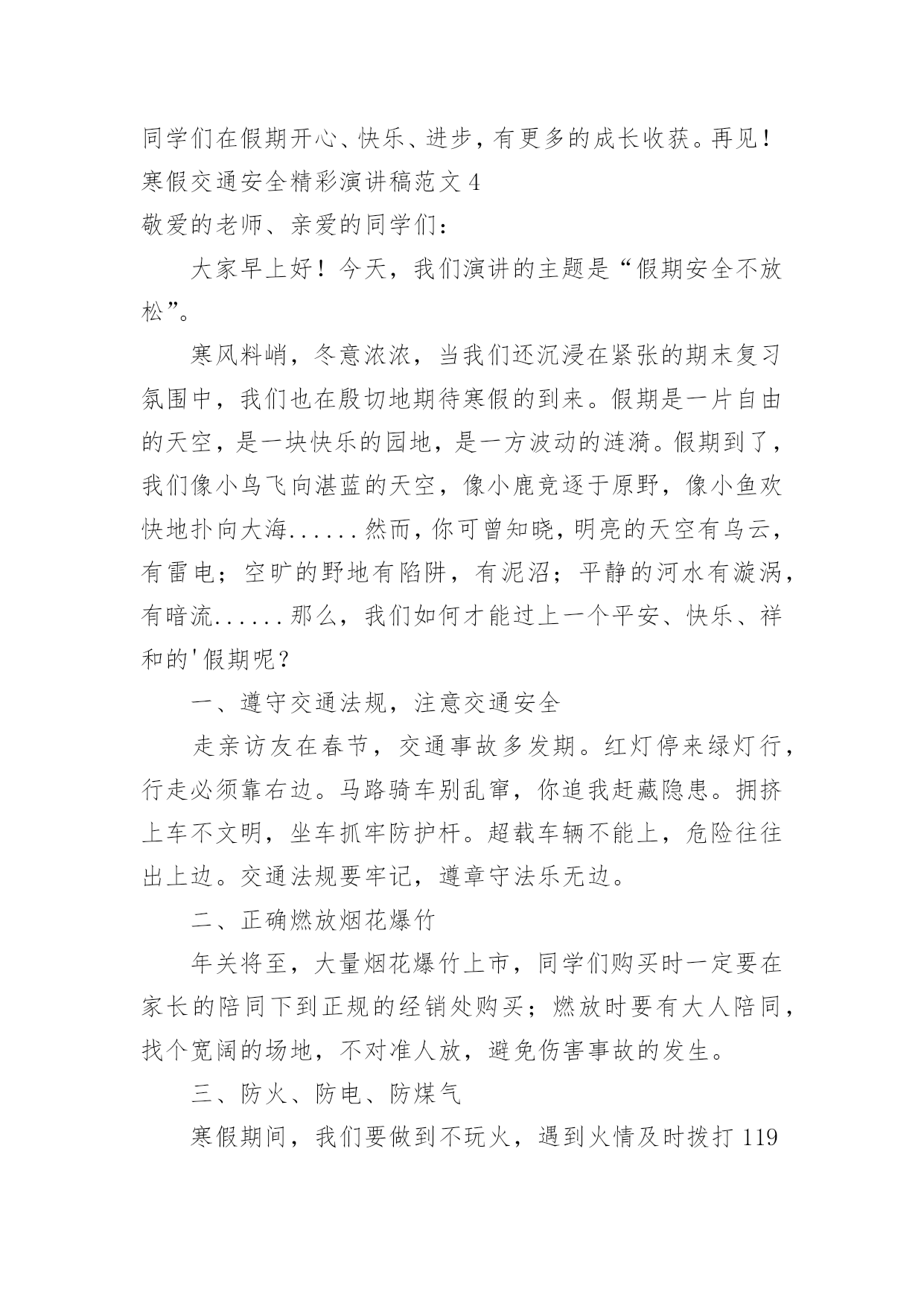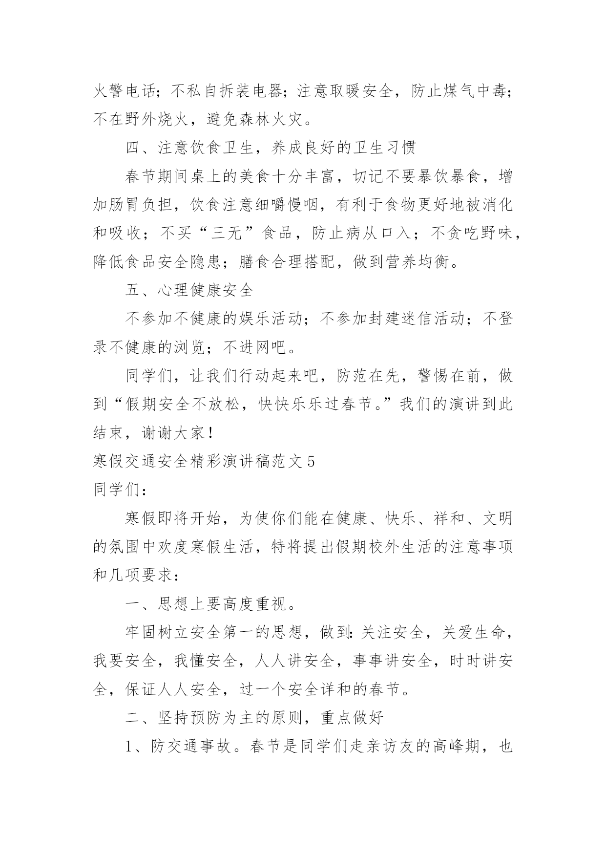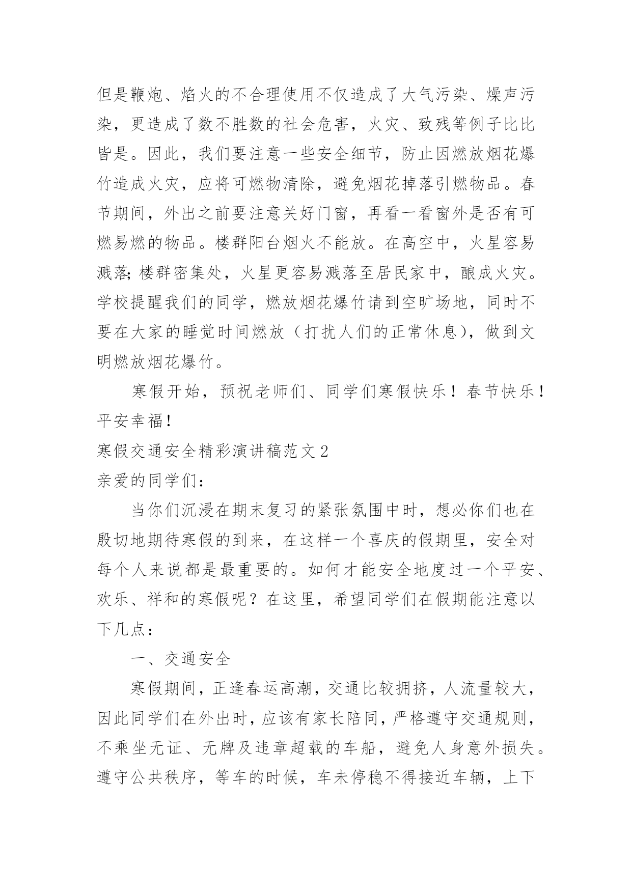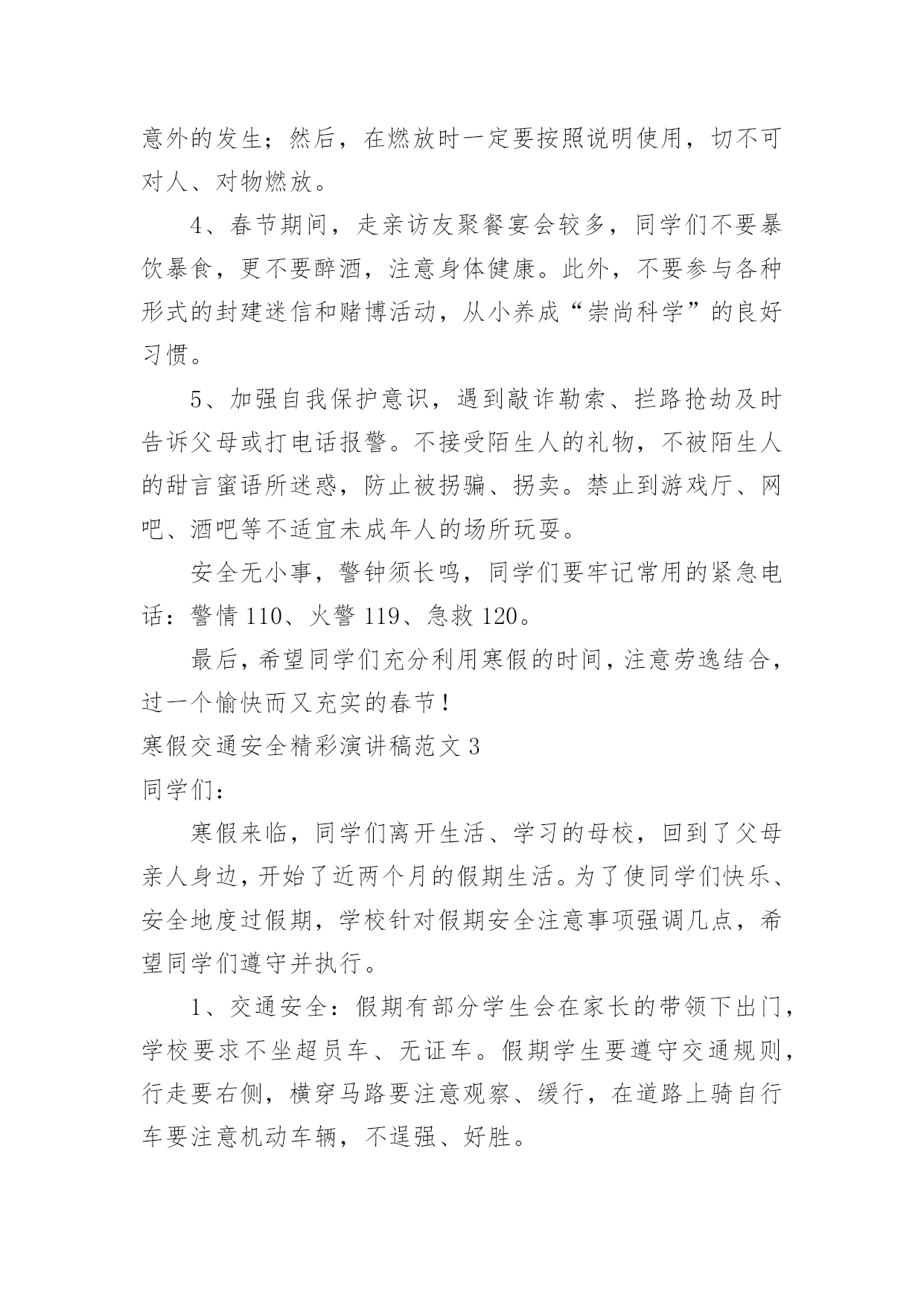寒假交通安全精彩演讲稿寒假交通安全精彩演讲稿范文演讲稿的写法比较灵活,可以根据会议的内容、一件事事后的感想、需要等情况而有所区别。在现在的社会生活中,接触并使用演讲稿的人越来越多,大家知道演讲稿的格式吗?以下是小编精心整理的寒假交通安全精彩演讲稿范文,欢迎阅读,希望大家能够喜欢。寒假交通安全精彩演讲稿范文1尊敬的各位老师和同学们:大家好!每次,我们七都中学都要在寒暑假前组织假期安全方面的教育,我感觉这是学校对你们的关注,特别是你们家庭幸福和身心健康发展的关爱。今天,我将利用这次电波交流的机会和大家谈谈以下几个方面的话题:一、提高交通安全意识,确保安全出行为了全体教师和同学都能度过一个安全、文明、健康、愉快的寒假,我们衷心希望寒假期间,全体教师及同学要认真遵守新的《道路交通安全法》,确保安全出行。首先是要牢记交通安全最根本的原则,那就是“红灯停、绿灯行、黄灯要注意,不要闯红灯”,“走路要走人行道,过马路一定要遵循“一看、二慢、三通过”的原则”。其次,我们“乘坐公共汽车或长途汽车须在站台或指定地点依次候车,待车停稳后,先下后上”。候车期间,每个人都应认真遵守交通规则,注意不互相追逐、打闹以确保交通安全、防止意外的发生。,另外,请同学们要利用寒假期间的时间,好好学习新的'《道路交通安全法》,因为,现在的法律对酒驾、醉酒都提出了相当严格的规定。二、安全用电,安全用火,防止煤气中毒寒假,伴随我们的是寒冷的天气。有些同学就会使用电热毯取暖、拉电线在床头看书、用热水器洗澡等等。但是请同学们注意,这样也在偶然中增加了一份不安全的隐患。为此,我们要养成对电器设备进行全面安全检查的意识:检查有无漏电情况、检查绝缘老化程度、检查有无裸露部分、利用我们学到的知识检查设备安装有无违规情况、决不私拉电网,也不把灯头拉来拉去,以免损坏电线或灯头造成触电事故。使用时一定要注意电源插头和插座相配套,两者接触应紧密;如果插头和插座接触松动,插头会发热,从而引起线路断路。家里使用燃气热水器的同学,特别是老式的燃气热水器,使用时要注意排气管道是否通畅,确保通风,防止煤气中毒。外出前,一定要确保及时关闭所有用电器的电源、关闭煤气,关闭水龙头等,以保证安全。三、冬季尽量不到冰面上去玩耍,远离意外伤害寒冬来临,河面已经结冰,希望学生们尽量不要到冰面上去玩耍,特别是冰面较薄的地方去玩耍,确要滑冰时,一定要由家长陪伴,不做危险动作,远离危险。四、适度饮食,关注健康,防止食物中毒春节是中华民族的传统假日,走亲访友、朋友聚会在所难免,但我们要注意饮食的合理搭配,合理的饮食时间,做到不暴饮暴食,拒绝饮酒和抽烟,防止食物中毒。特别是当前,中央提出反对铺张浪费、力行节约美德的号召,也希望同学们、并且通过同学们提醒你们的父母亲,在这方面要积极做好。五、不赌博、远离封建迷信,提高自我安全保护意识。寒假也是在迎接春节新年的喜气中进行的。我们还要与一些不良的行为作斗争,不参加赌博活动、不搞封建迷信活动、不参加非法聚众和集会;同时,提高自身的安全警觉,春节前尽量不要背着包在人员稀少的马路上行走,节假期间不带过多的现金外出,提高自我安全保护意识。六、以良好的生活习惯欢度寒假、春节。寒假给予我们更多的时间去反思、去整理、去体验生活、去融合社会。学生们坚决杜绝去网吧、营业性娱乐场所、棋牌室、酒吧等成年人的活动场所。据了解,上述场所已经是对未成年人非法侵害的发源地之一,同时也是未成年人不健康思想和行为的影响地之一。学校反对任何学生任何时候进入任何网吧、营业性娱乐场所、棋牌室、酒吧等成年人的活动场所。七、文明燃放烟花爆竹,杜绝安全隐患。春节——中国传统佳节,充满喜庆的日子当然少不了欢快的气氛,大家会用放鞭炮、焰火等形式来增添节日的氛围。但是鞭炮、焰火的不合理使用不仅造成了大气污染、燥声污染,更造成了数不胜数的社会危害,火灾、致残等例子比比皆是。因此,我们要注意一些安全细节,防止因燃放烟花爆竹造成火灾,应将可燃物清除,避免烟花掉落引燃物品。春节期间,外出之前要注意关好门窗,再看一看窗外是否有可燃易燃的物品。楼群阳台烟火不能放。在高空中,火星容易溅落;楼群密集处,火星更容易溅落至居民家中,酿成火灾。学校提醒我们的同学,燃放烟花爆竹请到空旷场地,同时不要在大家的睡觉时间燃放(打扰人们的正常休息),做到文明燃放烟花爆竹。寒假开始,预祝老师们、同学们寒假快乐!春节快乐!平安幸福!寒假交通安全精彩演讲稿范文2亲爱的同学们:当你们沉浸在期末复习的紧张氛围中时,想必你们也在殷切地期待寒假的到来,在这样一个喜庆的假期里,安全对每个人来说都是最重要的。如何才能安全地度过一个平安、欢乐、祥和的寒假呢?在这里,希望同学们在假期能注意以下几点:一、交通安全寒假期间,正逢春运高潮,交通比较拥挤,人流量较大,因此同学们在外出时,应