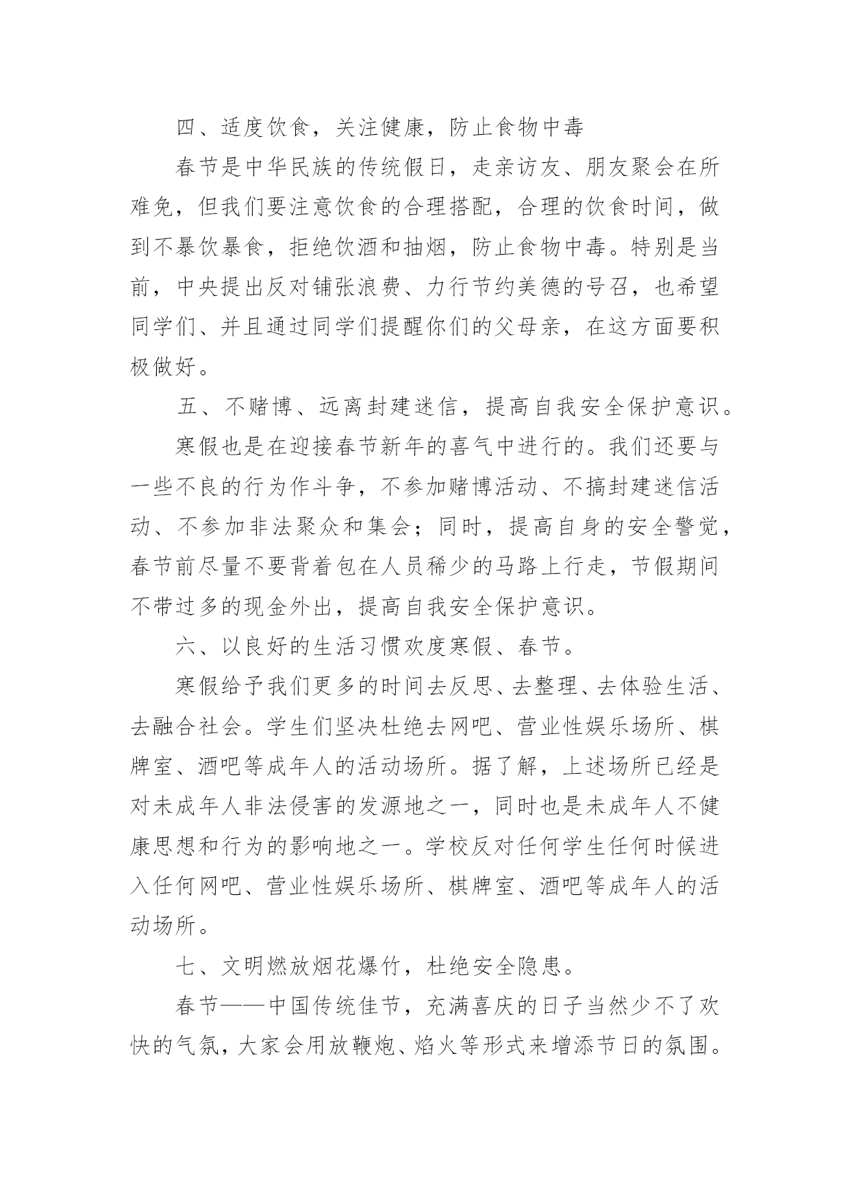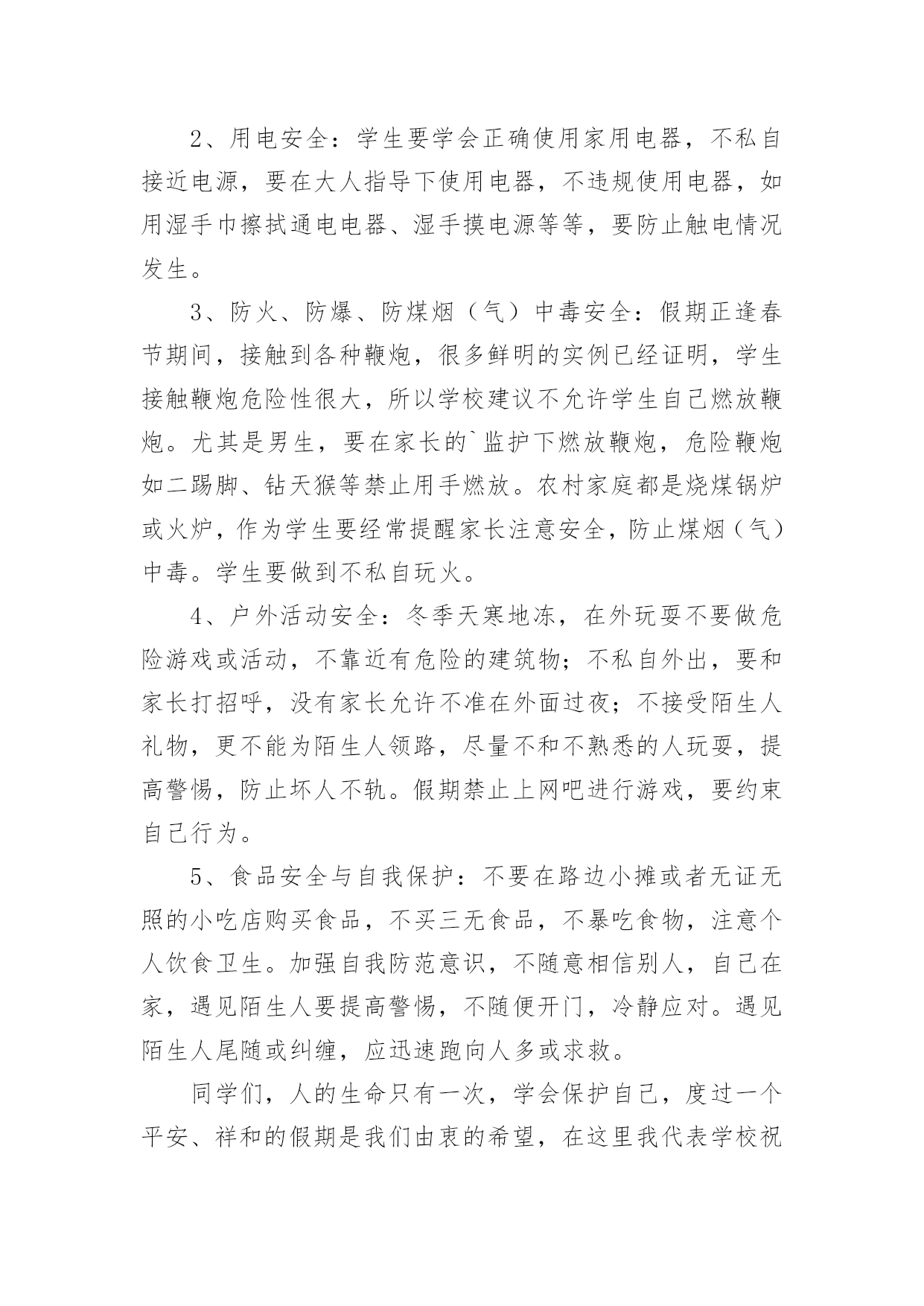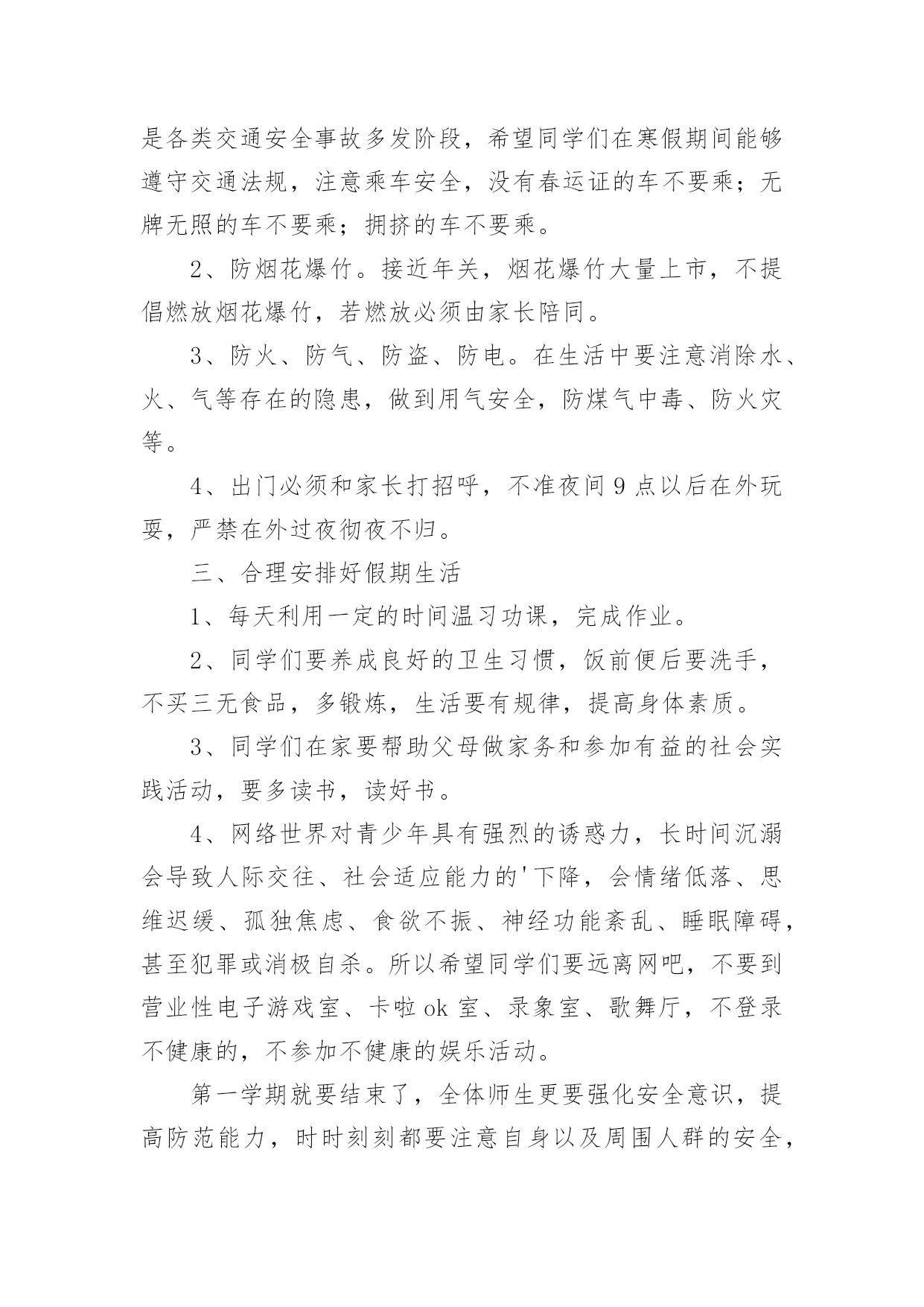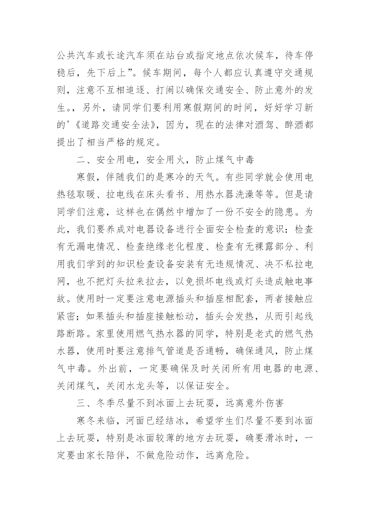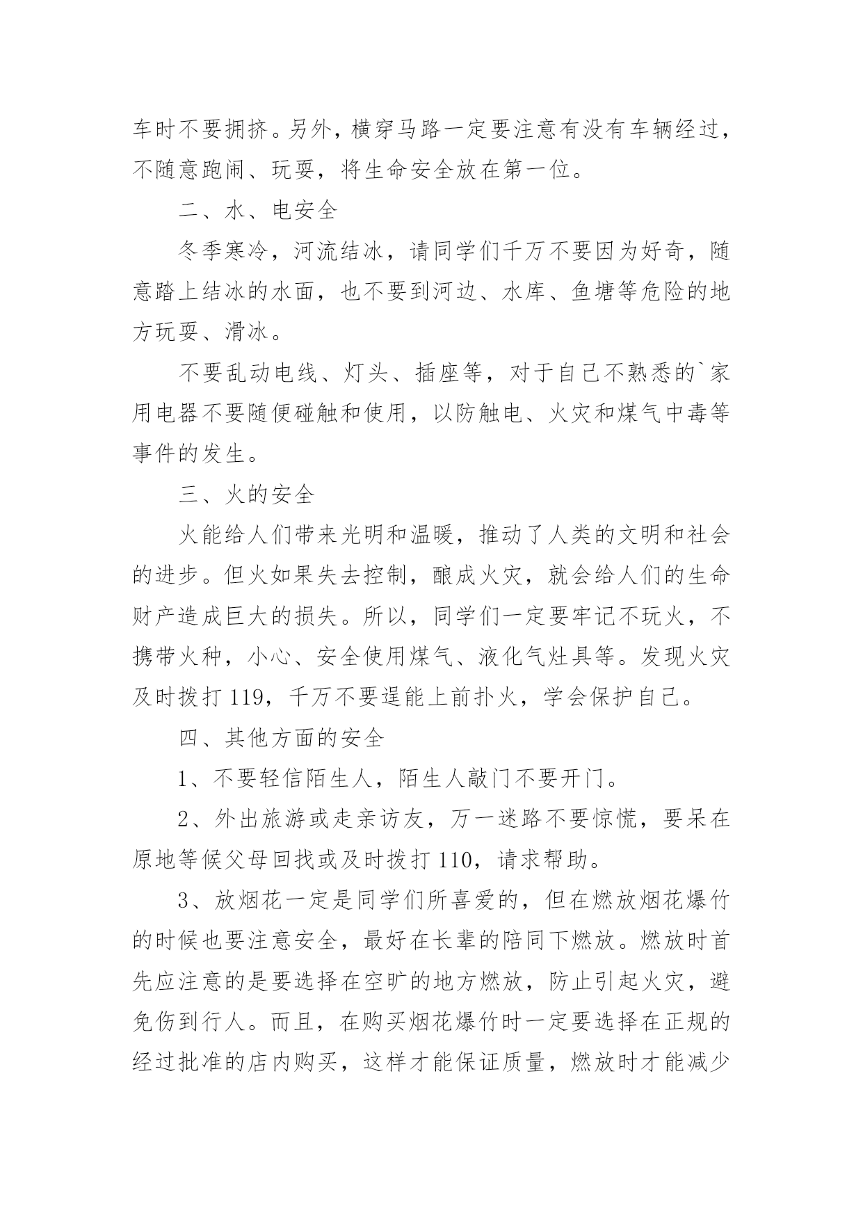 寒假交通安全精彩演讲稿寒假交通安全精彩演讲稿范文演讲稿的写法比较灵活,可以根据会议的内容、一件事事后的感想、需要等情况而有所区别。在现在的社会生活中,接触并使用演讲稿的人越来越多,大家知道演讲稿的格式吗?以下是小编精心整理的寒假交通安全精彩演讲稿范文,欢迎阅读,希望大家能够喜欢。寒假交通安全精彩演讲稿范文1尊敬的各位老师和同学们:大家好!每次,我们七都中学都要在寒暑假前组织假期安全方面的教育,我感觉这是学校对你们的关注,特别是你们家庭幸福和身心健康发展的关爱。今天,我将利用这次电波交流的机会和大家谈谈以下几个方面的话题:一、提高交通安全意识,确保安全出行为了全体教师和同学都能度过一个安全、文明、健康、愉快的寒假,我们衷心希望寒假期间,全体教师及同学要认真遵守新的《道路交通安全法》,确保安全出行。首先是要牢记交通安全最根本的原则,那就是“红灯停、绿灯行、黄灯要注意,不要闯红灯”,“走路要走人行道,过马路一定要遵循“一看、二慢、三通过”的原则”。其次,我们“乘坐公共汽车或长途汽车须在站台或指定地点依次候车,待车停稳后,先下后上”。候车期间,每个人都应认真遵守交通规则,注意不互相追逐、打闹以确保交通安全、防止意外的发生。,另外,请同学们要利用寒假期间的时间,好好学习新的'《道路交通安全法》,因为,现在的法律对酒驾、醉酒都提出了相当严格的规定。二、安全用电,安全用火,防止煤气中毒寒假,伴随我们的是寒冷的天气。有些同学就会使用电热毯取暖、拉电线在床头看书、用热水器洗澡等等。但是请同学们注意,这样也在偶然中增加了一份不安全的隐患。为此,我们要养成对电器设备进行全面安全检查的意识:检查有无漏电情况、检查绝缘老化程度、检查有无裸露部分、利用我们学到的知识检查设备安装有无违规情况、决不私拉电网,也不把灯头拉来拉去,以免损坏电线或灯头造成触电事故。使用时一定要注意电源插头和插座相配套,两者接触应紧密;如果插头和插座接触松动,插头会发热,从而引起线路断路。家里使用燃气热水器的同学,特别是老式的燃气热水器,使用时要注意排气管道是否通畅,确保通风,防止煤气中毒。外出前,一定要确保及时关闭所有用电器的电源、关闭煤气,关闭水龙头等,以保证安全。三、冬季尽量不到冰面上去玩耍,远离意外伤害寒冬来临,河面已经结冰,希望学生们尽量不要到冰面上去玩耍,特别是冰面较薄的地方去玩耍,确要滑冰时,一定要由家长陪伴,不做危险动作,远离危险。四、适度饮食,关注健康,防止食物中毒春节是中华民族的传统假日,走亲访友、朋友聚会在所难免,但我们要注意饮食的合理搭配,合理的饮食时间,做到不暴饮暴食,拒绝饮酒和抽烟,防止食物中毒。特别是当前,中央提出反对铺张浪费、力行节约美德的号召,也希望同学们、并且通过同学们提醒你们的父母亲,在这方面要积极做好。五、不赌博、远离封建迷信,提高自我安全保护意识。寒假也是在迎接春节新年的喜气中进行的。我们还要与一些不良的行为作斗争,不参加赌博活动、不搞封建迷信活动、不参加非法聚众和集会;同时,提高自身的安全警觉,春节前尽量不要背着包在人员稀少的马路上行走,节假期间不带过多的现金外出,提高自我安全保护意识。六、以良好的生活习惯欢度寒假、春节。寒假给予我们更多的时间去反思、去整理、去体验生活、去融合社会。学生们坚决杜绝去网吧、营业性娱乐场所、棋牌室、酒吧等成年人的活动场所。据了解,上述场所已经是对未成年人非法侵害的发源地之一,同时也是未成年人不健康思想和行为的影响地之一。学校反对任何学生任何时候进入任何网吧、营业性娱乐场所、棋牌室、酒吧等成年人的活动场所。七、文明燃放烟花爆竹,杜绝安全隐患。春节——中国传统佳节,充满喜庆的日子当然少不了欢快的气氛,大家会用放鞭炮、焰火等形式来增添节日的氛围。但是鞭炮、焰火的不合理使用不仅造成了大气污染、燥声污染,更造成了数不胜数的社会危害,火灾、致残等例子比比皆是。因此,我们要注意一些安全细节,防止因燃放烟花爆竹造成火灾,应将可燃物清除,避免烟花掉落引燃物品。春节期间,外出之前要注意关好门窗,再看一看窗外是否有可燃易燃的物品。楼群阳台烟火不能放。在高空中,火星容易溅落;楼群密集处,火星更容易溅落至居民家中,酿成火灾。学校提醒我们的同学,燃放烟花爆竹请到空旷场地,同时不要在大家的睡觉时间燃放(打扰人们的正常休息),做到文明燃放烟花爆竹。寒假开始,预祝老师们、同学们寒假快乐!春节快乐!平安幸福!寒假交通安全精彩演讲稿范文2亲爱的同学们:当你们沉浸在期末复习的紧张氛围中时,想必你们也在殷切地期待寒假的到来,在这样一个喜庆的假期里,安全对每个人来说都是最重要的。如何才能安全地度过一个平安、欢乐、祥和的寒假呢?在这里,希望同学们在假期能注意以下几点:一、交通安全寒假期间,正逢春运高潮,交通比较拥挤,人流量较大,因此同学们在外出时,应