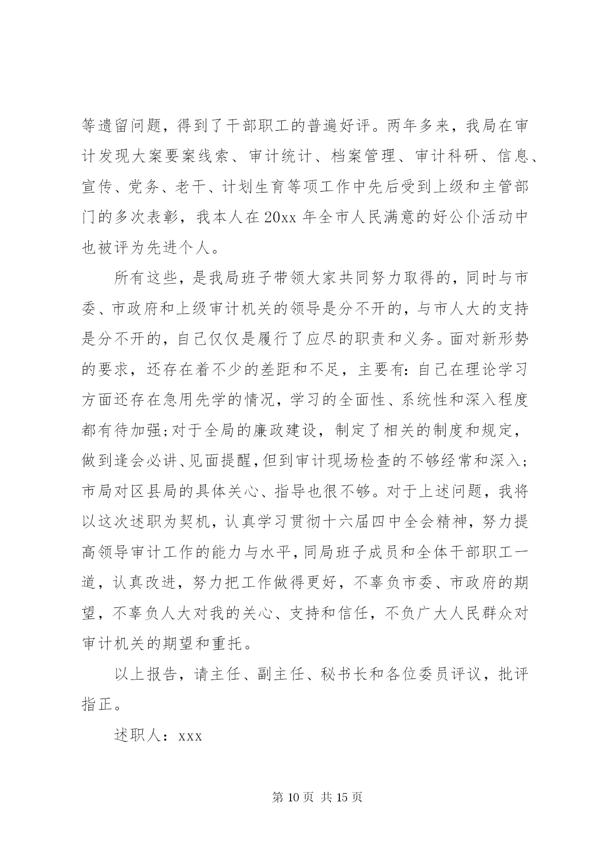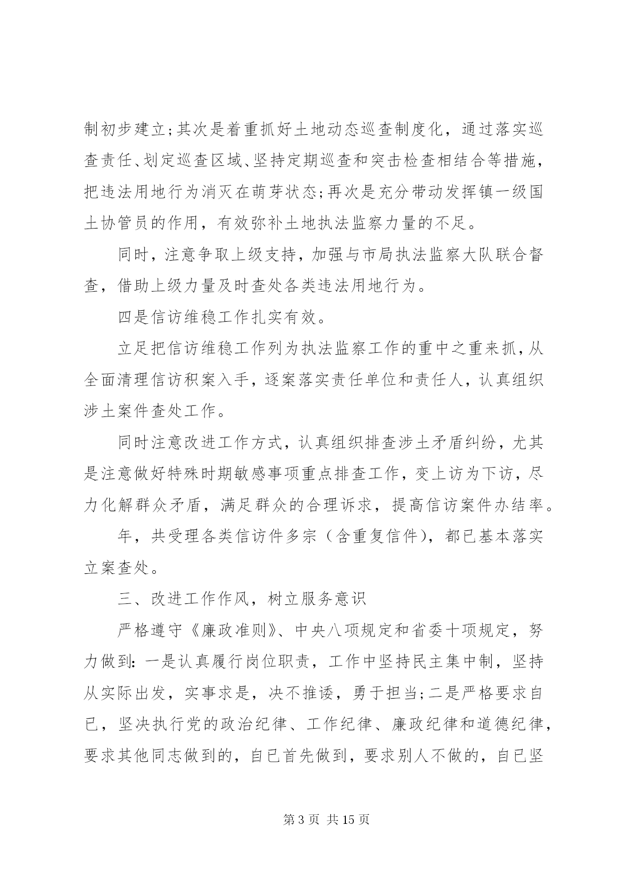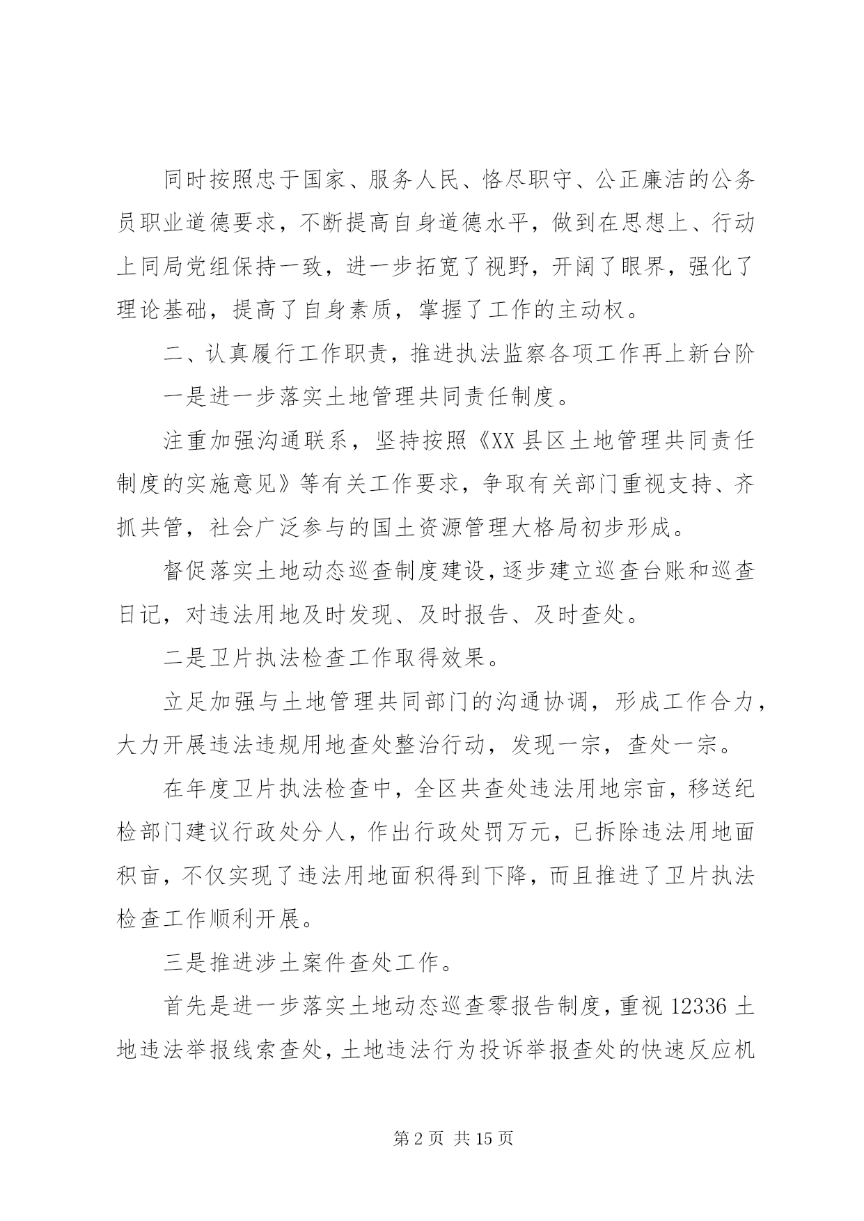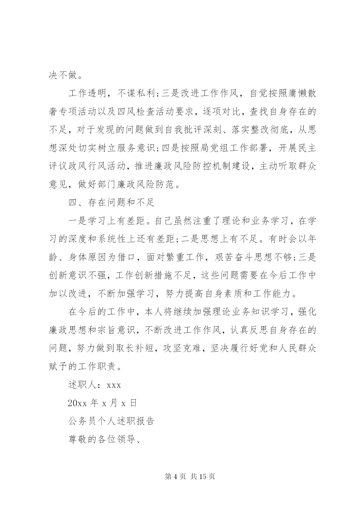 第PAGE\*Arabic\*MERGEFORMAT15页共NUMPAGES\*MERGEFORMAT15页公务员个人述职报告范文精选3篇公务员个人述职报告尊敬的各位领导、同志们:20xx年以来,本人在局党组的正确领导和全力支持下,以团结、务实的态度带领执法监察分局全体党员干部,围绕加强土地管理、查办涉土案件这一中心工作,贯彻刚性执法、主动服务理念,努力化解土地信访纠纷,积极探索土地管理新思路,切实维护社会稳定。同时,做到认真贯彻落实党风廉政建设责任制,加强廉洁自律,狠抓作风建设,在执法监察分局全体同志的努力和配合下,*完成了领导交办的各项工作任务。现结合年度干部考核工作要求,将本人一年来学习、工作、以及道德、廉政建设方面情况报告如下:一、加强理论学习,重视道德修养,提升自身综合素质为更好适应工作需求,本人积极参加国土系统的学习、培训活动,坚持集体学习和自主学习相结合、理论学习和实践学习相结合,重点加强了党的方针政策的学习,尤其是学习科学发展观等新形势下的新理论,坚持用科学发展观指导国土执法监察工作。在理论学习的基础上,进一步加强党性修养,增强了宗旨观念、廉政思想。同时按照忠于国家、服务人民、恪尽职守、公正廉洁的公务员职业道德要求,不断提高自身道德水平,做到在思想上、行动上同局党组保持一致,进一步拓宽了视野,开阔了眼界,强化了理论基础,提高了自身素质,掌握了工作的主动权。二、认真履行工作职责,推进执法监察各项工作再上新台阶一是进一步落实土地管理共同责任制度。注重加强沟通联系,坚持按照《XX县区土地管理共同责任制度的实施意见》等有关工作要求,争取有关部门重视支持、齐抓共管,社会广泛参与的国土资源管理大格局初步形成。督促落实土地动态巡查制度建设,逐步建立巡查台账和巡查日记,对违法用地及时发现、及时报告、及时查处。二是卫片执法检查工作取得效果。立足加强与土地管理共同部门的沟通协调,形成工作合力,大力开展违法违规用地查处整治行动,发现一宗,查处一宗。在年度卫片执法检查中,全区共查处违法用地宗亩,移送纪检部门建议行政处分人,作出行政处罚万元,已拆除违法用地面积亩,不仅实现了违法用地面积得到下降,而且推进了卫片执法检查工作顺利开展。三是推进涉土案件查处工作。首先是进一步落实土地动态巡查零报告制度,重视12336土地违法举报线索查处,土地违法行为投诉举报查处的快速反应机制初步建立;其次是着重抓好土地动态巡查制度化,通过落实巡查责任、划定巡查区域、坚持定期巡查和突击检查相结合等措施,把违法用地行为消灭在萌芽状态;再次是充分带动发挥镇一级国土协管员的作用,有效弥补土地执法监察力量的不足。同时,注意争取上级支持,加强与市局执法监察大队联合督查,借助上级力量及时查处各类违法用地行为。四是信访维稳工作扎实有效。立足把信访维稳工作列为执法监察工作的重中之重来抓,从全面清理信访积案入手,逐案落实责任单位和责任人,认真组织涉土案件查处工作。同时注意改进工作方式,认真组织排查涉土矛盾纠纷,尤其是注意做好特殊时期敏感事项重点排查工作,变上访为下访,尽力化解群众矛盾,满足群众的合理诉求,提高信访案件办结率。年,共受理各类信访件多宗(含重复信件),都已基本落实立案查处。三、改进工作作风,树立服务意识严格遵守《廉政准则》、中央八项规定和省委十项规定,努力做到:一是认真履行岗位职责,工作中坚持民主集中制,坚持从实际出发,实事求是,决不推诿,勇于担当;二是严格要求自已,坚决执行党的政治纪律、工作纪律、廉政纪律和道德纪律,要求其他同志做到的,自已首先做到,要求别人不做的,自已坚决不做。工作透明,不谋私利;三是改进工作作风,自觉按照庸懒散奢专项活动以及四风检查活动要求,逐项对比,查找自身存在的不足,对于发现的问题做到自我批评深刻、落实整改彻底,从思想深处切实树立服务意识;四是按照局党组工作部署,开展民主评议政风行风活动,推进廉政风险防控机制建设,主动听取群众意见,做好部门廉政风险防范。四、存在问题和不足一是学习上有差距。自己虽然注重了理论和业务学习,在学习的深度和系统性上还有差距;二是思想上有不足。有时会以年龄、身体原因为借口,面对繁重工作,艰苦奋斗思想不够;三是创新意识不强,工作创新措施不足,这些问题需要在今后工作中加以改进,不断加强学习,努力提高自身素质和工作能力。在今后的工作中,本人将继续加强理论业务知识学习,强化廉政思想和宗旨意识,不断改进工作作风,认真反思自身存在的问题,努力做到取长补短,攻坚克难,坚决履行好党和人民群众赋予的工作职责。述职人:xxx20xx年x月x日公务员个人述职报告尊敬的各位领导、同志们:200x年5月,市人大会任命我为市审计局局长。这次安排我向市人大会述职,既是对我履行职责情况的监督,也是对我个人的关心和爱护,更体现