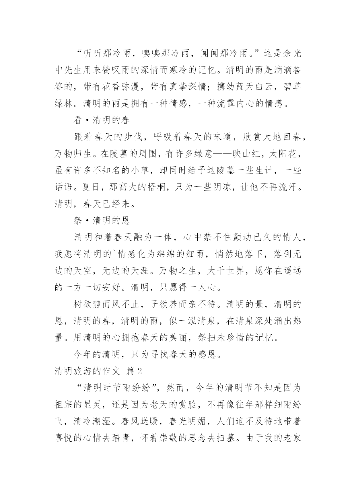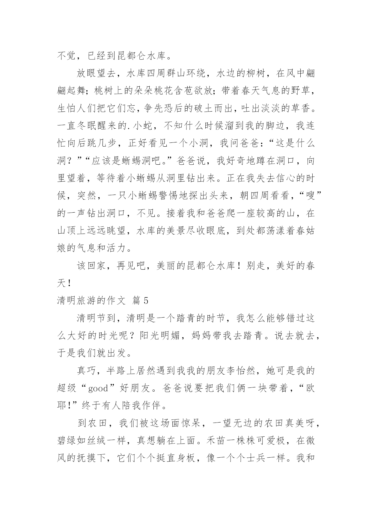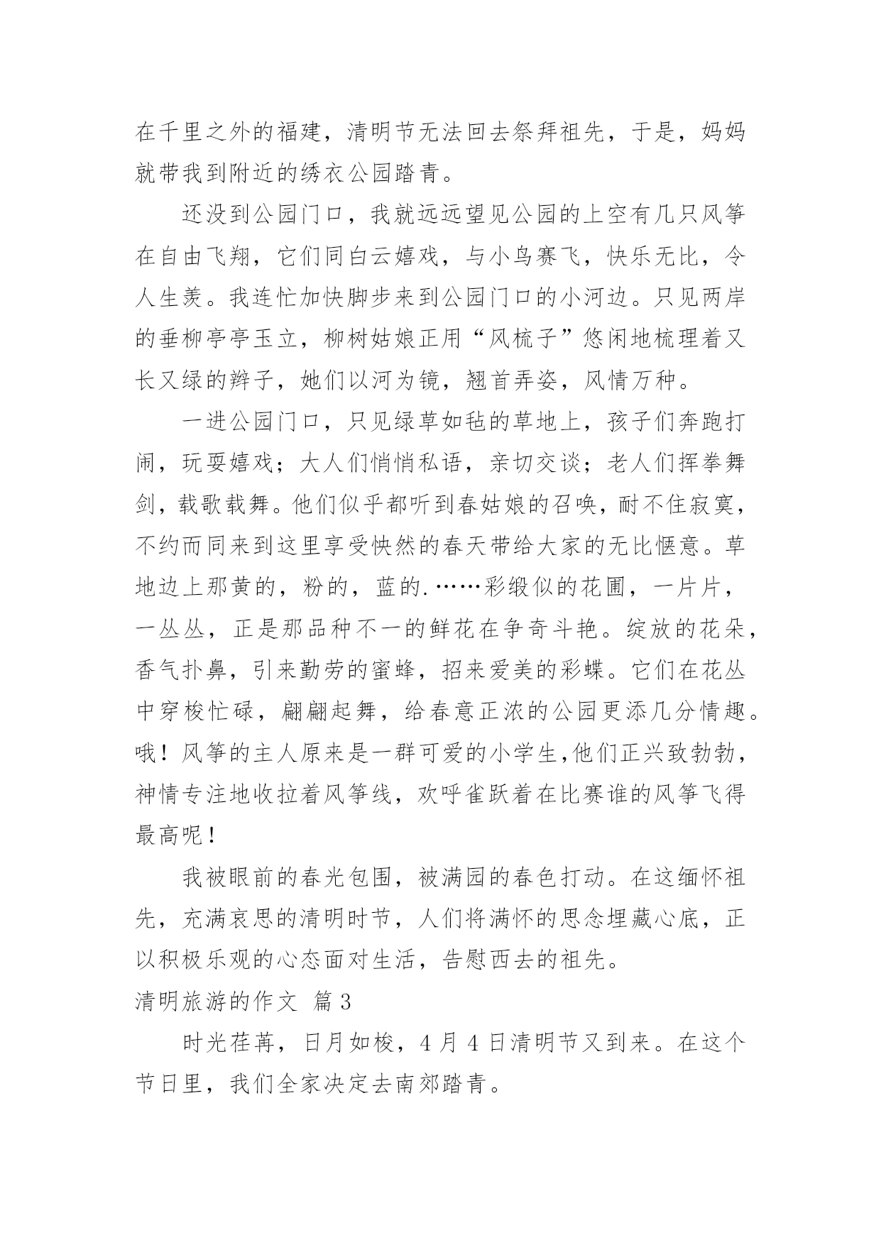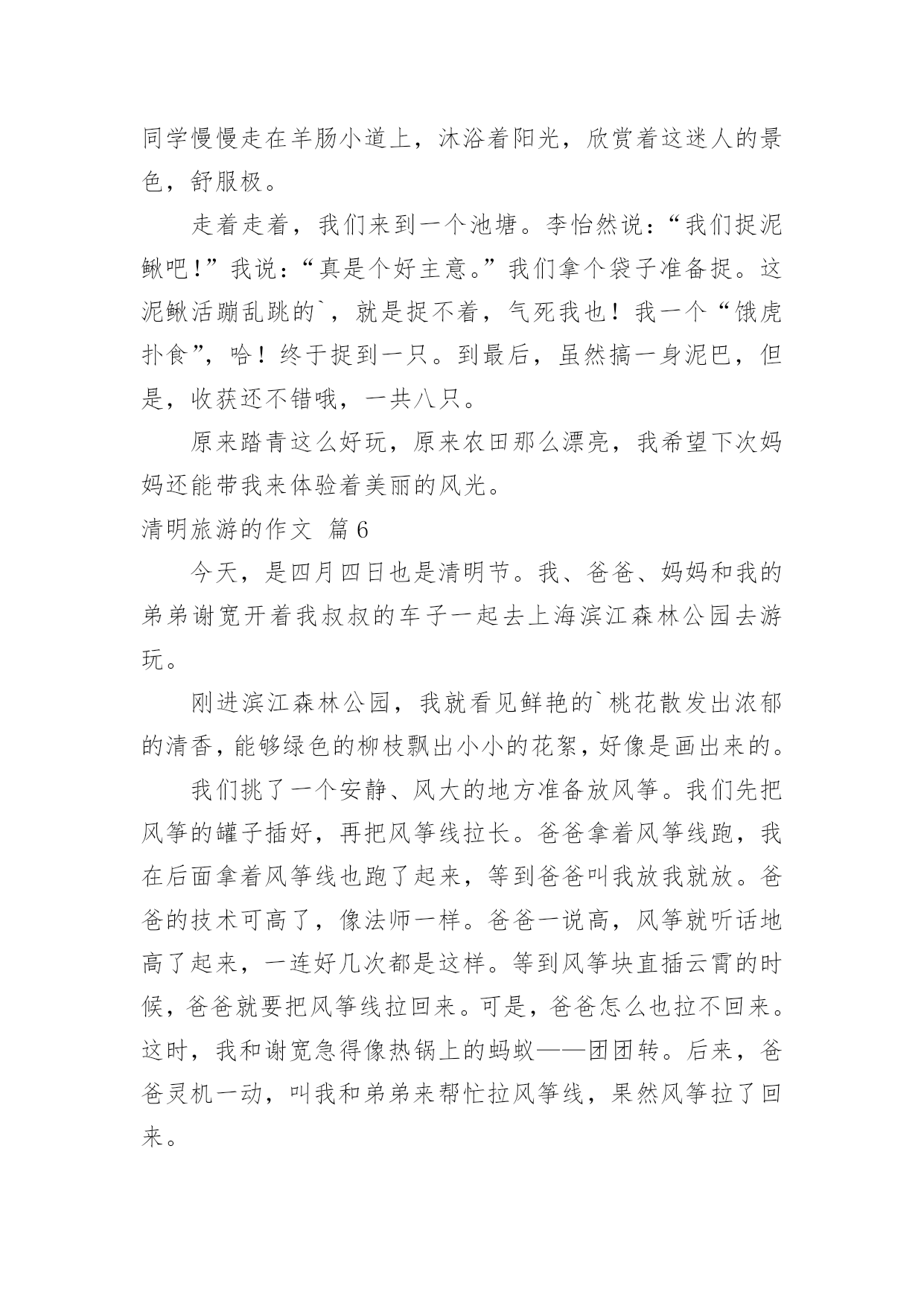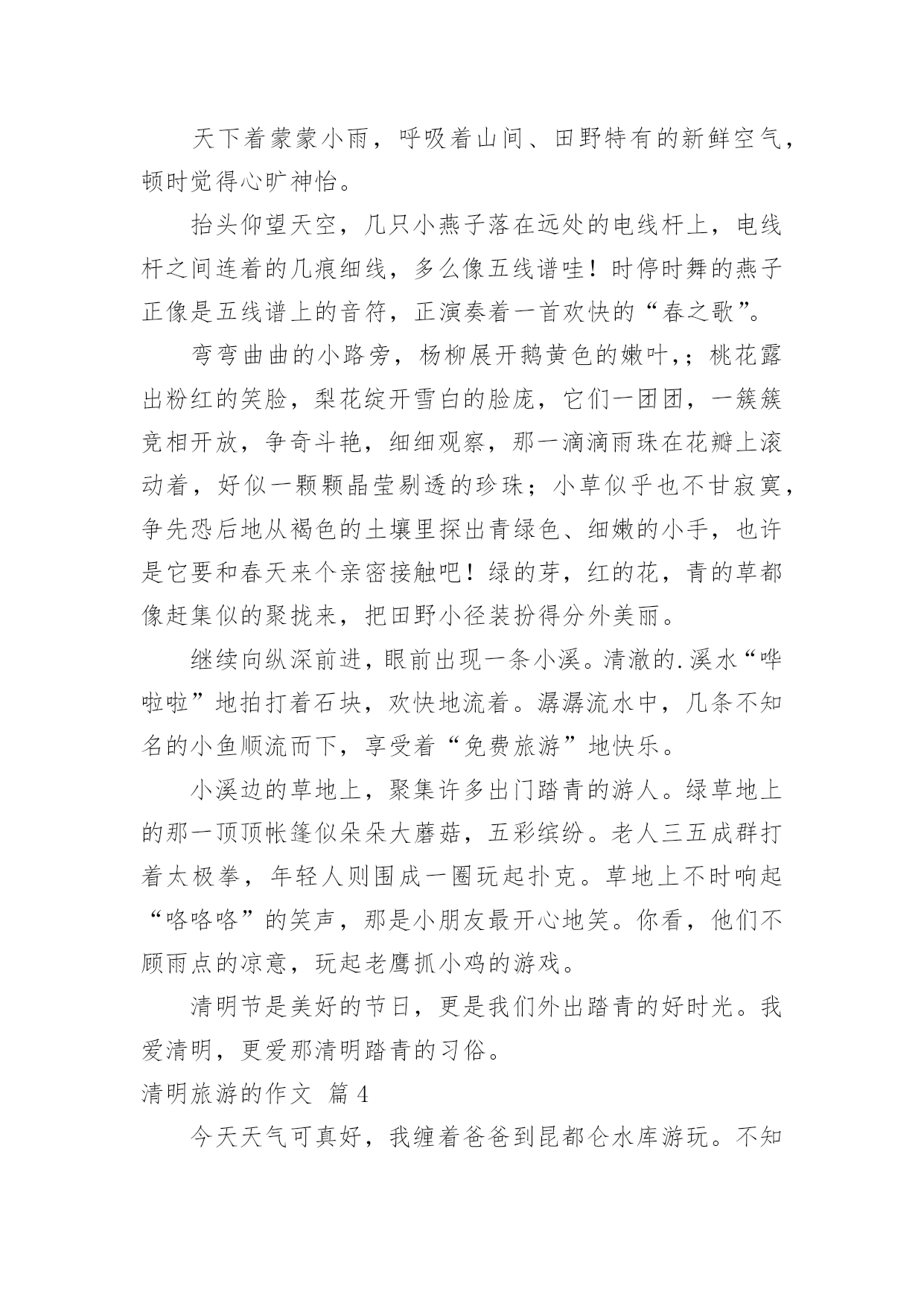 清明旅游的作文清明旅游的作文合集六篇在学习、工作或生活中,大家对作文都不陌生吧,作文根据写作时限的不同可以分为限时作文和非限时作文。那么一般作文是怎么写的呢?下面是小编收集整理的清明旅游的作文6篇,仅供参考,欢迎大家阅读。清明旅游的作文篇1和煦的微风,吹动沙沙的树叶;思念的春雨,拍到行人幽魂处;这是,春意正浓。——题记春的生力无穷,不久,便长出草和叶,正值清明,便踏上寻找春意的路。“清明时节雨纷纷,路上行人欲断魂。”虽说江南时雨繁多,可见,今年的清明却与往前不同,阳光明媚,鸟语花香,给怀有思念之人给予更多真挚的情感,便给寻春有一个完美的意向。风飘飘,雨潇潇,落英遍地,断柳横坡,柳絮轻扬,蜂蝶慵舞。怀念那份感情,原本的那份浓溢的味道。我不由地想到多年前写的那样一句:值至清明踏寻春,缅怀家先念祖恩。漫山遍野的怀念与追思,缀满青柳的枝头。阴冷的春风,萧萧瑟瑟,凄凄摇落灰蒙而久远的记忆。我想到那些回忆,那些未珍惜的记忆……听·清明的雨“听听那冷雨,嗅嗅那冷雨,闻闻那冷雨。”这是余光中先生用来赞叹雨的深情而寒冷的记忆。清明的雨是滴滴答答的,带有花香弥漫,带有真挚深情;携幼蓝天白云,碧草绿林。清明的雨是拥有一种情感,一种流露内心的情感。看·清明的春跟着春天的步伐,呼吸着春天的味道,欣赏大地回春,万物归生。在陵墓的周围,有许多绿意——映山红,太阳花,虽有许多不知名的小草,却同时给予这陵墓一些生计,一些话语。夏日,那高大的梧桐,只为一些阴凉,让他不再流汗。清明,春天已经来。祭·清明的恩清明和着春天融为一体,心中禁不住颤动已久的情人,我愿将清明的`情感化为绵绵的细雨,悄然地落下,落到无边的天空,无边的天涯。万物之生,大千世界,愿你在遥远的一方一切安好。清明,只愿得一人心。树欲静而风不止,子欲养而亲不待。清明的景,清明的恩,清明的春,清明的雨,似一泓清泉,在清泉深处涌出热量。用清明的心拥抱春天的美丽,祭扫未珍惜的记忆。今年的清明,只为寻找春天的感恩。清明旅游的作文篇2“清明时节雨纷纷”,然而,今年的清明节不知是因为祖宗的显灵,还是因为老天的赏脸,不再像往年那样细雨纷飞,清冷潮湿。春风送暖,春光明媚,人们迫不及待地带着喜悦的心情去踏青,怀着崇敬的思念去扫墓。由于我的老家在千里之外的福建,清明节无法回去祭拜祖先,于是,妈妈就带我到附近的绣衣公园踏青。还没到公园门口,我就远远望见公园的上空有几只风筝在自由飞翔,它们同白云嬉戏,与小鸟赛飞,快乐无比,令人生羡。我连忙加快脚步来到公园门口的小河边。只见两岸的垂柳亭亭玉立,柳树姑娘正用“风梳子”悠闲地梳理着又长又绿的辫子,她们以河为镜,翘首弄姿,风情万种。一进公园门口,只见绿草如毡的草地上,孩子们奔跑打闹,玩耍嬉戏;大人们悄悄私语,亲切交谈;老人们挥拳舞剑,载歌载舞。他们似乎都听到春姑娘的召唤,耐不住寂寞,不约而同来到这里享受怏然的春天带给大家的无比惬意。草地边上那黄的,粉的,蓝的.……彩缎似的花圃,一片片,一丛丛,正是那品种不一的鲜花在争奇斗艳。绽放的花朵,香气扑鼻,引来勤劳的蜜蜂,招来爱美的彩蝶。它们在花丛中穿梭忙碌,翩翩起舞,给春意正浓的公园更添几分情趣。哦!风筝的主人原来是一群可爱的小学生,他们正兴致勃勃,神情专注地收拉着风筝线,欢呼雀跃着在比赛谁的风筝飞得最高呢!我被眼前的春光包围,被满园的春色打动。在这缅怀祖先,充满哀思的清明时节,人们将满怀的思念埋藏心底,正以积极乐观的心态面对生活,告慰西去的祖先。清明旅游的作文篇3时光荏苒,日月如梭,4月4日清明节又到来。在这个节日里,我们全家决定去南郊踏青。天下着蒙蒙小雨,呼吸着山间、田野特有的新鲜空气,顿时觉得心旷神怡。抬头仰望天空,几只小燕子落在远处的电线杆上,电线杆之间连着的几痕细线,多么像五线谱哇!时停时舞的燕子正像是五线谱上的音符,正演奏着一首欢快的“春之歌”。弯弯曲曲的小路旁,杨柳展开鹅黄色的嫩叶,;桃花露出粉红的笑脸,梨花绽开雪白的脸庞,它们一团团,一簇簇竞相开放,争奇斗艳,细细观察,那一滴滴雨珠在花瓣上滚动着,好似一颗颗晶莹剔透的珍珠;小草似乎也不甘寂寞,争先恐后地从褐色的土壤里探出青绿色、细嫩的小手,也许是它要和春天来个亲密接触吧!绿的芽,红的花,青的草都像赶集似的聚拢来,把田野小径装扮得分外美丽。继续向纵深前进,眼前出现一条小溪。清澈的.溪水“哗啦啦”地拍打着石块,欢快地流着。潺潺流水中,几条不知名的小鱼顺流而下,享受着“免费旅游”地快乐。小溪边的草地上,聚集许多出门踏青的游人。绿草地上的那一顶顶帐篷似朵朵大蘑菇,五彩缤纷。老人三五成群打着太极拳,年轻人则围成一圈玩起扑克。草地上不时响起“咯咯咯”的笑声,那是小朋友最开心地笑。你看,他们不顾雨点的凉意,玩起老鹰抓小鸡的游戏。清明节是美好的节日,更是我们外出踏青的好时光。我爱清明,更爱那