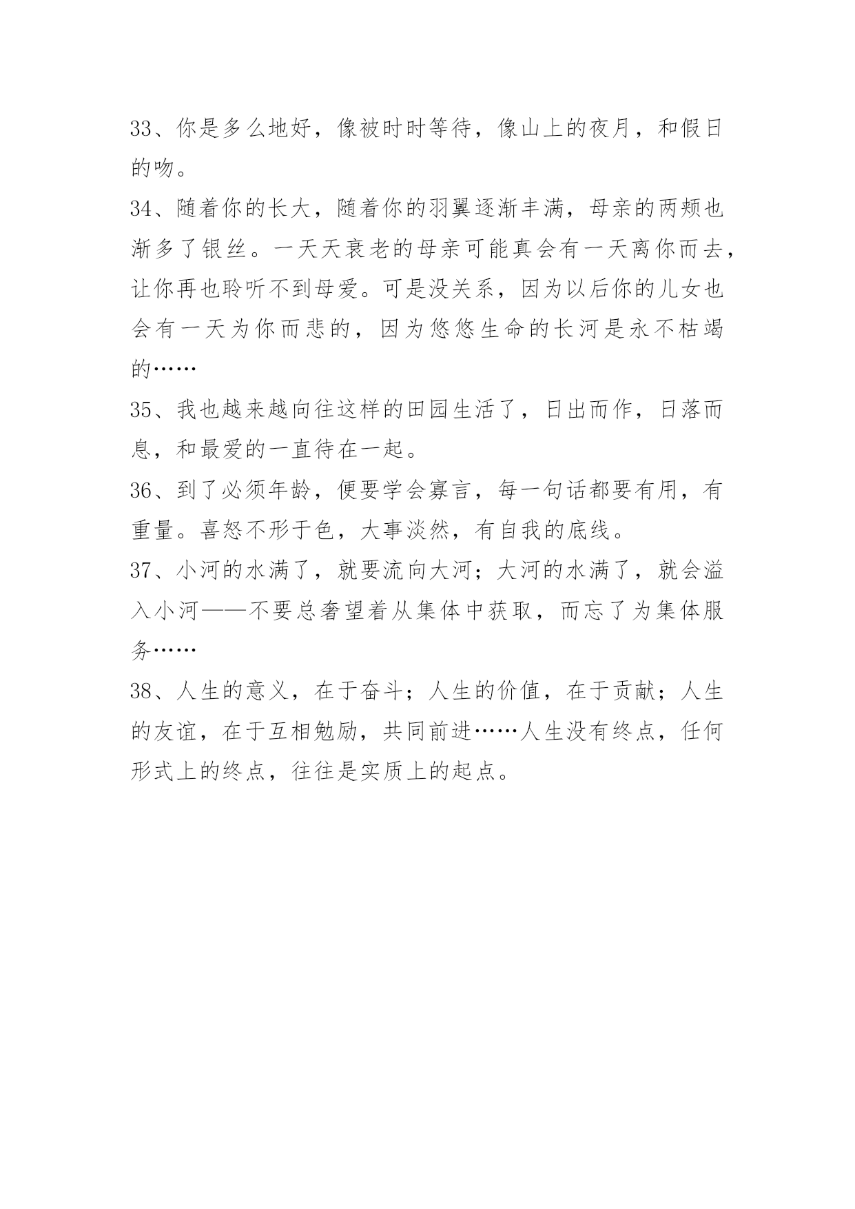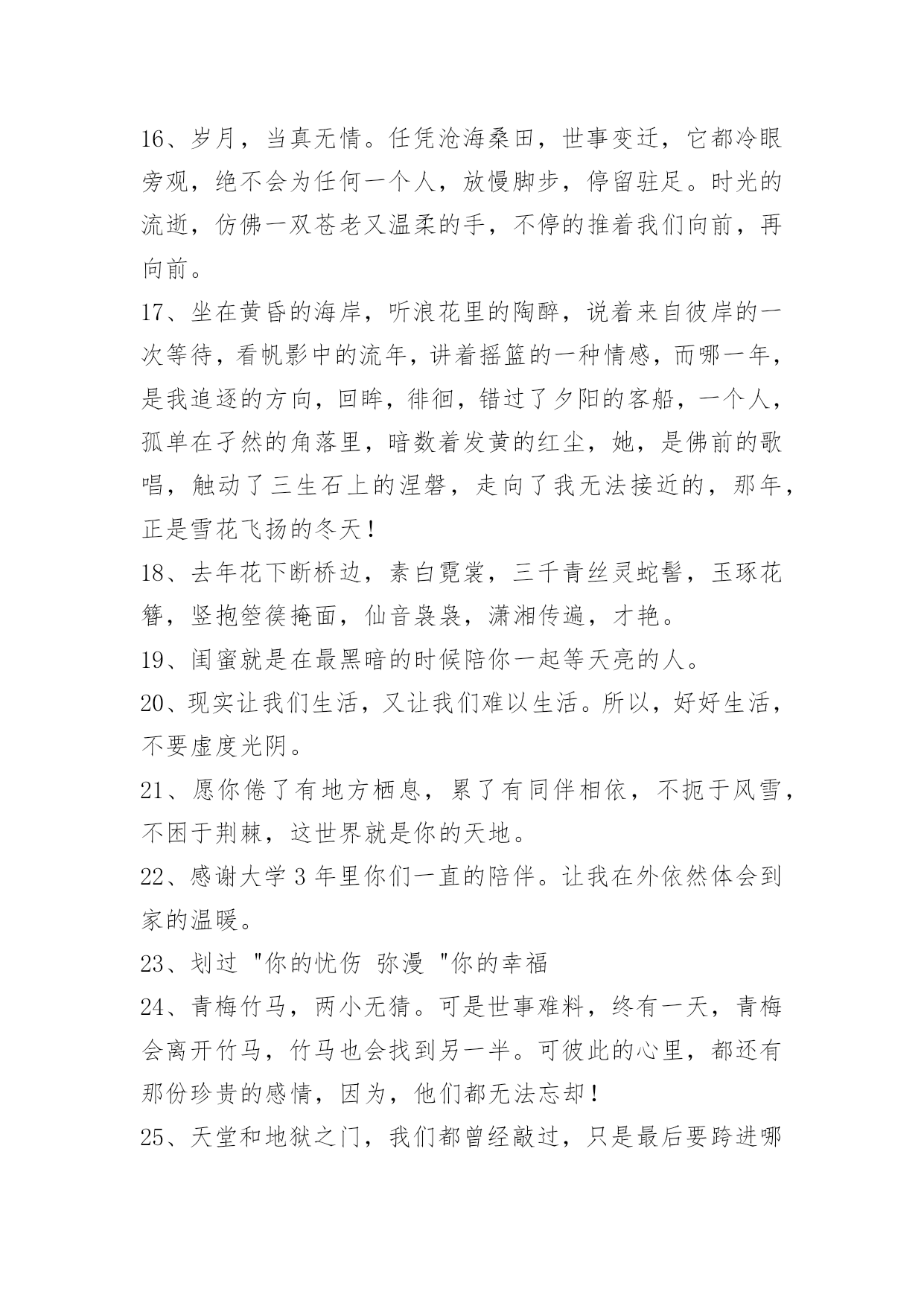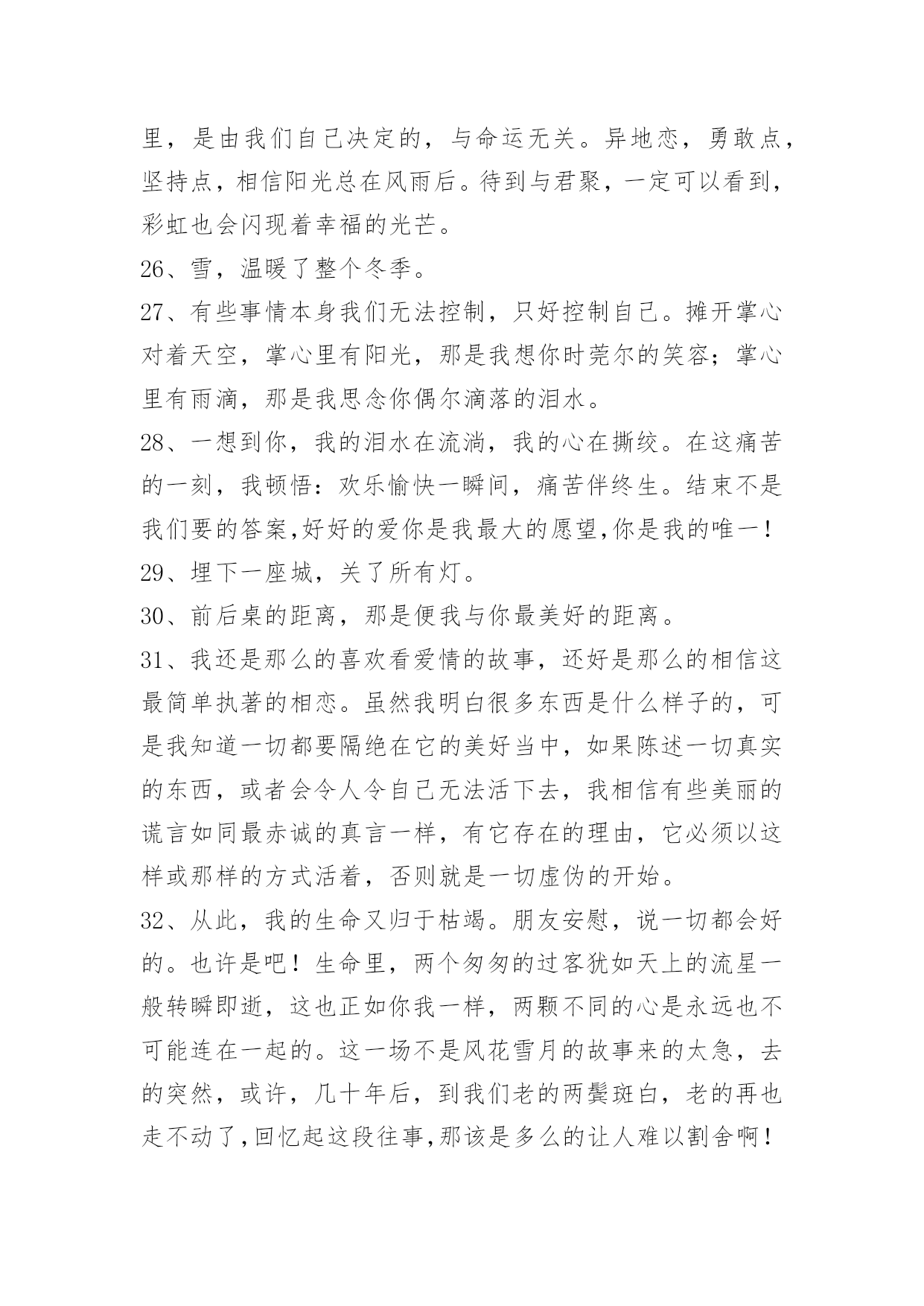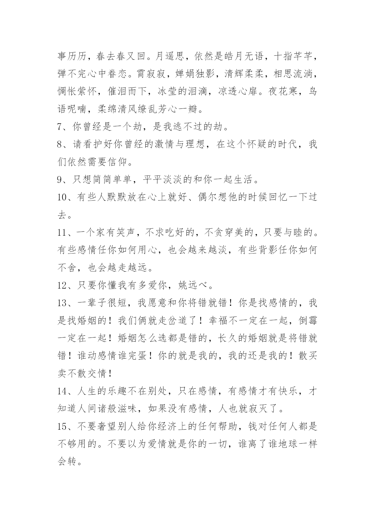 唯美经典句子38条【实用】唯美经典句子合集38条玫瑰花注定要遭受危险,或许被人摘走,或许被欣赏时不小心伤害。以下是关于唯美经典句子38条,欢迎大家前来欣赏。1、常忆江南,总有小巷里的身影随我入梦,四月花开酴釄,迂腐的运河滨,那临水一笑,融在水乡的烟雾中,浓淡适宜。隐入通宵枕边的,然则谁人季候后,春雨如丝后带来的泥泞。月缺,梦已伤,纵飞红如雨,回想的温也圆不了一个影象的完备。芳华,在蹉跎中扬弃。2、都说世间难寻知音,的确不假,我也相信,但总有遇见,在每一次的擦肩中,或许都来不及珍惜,已经远去,寻找生命存在的安然,即便是一份友谊,难知的人,用珍惜的双手,握紧属于你们的,就算未能长久,也用高傲的姿态,笑着去迎接那些友情怀知的人们。3、窗外北风呼呼吹,我把人儿来忖量。一日不见三秋念,对你顾虑日中天。无意打个小喷涕,那是我把你惦念。赶忙回我短信息,莫要危险我真心!4、彼岸的花开得无比妖艳,却又奈何长在无法触及的彼岸,而通往彼岸的小舟,已不知漂泊到了何处。5、千年以后,繁荣落幕,我依然为你等候。千年以后,繁华谢幕,我依然为你守候。6、明月照深院,幽径人未还。手轻弹旧曲,花也含悲绪。事历历,春去春又回。月遥思,依然是皓月无语,十指芊芊,弹不完心中眷恋。霄寂寂,婵娟独影,清辉柔柔,相思流淌,惆怅萦怀,催泪而下,冰莹的泪滴,凉透心扉。夜花寒,鸟语呢喃,柔绵清风缭乱芳心一瓣。7、你曾经是一个劫,是我逃不过的劫。8、请看护好你曾经的激情与理想,在这个怀疑的时代,我们依然需要信仰。9、只想简简单单,平平淡淡的和你一起生活。10、有些人默默放在心上就好、偶尔想他的时候回忆一下过去。11、一个家有笑声,不求吃好的,不贪穿美的,只要与睦的。有些感情任你如何用心,也会越来越淡,有些背影任你如何不舍,也会越走越远。12、只要你懂我有多爱你,姚远べ。13、一辈子很短,我愿意和你将错就错!你是找感情的,我是找婚姻的!我们俩就走岔道了!幸福不一定在一起,倒霉一定在一起!婚姻怎么选都是错的,长久的婚姻就是将错就错!谁动感情谁完蛋!你的就是我的,我的还是我的!散买卖不散交情!14、人生的乐趣不在别处,只在感情,有感情才有快乐,才知道人间诸般滋味,如果没有感情,人也就寂灭了。15、不要奢望别人给你经济上的任何帮助,钱对任何人都是不够用的。不要以为爱情就是你的一切,谁离了谁地球一样会转。16、岁月,当真无情。任凭沧海桑田,世事变迁,它都冷眼旁观,绝不会为任何一个人,放慢脚步,停留驻足。时光的流逝,仿佛一双苍老又温柔的手,不停的推着我们向前,再向前。17、坐在黄昏的海岸,听浪花里的陶醉,说着来自彼岸的一次等待,看帆影中的流年,讲着摇篮的一种情感,而哪一年,是我追逐的方向,回眸,徘徊,错过了夕阳的客船,一个人,孤单在孑然的角落里,暗数着发黄的红尘,她,是佛前的歌唱,触动了三生石上的涅磐,走向了我无法接近的,那年,正是雪花飞扬的冬天!18、去年花下断桥边,素白霓裳,三千青丝灵蛇髻,玉琢花簪,竖抱箜篌掩面,仙音袅袅,潇湘传遍,才艳。19、闺蜜就是在最黑暗的时候陪你一起等天亮的人。20、现实让我们生活,又让我们难以生活。所以,好好生活,不要虚度光阴。21、愿你倦了有地方栖息,累了有同伴相依,不扼于风雪,不困于荆棘,这世界就是你的天地。22、感谢大学3年里你们一直的陪伴。让我在外依然体会到家的温暖。23、划过"你的忧伤弥漫"你的幸福24、青梅竹马,两小无猜。可是世事难料,终有一天,青梅会离开竹马,竹马也会找到另一半。可彼此的心里,都还有那份珍贵的感情,因为,他们都无法忘却!25、天堂和地狱之门,我们都曾经敲过,只是最后要跨进哪里,是由我们自己决定的,与命运无关。异地恋,勇敢点,坚持点,相信阳光总在风雨后。待到与君聚,一定可以看到,彩虹也会闪现着幸福的光芒。26、雪,温暖了整个冬季。27、有些事情本身我们无法控制,只好控制自己。摊开掌心对着天空,掌心里有阳光,那是我想你时莞尔的笑容;掌心里有雨滴,那是我思念你偶尔滴落的泪水。28、一想到你,我的泪水在流淌,我的心在撕绞。在这痛苦的一刻,我顿悟:欢乐愉快一瞬间,痛苦伴终生。结束不是我们要的答案,好好的爱你是我最大的愿望,你是我的唯一!29、埋下一座城,关了所有灯。30、前后桌的距离,那是便我与你最美好的距离。31、我还是那么的喜欢看爱情的故事,还好是那么的相信这最简单执著的相恋。虽然我明白很多东西是什么样子的,可是我知道一切都要隔绝在它的美好当中,如果陈述一切真实的东西,或者会令人令自己无法活下去,我相信有些美丽的谎言如同最赤诚的真言一样,有它存在的理由,它必须以这样或那样的方式活着,否则就是一切虚伪的开始。32、从此,我的生命又归于枯竭。朋友安慰,说一切都会好的。也许是吧!生命里,两个匆匆的过客犹如天上的流星一般转瞬即逝,这也正如你我