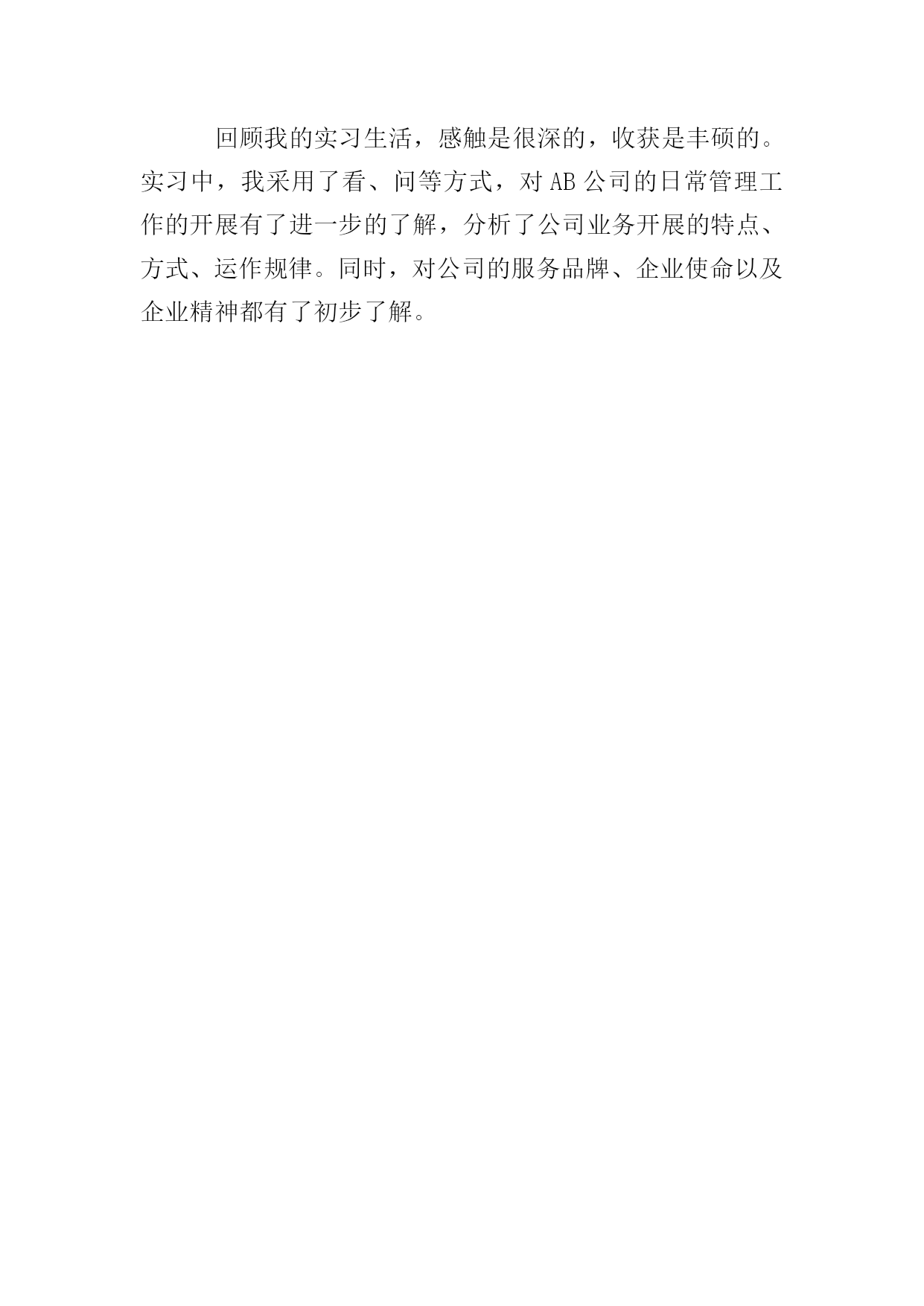 工商管理专业自我鉴定报告一个工商管理专业大学生的实习和工作鉴定样本,供参加实习的大学生朋友们参考。...今年开始,我在某工程公司附属单位AB公司进行了工商管理实习工作。在实习中,我在公司指导老师的热心指导下,积极参与公司日常管理相关工作,注意把书本上学到的工商管理理论知识对照实际工作,用理论知识加深对实际工作的认识,用实践验证所学的工商管理理论,探求日常管理工作的本质与规律。简短的实习生活,既紧张,又新奇,收获也很多。通过实习,使我对日常管理工作有了深层次的感性和理性的认识。我所实习的AB公司,隶属于某工程公司。该工程公司是以水工、市政、工民建、路桥、安装工程等为主要经营项目的国有大型骨干建筑施工企业,具有航务工程总承包一级、房建二级、市政、水利水电三级、地基与基础一级、钢结构一级、机电设备安装一级、商砼与预制构件二级、勘察设计甲级、计量二级、建筑材料试验甲级等资质。公司现有正式职工3000余名,先进的工程技术装备千余台;拥有2.6万平方米的高层办公楼和30多万平方米的生产基地;近700米的工作船码头和4万余平方米的海域,固定资产达3亿多元。公司于1998年通过了ISO9002质量体系认证;1999年通过了ISO10012国际标准认证,取得了”计量保证确认合格证书”;20xx年通过了ISO9001国际质量管理体系认证。回顾我的实习生活,感触是很深的,收获是丰硕的。实习中,我采用了看、问等方式,对AB公司的日常管理工作的开展有了进一步的了解,分析了公司业务开展的特点、方式、运作规律。同时,对公司的服务品牌、企业使命以及企业精神都有了初步了解。