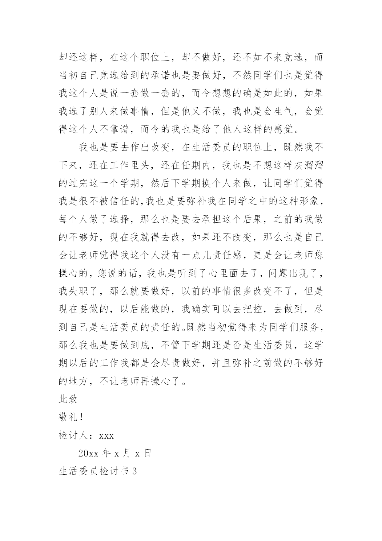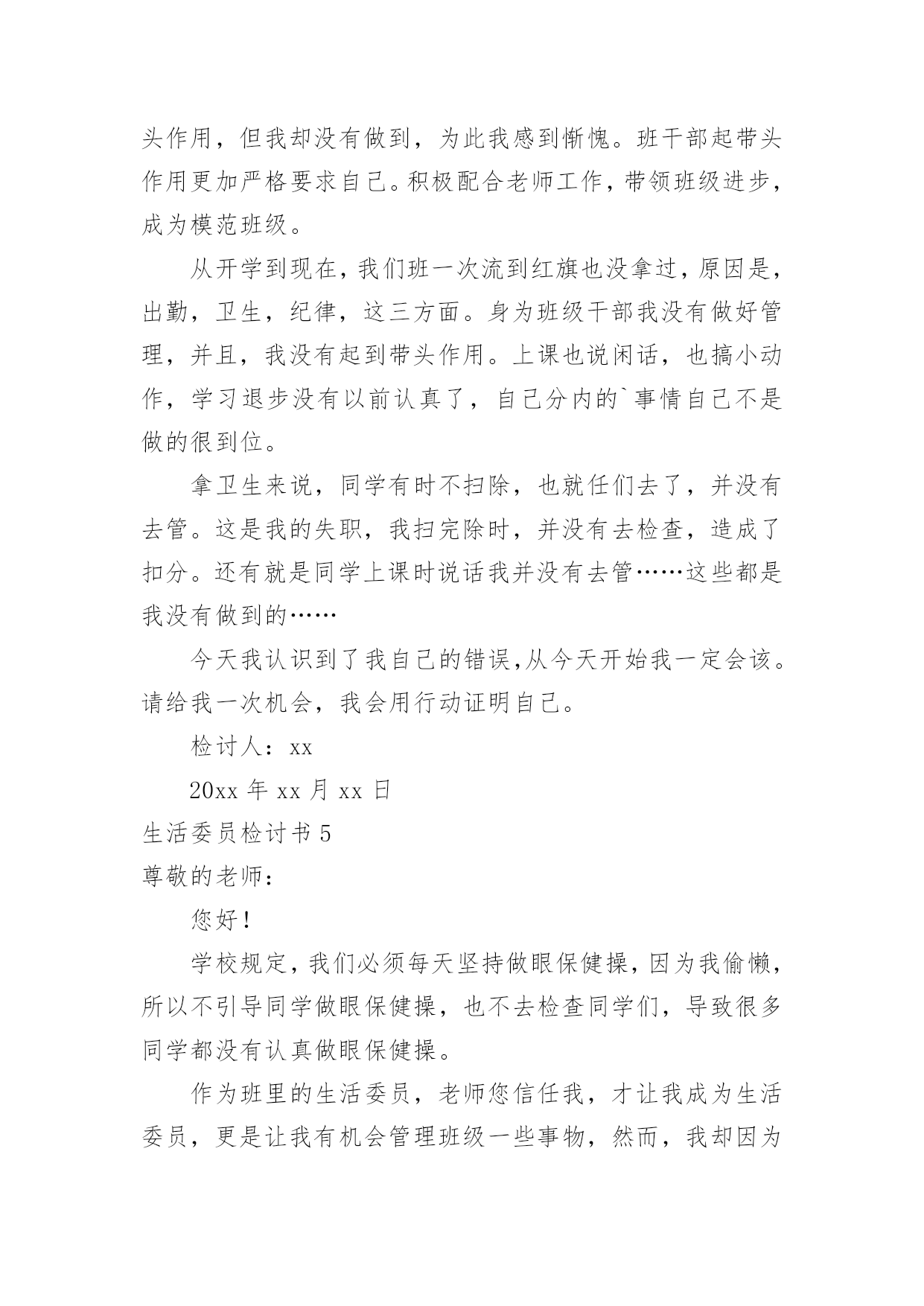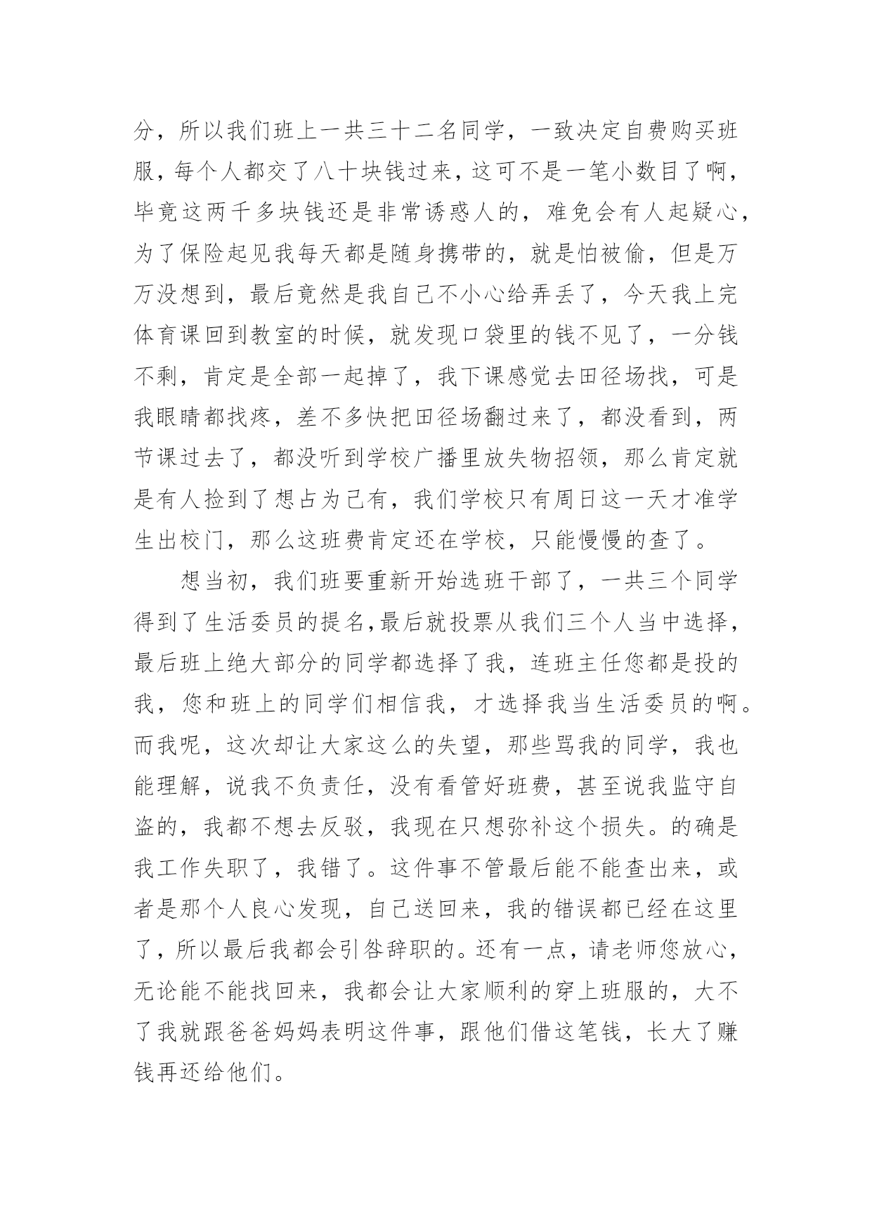 生活委员检讨书生活委员检讨书在不小心犯错后,为了避免今后再出此类事件,往往被要求写检讨书来自我反思,请注意写检讨要把原因讲清楚。想写检讨书却不知道该请教谁?以下是小编整理的生活委员检讨书,欢迎阅读,希望大家能够喜欢。生活委员检讨书1尊敬的老师:您好!非常抱歉,我作为班上的生活委员,我这次出现了重大的失职,因为我的疏忽,我把三天后班级比赛购买班服的班费给弄丢了,我现在内心的愧疚之情比任何时候都要重,考试考砸了,爸妈批评我,我都没这么委屈愧疚过,我现在一想到这件事我就想哭,我对不起您,对不起班上的每一位同学,这件事必须要有个人出来承认责任,那就只能是我这个当事人了,我会努力配合您严查这件事的,事后我就卸任,不再担任这个班上的生活委员了,我不想再给大家带来麻烦了。这次比赛,是学校想看看我们每个班的'才能如何,最后也是会颁发奖状的,这件事我们班非常的重视,我们班的要表演的节目是集体大合唱,要是能有同意的装束会特别加分,所以我们班上一共三十二名同学,一致决定自费购买班服,每个人都交了八十块钱过来,这可不是一笔小数目了啊,毕竟这两千多块钱还是非常诱惑人的,难免会有人起疑心,为了保险起见我每天都是随身携带的,就是怕被偷,但是万万没想到,最后竟然是我自己不小心给弄丢了,今天我上完体育课回到教室的时候,就发现口袋里的钱不见了,一分钱不剩,肯定是全部一起掉了,我下课感觉去田径场找,可是我眼睛都找疼,差不多快把田径场翻过来了,都没看到,两节课过去了,都没听到学校广播里放失物招领,那么肯定就是有人捡到了想占为己有,我们学校只有周日这一天才准学生出校门,那么这班费肯定还在学校,只能慢慢的查了。想当初,我们班要重新开始选班干部了,一共三个同学得到了生活委员的提名,最后就投票从我们三个人当中选择,最后班上绝大部分的同学都选择了我,连班主任您都是投的我,您和班上的同学们相信我,才选择我当生活委员的啊。而我呢,这次却让大家这么的失望,那些骂我的同学,我也能理解,说我不负责任,没有看管好班费,甚至说我监守自盗的,我都不想去反驳,我现在只想弥补这个损失。的确是我工作失职了,我错了。这件事不管最后能不能查出来,或者是那个人良心发现,自己送回来,我的错误都已经在这里了,所以最后我都会引咎辞职的。还有一点,请老师您放心,无论能不能找回来,我都会让大家顺利的穿上班服的,大不了我就跟爸爸妈妈表明这件事,跟他们借这笔钱,长大了赚钱再还给他们。这件事我由衷的感到抱歉,最后我再次跟大家道歉,对不起!此致敬礼!检讨人:xx20xx年x月x日生活委员检讨书2尊敬的老师:您好!我被老师您委任为生活委员,也是得到了同学们的支持,选举了我,让我来做这份班级的工作,本来我是应该尽责尽职的去做好,为同学们服务的,但是由于我工作了时间比较的长,而这段日子也是有些懒散了,导致出了问题,我的失职也是让老师您批评了我,对于同学们的信任我也是辜负了,在此我也是检讨自己的问题,作出反省,要去好好的改正,今后不能再辜负同学们予以的期盼了。生活委员的工作其实并不是特别的.多,而且工作的内容相对来说,不是太辛苦,本来我也是做的不错的,但是时间久了,我也是有些放松,觉得没有什么太大的事情,何必那么认真,有时候一些问题出现了,我也是没有去管,反正同学们也是没说,老师也没讲,我自己就认真没问题,可这种情况出现得多了,也是让班级的一些工作无法进行,而自己也是要负很大的责任,我的失职,终究还是自己的问题,老师愿意相信我,同学们也是给予了我权力来做事情,但我却还这样,在这个职位上,却不做好,还不如不来竞选,而当初自己竞选给到的承诺也是要做好,不然同学们也是觉得我这个人是说一套做一套的,而今想想的确是如此的,如果我选了别人来做事情,但是他又不做,我也是会生气,会觉得这个人不靠谱,而今的我也是给了他人这样的感觉。我也是要去作出改变,在生活委员的职位上,既然我不下来,还在工作里头,还在任期内,我也是不想这样灰溜溜的过完这一个学期,然后下学期换个人来做,让同学们觉得我是很不被信任的,我也是要弥补我在同学之中的这种形象,每个人做了选择,那么也是要去承担这个后果,之前的我做的不够好,现在我就得去改,如果还不改变,那么也是自己会让老师觉得我这个人没有一点儿责任感,更是会让老师您操心的,您说的话,我也是听到了心里面去了,问题出现了,我失职了,那么就要做好,以前的事情很多改变不了,但是现在要做的,以后能做的,我确实可以去把控,去做到,尽到自己是生活委员的责任的。既然当初觉得来为同学们服务,那么我也是要做到底,不管下学期还是否是生活委员,这学期以后的工作我都是会尽责做好,并且弥补之前做的不够好的地方,不让老师再操心了。此致敬礼!检讨人:xxx20xx年x月x日生活委员检讨书3尊敬的xx:您好!对不起,是学生愚昧了,做出了欺骗您的事情,其实