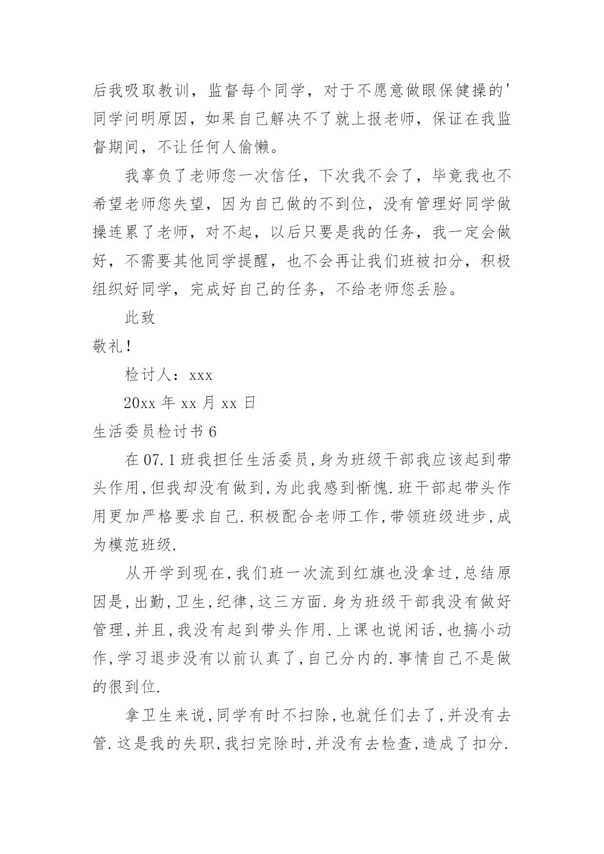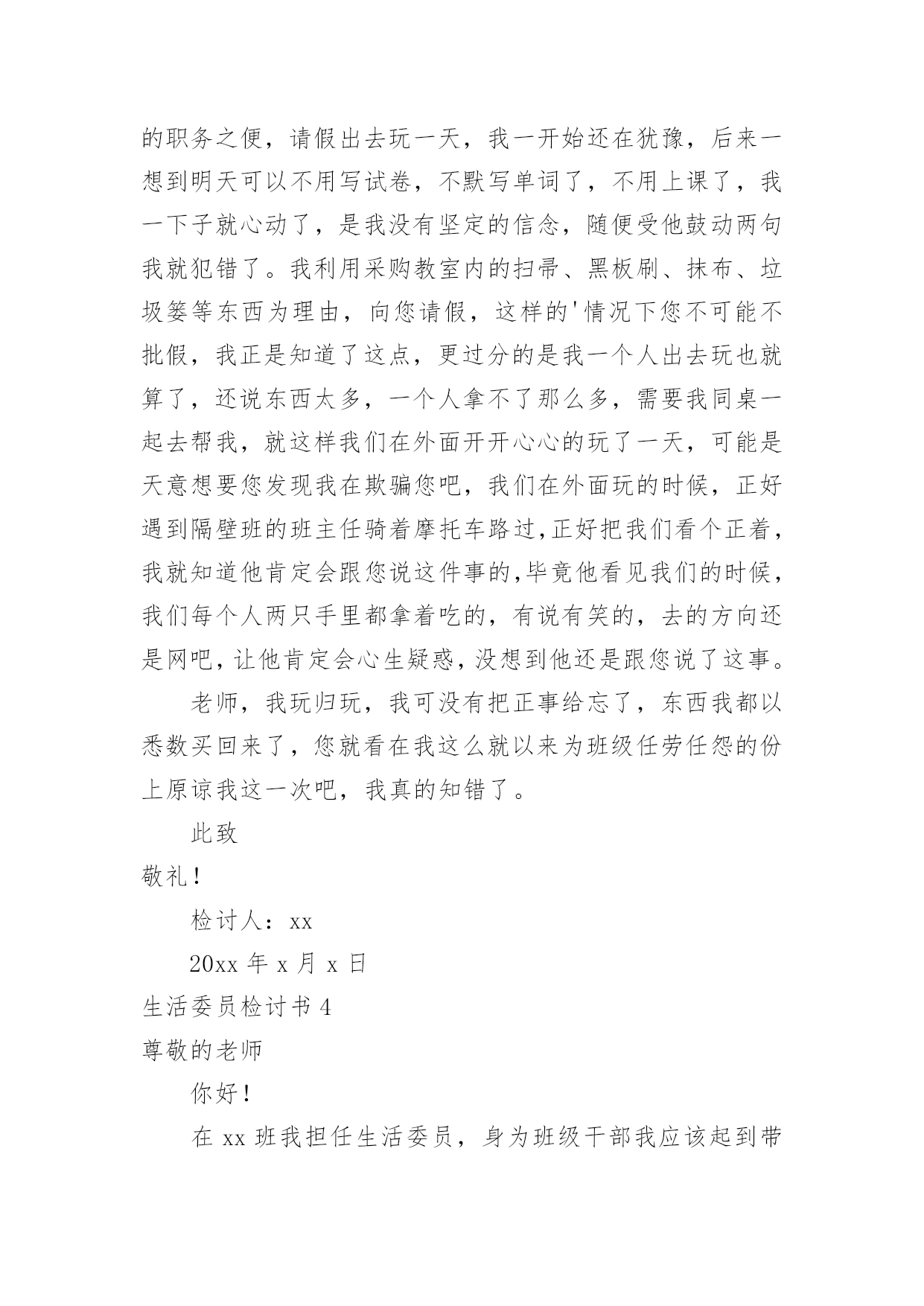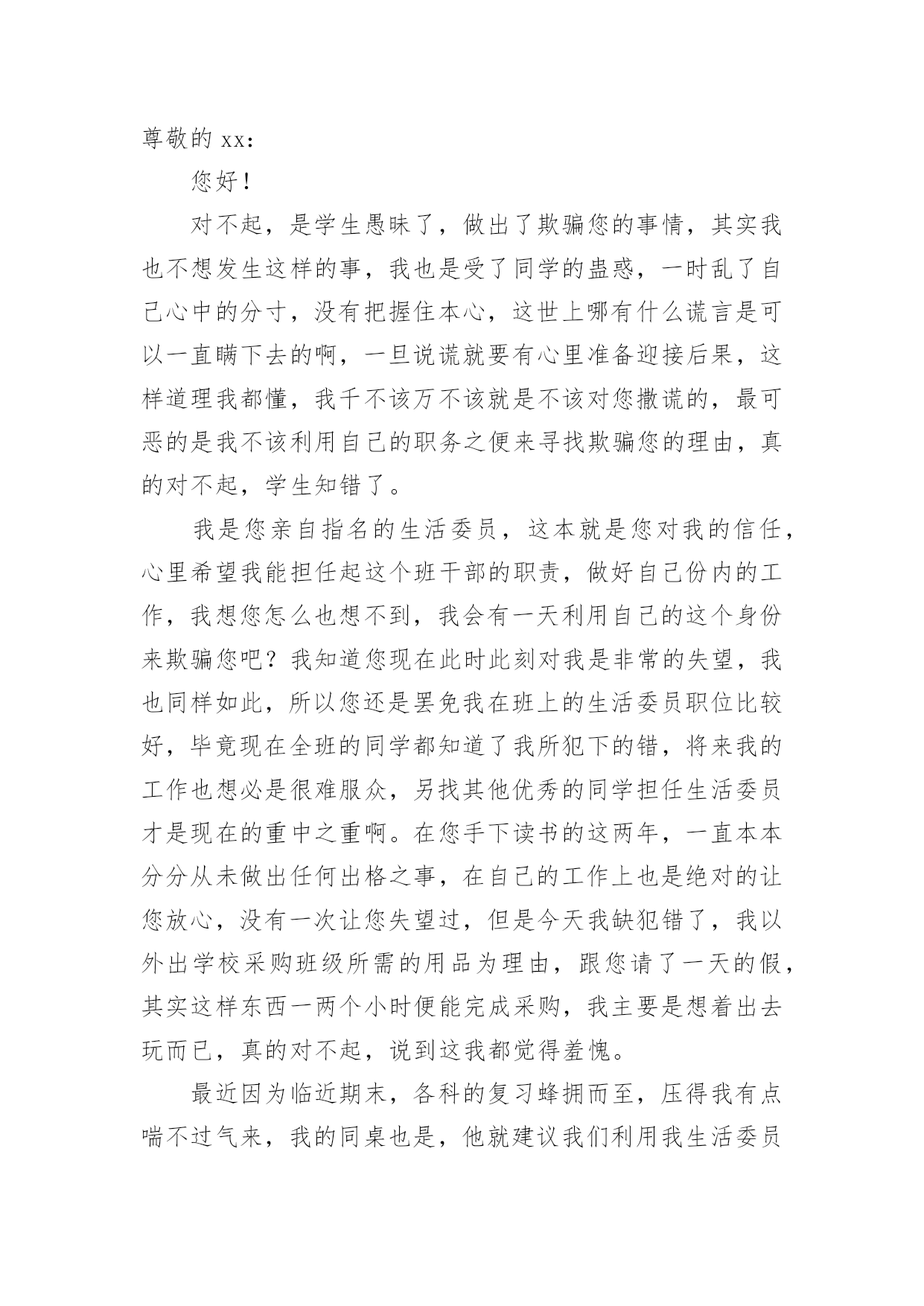 生活委员检讨书生活委员检讨书在不小心犯错后,为了避免今后再出此类事件,往往被要求写检讨书来自我反思,请注意写检讨要把原因讲清楚。想写检讨书却不知道该请教谁?以下是小编整理的生活委员检讨书,欢迎阅读,希望大家能够喜欢。生活委员检讨书1尊敬的老师:您好!非常抱歉,我作为班上的生活委员,我这次出现了重大的失职,因为我的疏忽,我把三天后班级比赛购买班服的班费给弄丢了,我现在内心的愧疚之情比任何时候都要重,考试考砸了,爸妈批评我,我都没这么委屈愧疚过,我现在一想到这件事我就想哭,我对不起您,对不起班上的每一位同学,这件事必须要有个人出来承认责任,那就只能是我这个当事人了,我会努力配合您严查这件事的,事后我就卸任,不再担任这个班上的生活委员了,我不想再给大家带来麻烦了。这次比赛,是学校想看看我们每个班的'才能如何,最后也是会颁发奖状的,这件事我们班非常的重视,我们班的要表演的节目是集体大合唱,要是能有同意的装束会特别加分,所以我们班上一共三十二名同学,一致决定自费购买班服,每个人都交了八十块钱过来,这可不是一笔小数目了啊,毕竟这两千多块钱还是非常诱惑人的,难免会有人起疑心,为了保险起见我每天都是随身携带的,就是怕被偷,但是万万没想到,最后竟然是我自己不小心给弄丢了,今天我上完体育课回到教室的时候,就发现口袋里的钱不见了,一分钱不剩,肯定是全部一起掉了,我下课感觉去田径场找,可是我眼睛都找疼,差不多快把田径场翻过来了,都没看到,两节课过去了,都没听到学校广播里放失物招领,那么肯定就是有人捡到了想占为己有,我们学校只有周日这一天才准学生出校门,那么这班费肯定还在学校,只能慢慢的查了。想当初,我们班要重新开始选班干部了,一共三个同学得到了生活委员的提名,最后就投票从我们三个人当中选择,最后班上绝大部分的同学都选择了我,连班主任您都是投的我,您和班上的同学们相信我,才选择我当生活委员的啊。而我呢,这次却让大家这么的失望,那些骂我的同学,我也能理解,说我不负责任,没有看管好班费,甚至说我监守自盗的,我都不想去反驳,我现在只想弥补这个损失。的确是我工作失职了,我错了。这件事不管最后能不能查出来,或者是那个人良心发现,自己送回来,我的错误都已经在这里了,所以最后我都会引咎辞职的。还有一点,请老师您放心,无论能不能找回来,我都会让大家顺利的穿上班服的,大不了我就跟爸爸妈妈表明这件事,跟他们借这笔钱,长大了赚钱再还给他们。这件事我由衷的感到抱歉,最后我再次跟大家道歉,对不起!此致敬礼!检讨人:xx20xx年x月x日生活委员检讨书2尊敬的老师:您好!我被老师您委任为生活委员,也是得到了同学们的支持,选举了我,让我来做这份班级的工作,本来我是应该尽责尽职的去做好,为同学们服务的,但是由于我工作了时间比较的长,而这段日子也是有些懒散了,导致出了问题,我的失职也是让老师您批评了我,对于同学们的信任我也是辜负了,在此我也是检讨自己的问题,作出反省,要去好好的改正,今后不能再辜负同学们予以的期盼了。生活委员的工作其实并不是特别的.多,而且工作的内容相对来说,不是太辛苦,本来我也是做的不错的,但是时间久了,我也是有些放松,觉得没有什么太大的事情,何必那么认真,有时候一些问题出现了,我也是没有去管,反正同学们也是没说,老师也没讲,我自己就认真没问题,可这种情况出现得多了,也是让班级的一些工作无法进行,而自己也是要负很大的责任,我的失职,终究还是自己的问题,老师愿意相信我,同学们也是给予了我权力来做事情,但我却还这样,在这个职位上,却不做好,还不如不来竞选,而当初自己竞选给到的承诺也是要做好,不然同学们也是觉得我这个人是说一套做一套的,而今想想的确是如此的,如果我选了别人来做事情,但是他又不做,我也是会生气,会觉得这个人不靠谱,而今的我也是给了他人这样的感觉。我也是要去作出改变,在生活委员的职位上,既然我不下来,还在工作里头,还在任期内,我也是不想这样灰溜溜的过完这一个学期,然后下学期换个人来做,让同学们觉得我是很不被信任的,我也是要弥补我在同学之中的这种形象,每个人做了选择,那么也是要去承担这个后果,之前的我做的不够好,现在我就得去改,如果还不改变,那么也是自己会让老师觉得我这个人没有一点儿责任感,更是会让老师您操心的,您说的话,我也是听到了心里面去了,问题出现了,我失职了,那么就要做好,以前的事情很多改变不了,但是现在要做的,以后能做的,我确实可以去把控,去做到,尽到自己是生活委员的责任的。既然当初觉得来为同学们服务,那么我也是要做到底,不管下学期还是否是生活委员,这学期以后的工作我都是会尽责做好,并且弥补之前做的不够好的地方,不让老师再操心了。此致敬礼!检讨人:xxx20xx年x月x日生活委员检讨书3尊敬的xx:您好!对不起,是学生愚昧了,做出了欺骗您的事情,其实