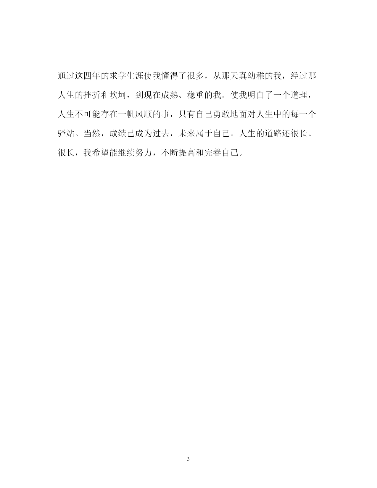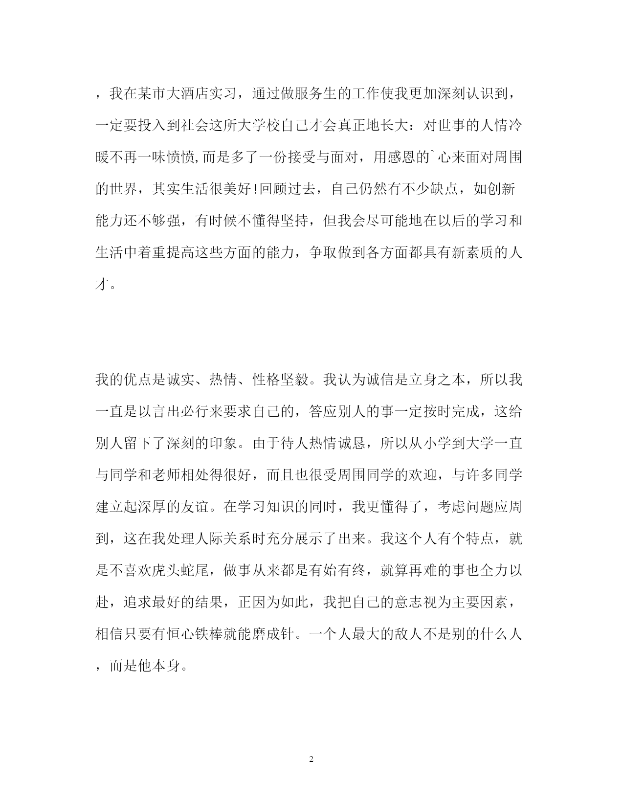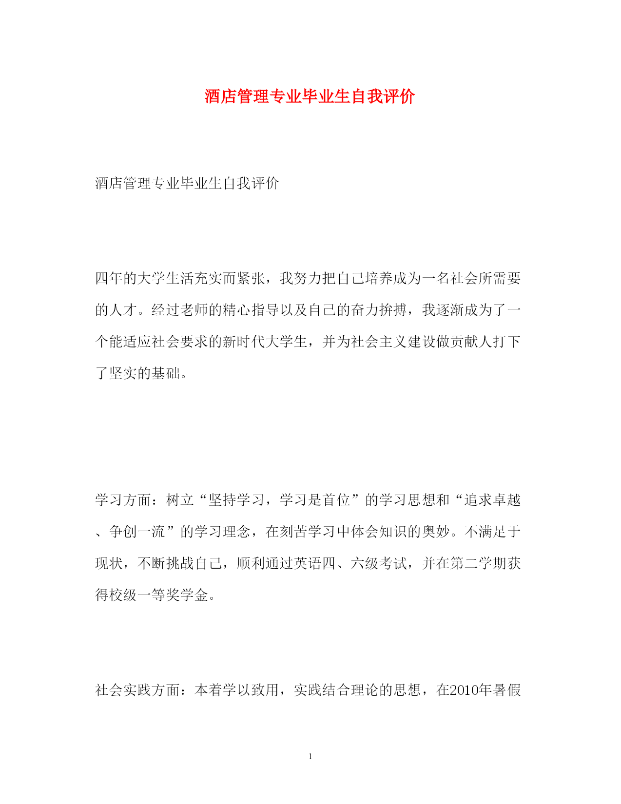 此资料由网络收集而来,如有侵权请告知上传者立即删除。资料共分享,我们负责传递知识。PAGEPAGE3酒店管理专业毕业生自我评价酒店管理专业毕业生自我评价四年的大学生活充实而紧张,我努力把自己培养成为一名社会所需要的人才。经过老师的精心指导以及自己的奋力拚搏,我逐渐成为了一个能适应社会要求的新时代大学生,并为社会主义建设做贡献人打下了坚实的基础。学习方面:树立“坚持学习,学习是首位”的学习思想和“追求卓越、争创一流”的学习理念,在刻苦学习中体会知识的奥妙。不满足于现状,不断挑战自己,顺利通过英语四、六级考试,并在第二学期获得校级一等奖学金。社会实践方面:本着学以致用,实践结合理论的思想,在2010年暑假,我在某市大酒店实习,通过做服务生的工作使我更加深刻认识到,一定要投入到社会这所大学校自己才会真正地长大:对世事的人情冷暖不再一味愤愤,而是多了一份接受与面对,用感恩的`心来面对周围的世界,其实生活很美好!回顾过去,自己仍然有不少缺点,如创新能力还不够强,有时候不懂得坚持,但我会尽可能地在以后的学习和生活中着重提高这些方面的能力,争取做到各方面都具有新素质的人才。我的优点是诚实、热情、性格坚毅。我认为诚信是立身之本,所以我一直是以言出必行来要求自己的,答应别人的事一定按时完成,这给别人留下了深刻的印象。由于待人热情诚恳,所以从小学到大学一直与同学和老师相处得很好,而且也很受周围同学的欢迎,与许多同学建立起深厚的友谊。在学习知识的同时,我更懂得了,考虑问题应周到,这在我处理人际关系时充分展示了出来。我这个人有个特点,就是不喜欢虎头蛇尾,做事从来都是有始有终,就算再难的事也全力以赴,追求最好的结果,正因为如此,我把自己的意志视为主要因素,相信只要有恒心铁棒就能磨成针。一个人最大的敌人不是别的什么人,而是他本身。通过这四年的求学生涯使我懂得了很多,从那天真幼稚的我,经过那人生的挫折和坎坷,到现在成熟、稳重的我。使我明白了一个道理,人生不可能存在一帆风顺的事,只有自己勇敢地面对人生中的每一个驿站。当然,成绩已成为过去,未来属于自己。人生的道路还很长、很长,我希望能继续努力,不断提高和完善自己。
