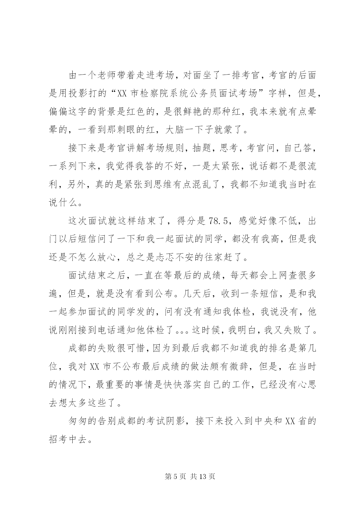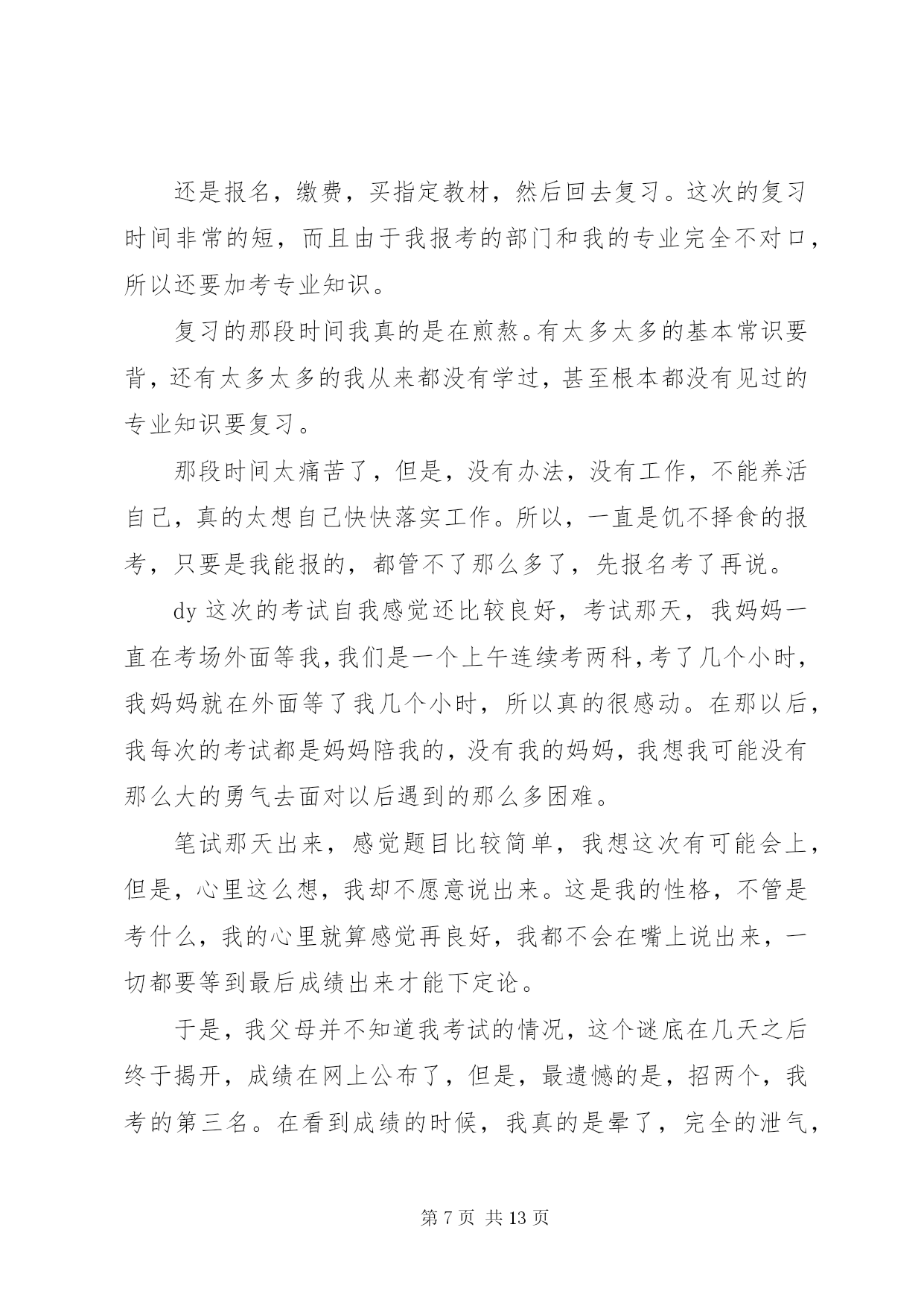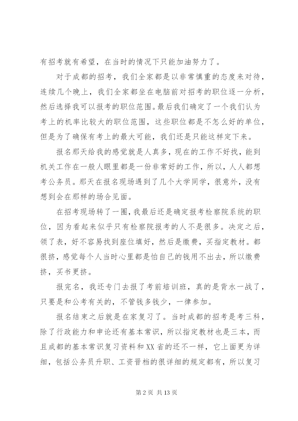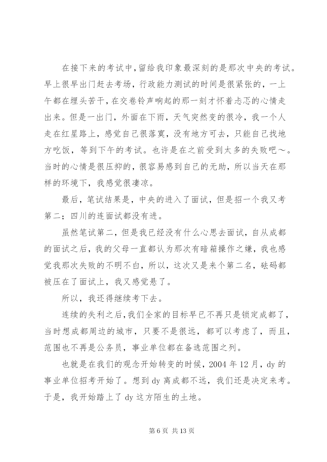 第PAGE\*Arabic\*MERGEFORMAT13页共NUMPAGES\*MERGEFORMAT13页一个研究生的国考经验与心得前言。在一论坛中偶然读到了一篇艰辛考公务员的文章,跟我原来一个同事的经历很相像;不禁感慨,一个光明的前途,为何道路都是如此曲折。今天转载到我的空间,与大家共勉之。正文:这是我从我以前写的我的求职经历里面节选出来的关于公务员考试的那段经历,因为是节选的,所以可能存在一些衔接上的问题,希望大家谅解。刚刚从博客里面粘贴出来整理了一下,看了一遍,自己都有一点感动,我从第一次考公务员到考上差不多用了两年的时间,其间经历了多次考试,这里写的只是我其中一年的经历,当时是在我最困难的时候,辞掉了工作,就为考公务员,真的很艰难。不多说了,大家看看吧,希望对你们会有帮助。(注。里面涉及到的地名我用拼音代替了。)从决定考公务员开始,我参加的第一场考试应该是XX市招考的那次公务员考试。也记不清是2004年的10月还是11月了,反正差不多就是那个时候。当我在网上看到了成都在招考公务员的消息时,心里是一种百感交集的感觉,因为从9月开始关注招考信息,一直到10月底才终于看到了成都的招考,我实在是等的太久,太希望快快有招考信息,但是,当真的有招考的时候,我又开始担心我是不是能考上,反正想的挺多。但不管怎么样,有招考就有希望,在当时的情况下只能加油努力了。对于成都的招考,我们全家都是以非常慎重的态度来对待,连续几个晚上,我们全家都坐在电脑前对招考的职位逐一分析,然后选择我可以报考的职位范围。最后我们确定了一个我们认为考上的机率比较大的职位范围,这些职位都是不怎么好的单位,但是为了确保有考上的最大可能,我们还是只能这样定下来。报名那天给我的感觉就是人真多,现在的工作不好找,能到机关工作在一般人眼里都是一份非常好的工作,所以,人人都想考公务员。那天在报名现场遇到了几个大学同学,很意外,没有想到会在那样的场合见面。在招考现场转了一圈,我最后还是确定报考检察院系统的职位,因为看起来似乎只有检察院报考的人不是很多。决定之后,领了表,好不容易找到座位填好,然后是缴费,买指定教材。都很挤,感觉每个人当时心里都是怕自己的钱用不出去,所以缴费挤,买书更挤。报完名,我还专门去报了考前培训班,真的是背水一战了,只要是和公考有关的,不管钱多钱少,一律参加。报名结束之后就是在家复习了。当时成都的招考是考三科,除了行政能力和申论还有基本常识,所以指定教材也是三本,而且成都的基本常识复习资料和XX省的还不一样,它上面更为详细,包括公务员升职、工资晋档的很详细的规定都有,所以复习起来还是有一定难度。那段时间在家复习的状态比在学校考的那次好多了,每天都是定时看书、做题,后来在临考前就是每周末参加考前培训班,我觉得那次我复习的比较扎实,每天也过的比较充实。考试好像是在十一月吧~。在考之前,中央和XX省的招考也开始报名,所以在复习成都考试的同时,我已经又报了中央和四川的。在参加成都的考试那天,我又遇到了很多大学同学,甚至在考场还遇到一个大学一个大班的同学,这个世界真是小,真没想到成都的一次招考让我遇到那么多同学,可见,当时和我的境况差不多的还大有人在。成都的那次考试成绩出来的很快,在考试结束一星期后就公布成绩了。成绩即将出来的那天,我真的是睡觉都不能安稳,心里惦记的就是成绩,早上一起床,第一件事就是开电脑,成都人事局网站上已经挂出招考笔试成绩的名单了。我只感觉双手冰凉,怀着极为紧张的心情,我终于查到了自己的成绩,可惜,招三个,我是第四名,不过还是进面试了。和前面几名比较了一下,虽然差距都很小,甚至只有零点几分,但是我的心里还是有很大的失望,后悔当初基础知识部分背的不扎实,在那上面吃了亏。可是后悔归后悔,失望归失望,既然进入了面试,还是要把握机会的,所以就算心里怀着失落,还是开始全身心的投入到面试的复习中去。成都的那次面试,我是最慎重对待的一次,那也是我第一次参加公务员面试,完全没有任何经验,所以对面试流程以及面试场景都充满了很多的想像。记得那次除了在面试之前看了他们的指定教材外,还专门对自己的穿着好好的研究了一下,最后决定穿的稳重一点,所以那天穿的比较严肃。而且在去面试的头一天我还专门去理了发,还给理发的师傅说剪一个稍微成熟一点的发型。那次可以说真的是用心良苦。面试那天要求我们很早就到检察院集合候考。所有考生都被集中在了XX市人民检察院办公楼楼顶的那个大会议室里,然后是宣布考场规则,上交通讯工具,抽签等一系列的准备工作。我抽到的签比较靠后,要到下午才能轮上。其实当时的心态是想抽到靠前的,早点面试了早点回去。但是,没办法,只能熬这漫长的等待。在候考的时候,居然有人在那打太极拳,爆笑,真的是强人。每个人疏解紧张压力的方式都不同,也无可厚非了。下