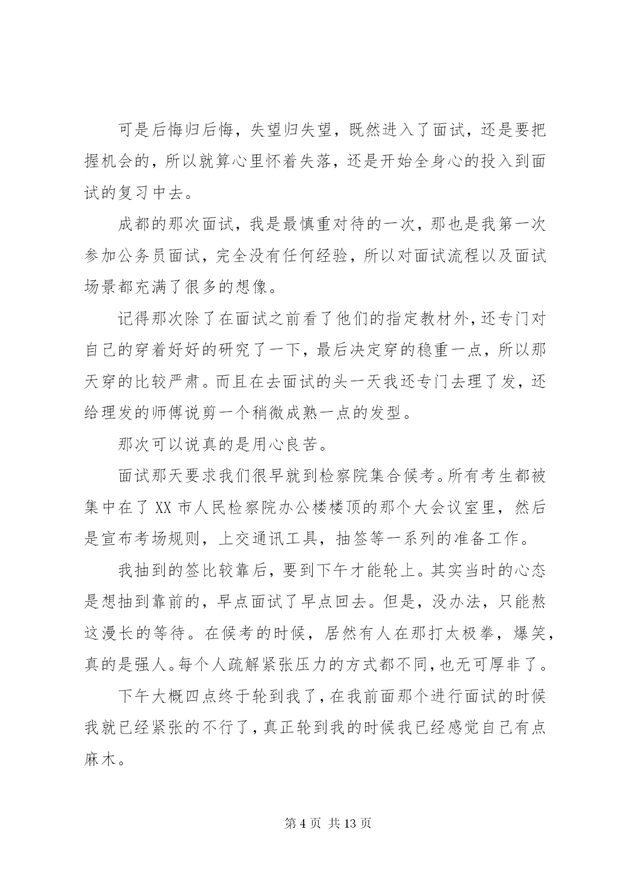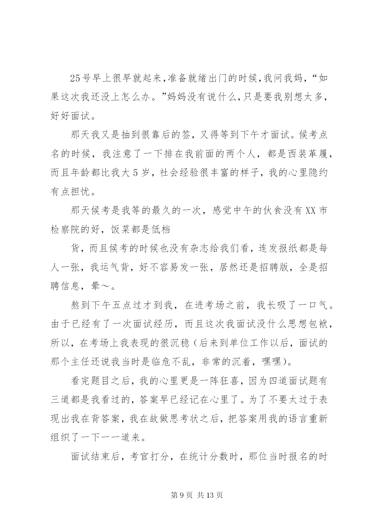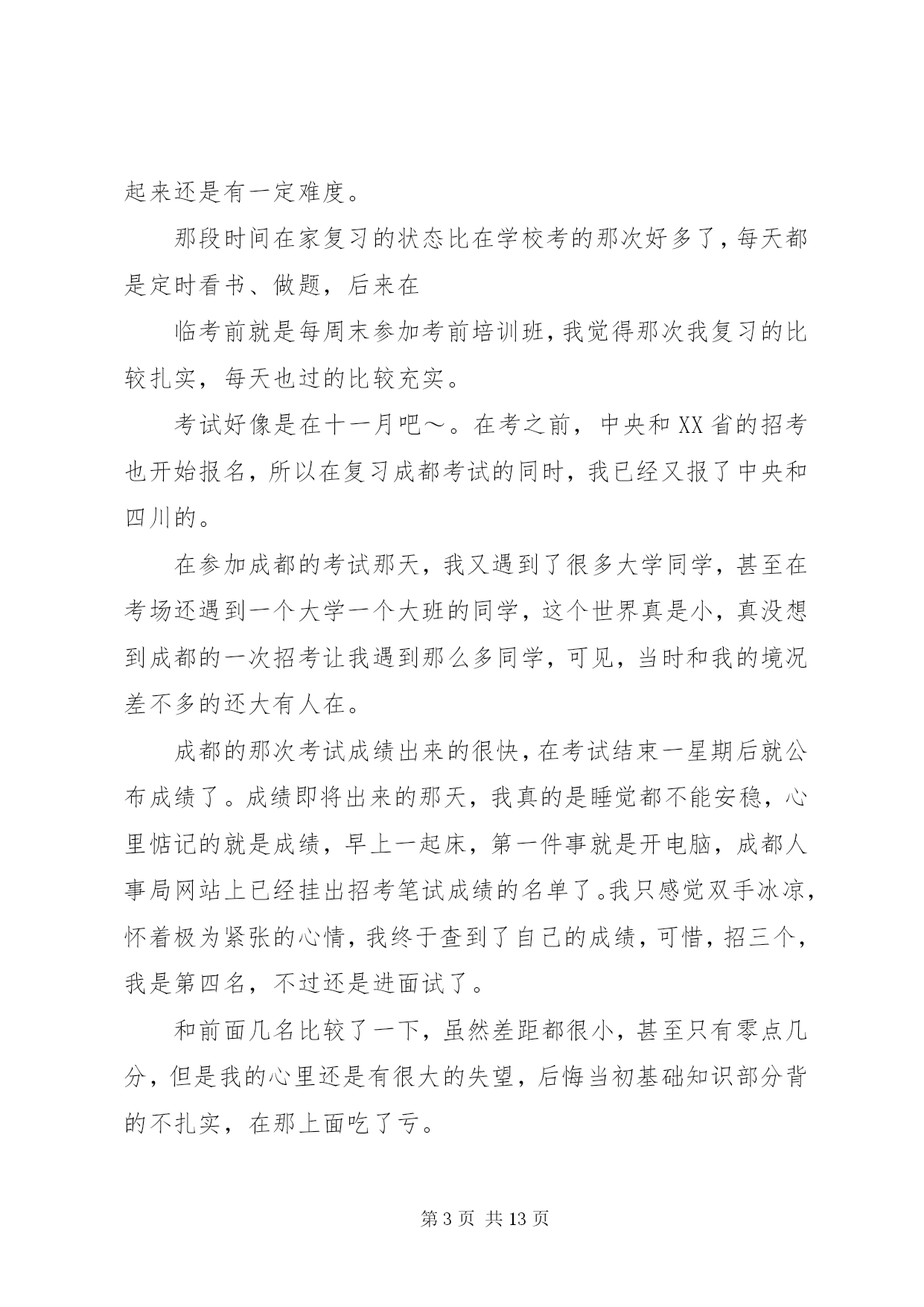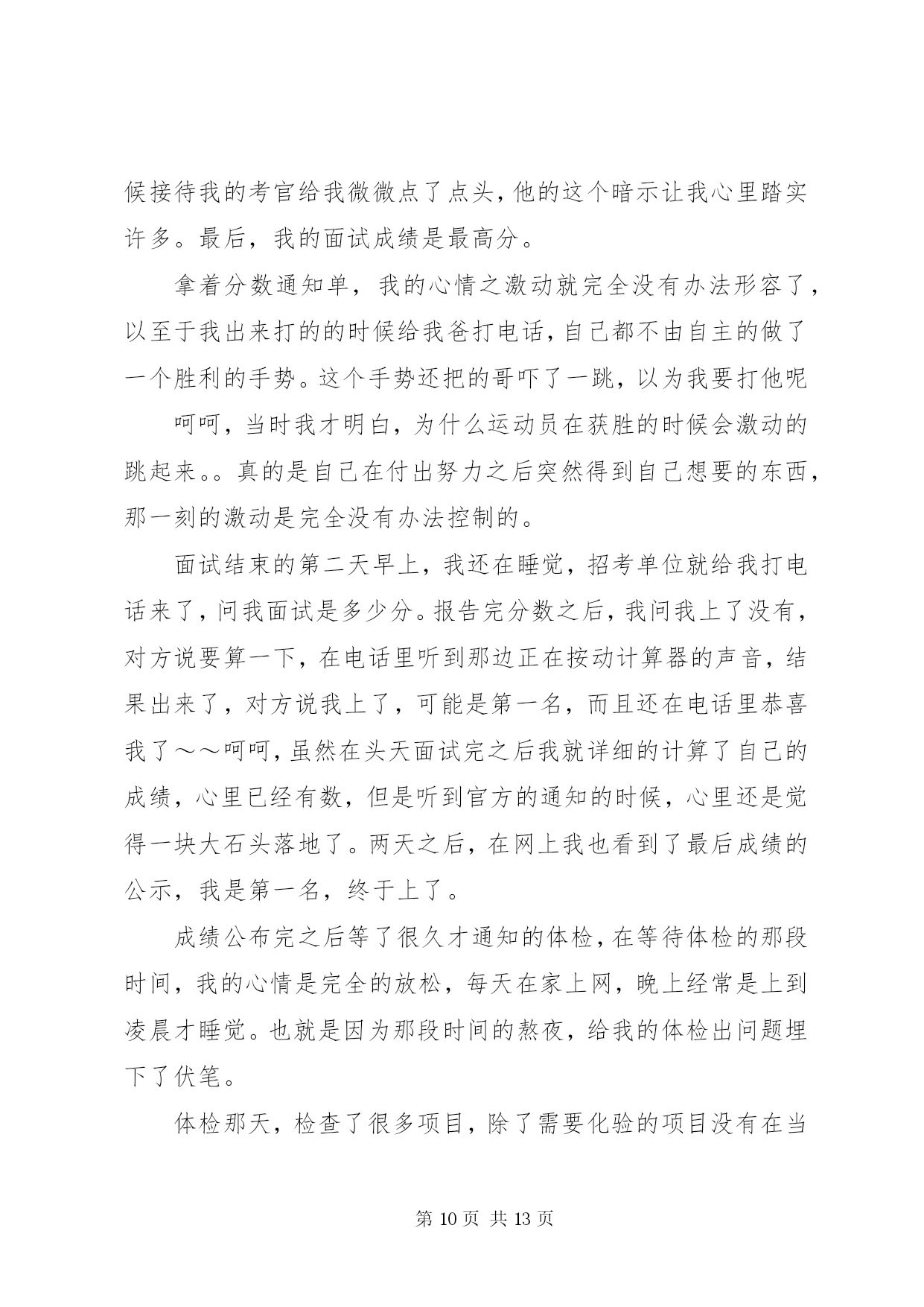第PAGE\*Arabic\*MERGEFORMAT13页共NUMPAGES\*MERGEFORMAT13页一个研究生的国考经验与心得前言。在一论坛中偶然读到了一篇艰辛考公务员的文章,跟我原来一个同事的经历很相像;不禁感慨,一个光明的前途,为何道路都是如此曲折。今天转载到我的空间,与大家共勉之。正文:这是我从我以前写的我的求职经历里面节选出来的关于公务员考试的那段经历,因为是节选的,所以可能存在一些衔接上的问题,希望大家谅解。刚刚从博客里面粘贴出来整理了一下,看了一遍,自己都有一点感动,我从第一次考公务员到考上差不多用了两年的时间,其间经历了多次考试,这里写的只是我其中一年的经历,当时是在我最困难的时候,辞掉了工作,就为考公务员,真的很艰难。不多说了,大家看看吧,希望对你们会有帮助。(注。里面涉及到的地名我用拼音代替了。)从决定考公务员开始,我参加的第一场考试应该是XX市招考的那次公务员考试。也记不清是2004年的10月还是11月了,反正差不多就是那个时候。当我在网上看到了成都在招考公务员的消息时,心里是一种百感交集的感觉,因为从9月开始关注招考信息,一直到10月底才终于看到了成都的招考,我实在是等的太久,太希望快快有招考信息,但是,当真的有招考的时候,我又开始担心我是不是能考上,反正想的挺多。但不管怎么样,有招考就有希望,在当时的情况下只能加油努力了。对于成都的招考,我们全家都是以非常慎重的态度来对待,连续几个晚上,我们全家都坐在电脑前对招考的职位逐一分析,然后选择我可以报考的职位范围。最后我们确定了一个我们认为考上的机率比较大的职位范围,这些职位都是不怎么好的单位,但是为了确保有考上的最大可能,我们还是只能这样定下来。报名那天给我的感觉就是人真多,现在的工作不好找,能到机关工作在一般人眼里都是一份非常好的工作,所以,人人都想考公务员。那天在报名现场遇到了几个大学同学,很意外,没有想到会在那样的场合见面。在招考现场转了一圈,我最后还是确定报考检察院系统的职位,因为看起来似乎只有检察院报考的人不是很多。决定之后,领了表,好不容易找到座位填好,然后是缴费,买指定教材。都很挤,感觉每个人当时心里都是怕自己的钱用不出去,所以缴费挤,买书更挤。报完名,我还专门去报了考前培训班,真的是背水一战了,只要是和公考有关的,不管钱多钱少,一律参加。报名结束之后就是在家复习了。当时成都的招考是考三科,除了行政能力和申论还有基本常识,所以指定教材也是三本,而且成都的基本常识复习资料和XX省的还不一样,它上面更为详细,包括公务员升职、工资晋档的很详细的规定都有,所以复习起来还是有一定难度。那段时间在家复习的状态比在学校考的那次好多了,每天都是定时看书、做题,后来在临考前就是每周末参加考前培训班,我觉得那次我复习的比较扎实,每天也过的比较充实。考试好像是在十一月吧~。在考之前,中央和XX省的招考也开始报名,所以在复习成都考试的同时,我已经又报了中央和四川的。在参加成都的考试那天,我又遇到了很多大学同学,甚至在考场还遇到一个大学一个大班的同学,这个世界真是小,真没想到成都的一次招考让我遇到那么多同学,可见,当时和我的境况差不多的还大有人在。成都的那次考试成绩出来的很快,在考试结束一星期后就公布成绩了。成绩即将出来的那天,我真的是睡觉都不能安稳,心里惦记的就是成绩,早上一起床,第一件事就是开电脑,成都人事局网站上已经挂出招考笔试成绩的名单了。我只感觉双手冰凉,怀着极为紧张的心情,我终于查到了自己的成绩,可惜,招三个,我是第四名,不过还是进面试了。和前面几名比较了一下,虽然差距都很小,甚至只有零点几分,但是我的心里还是有很大的失望,后悔当初基础知识部分背的不扎实,在那上面吃了亏。可是后悔归后悔,失望归失望,既然进入了面试,还是要把握机会的,所以就算心里怀着失落,还是开始全身心的投入到面试的复习中去。成都的那次面试,我是最慎重对待的一次,那也是我第一次参加公务员面试,完全没有任何经验,所以对面试流程以及面试场景都充满了很多的想像。记得那次除了在面试之前看了他们的指定教材外,还专门对自己的穿着好好的研究了一下,最后决定穿的稳重一点,所以那天穿的比较严肃。而且在去面试的头一天我还专门去理了发,还给理发的师傅说剪一个稍微成熟一点的发型。那次可以说真的是用心良苦。面试那天要求我们很早就到检察院集合候考。所有考生都被集中在了XX市人民检察院办公楼楼顶的那个大会议室里,然后是宣布考场规则,上交通讯工具,抽签等一系列的准备工作。我抽到的签比较靠后,要到下午才能轮上。其实当时的心态是想抽到靠前的,早点面试了早点回去。但是,没办法,只能熬这漫长的等待。在候考的时候,居然有人在那打太极拳,爆笑,真的是强人。每个人疏解紧张压力的方式都不同,也无可厚非了。下